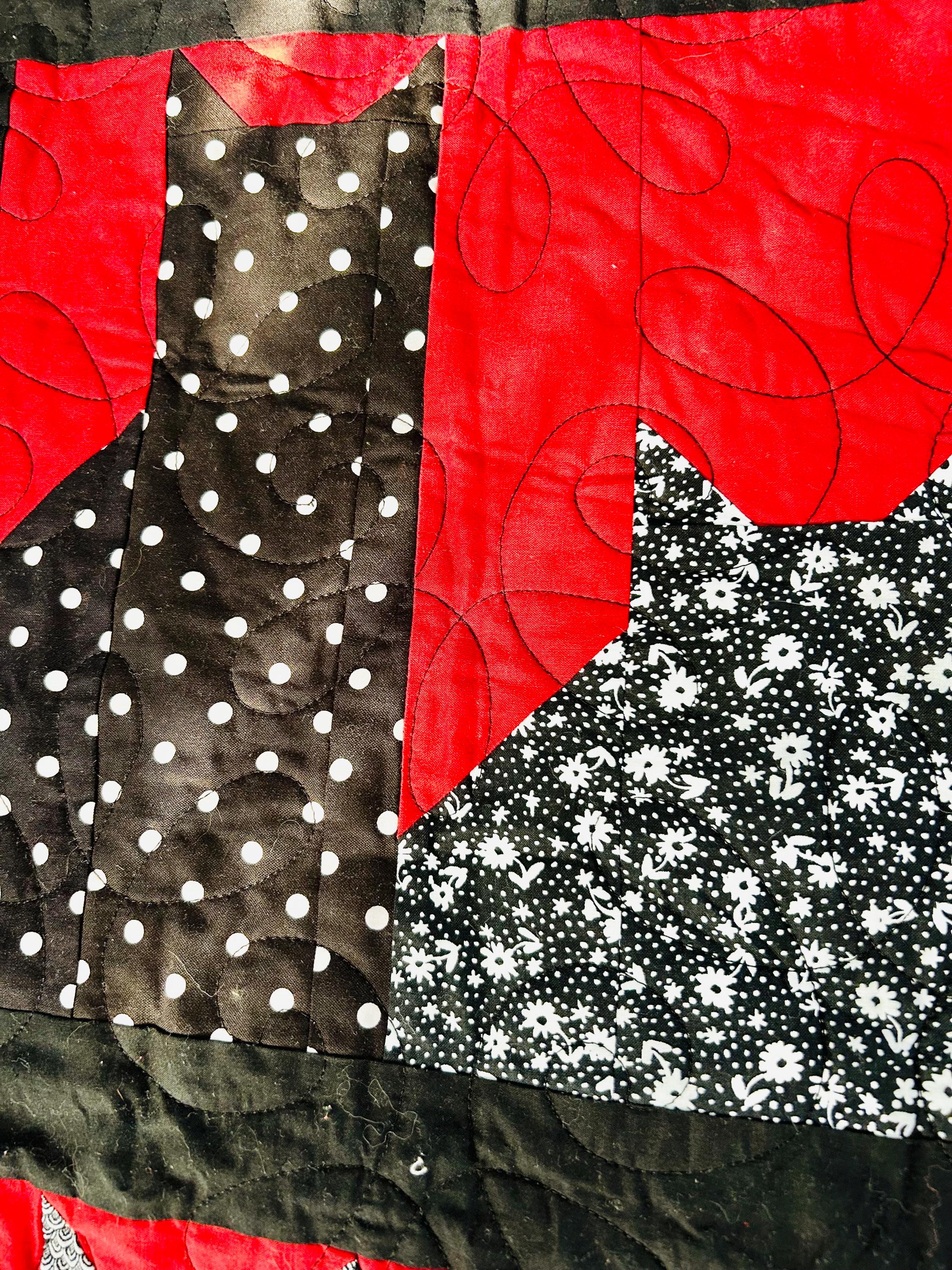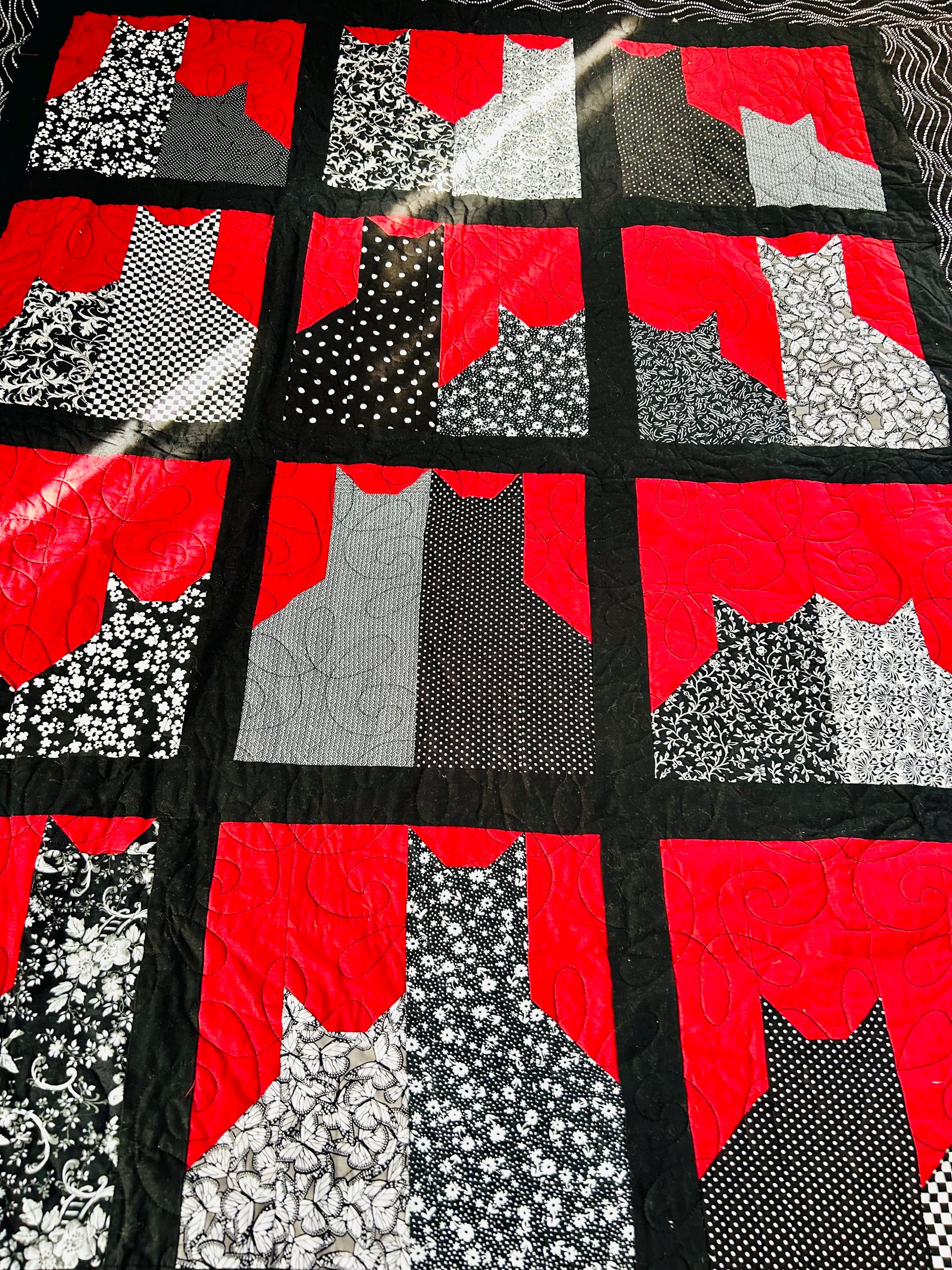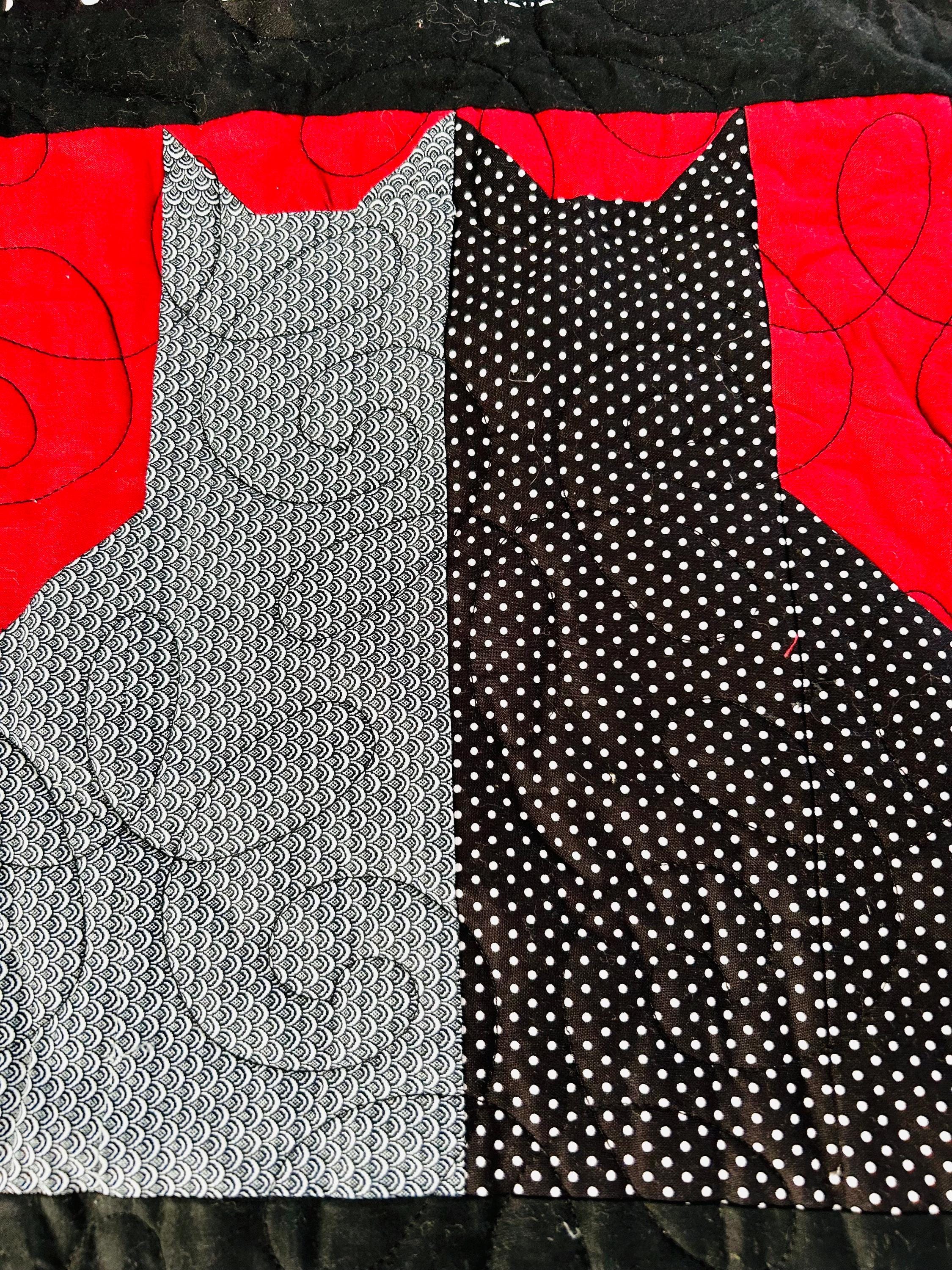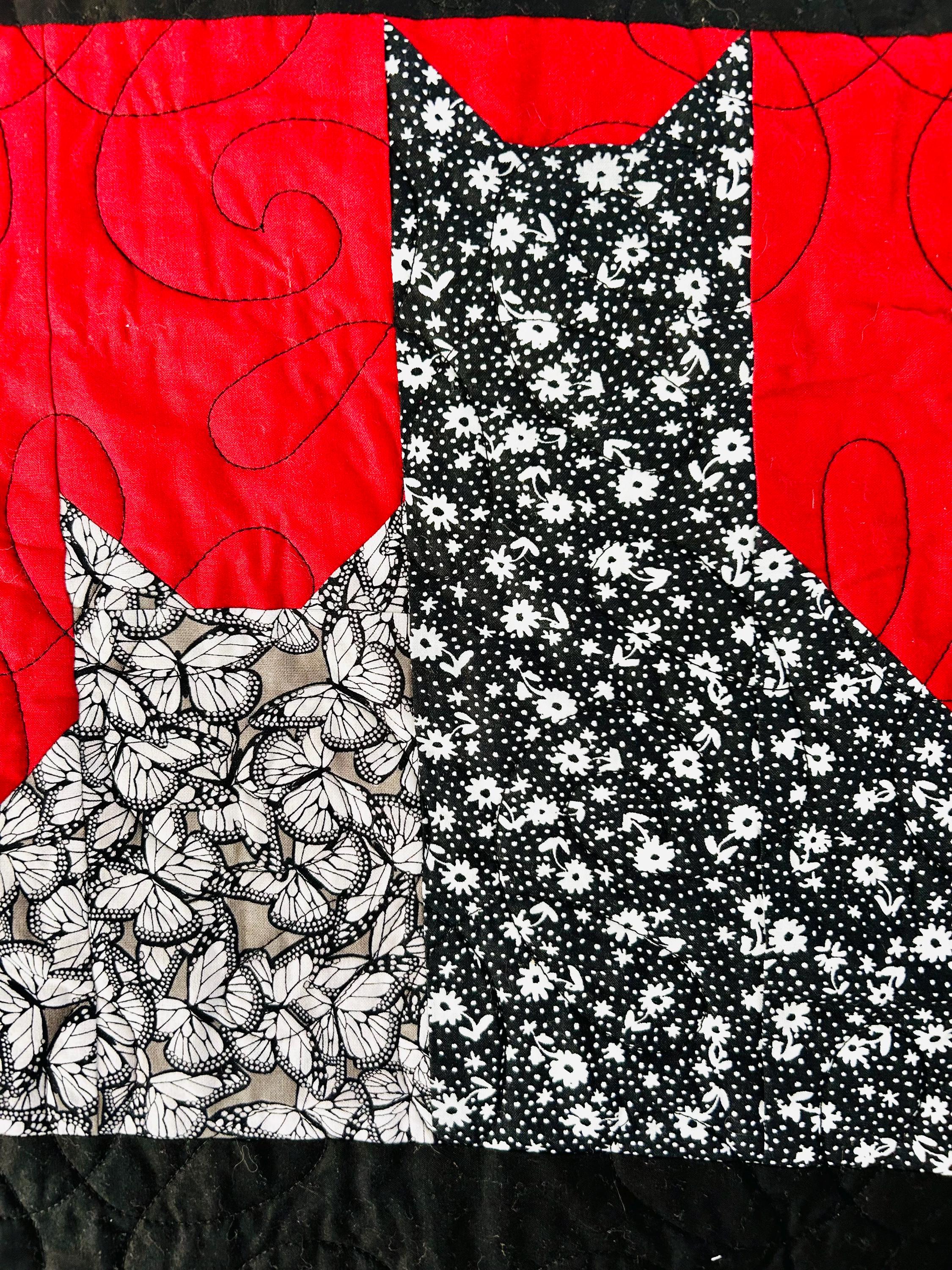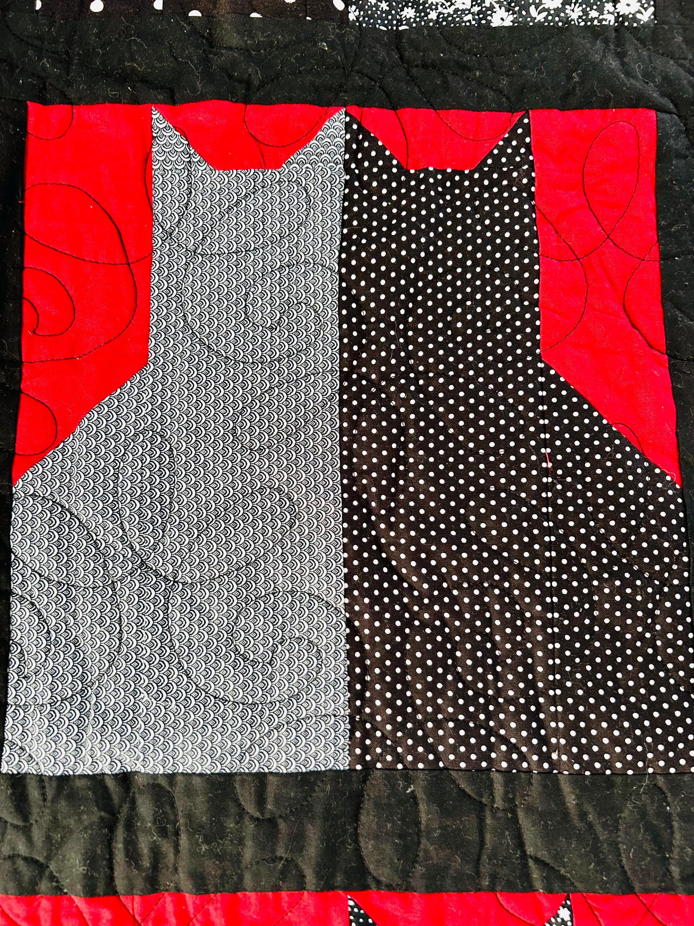 Details • Pattern: Cats in the Window (stylized cat silhouette blocks) • Date: 2016 • Size: 55” x 68” (Nap / Throw size) • Materials: Cotton fabrics and lightweight batting • Colors: Black, white, and red • Construction: Machine pieced and longarm quilted • Quilting: Free-motion swirl quilting with curlicues • Backing: Coordinating black fabric with white dotted wave pattern • Binding: Black binding, machine-and-hand-finished