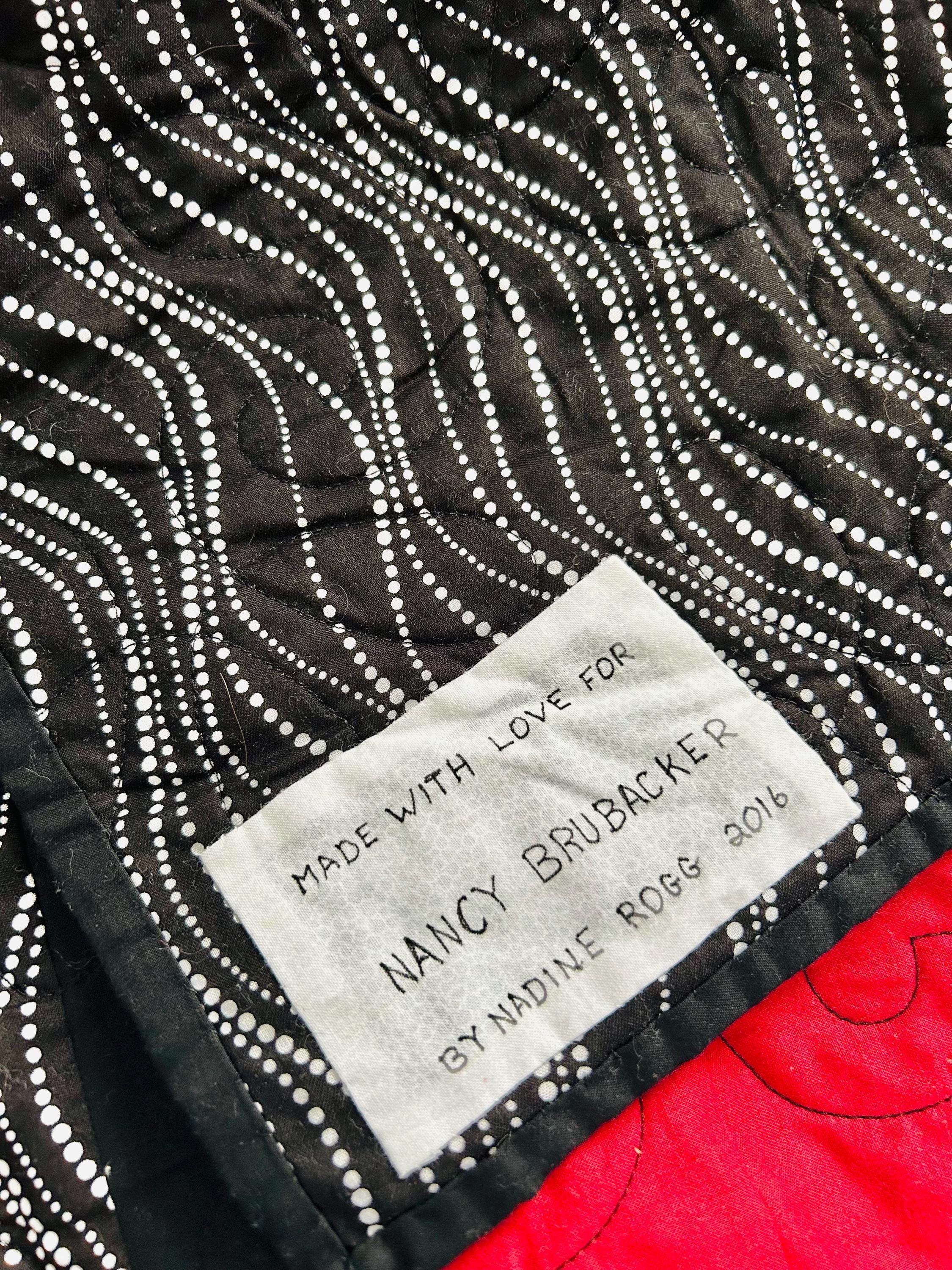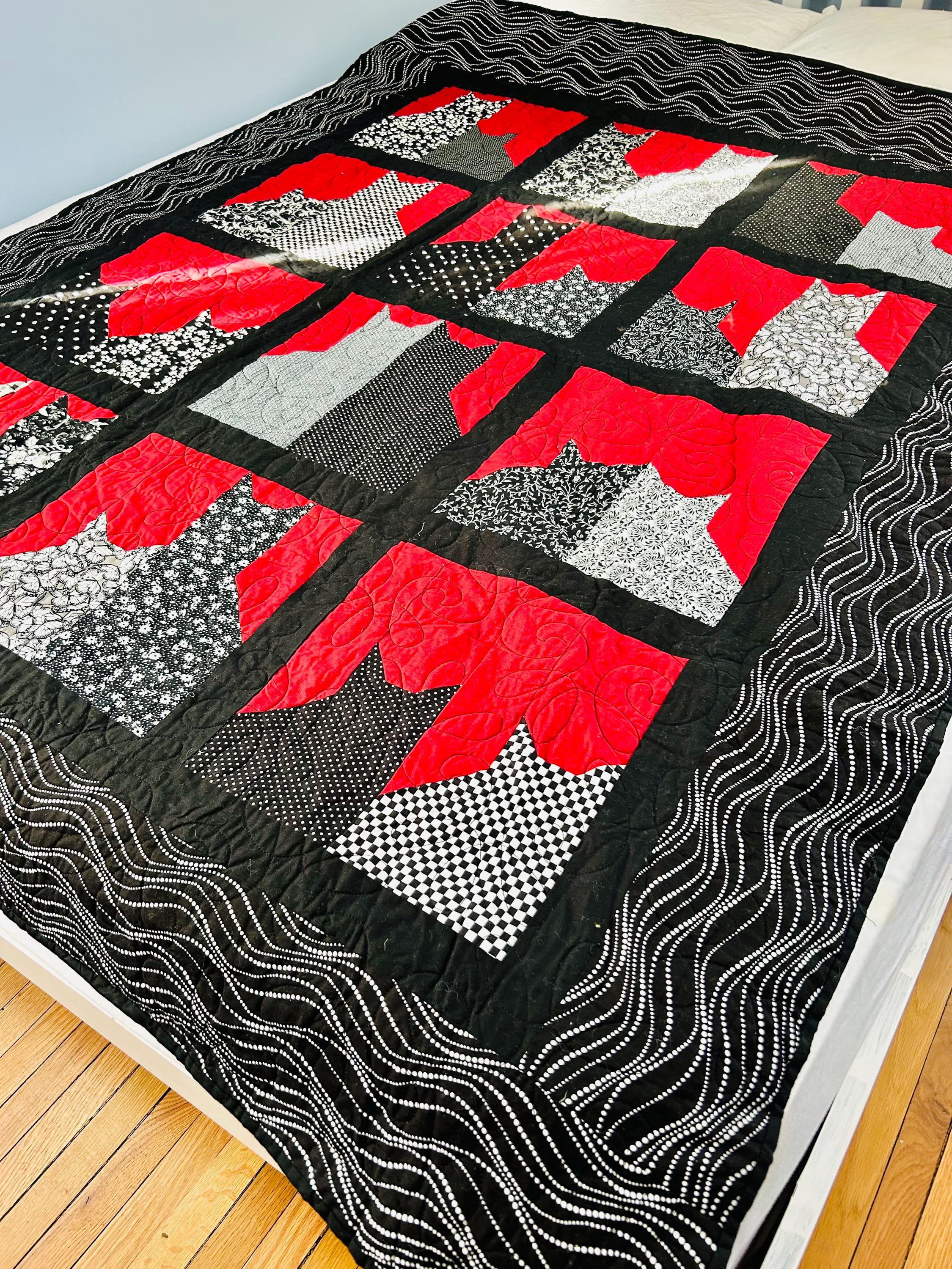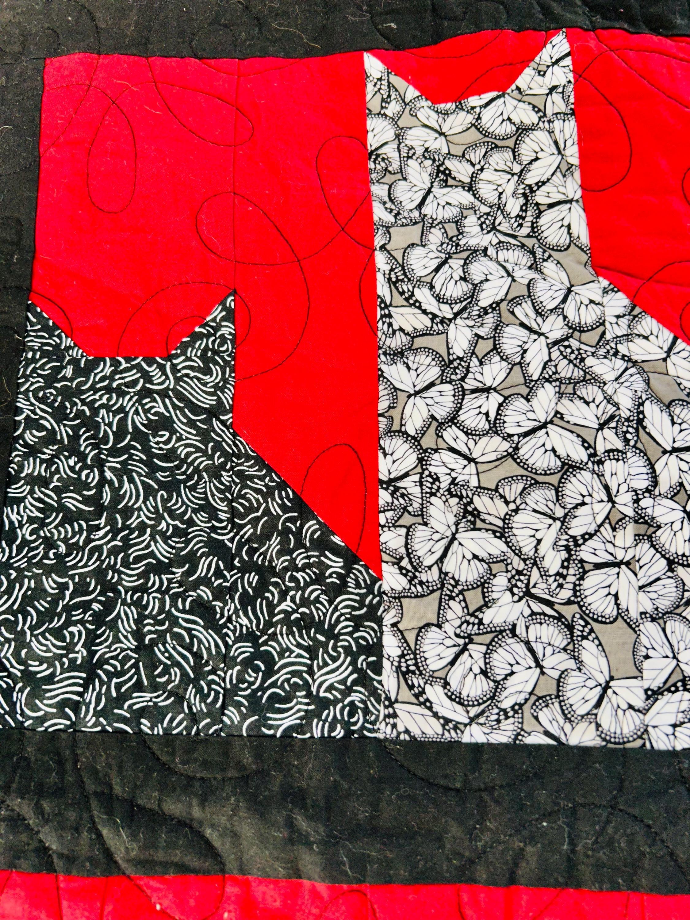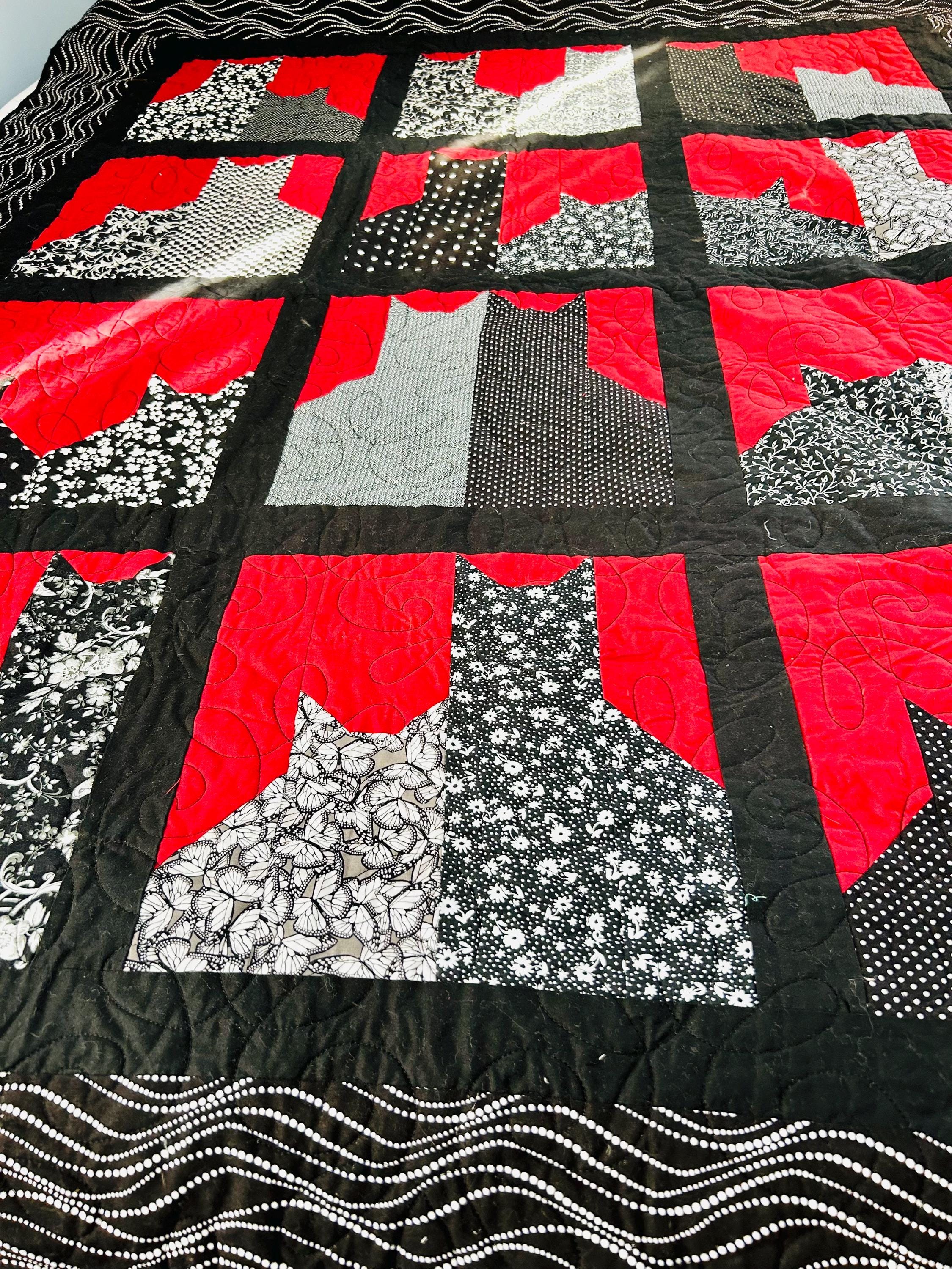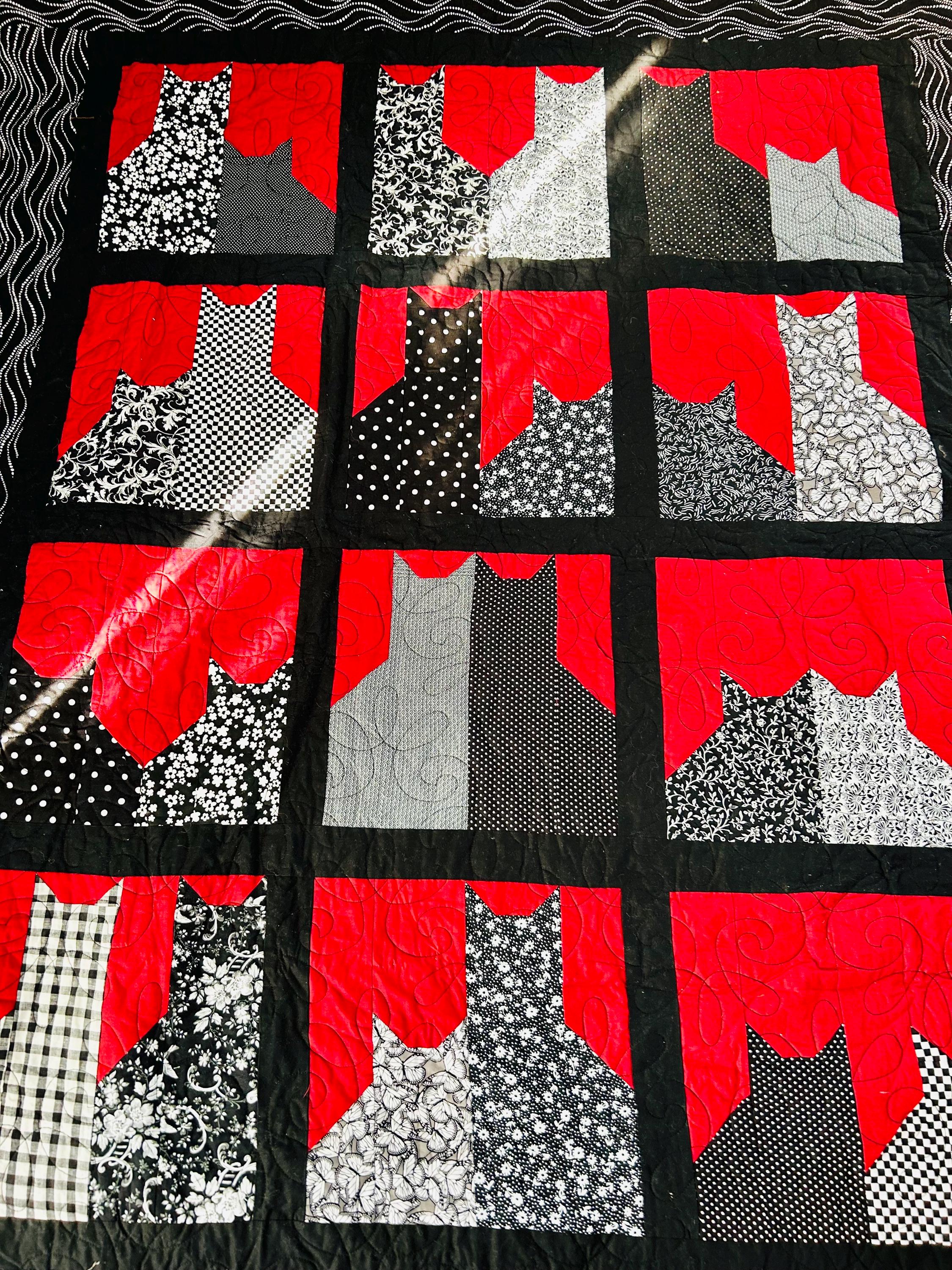 Details • Pattern: Cats in the Window (stylized cat silhouette blocks) • Date: 2016 • Size: 55” x 68” (Nap / Throw size) • Materials: Cotton fabrics and lightweight batting • Colors: Black, white, and red • Construction: Machine pieced and longarm quilted • Quilting: Free-motion swirl quilting with curlicues • Backing: Coordinating black fabric with white dotted wave pattern • Binding: Black binding, machine-and-hand-finished
