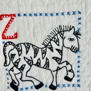 Each block uses unique black-and-white prints—from florals to geometrics to whimsical motifs, while the outer border is made of a flowing dotted wave pattern, as is the back. The binding is black cotton that has been machine-stitched to the front and hand-stitched to the back. The batting is lightweight.