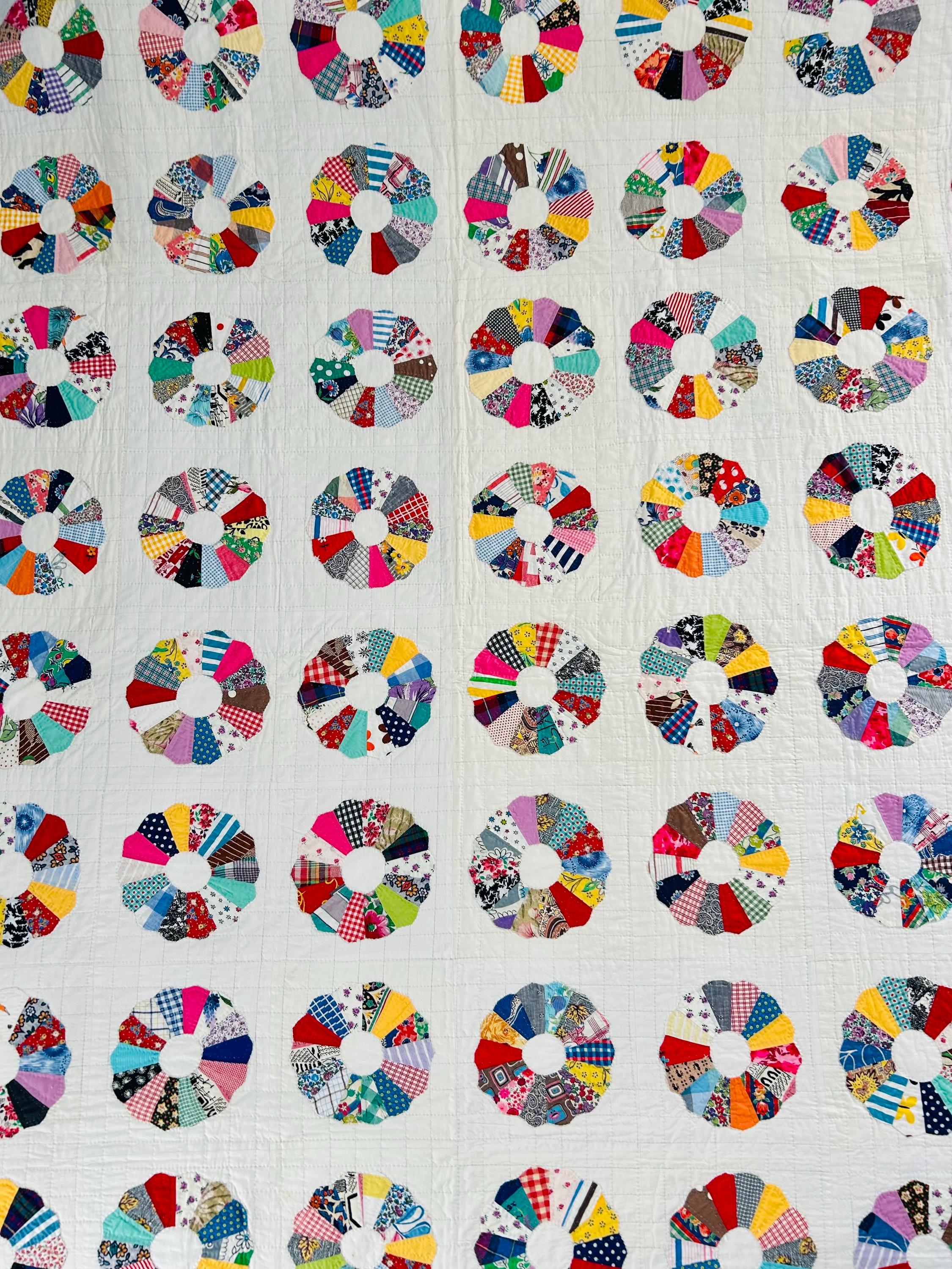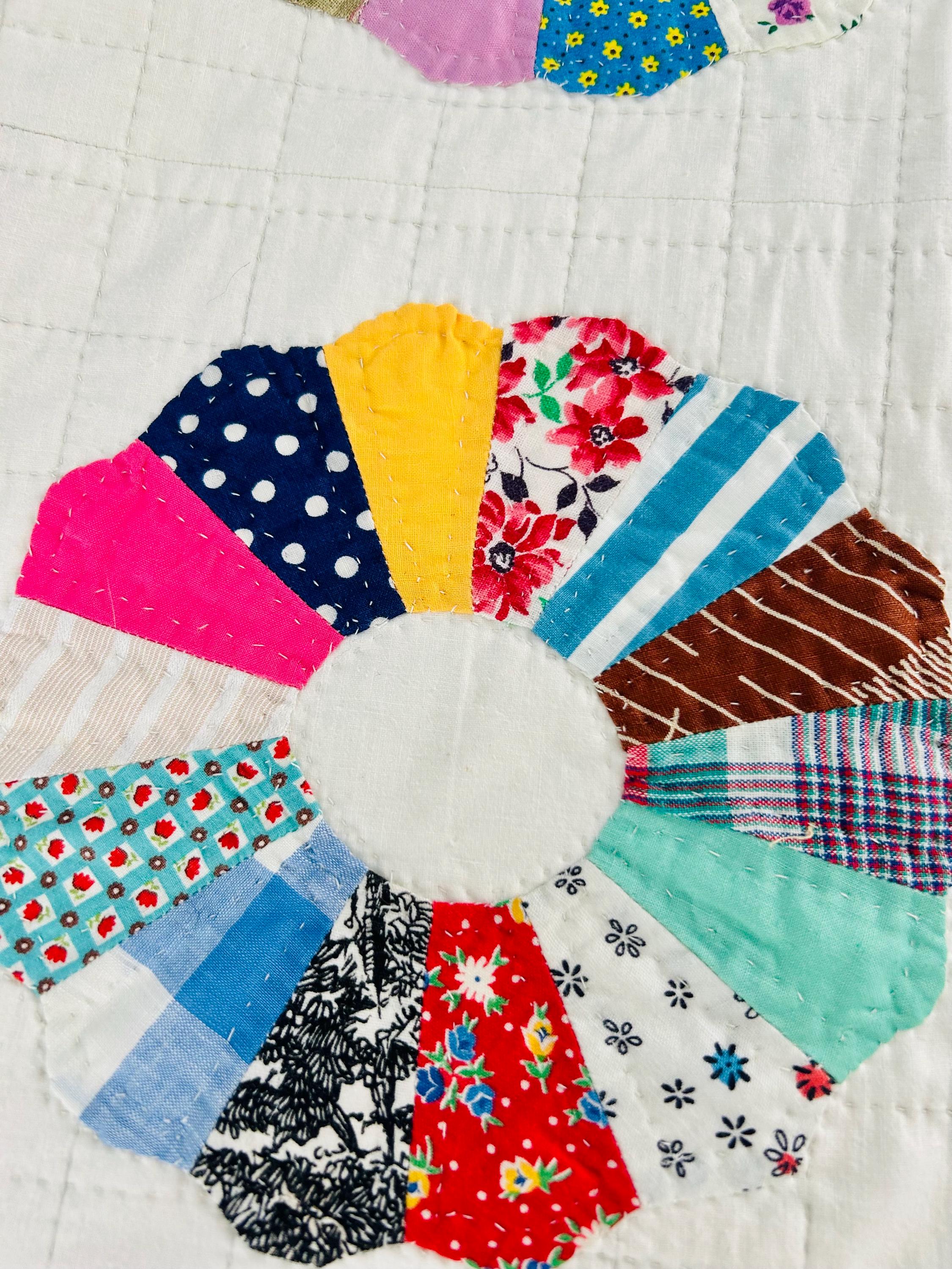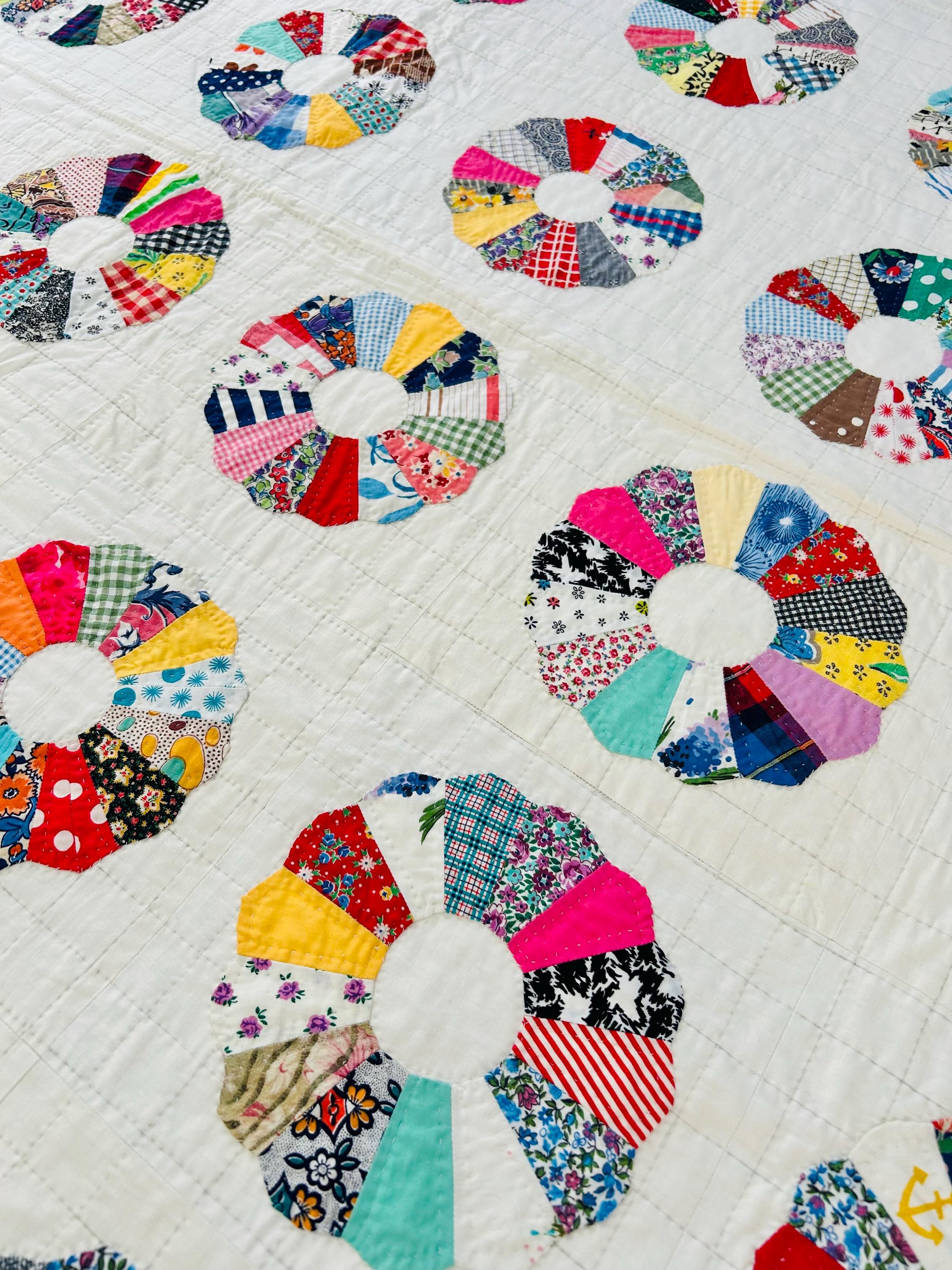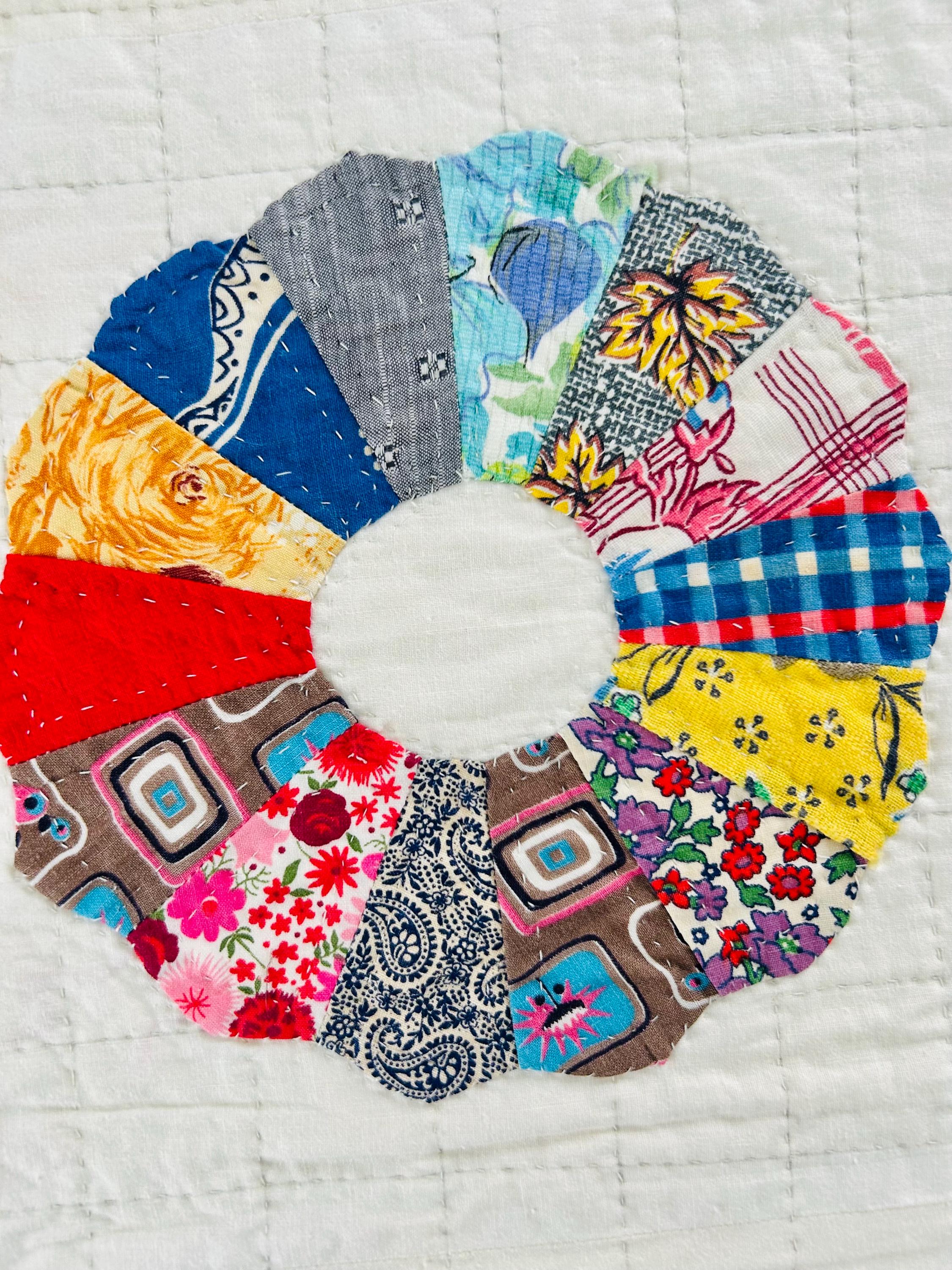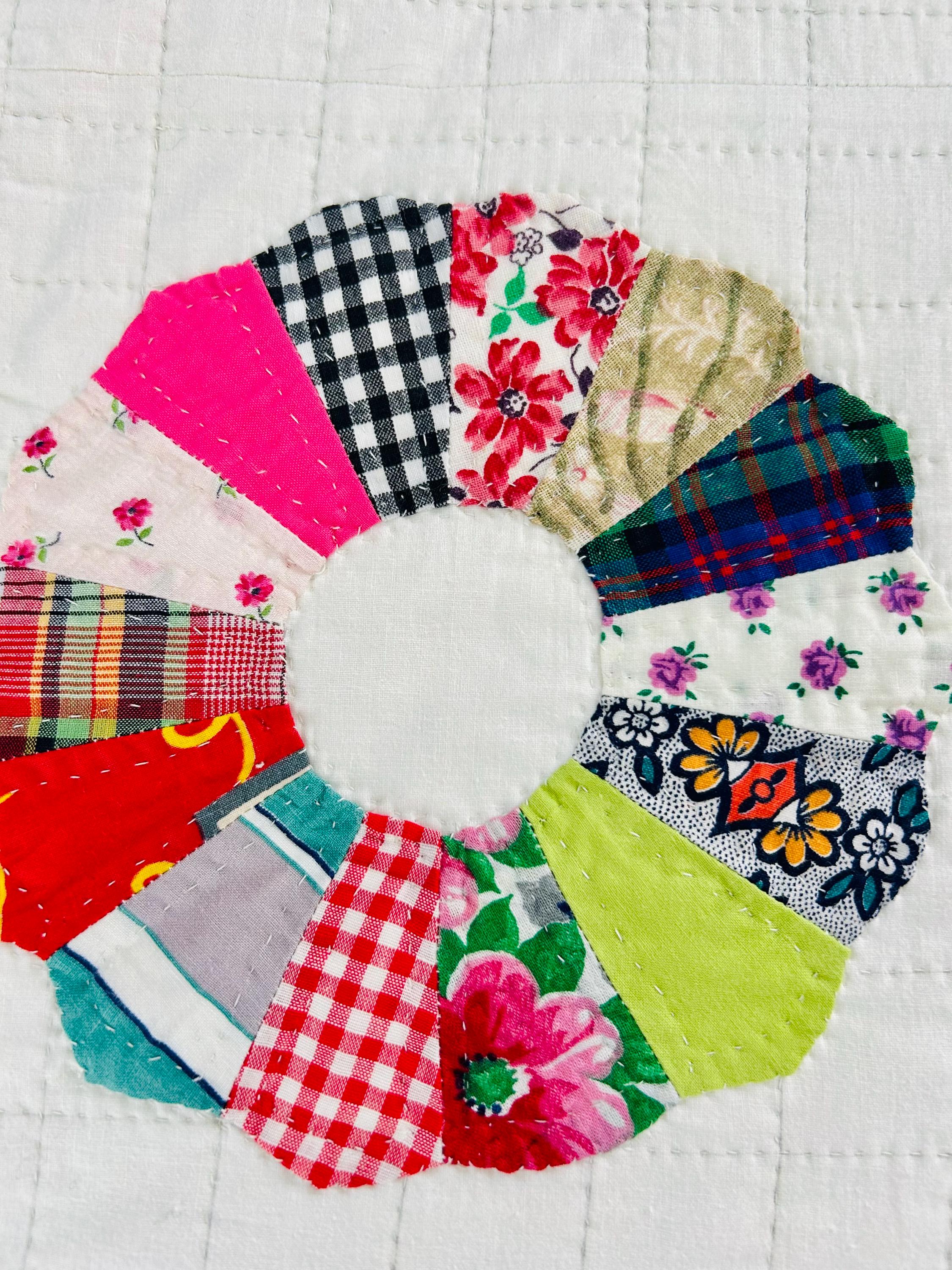 This is a charming Dresden Plate quilt that is dated 1963 in embroidery on one corner (see photos), capturing a moment in mid-century quiltmaking when feedsack and scrap traditions were still very much alive. The hand-quilting is precise and expertly done in outlines of the tiny patchwork that make up each plate and in a cross-hatch grid pattern in the white ground.