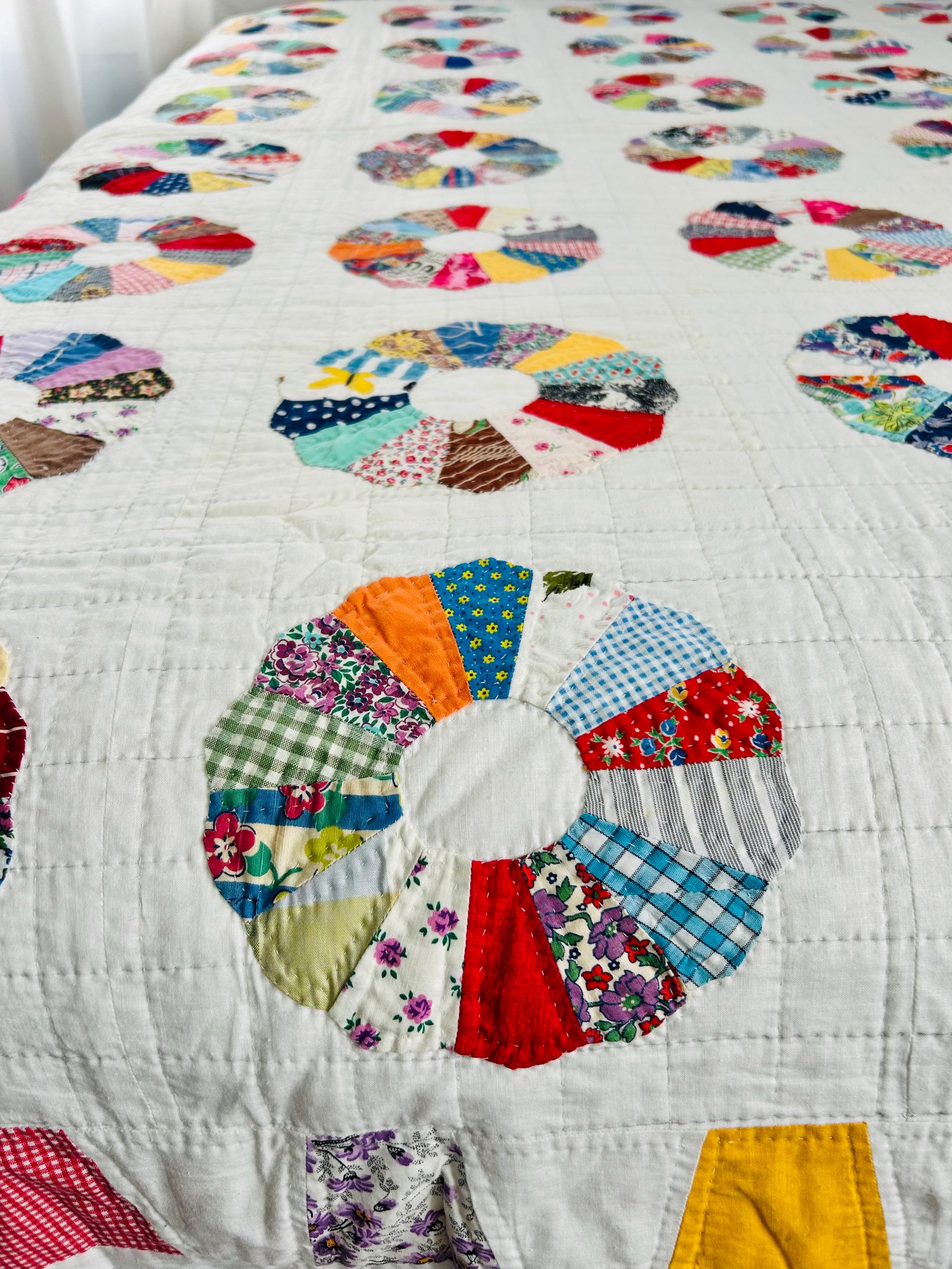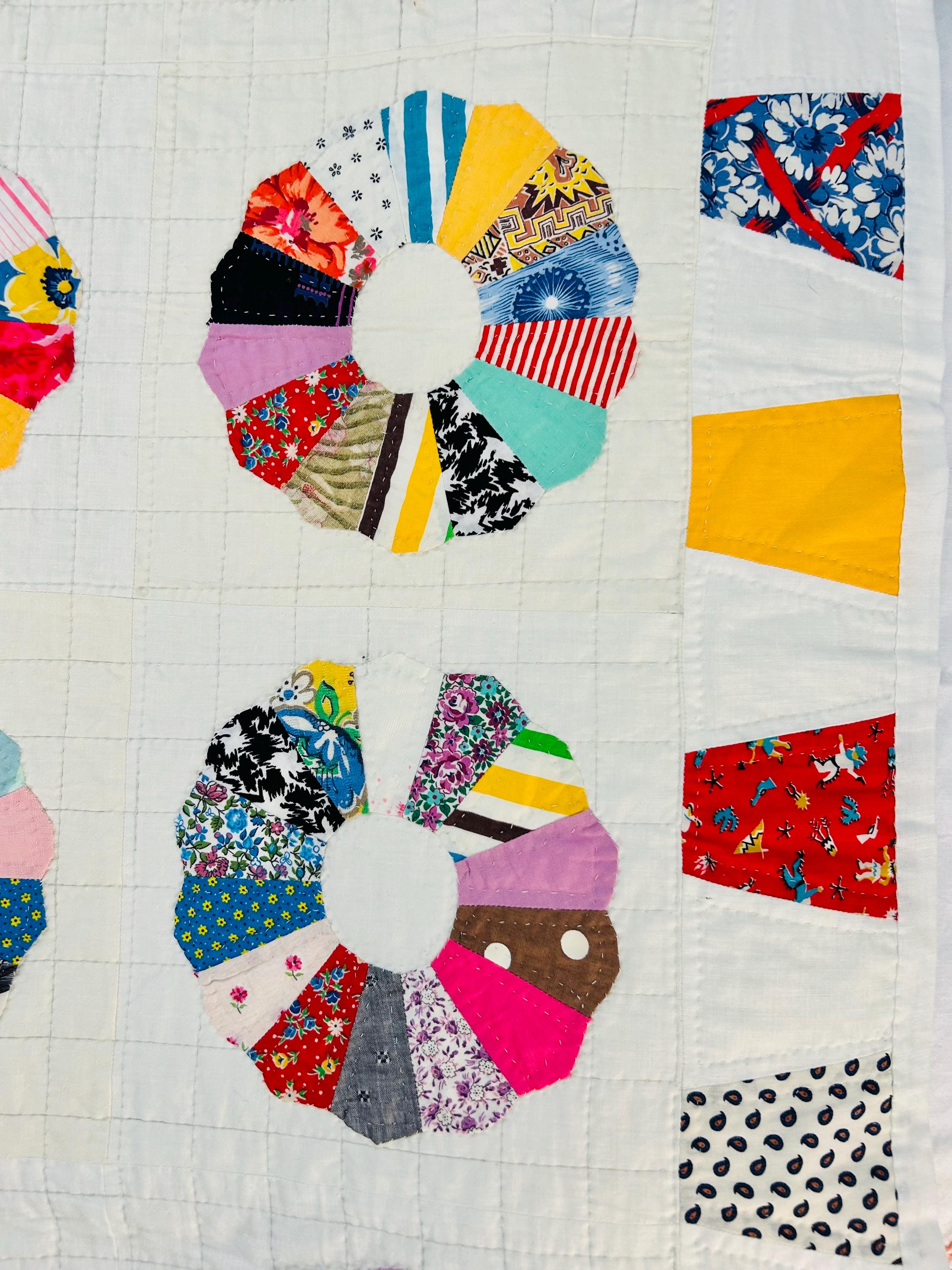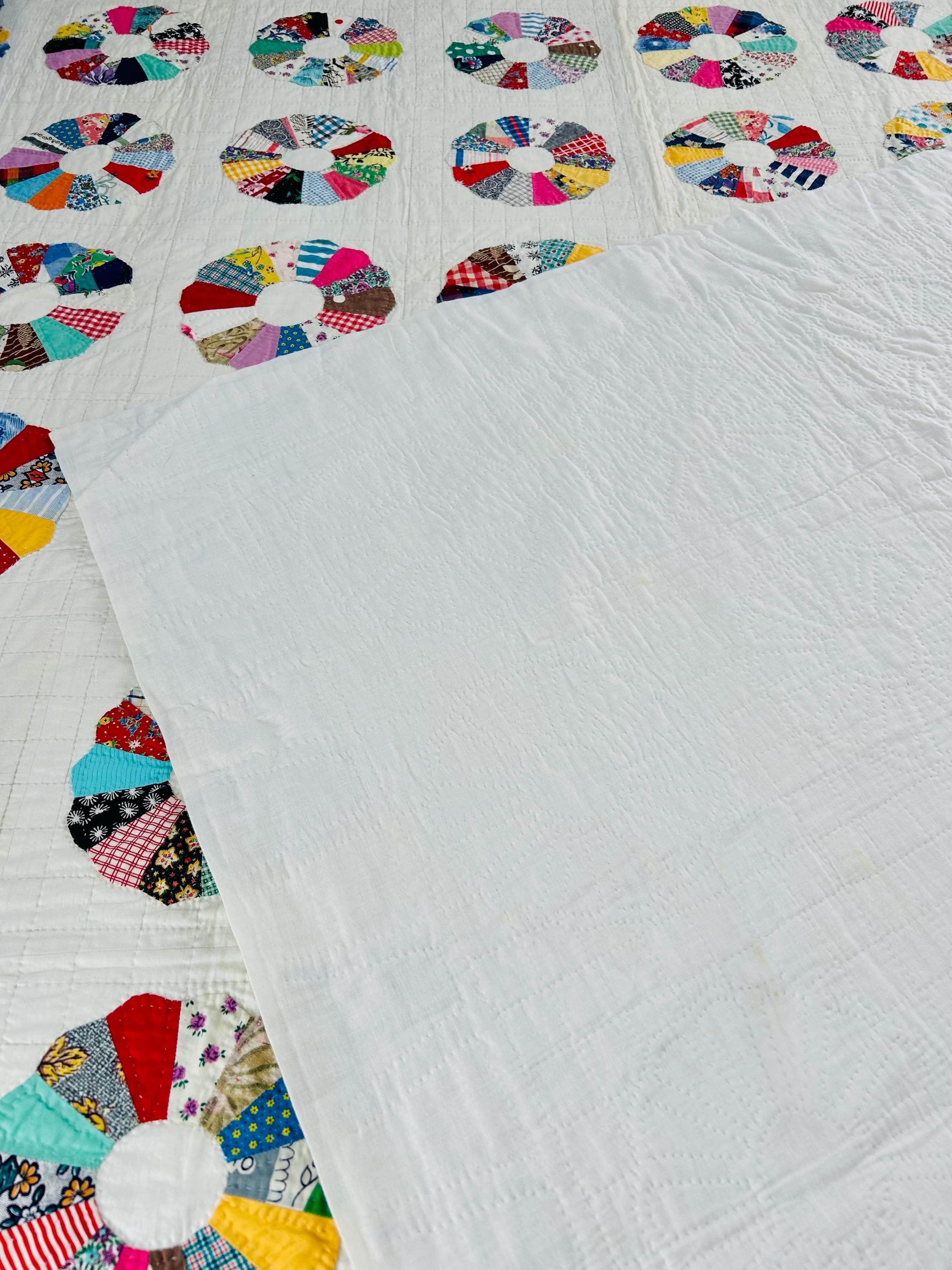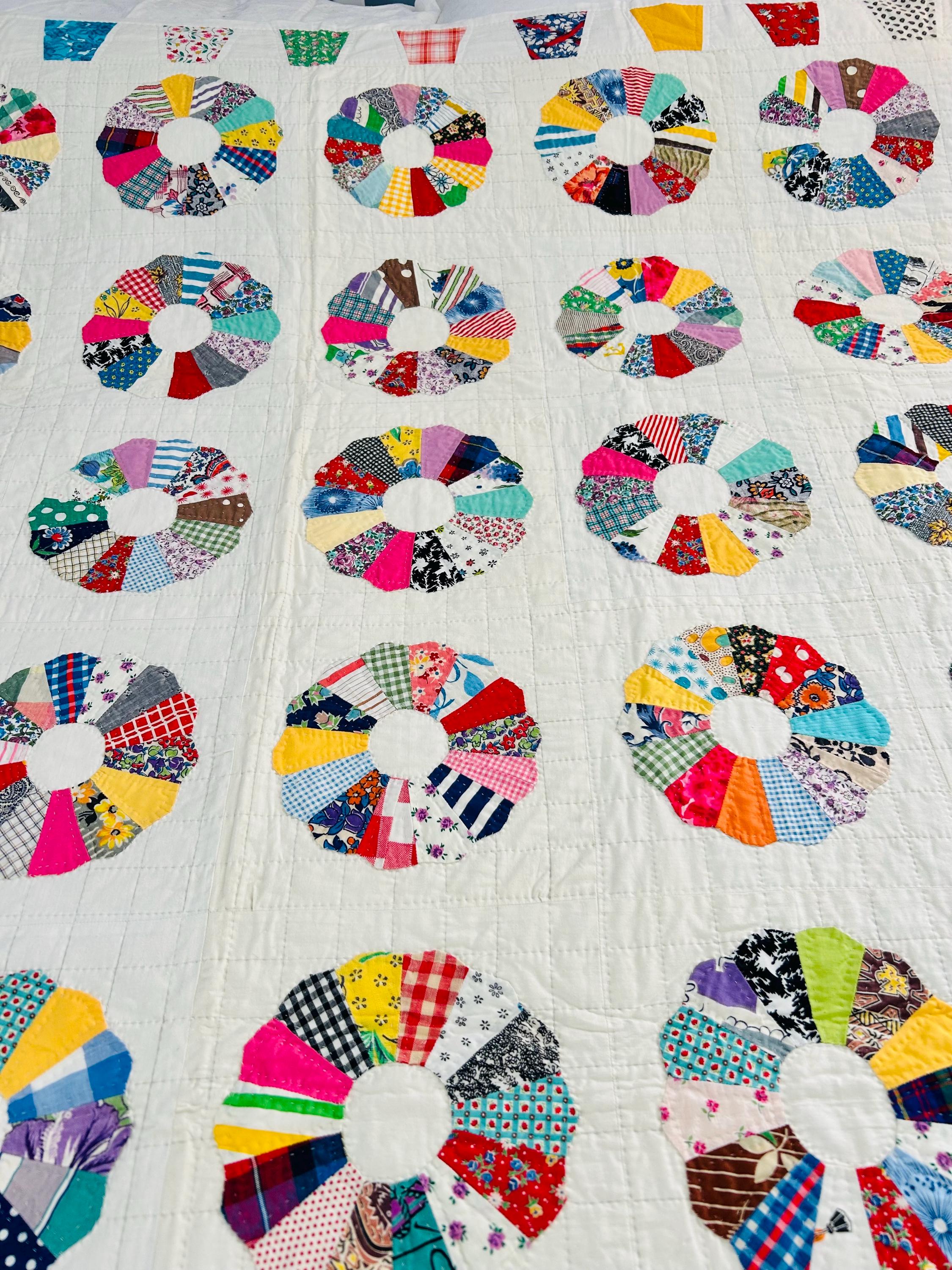 This is a charming Dresden Plate quilt that is dated 1963 in embroidery on one corner (see photos), capturing a moment in mid-century quiltmaking when feedsack and scrap traditions were still very much alive. The hand-quilting is precise and expertly done in outlines of the tiny patchwork that make up each plate and in a cross-hatch grid pattern in the white ground.