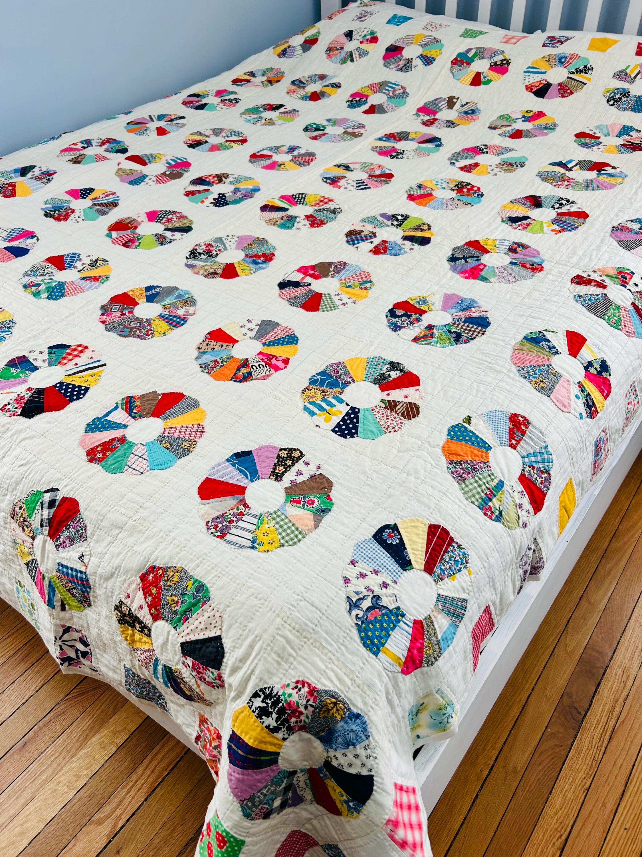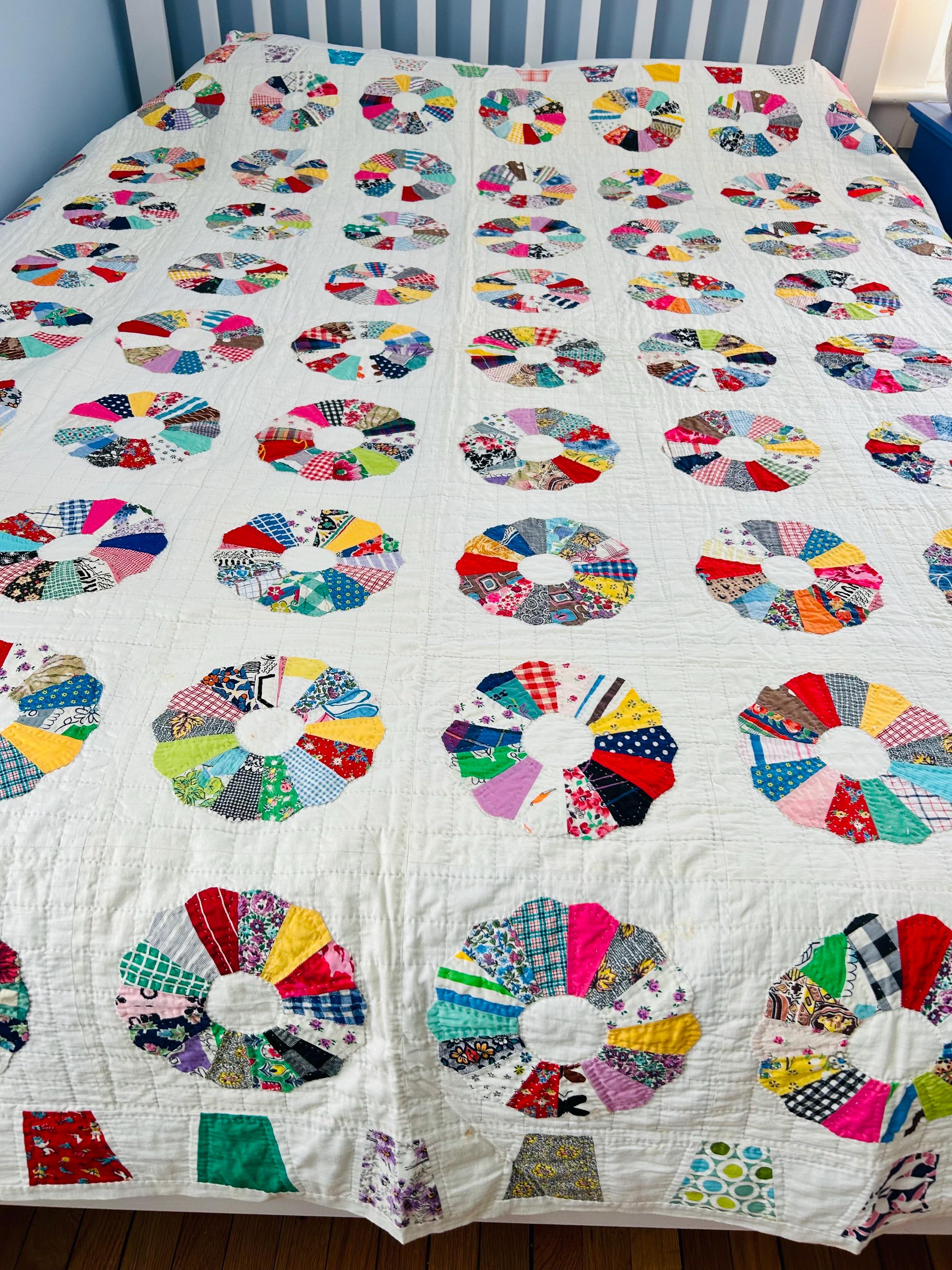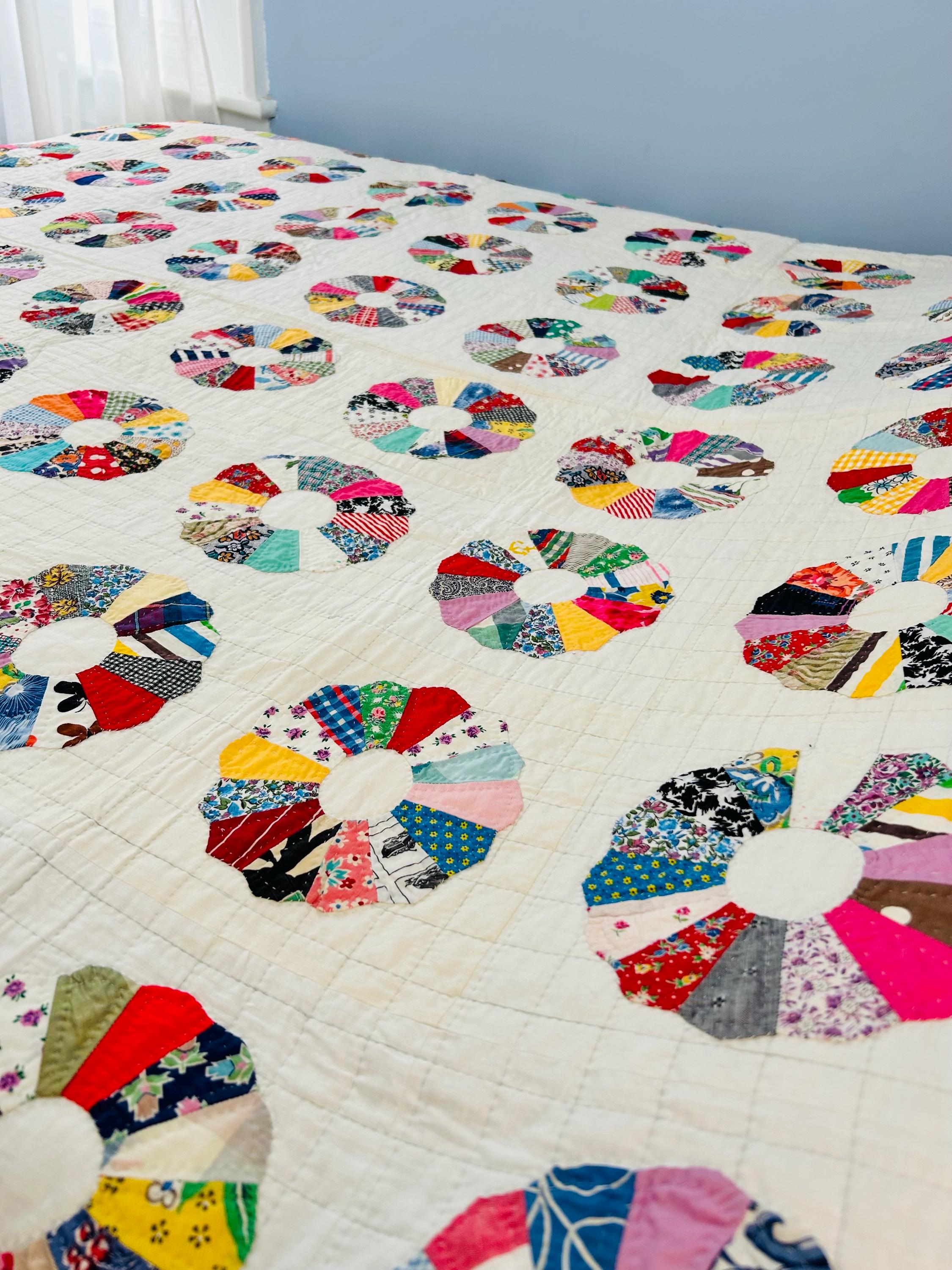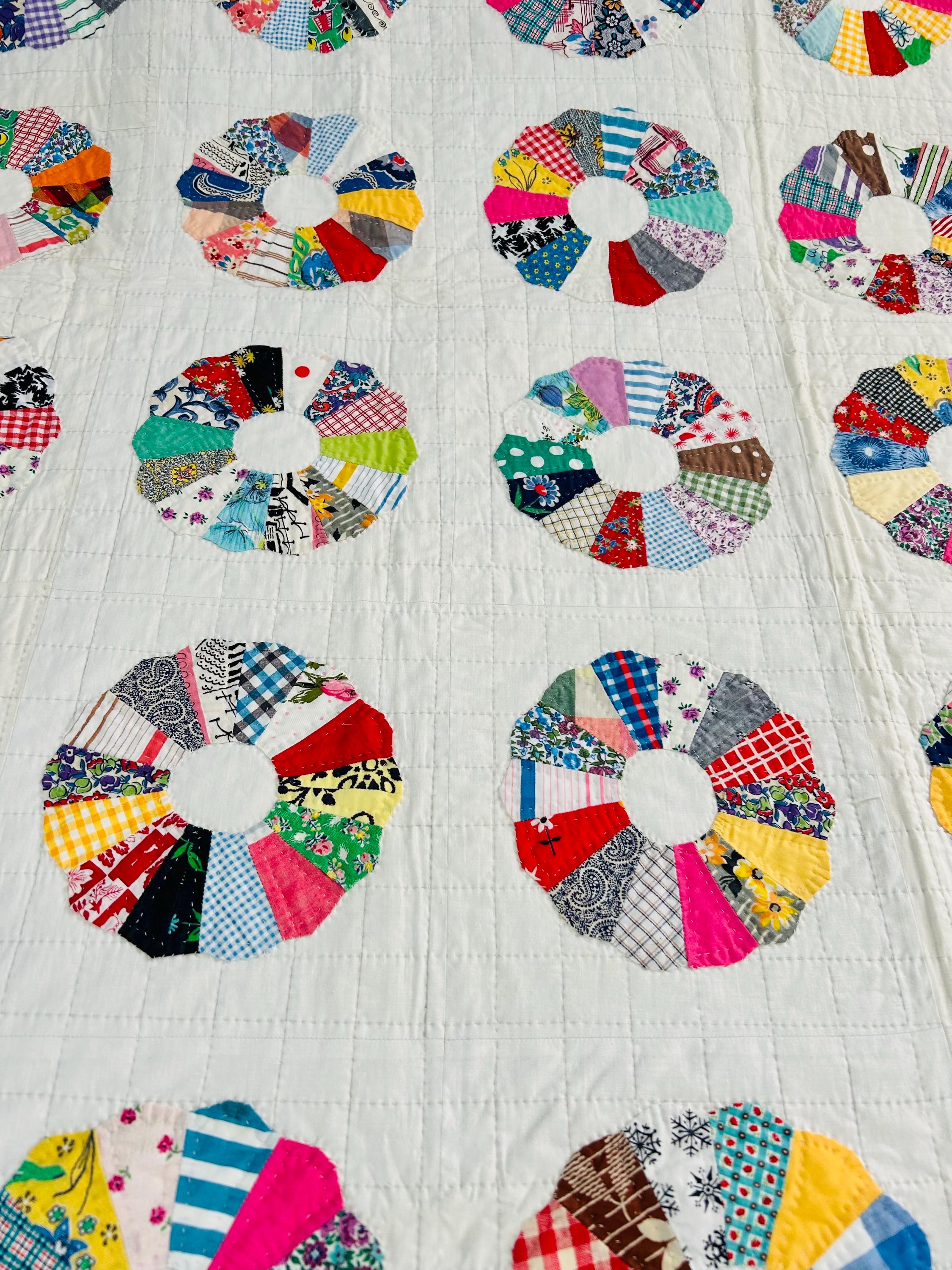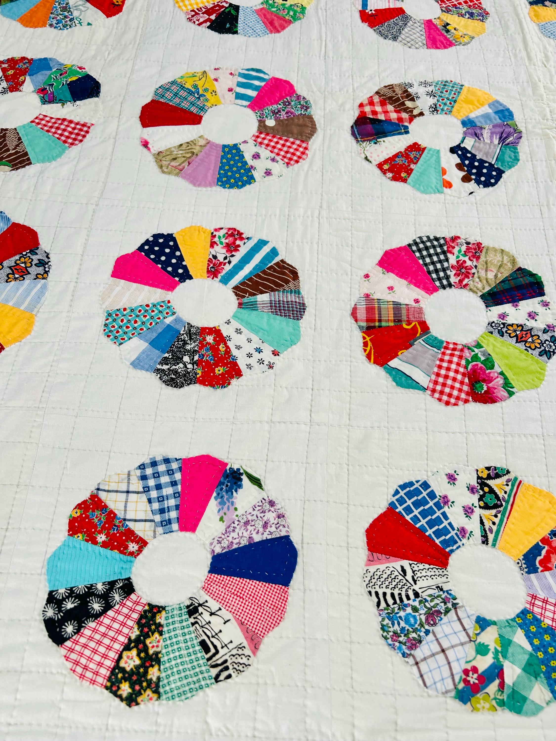 This is a charming Dresden Plate quilt that is dated 1963 in embroidery on one corner (see photos), capturing a moment in mid-century quiltmaking when feedsack and scrap traditions were still very much alive. The hand-quilting is precise and expertly done in outlines of the tiny patchwork that make up each plate and in a cross-hatch grid pattern in the white ground.