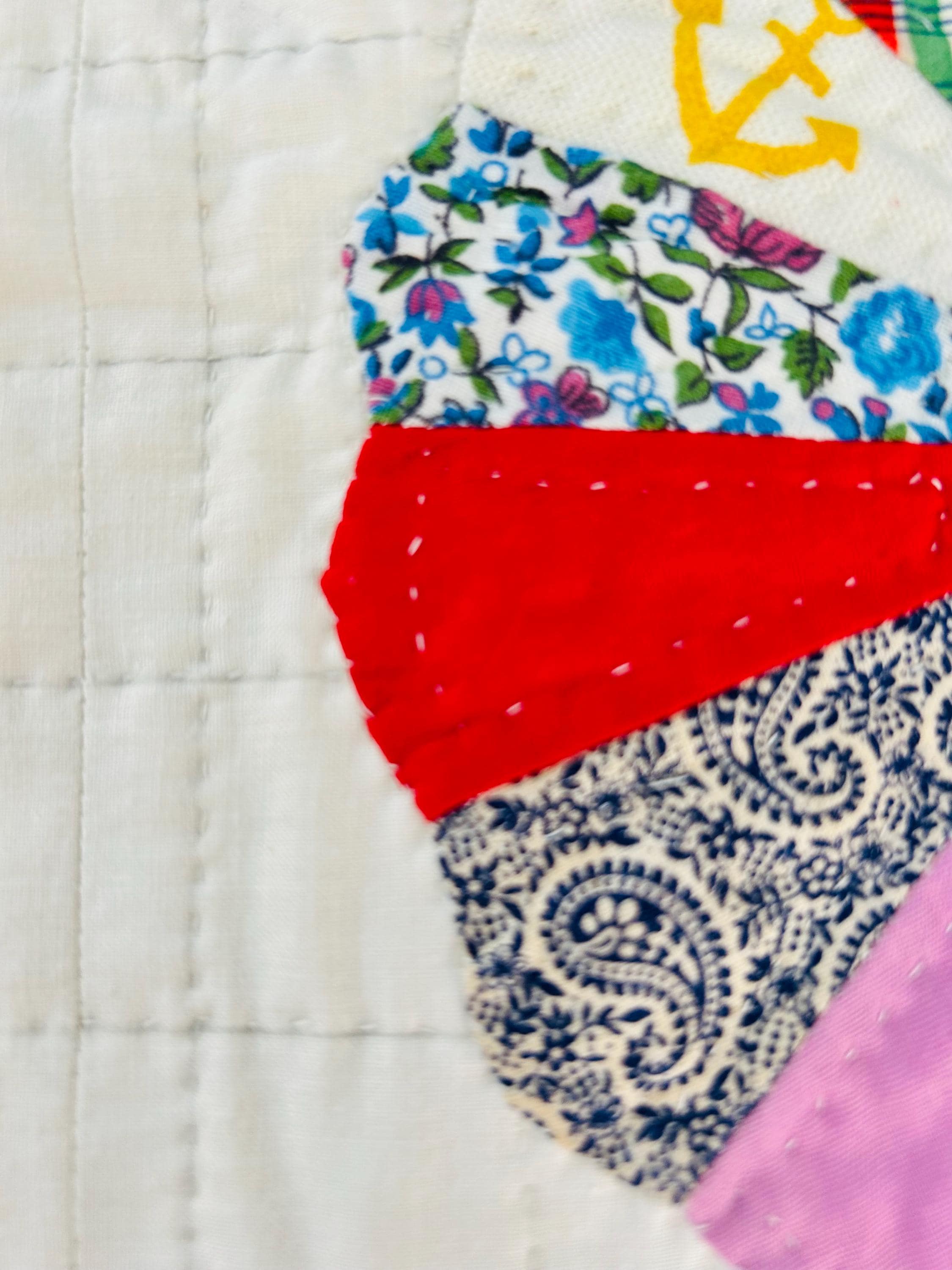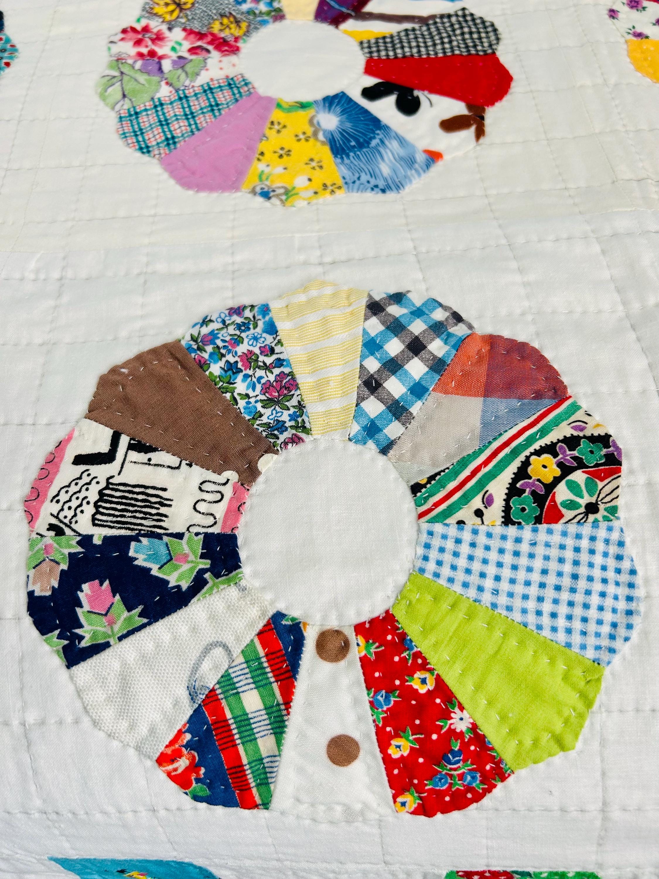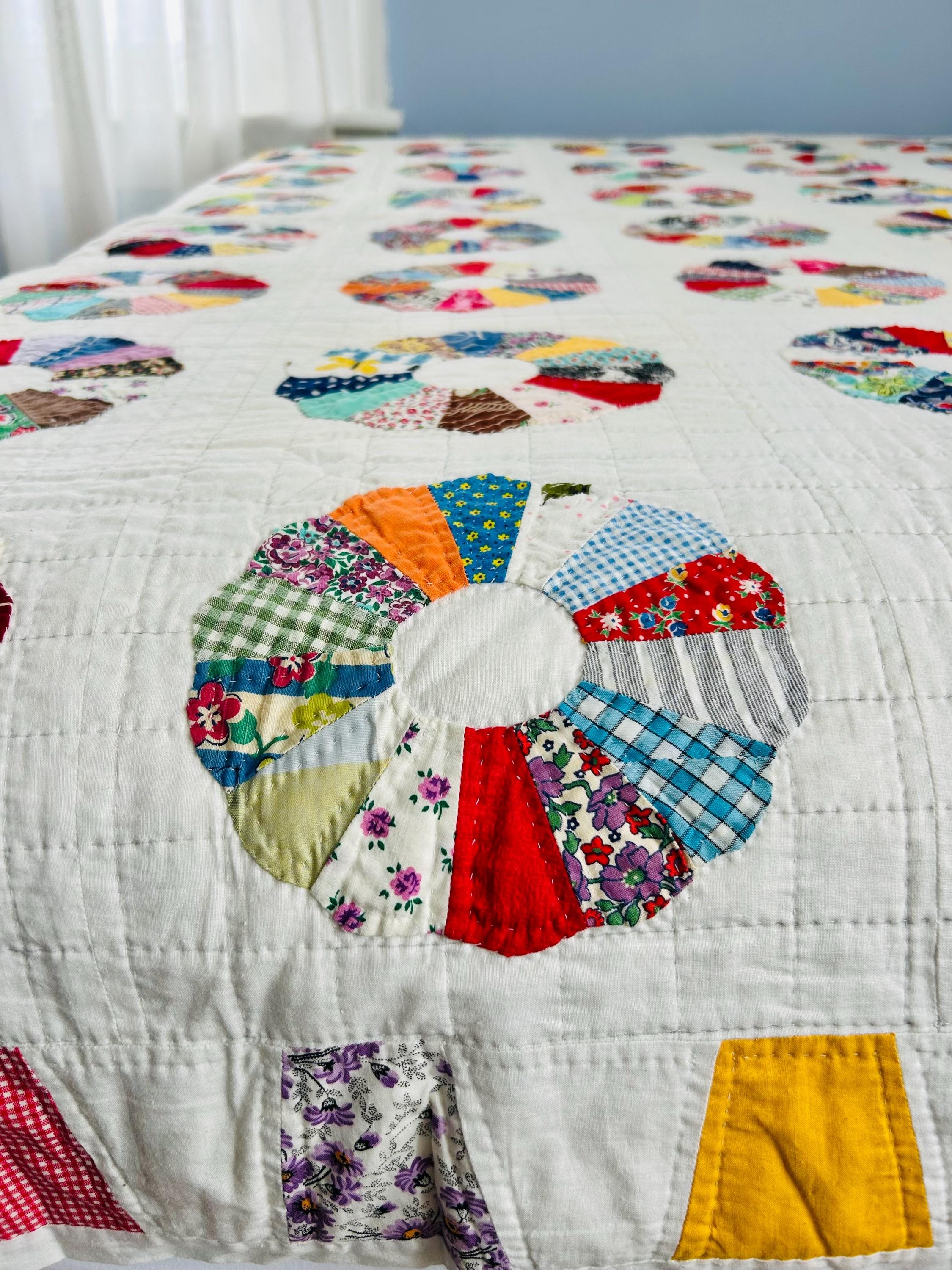 Details • Pattern: Dresden Plate (miniature scale) • Date: Dated "1963" on one corner • Size: 74” x 82” • Blocks: Small Dresden Plates (~6” diameter) • Fabrics: Feedsack, florals, plaids, novelty prints, cotton scraps • Construction: Hand pieced, hand appliquéd, and hand quilted • Quilting Pattern: Straight grid / crosshatch / echo quilting and concentric circles • Batting: Lightweight cotton • Backing: Plain white cotton