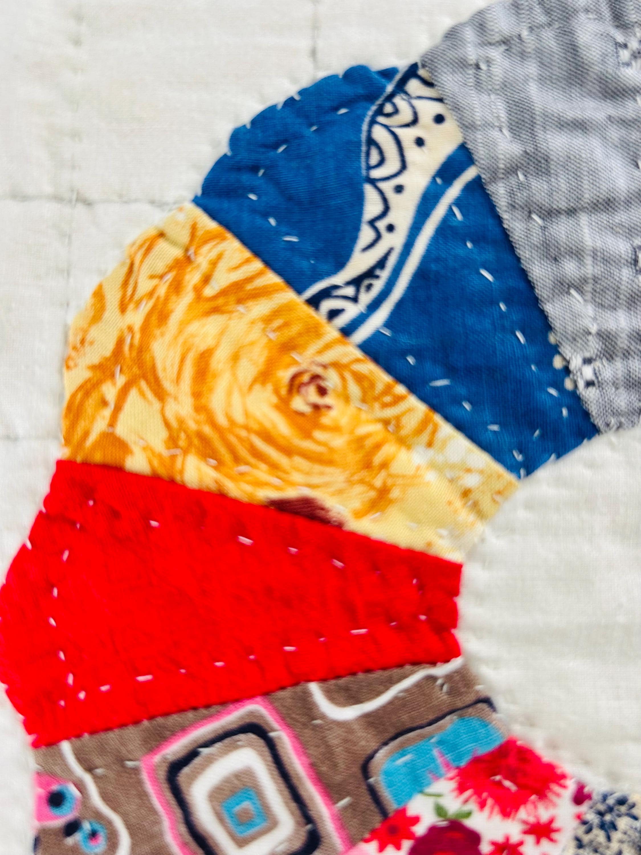 The same scrappy fabrics are used in the four-sided ice-cream-cone-border, which is also finely hand-quilted in outlines of the patchwork with concentric circles quilted at each corner.