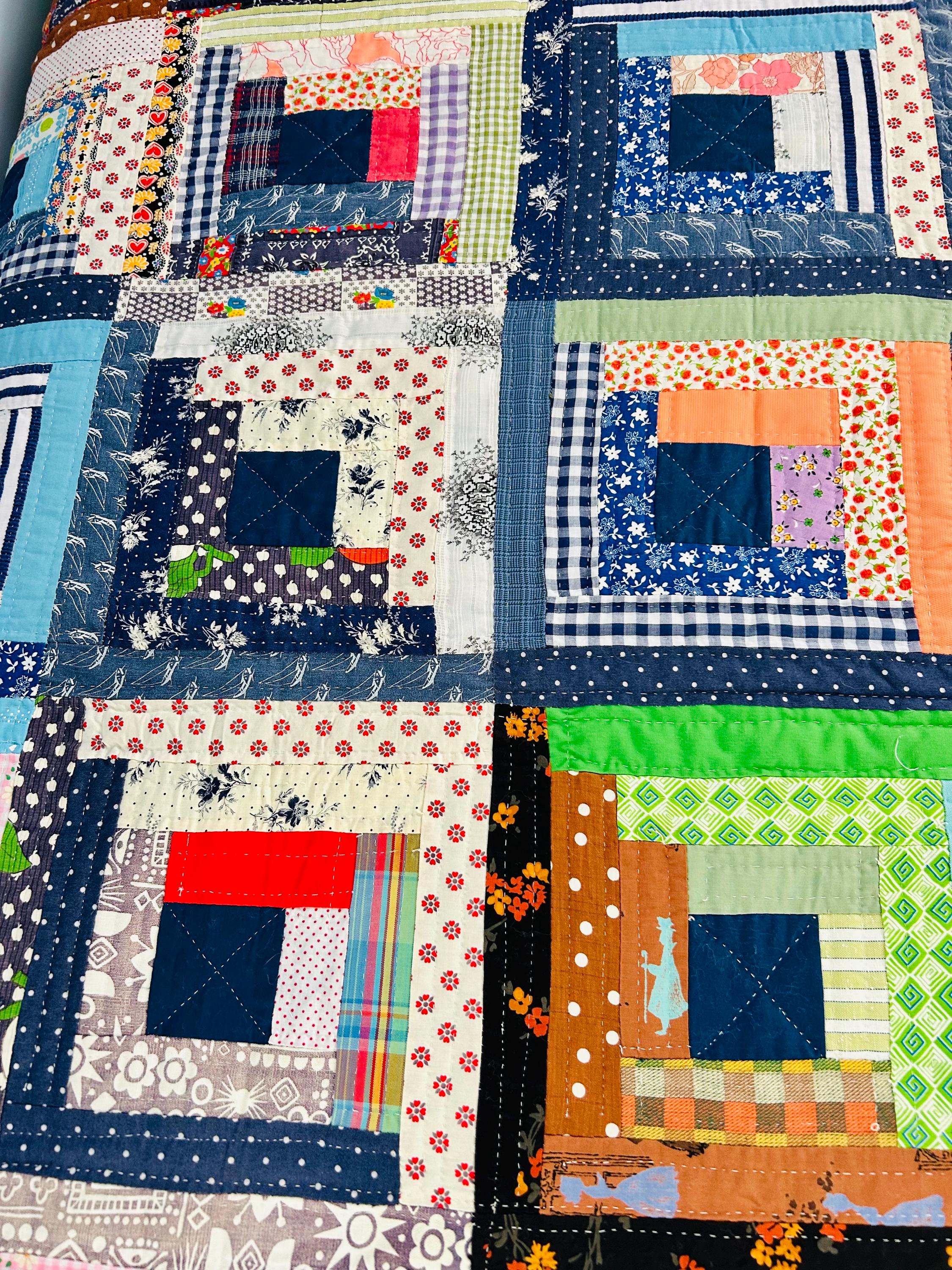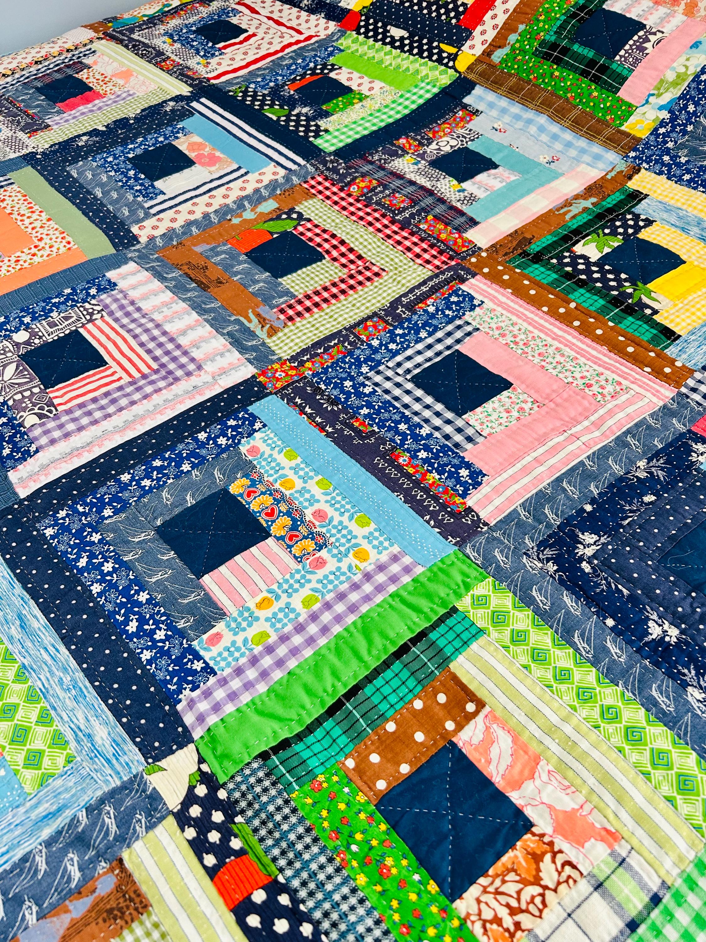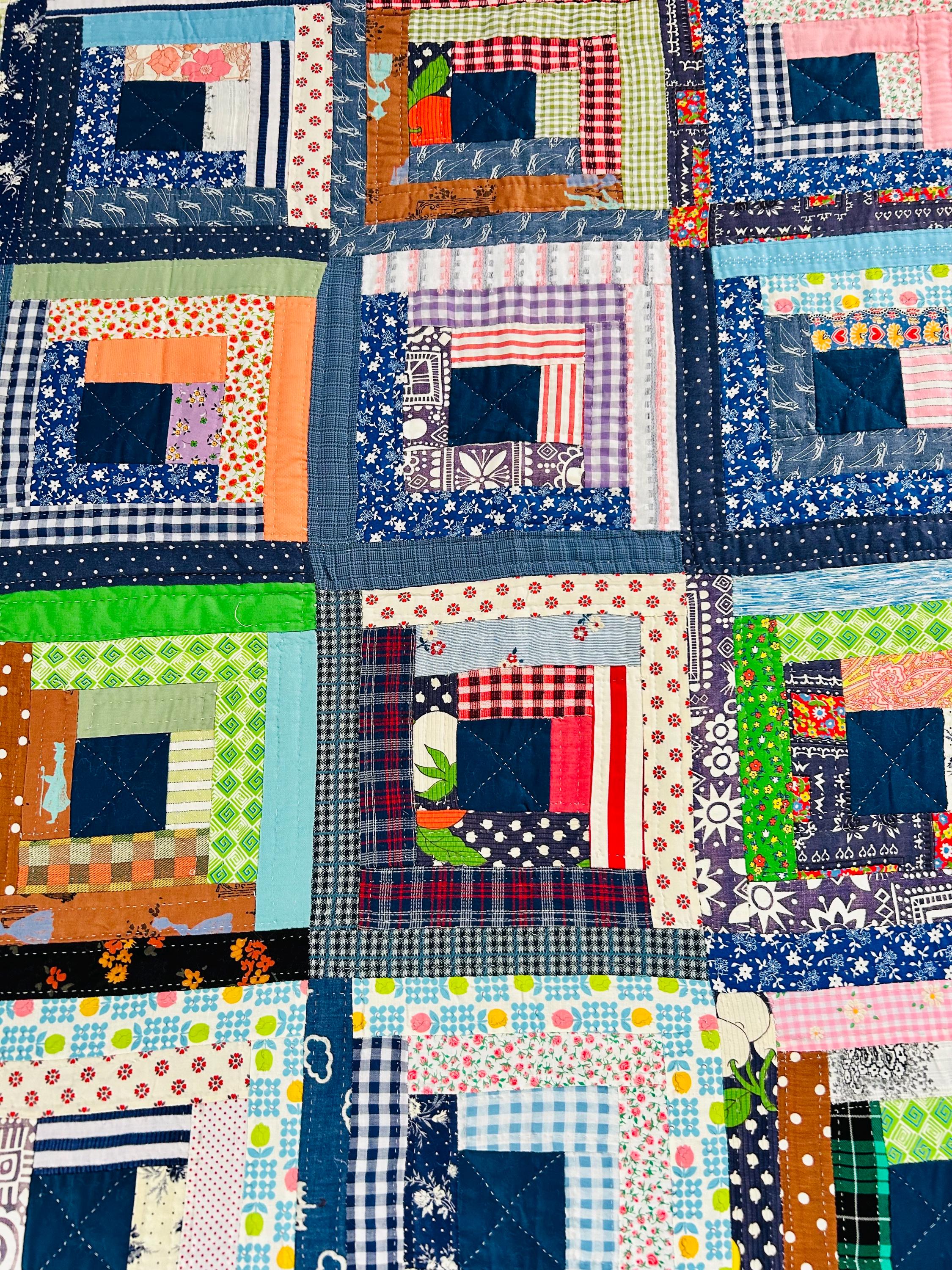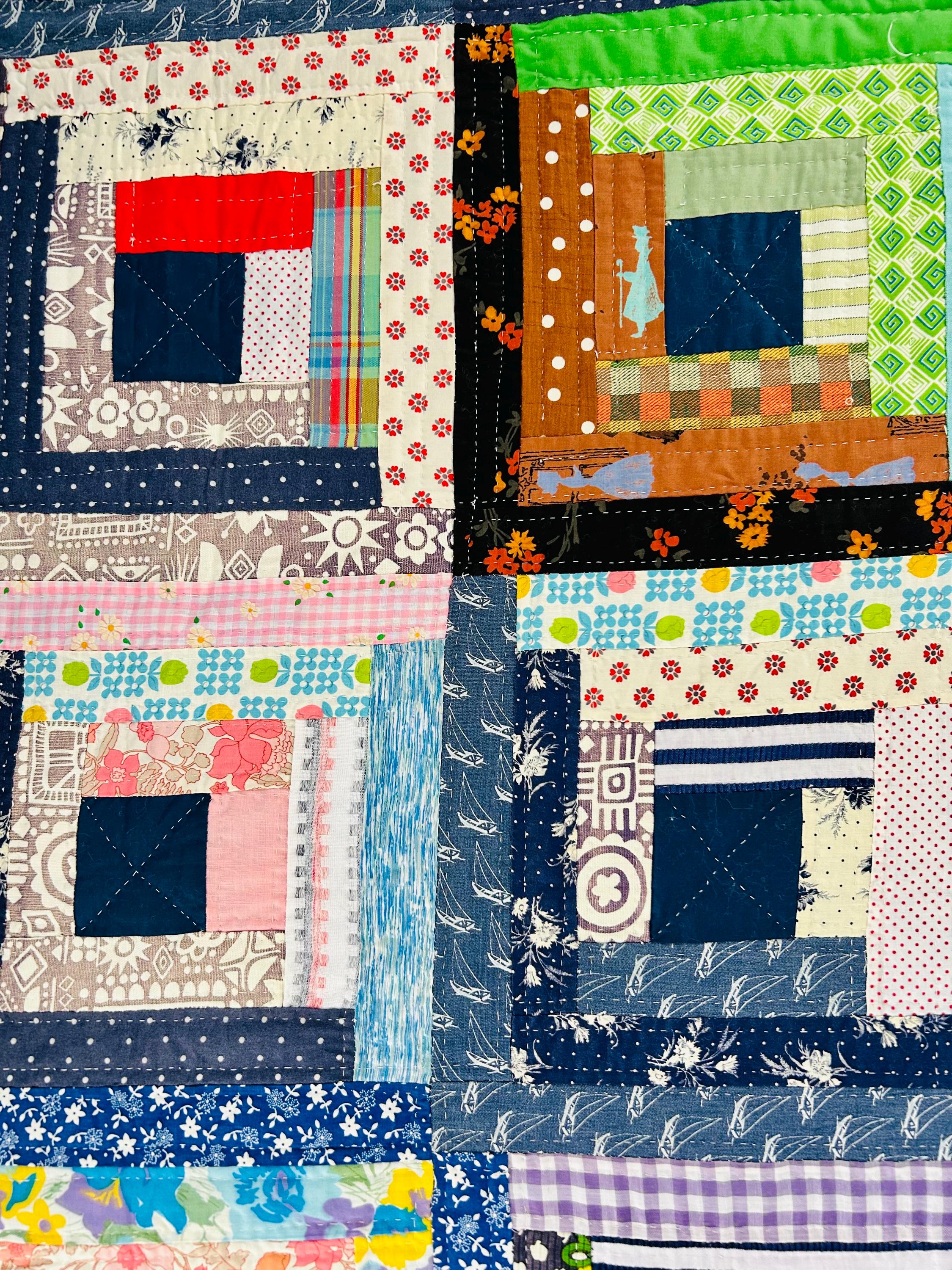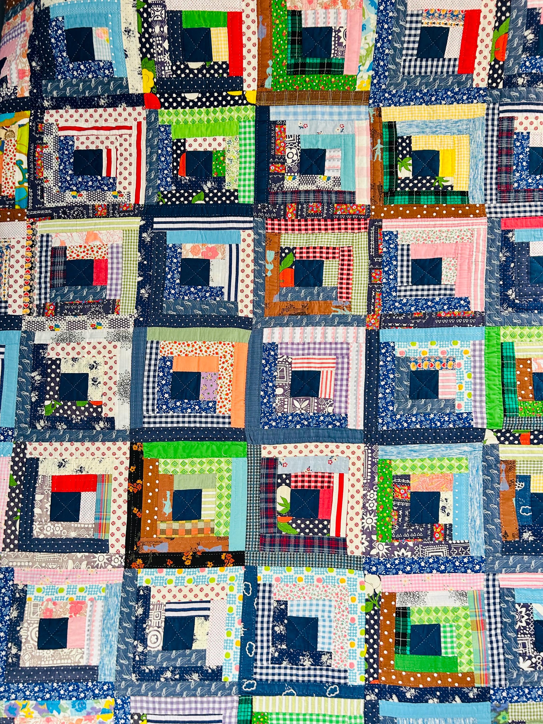 This quilt incorporates a rich variety of fabrics from the 1950s and 1960s, including cheerful feed sack prints, shirtings, and workwear textiles. The result is a lively and visually textured quilt. The deep navy centers anchor each block, while the surrounding logs are filled with color—florals, plaids, stripes, and charming small-scale prints.
