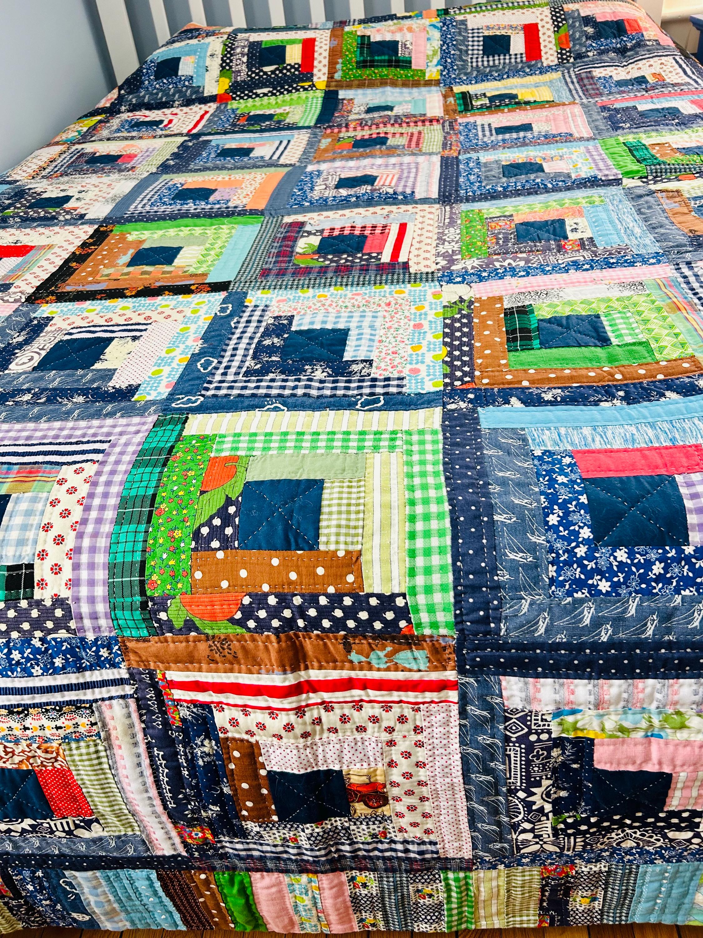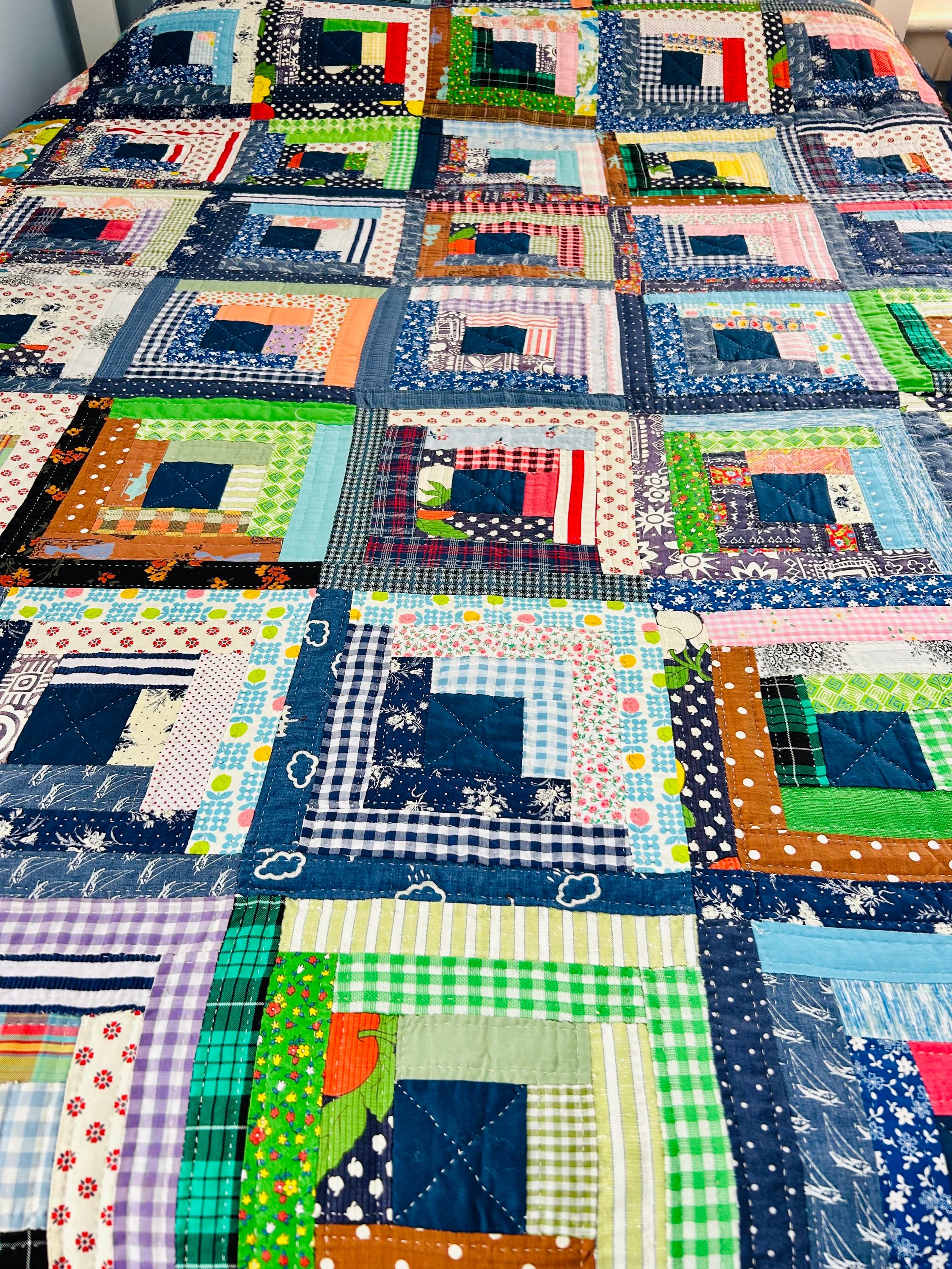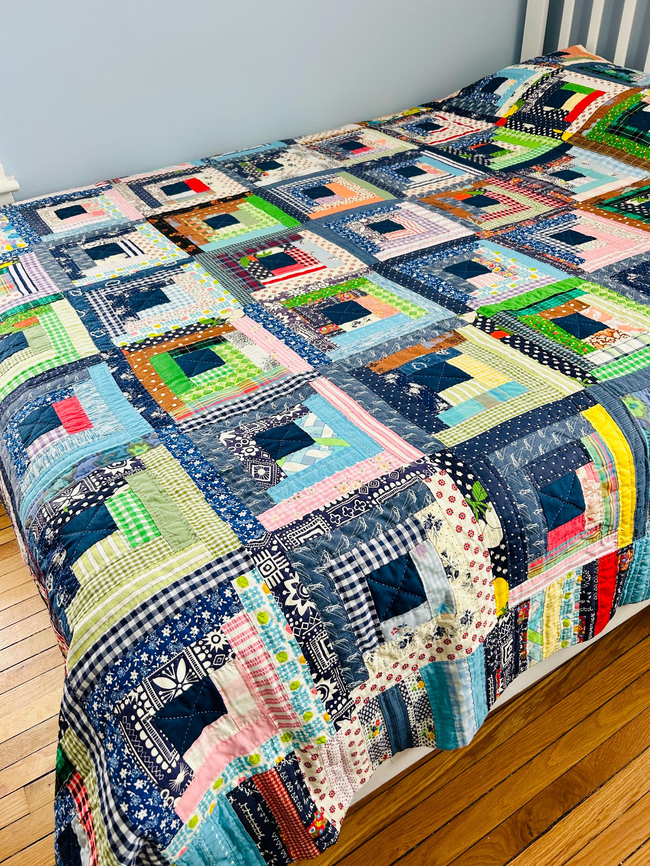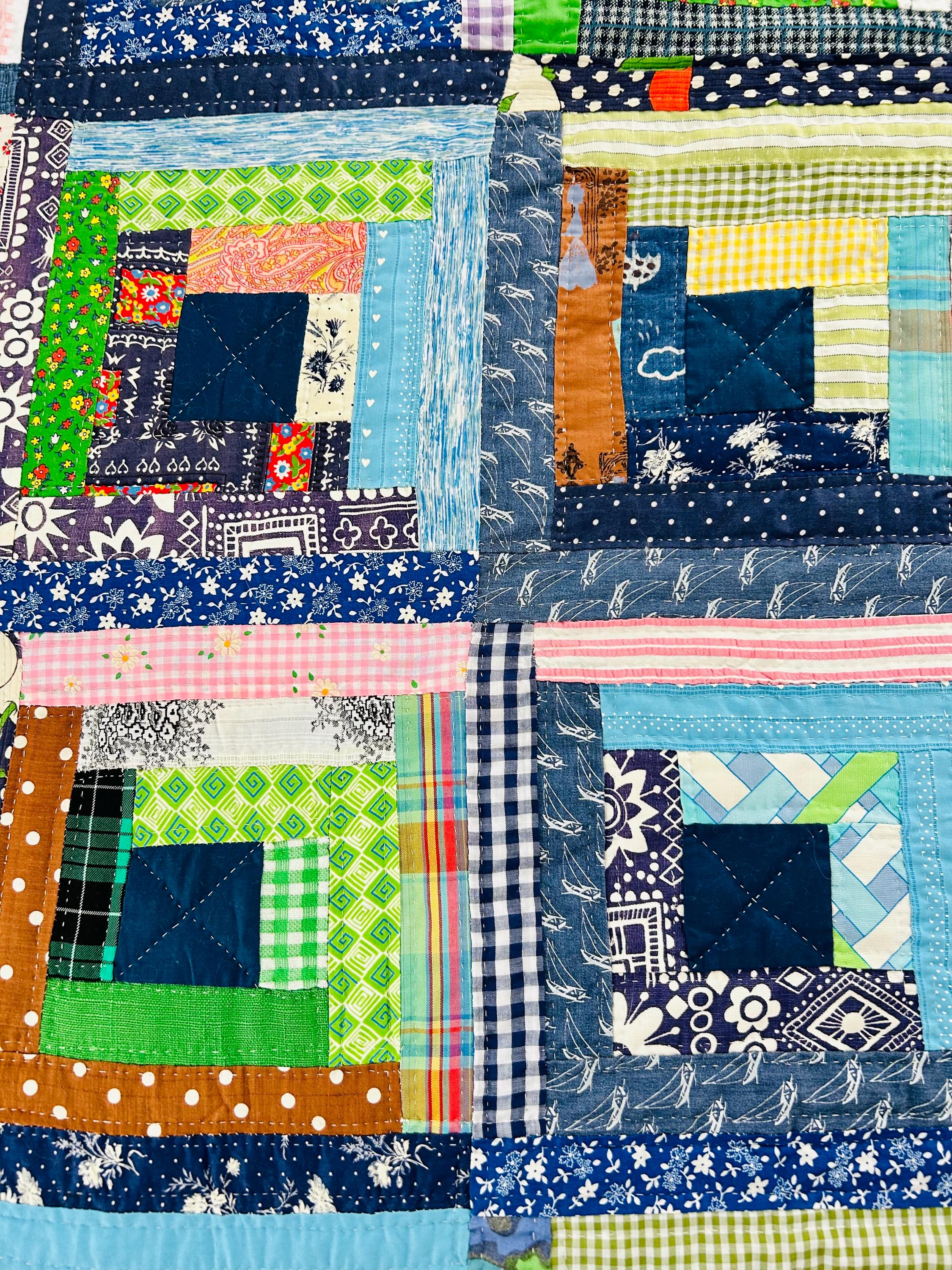 This quilt incorporates a rich variety of fabrics from the 1950s and 1960s, including cheerful feed sack prints, shirtings, and workwear textiles. The result is a lively and visually textured quilt. The deep navy centers anchor each block, while the surrounding logs are filled with color—florals, plaids, stripes, and charming small-scale prints.