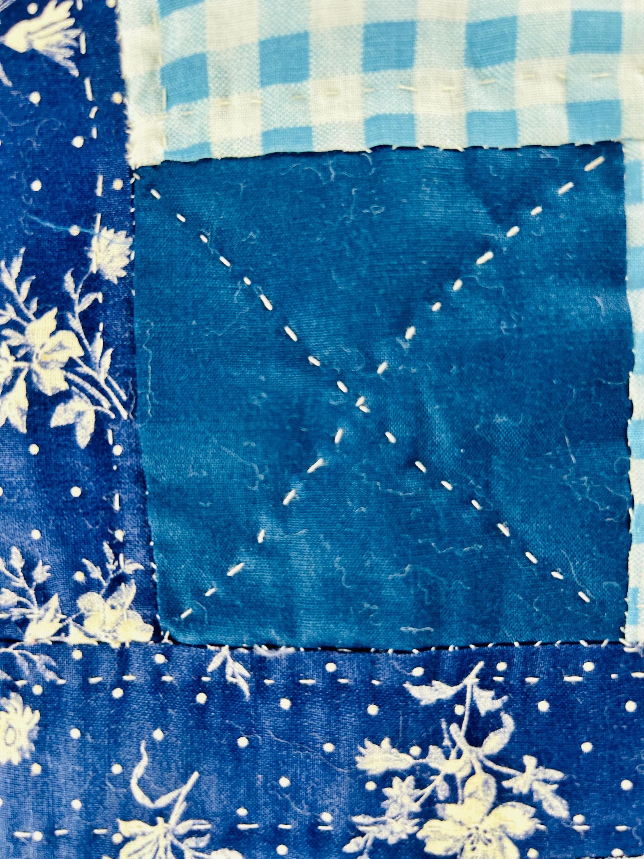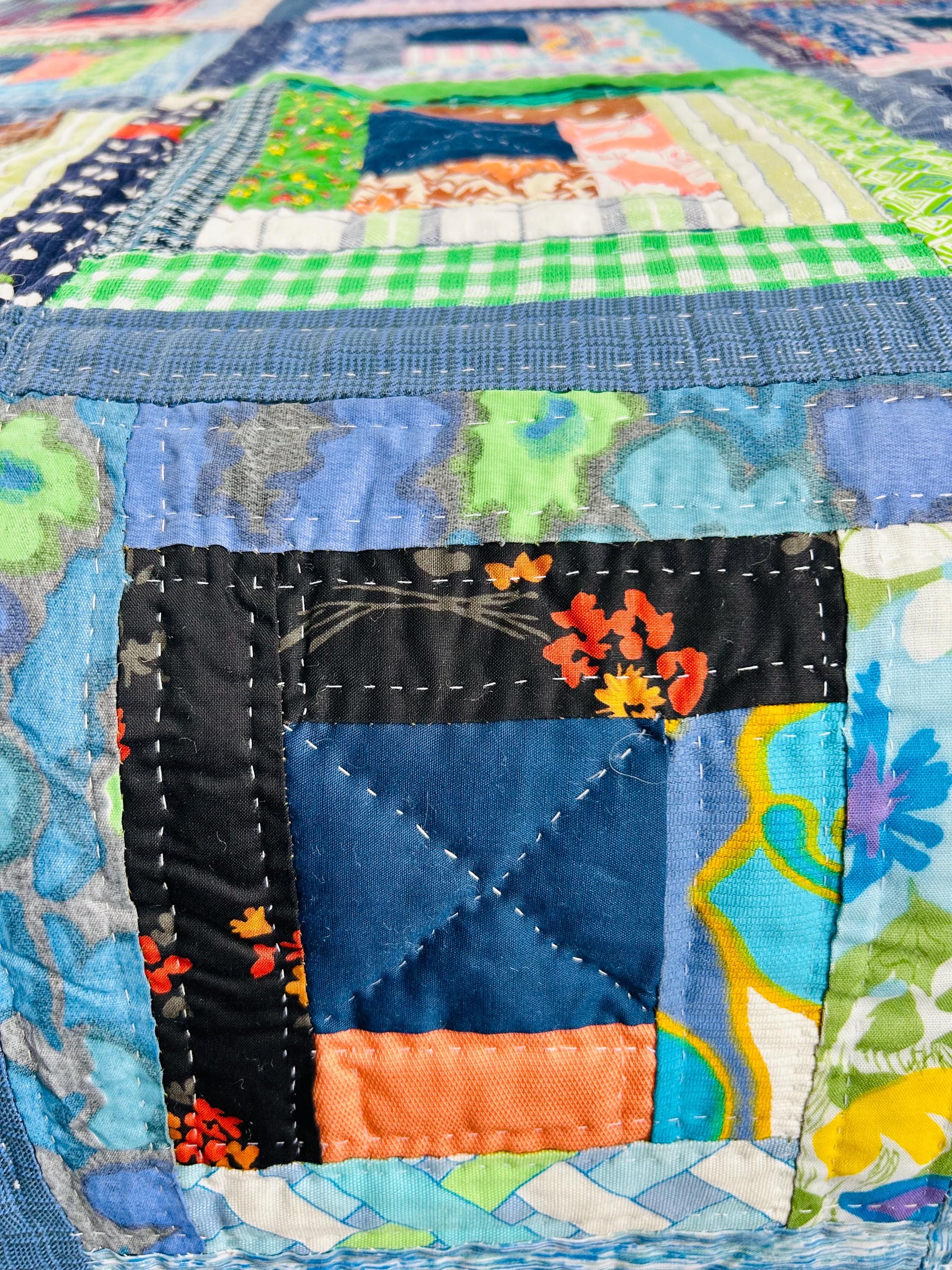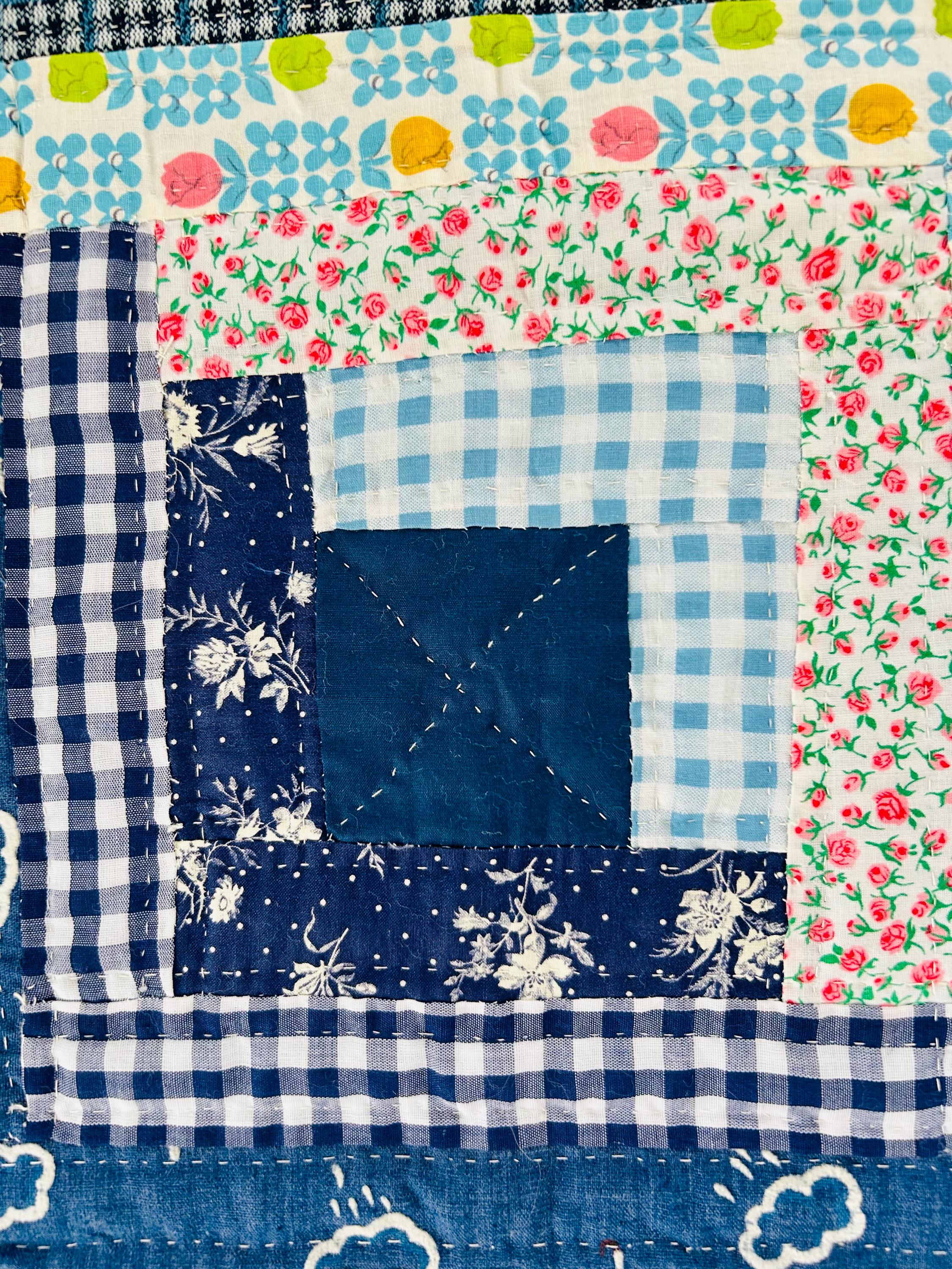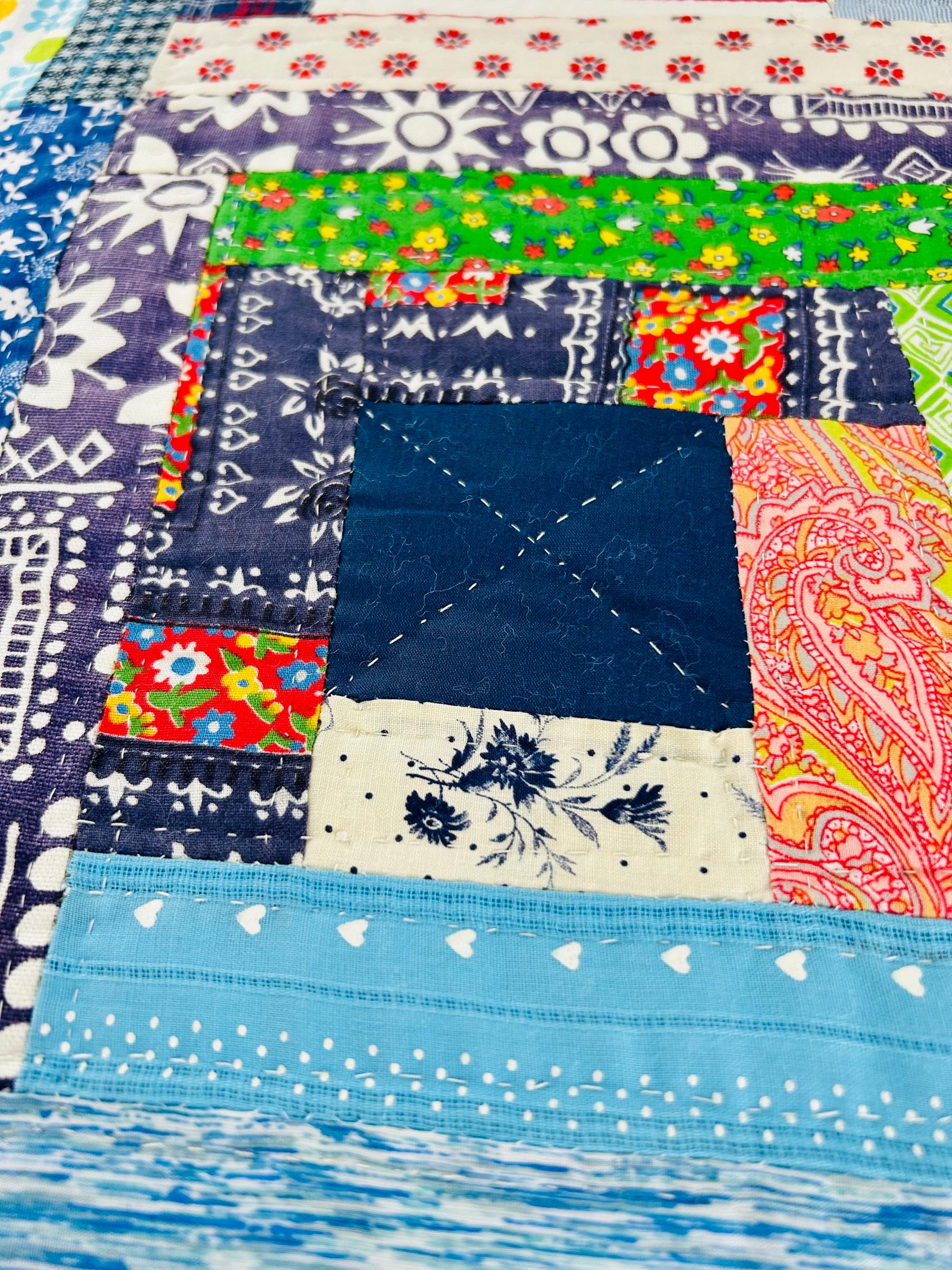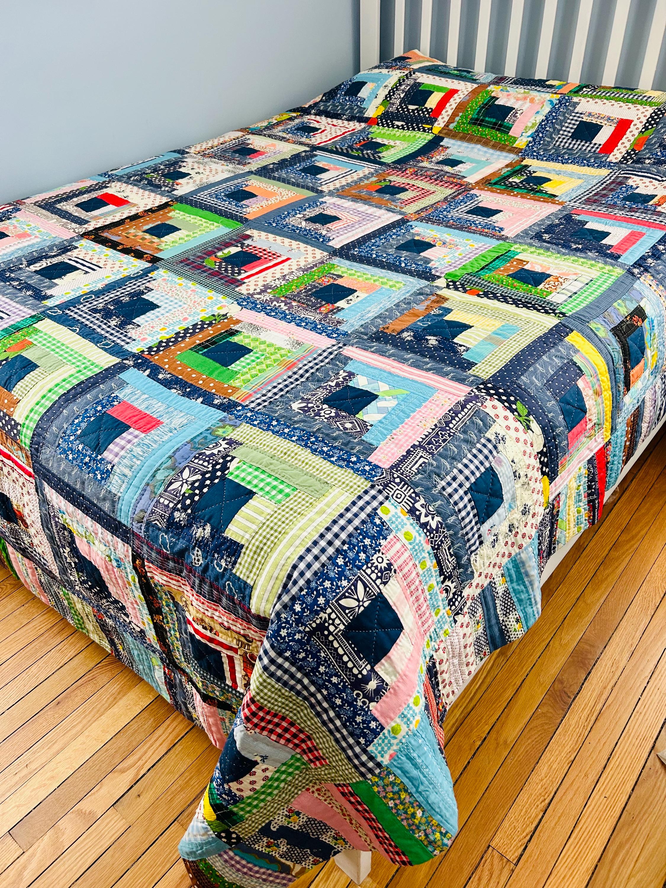 This quilt incorporates a rich variety of fabrics from the 1950s and 1960s, including cheerful feed sack prints, shirtings, and workwear textiles. The result is a lively and visually textured quilt. The deep navy centers anchor each block, while the surrounding logs are filled with color—florals, plaids, stripes, and charming small-scale prints.