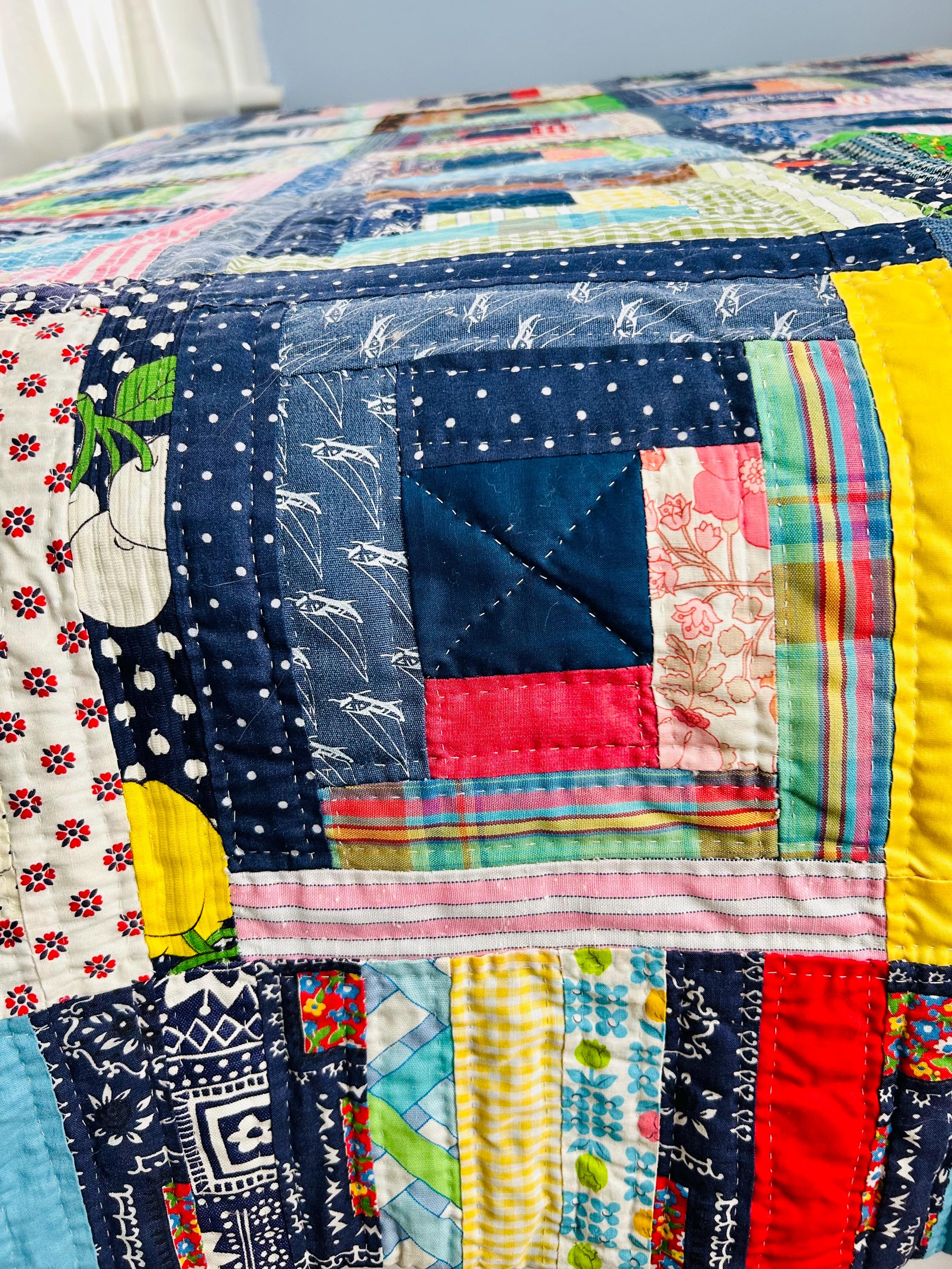 This is a beautiful authentic mid-century American scrap quilt, hand pieced and hand quilted in the classic Log Cabin pattern arranged in a Straight Furrows setting. The hand-quilting is in outlines of the patchwork and in cross-hatches in the center of each "log cabin".