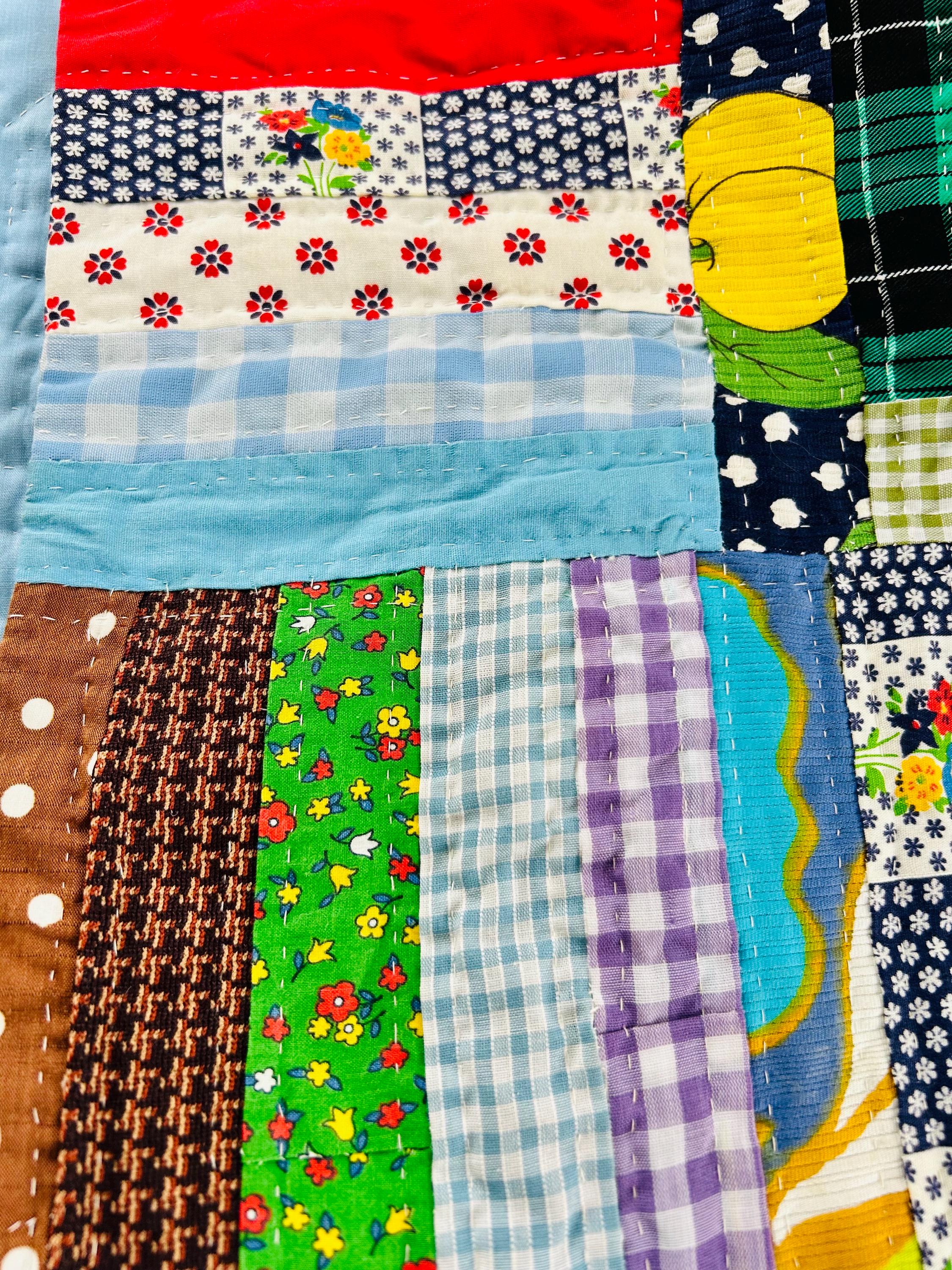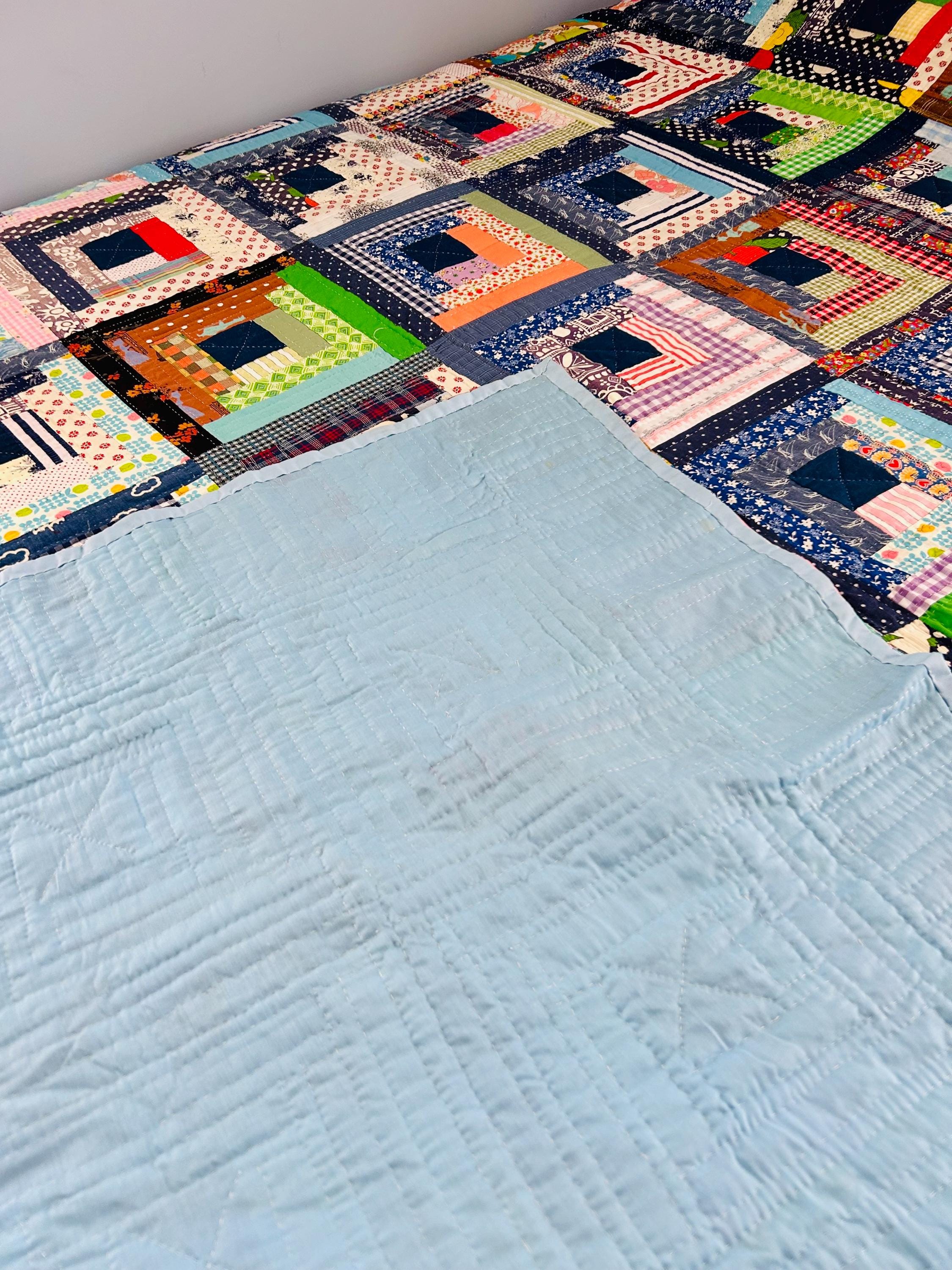 ✨ Details • Pattern: Log Cabin (Straight Furrows setting) • Date: Circa 1960s (with some earlier 1950s fabrics) • Size: 86” x 100” • Materials: Cotton fabrics, cotton batting • Construction: Hand pieced and hand quilted • Quilting: Straight line quilting with X motifs through blocks • Backing: Solid light blue cotton