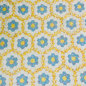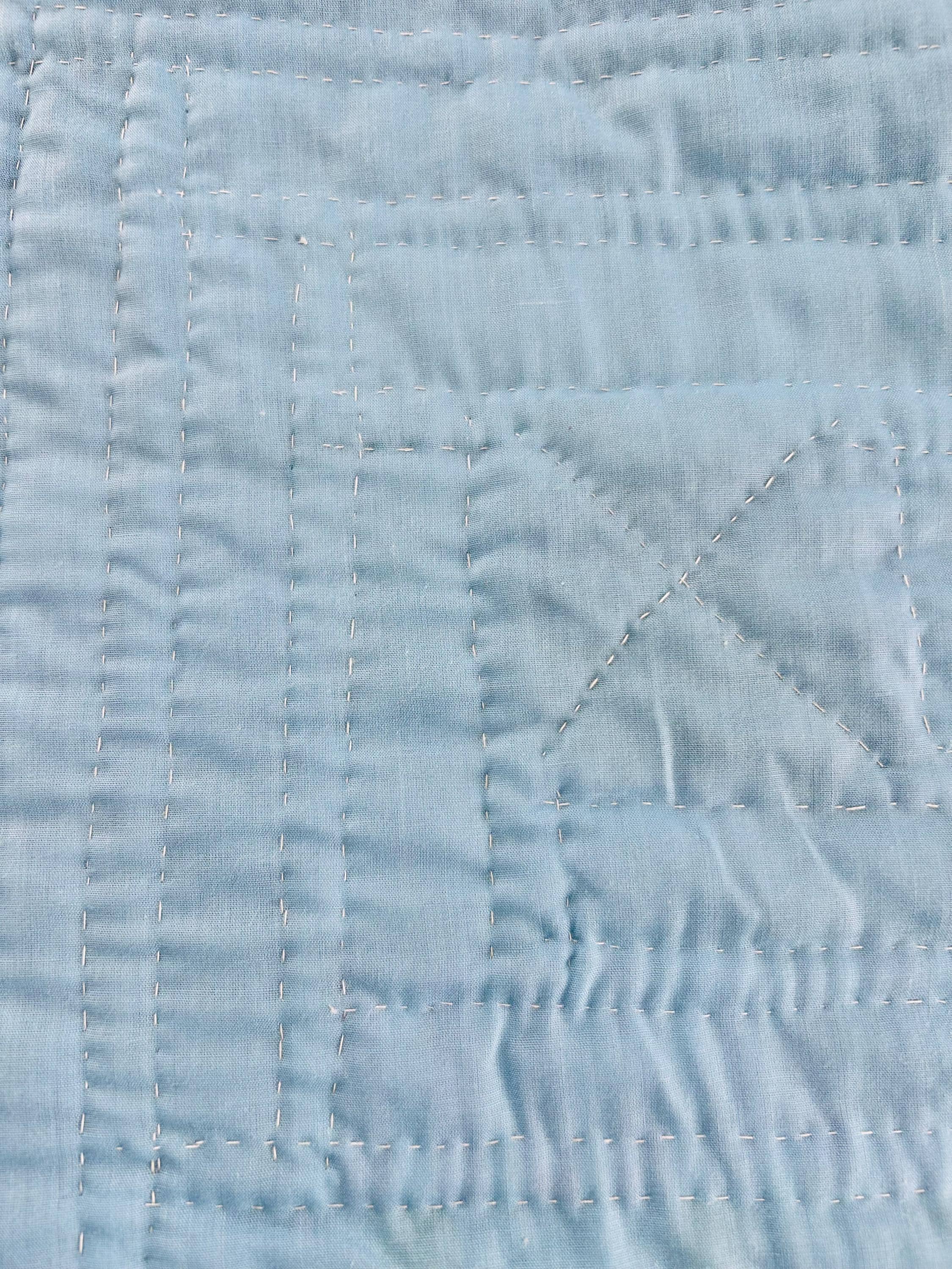 The back is a Robin's Egg blue, as is the binding that has been machine-stitched to the front and hand-stitched to the back. The cotton batting is lightweight.