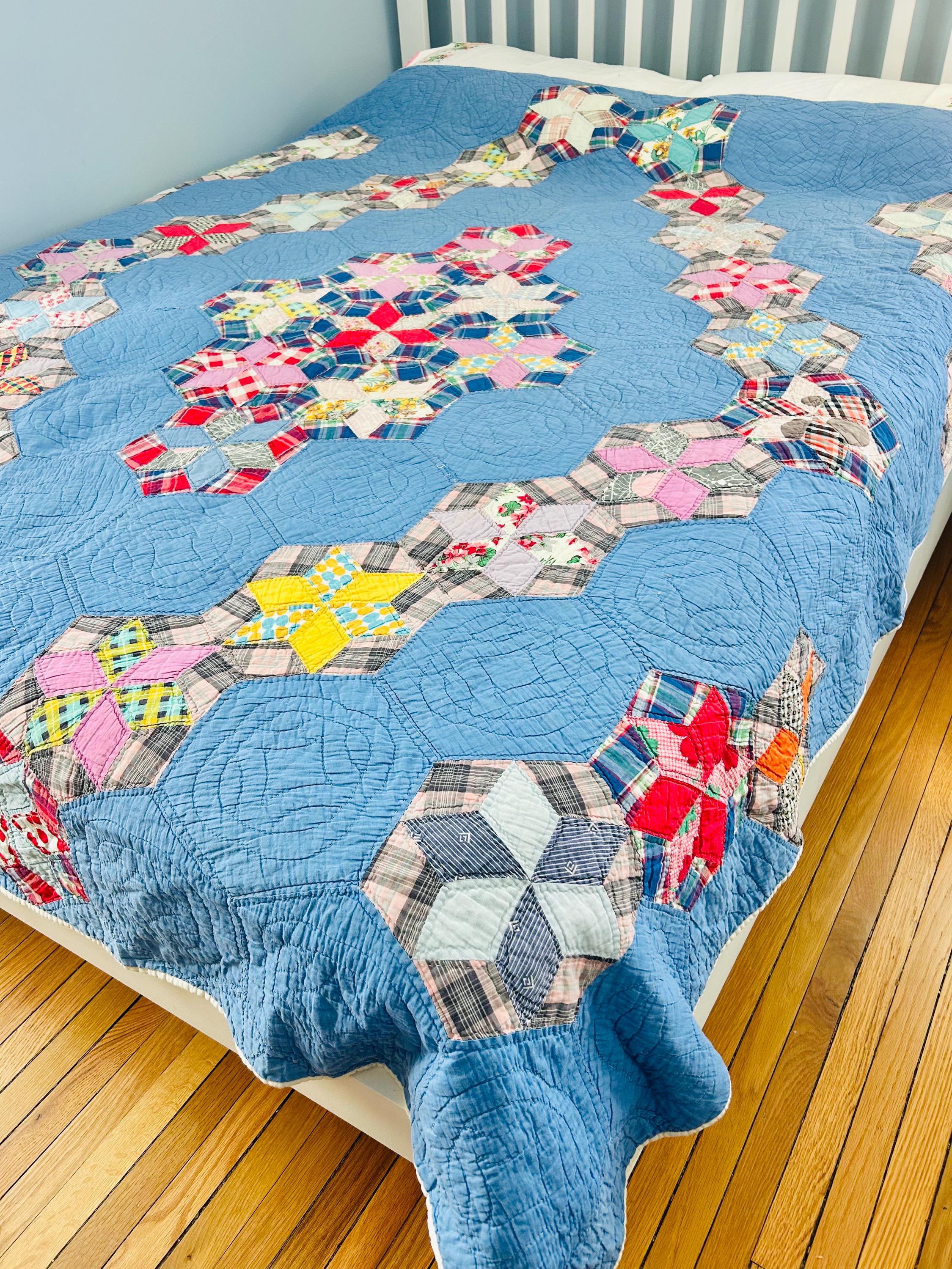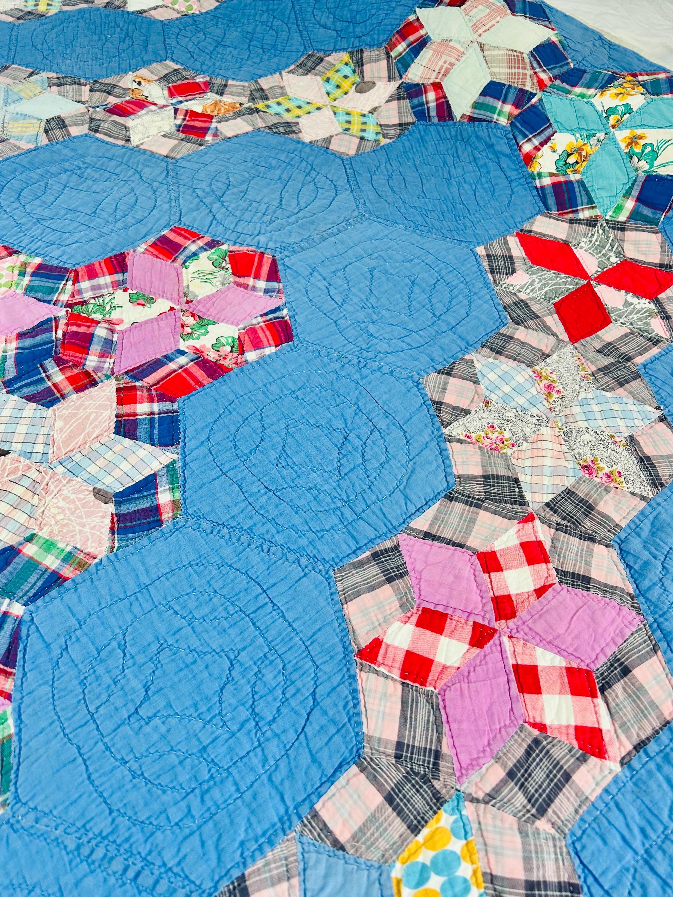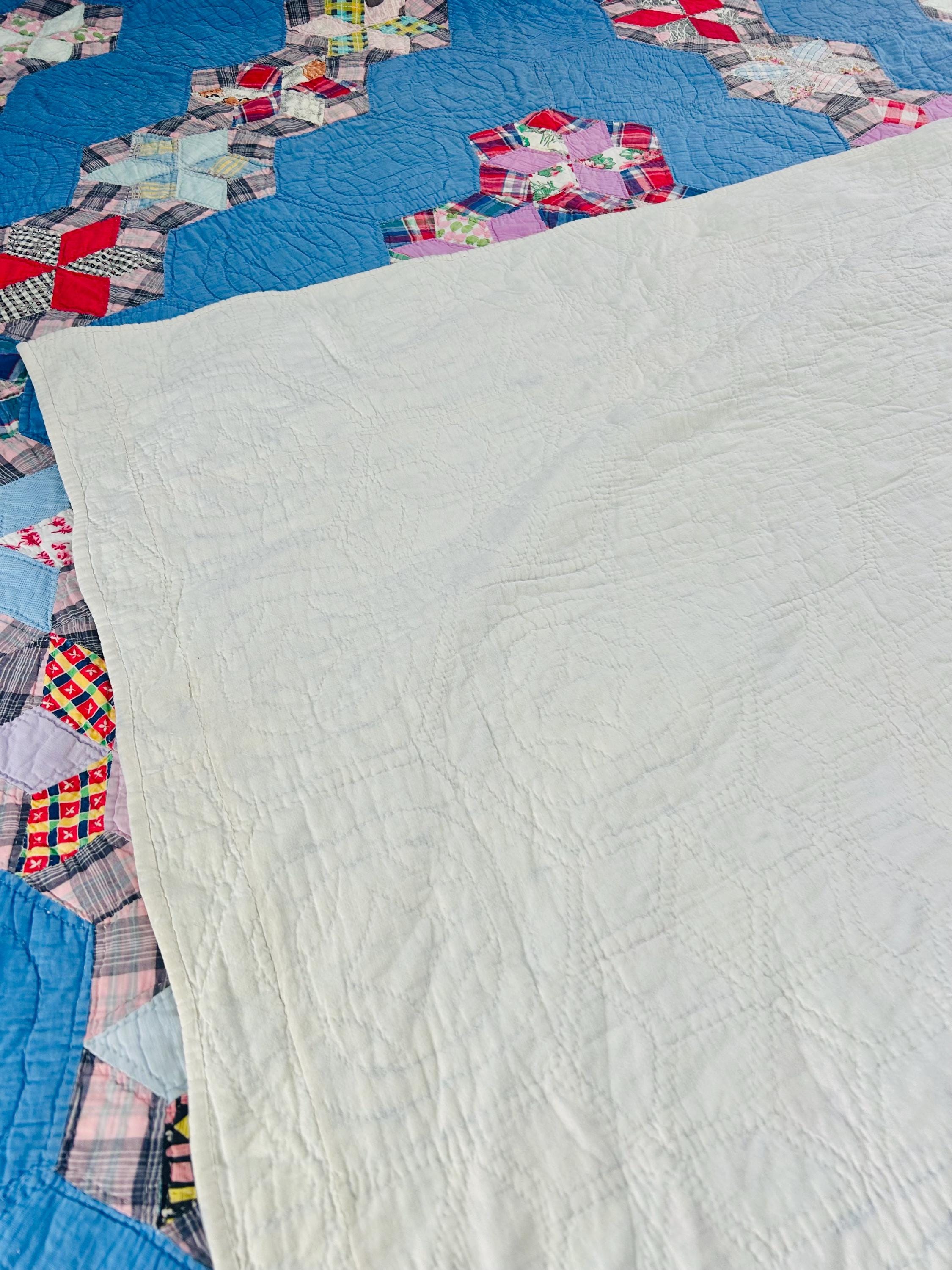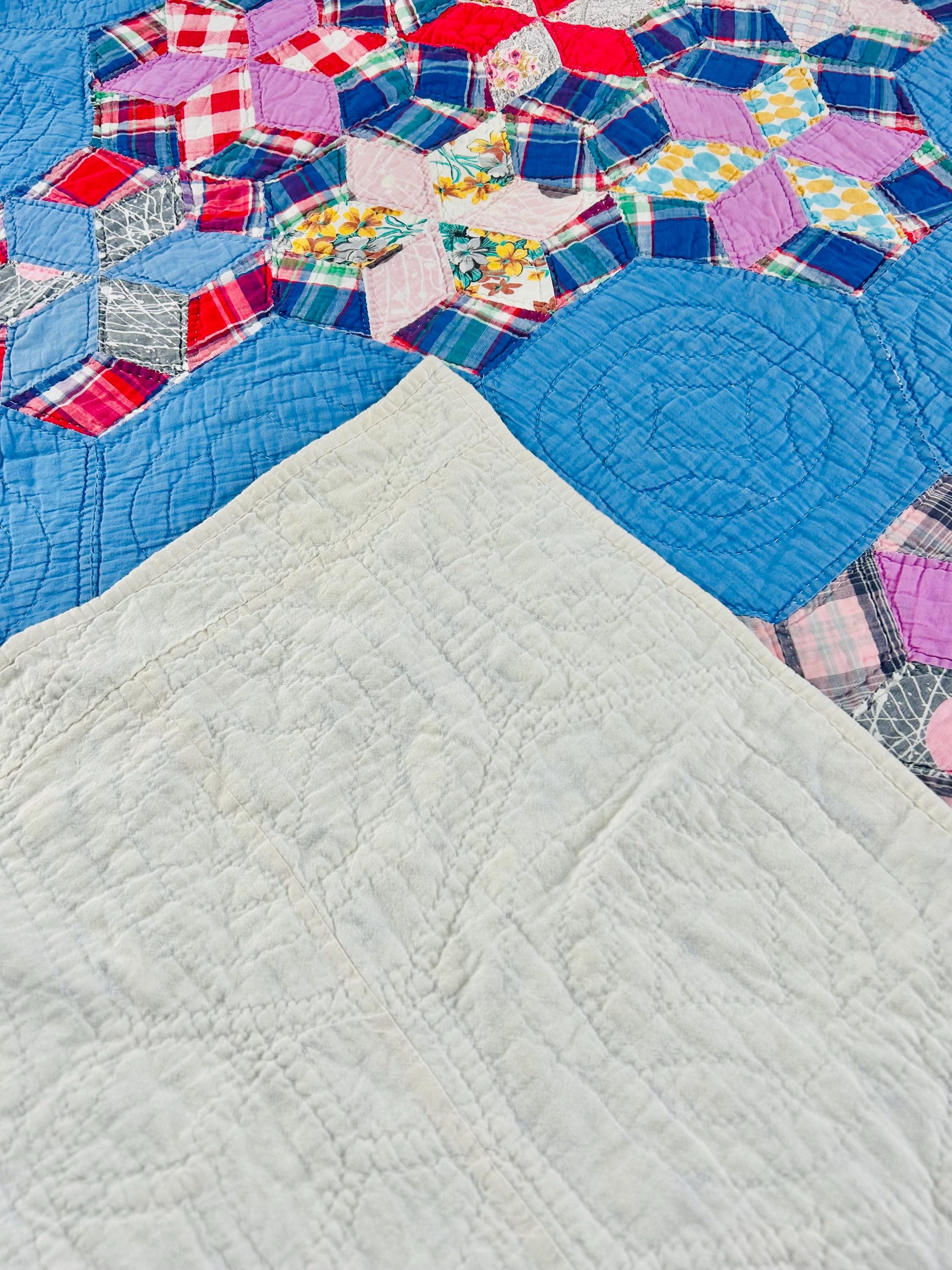 The quilt is entirely hand pieced and is hand quilted in a circular/geometric motif in the open blue blocks and in outlines of the hundreds of diamonds. The back is white cotton as is the binding that has been hand-stitched to both sides. The cotton batting is lightweight.
