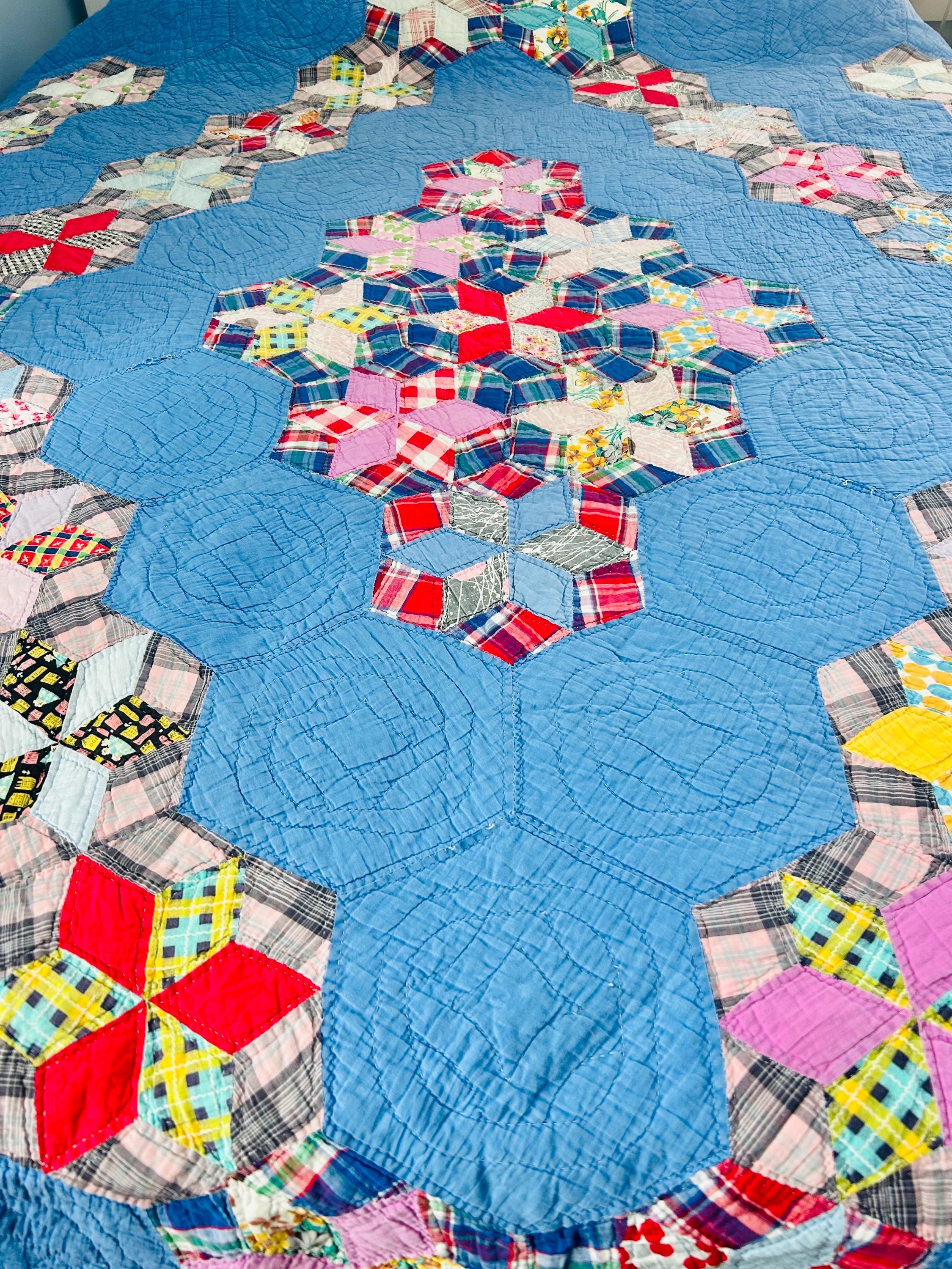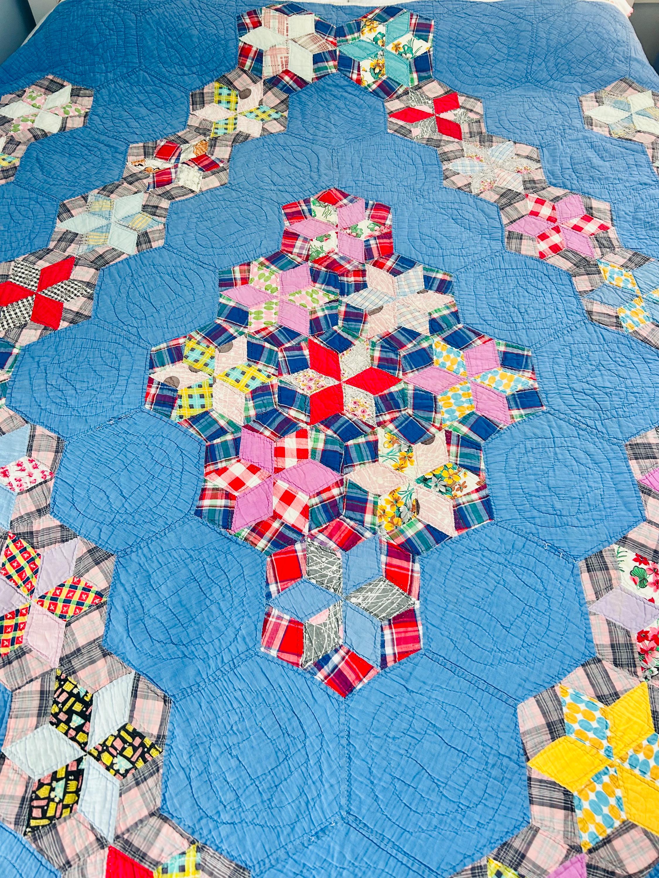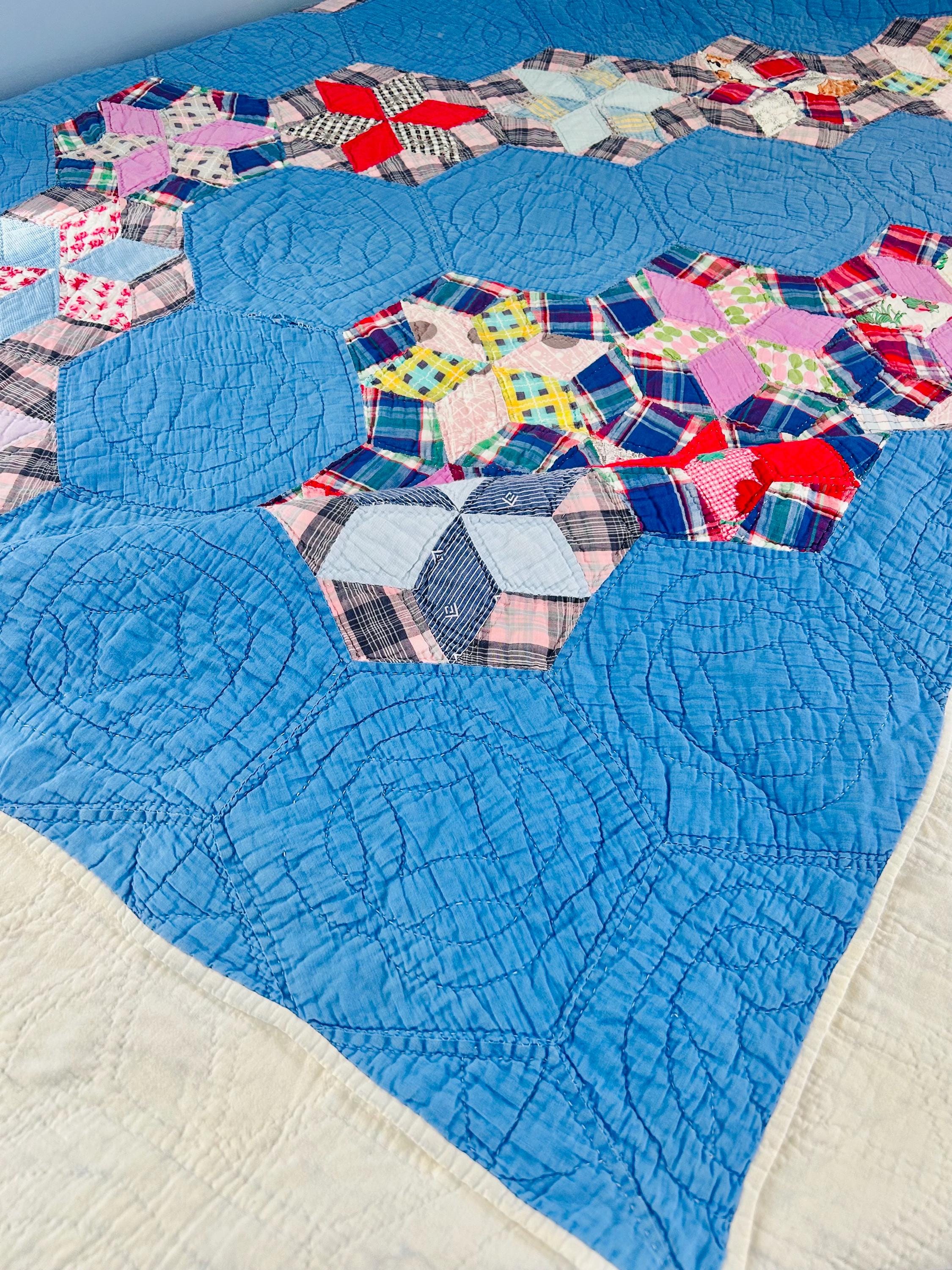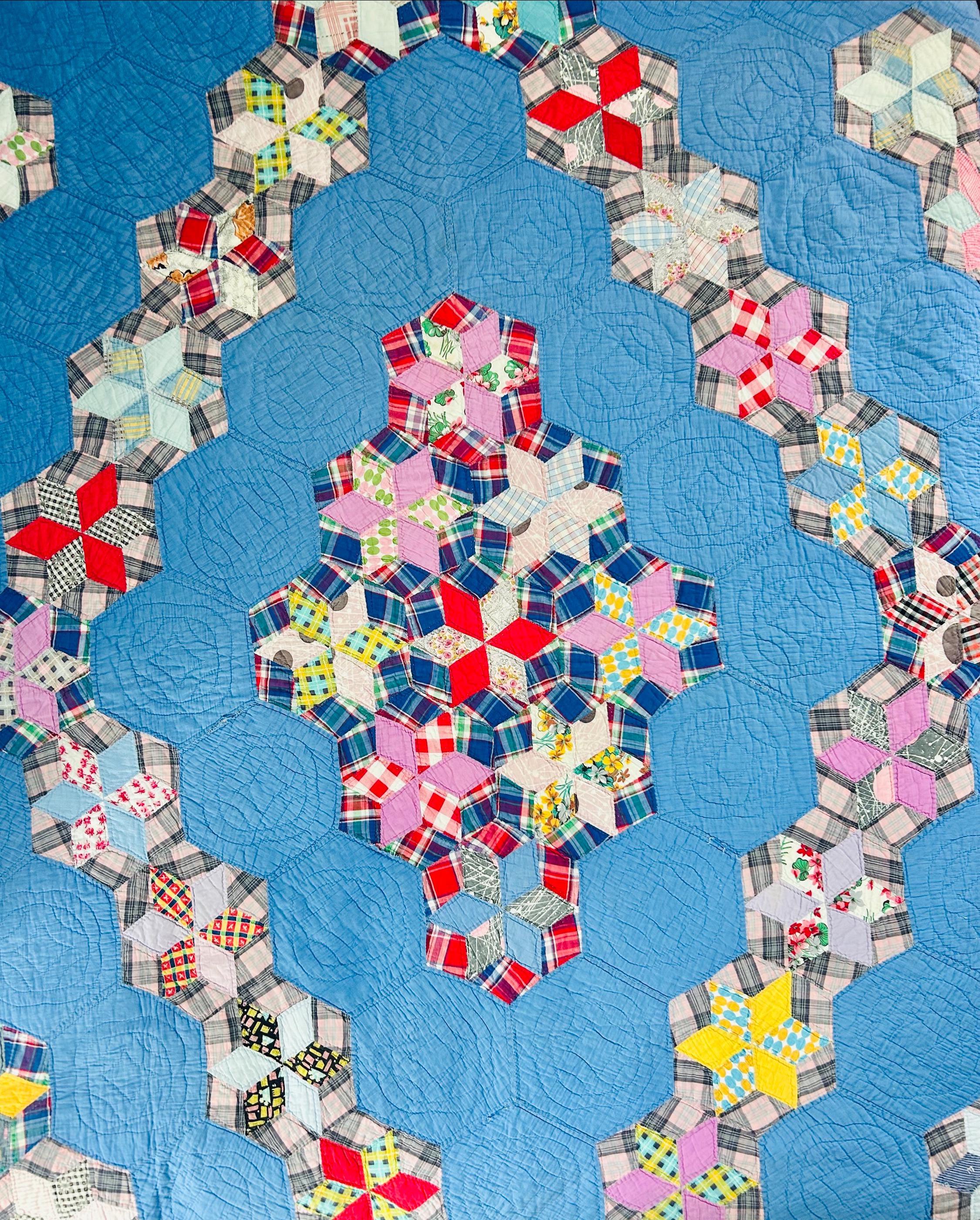 The quilt is entirely hand pieced and is hand quilted in a circular/geometric motif in the open blue blocks and in outlines of the hundreds of diamonds. The back is white cotton as is the binding that has been hand-stitched to both sides. The cotton batting is lightweight.