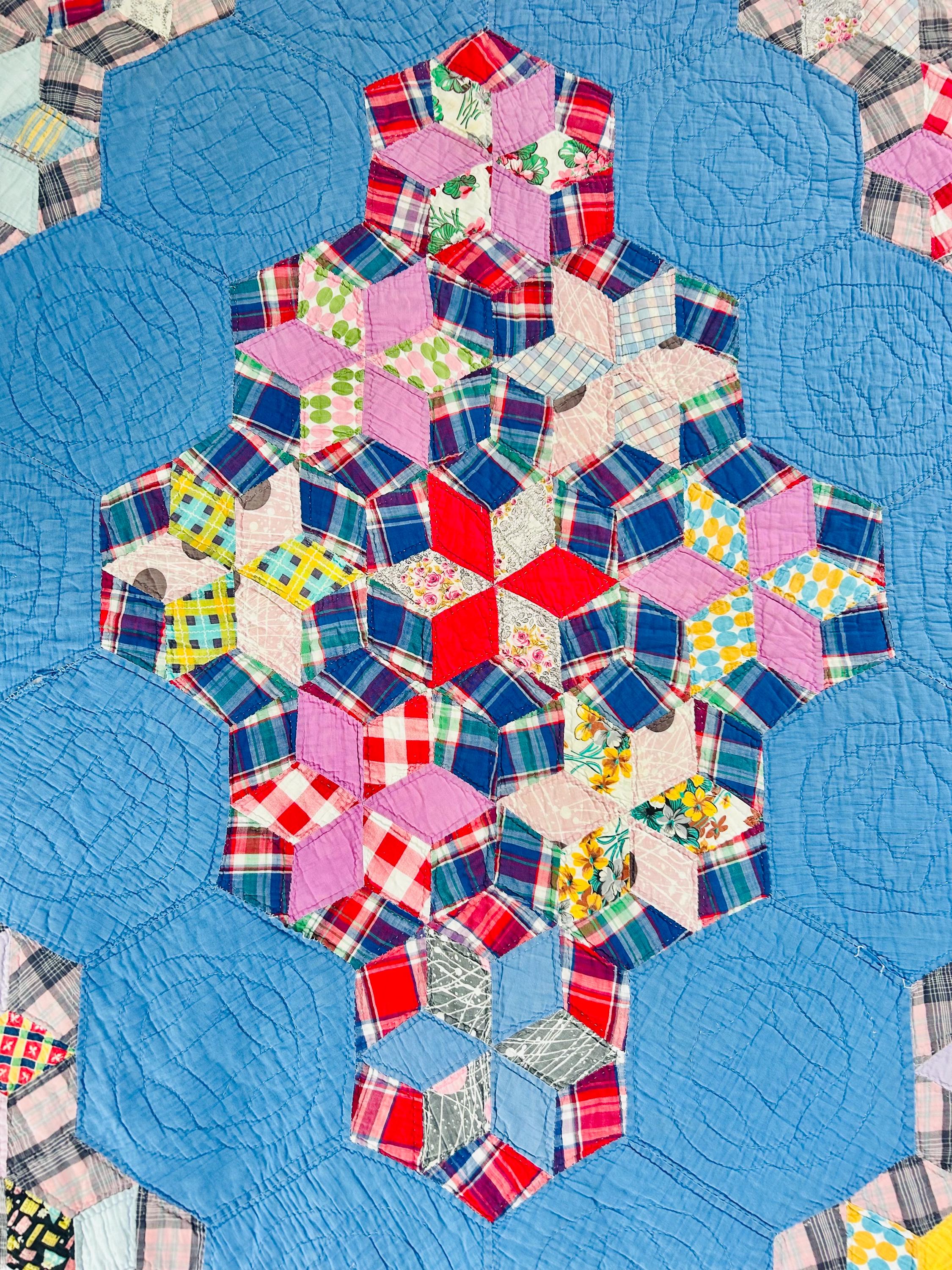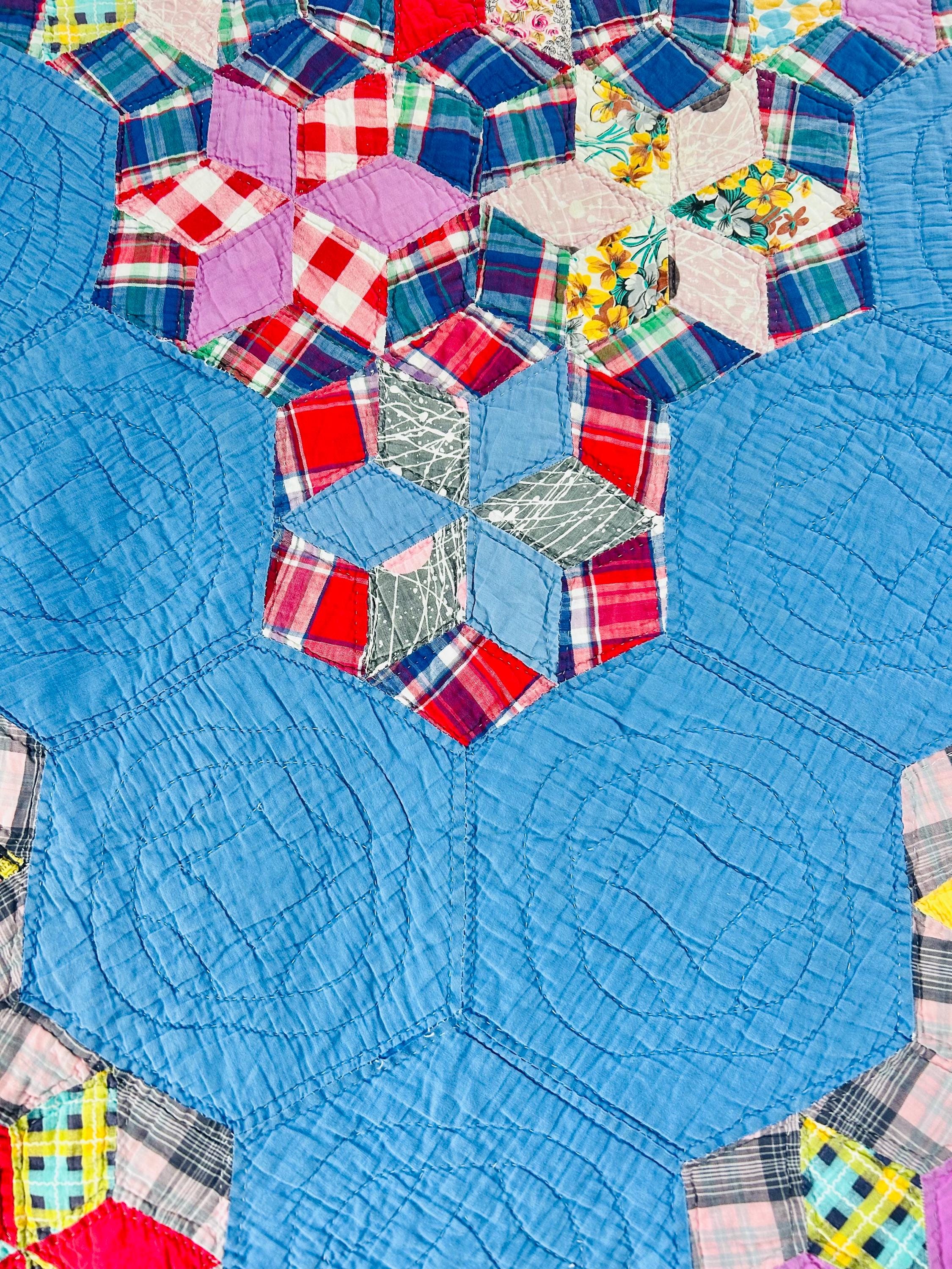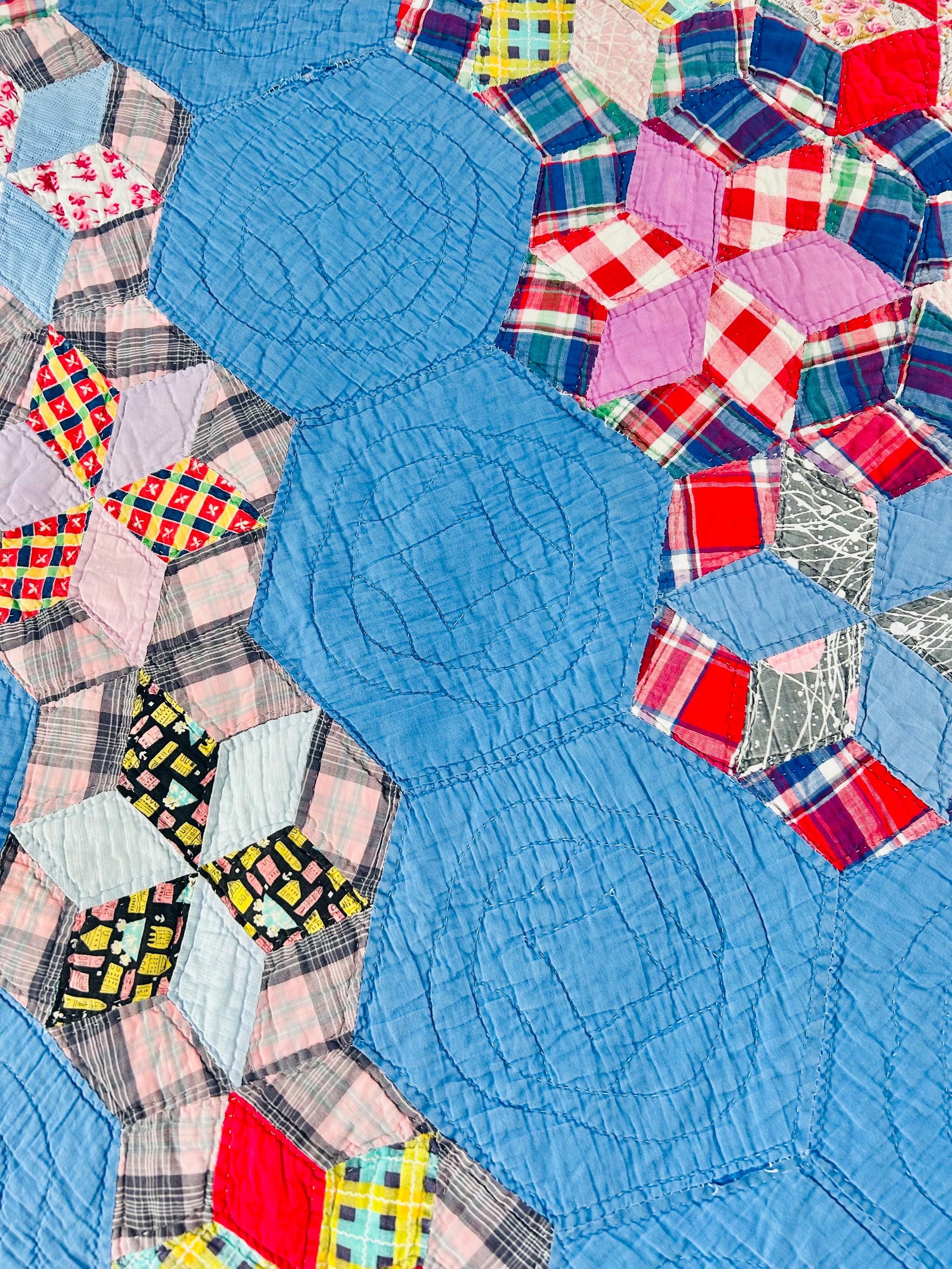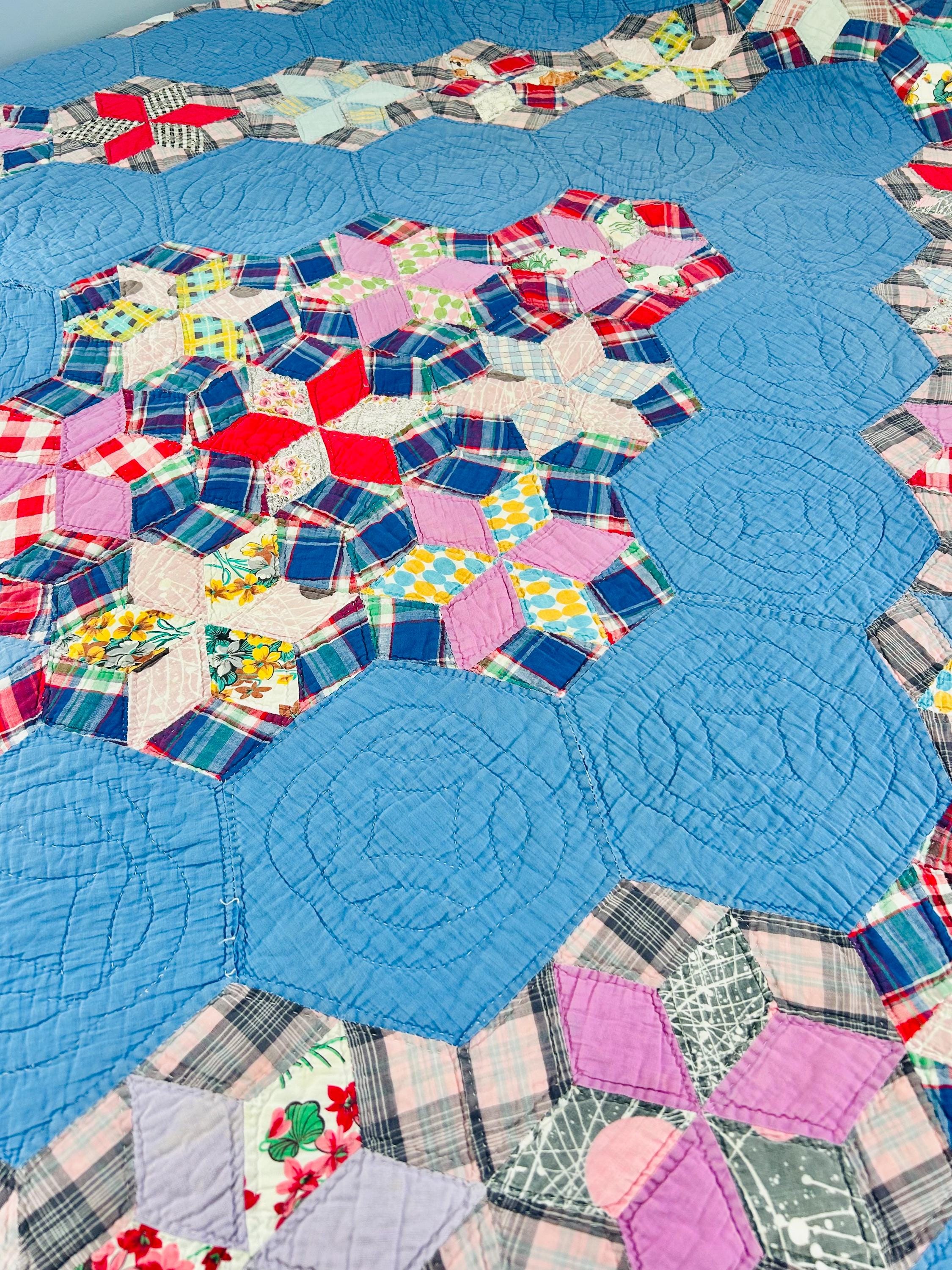 The quilt is entirely hand pieced and is hand quilted in a circular/geometric motif in the open blue blocks and in outlines of the hundreds of diamonds. The back is white cotton as is the binding that has been hand-stitched to both sides. The cotton batting is lightweight.