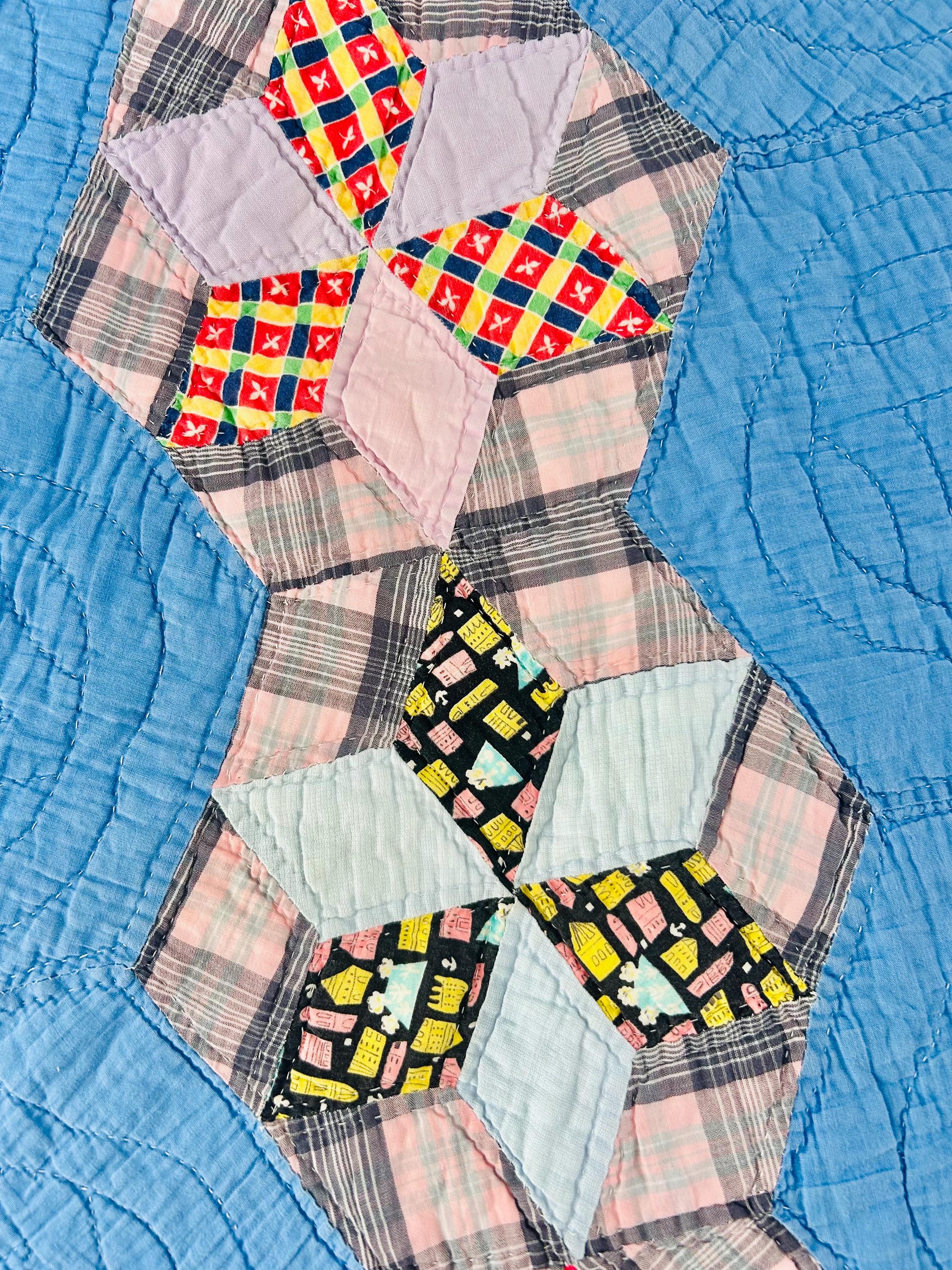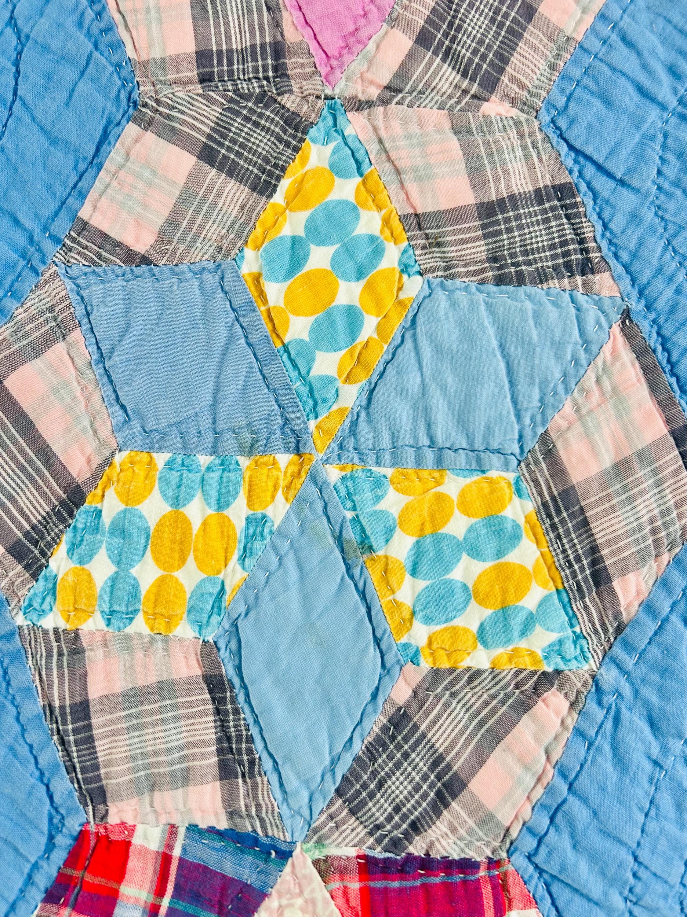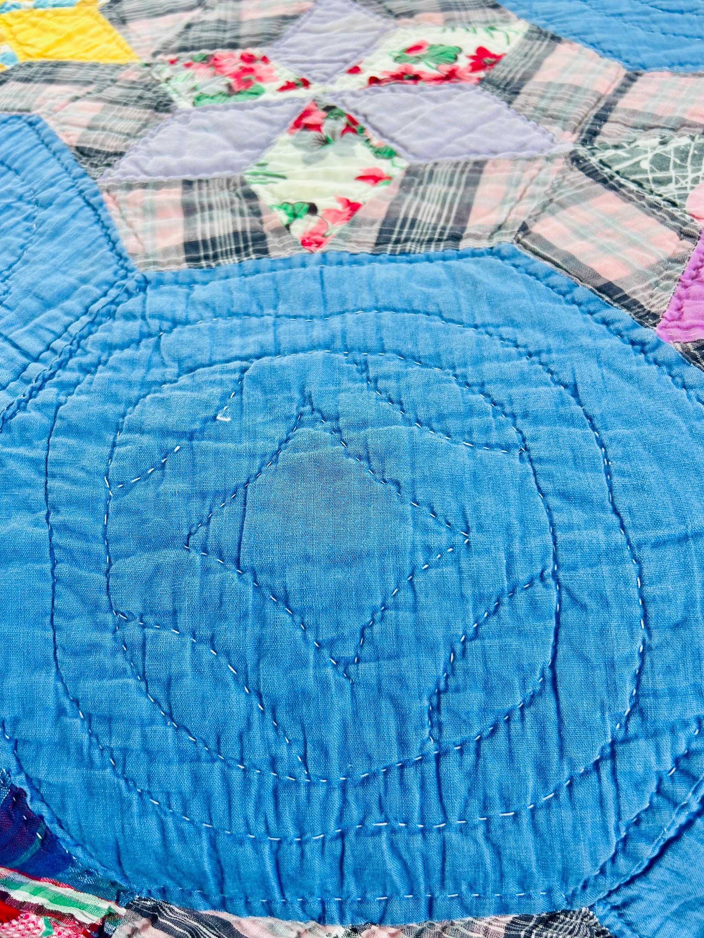 This striking and unique Rising Star Variation Quilt features a beautifully organized medallion layout, a sophisticated variation of the Rising Star pattern set against a rich solid blue field, with the stars radiating outward in a bold and highly graphic design. The fabrics include: • A mix of feedsack florals in soft pastels and cheerful prints • Extensive use of plaids, ginghams, and shirting fabrics, typical of scrap quilts made from repurposed clothing • Bright true reds, chrome yellows, and pastels • Solid blue cotton field