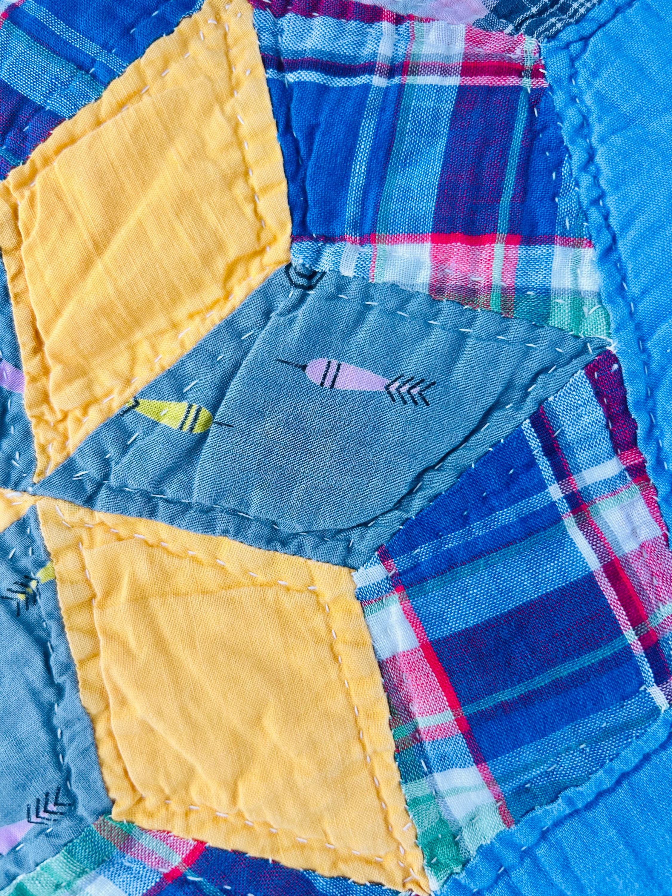 Details • Size: 72” x 90” • Pattern: Rising Star Variation (Medallion layout) • Date: Circa 1940s • Materials: Cotton fabrics (feedsack prints, plaids, shirtings, solids) • Construction: Hand pieced and hand quilted • Batting: Lightweight cotton • Backing: Plain white cotton