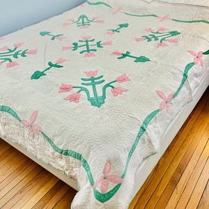 The quilt is from a smoke-free, pet-free home and is pictured on a queen-size bed.