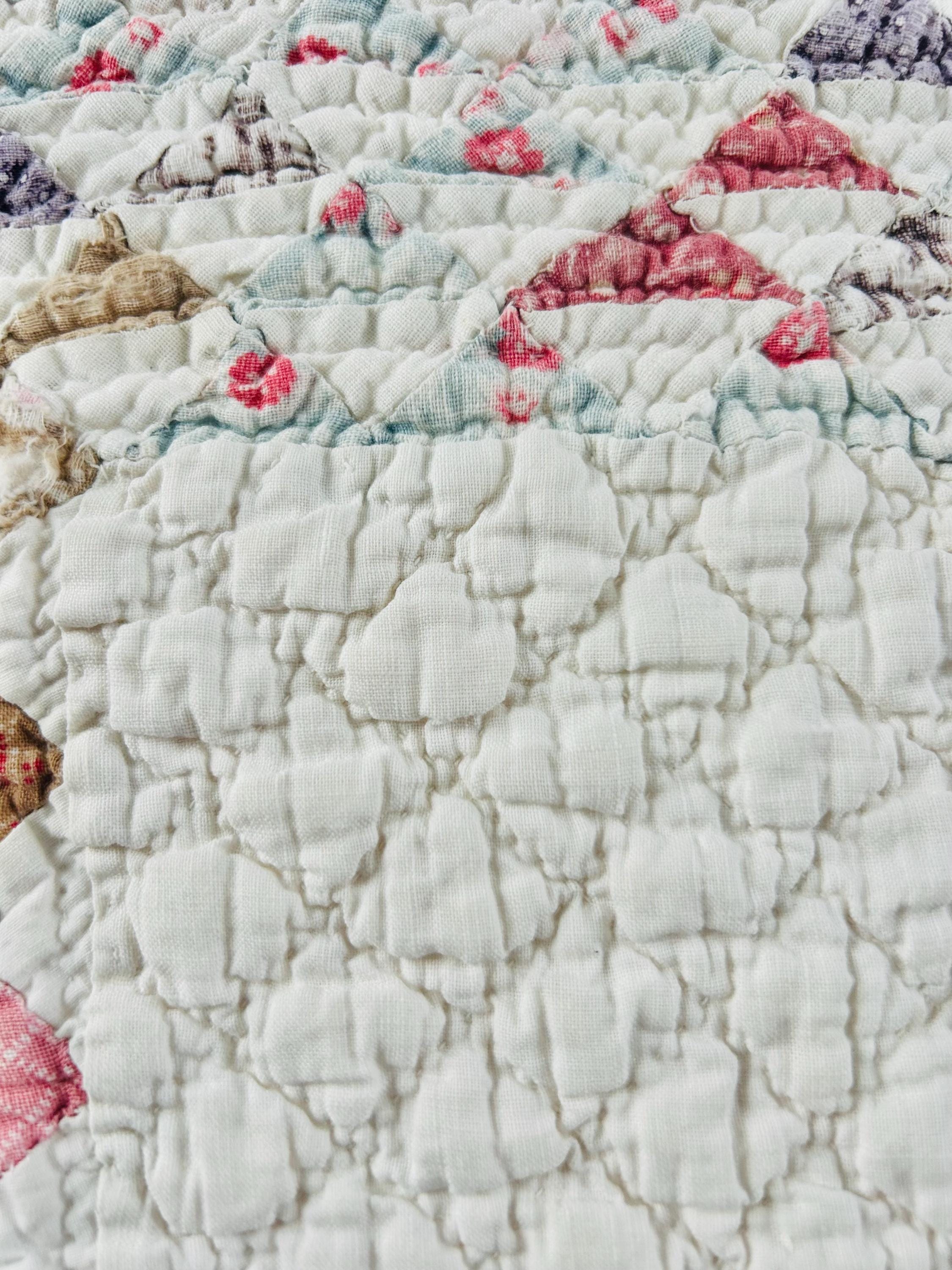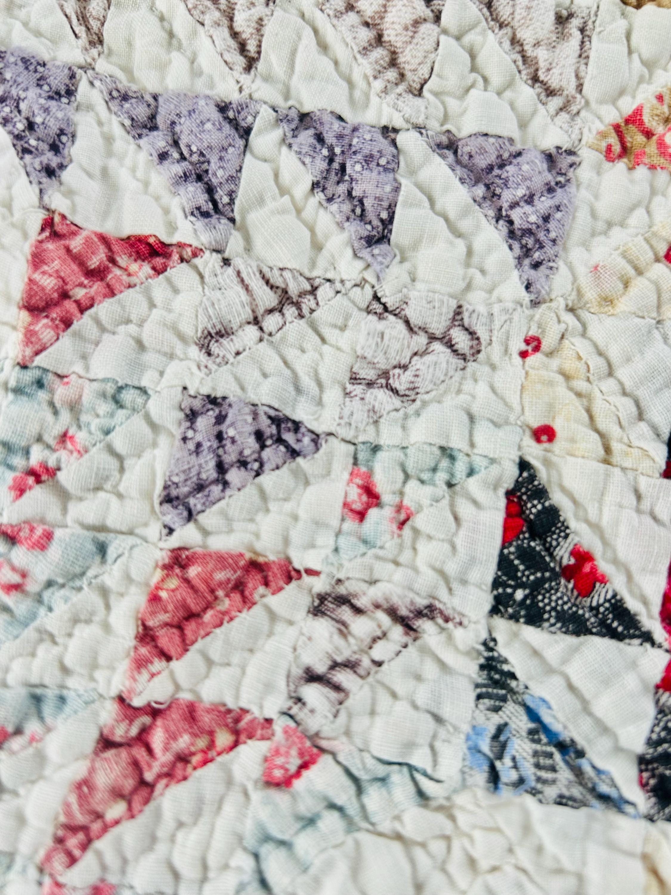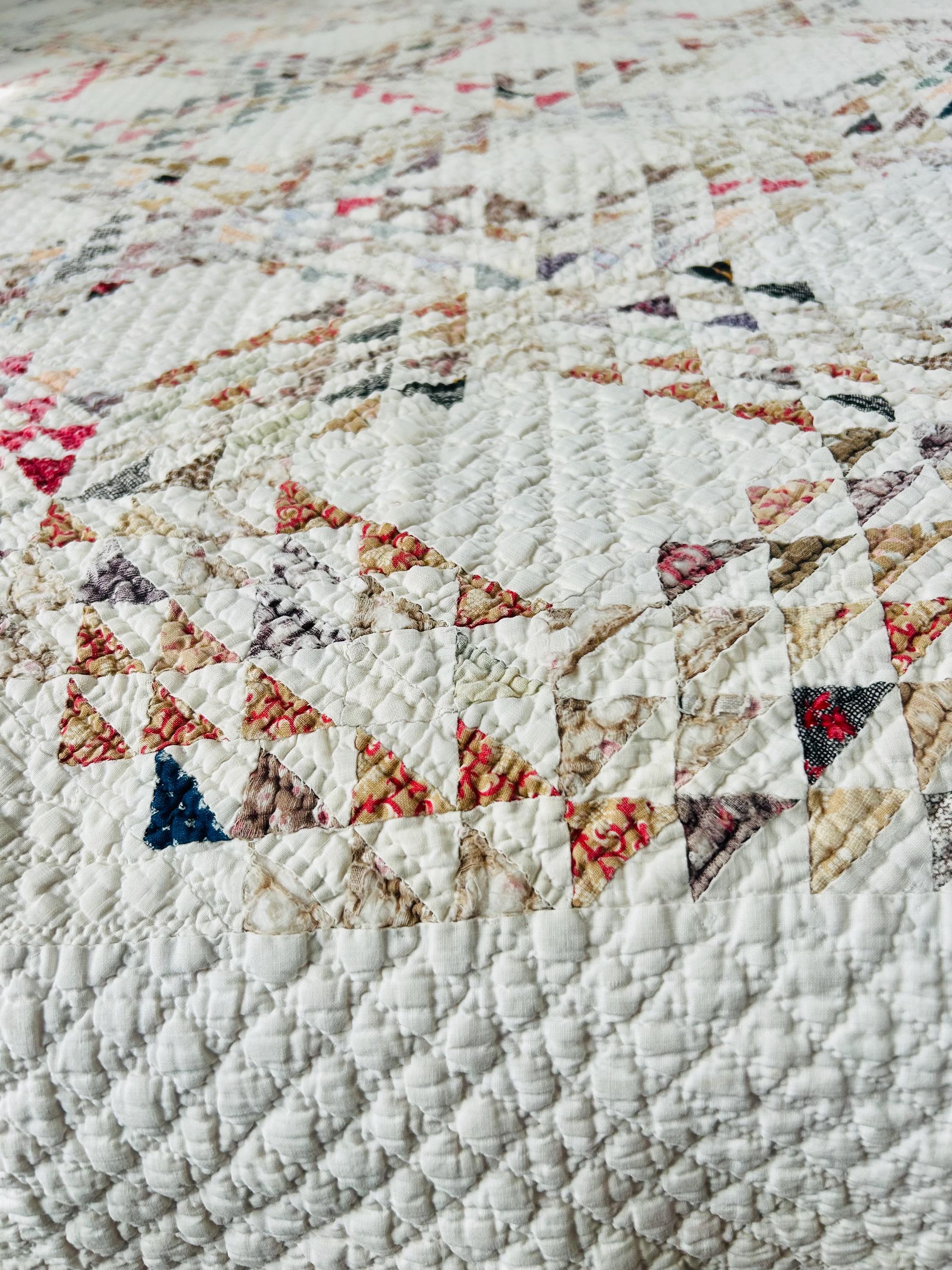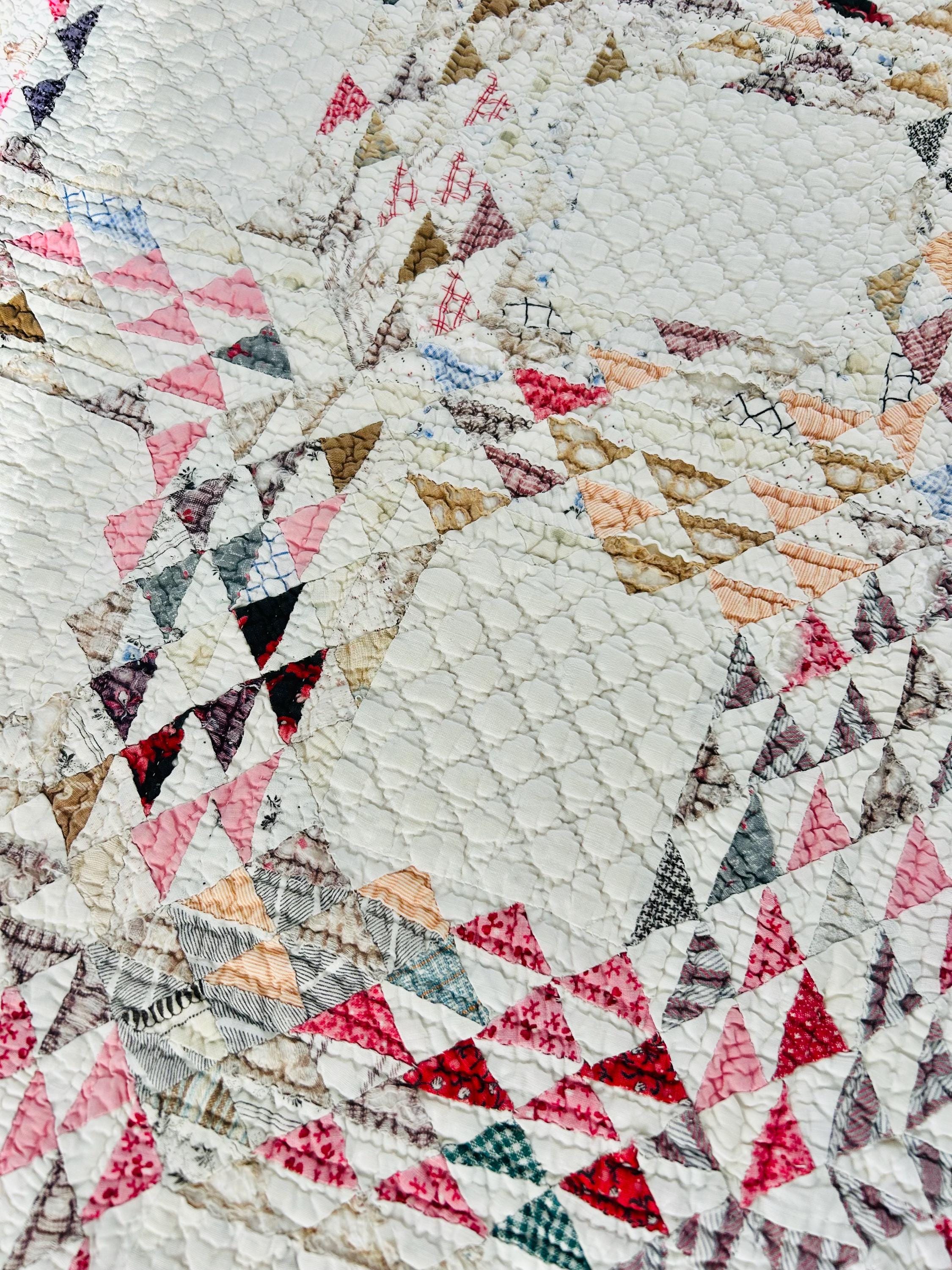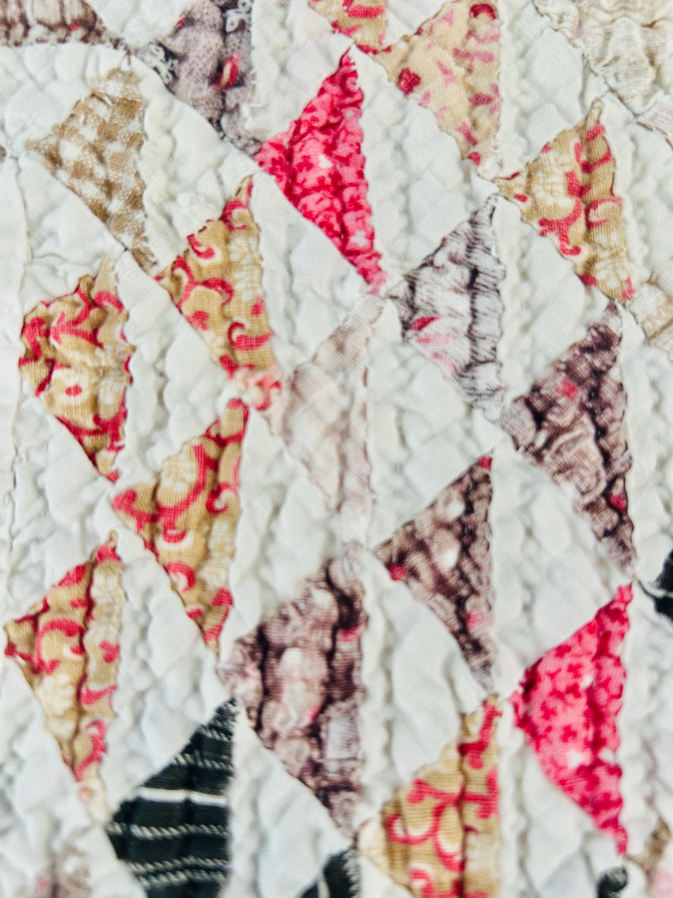 Composed of hundreds of tiny triangles (just ½” x 1”), this quilt is a remarkable example of the skill and patience of 19th century quiltmakers. The fabrics are a wonderful mix of period calicoes and shirtings, including muted browns, soft double pinks, early blues, and taupe neutrals, all consistent with late 1800s textile production. Many prints show the soft, slightly diffused quality of early roller-printed cottons.