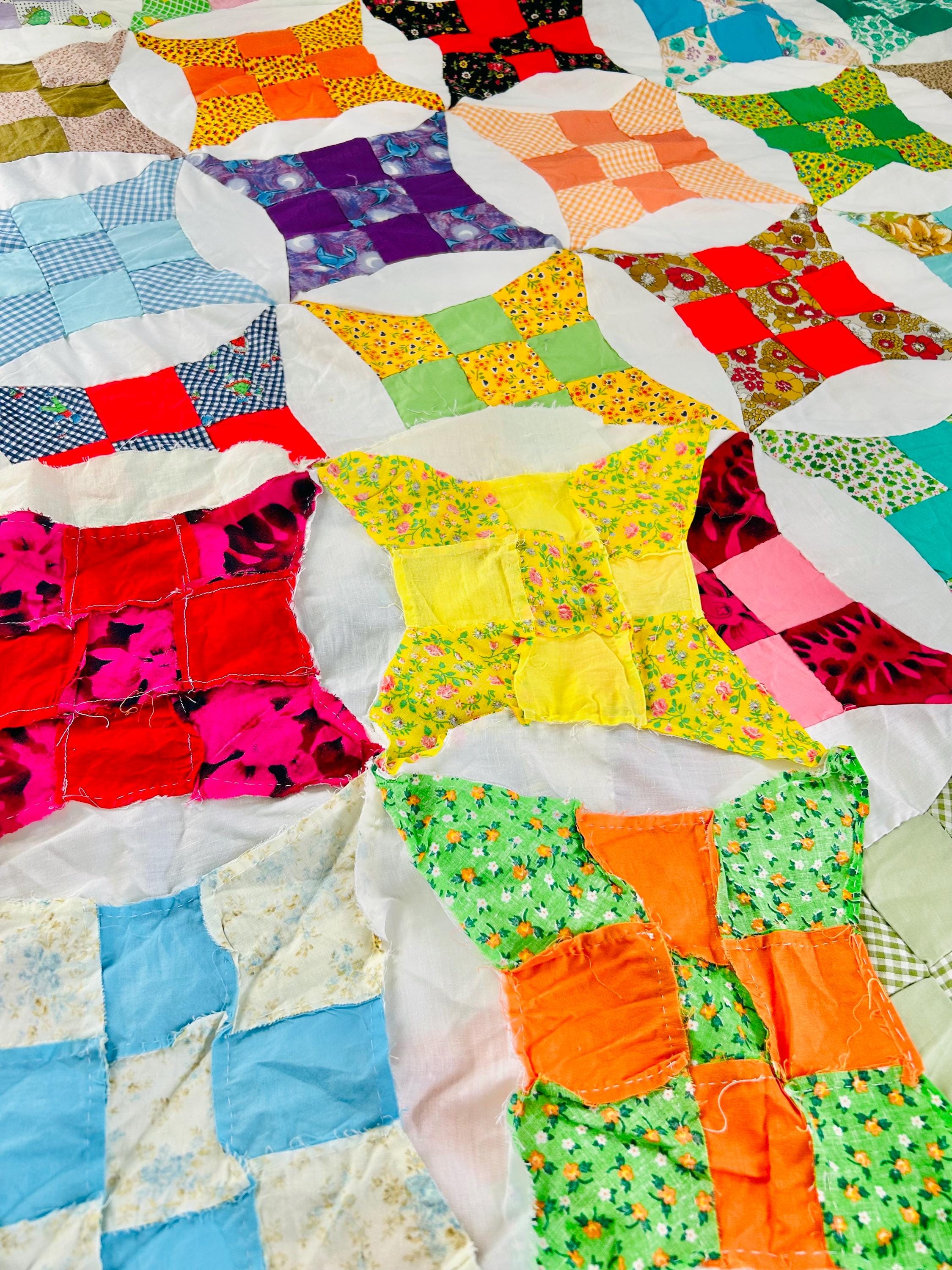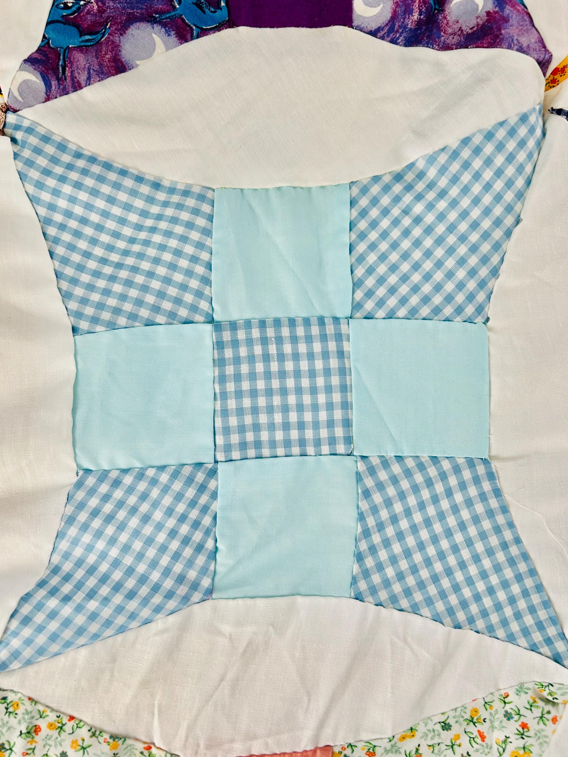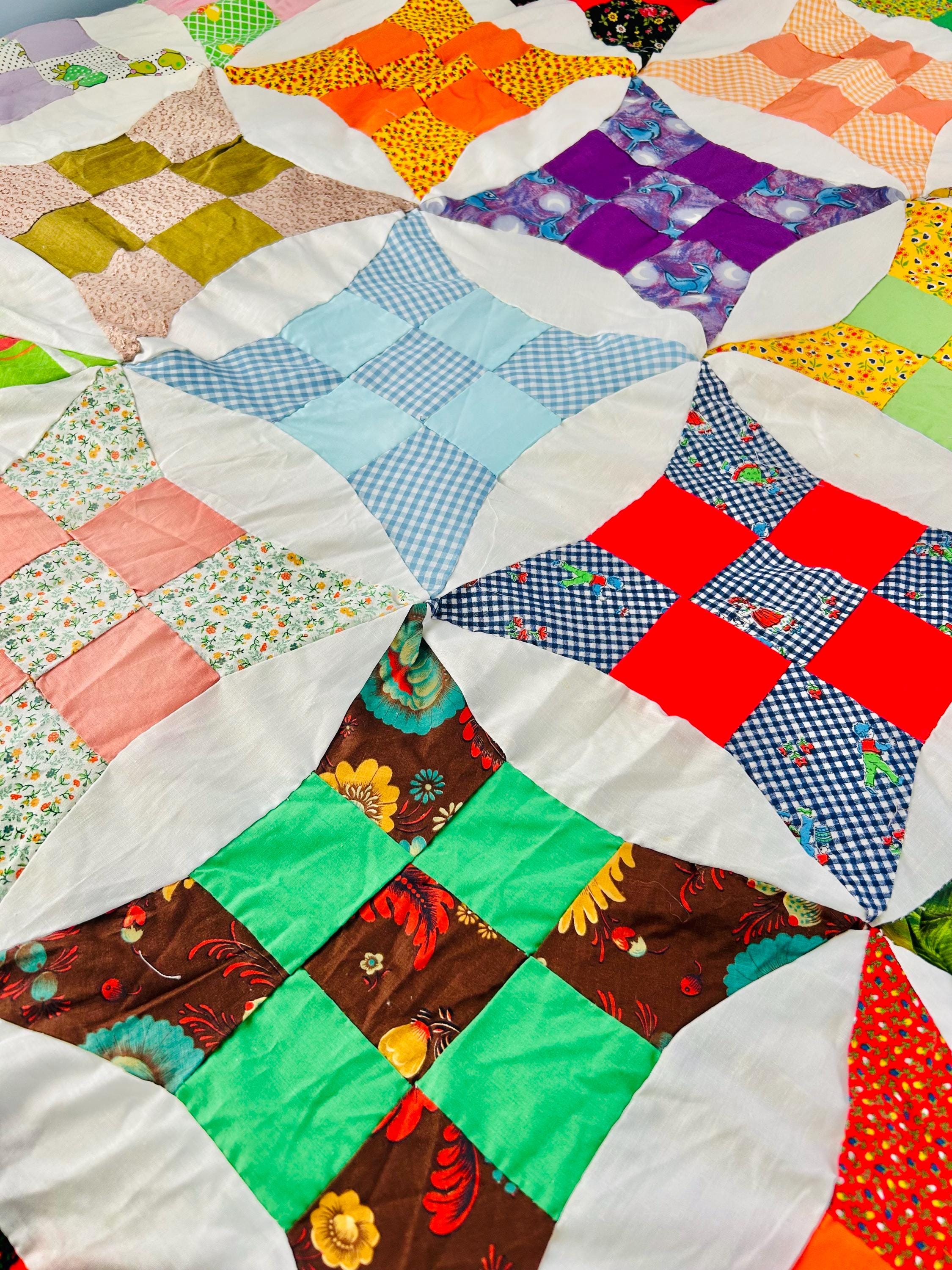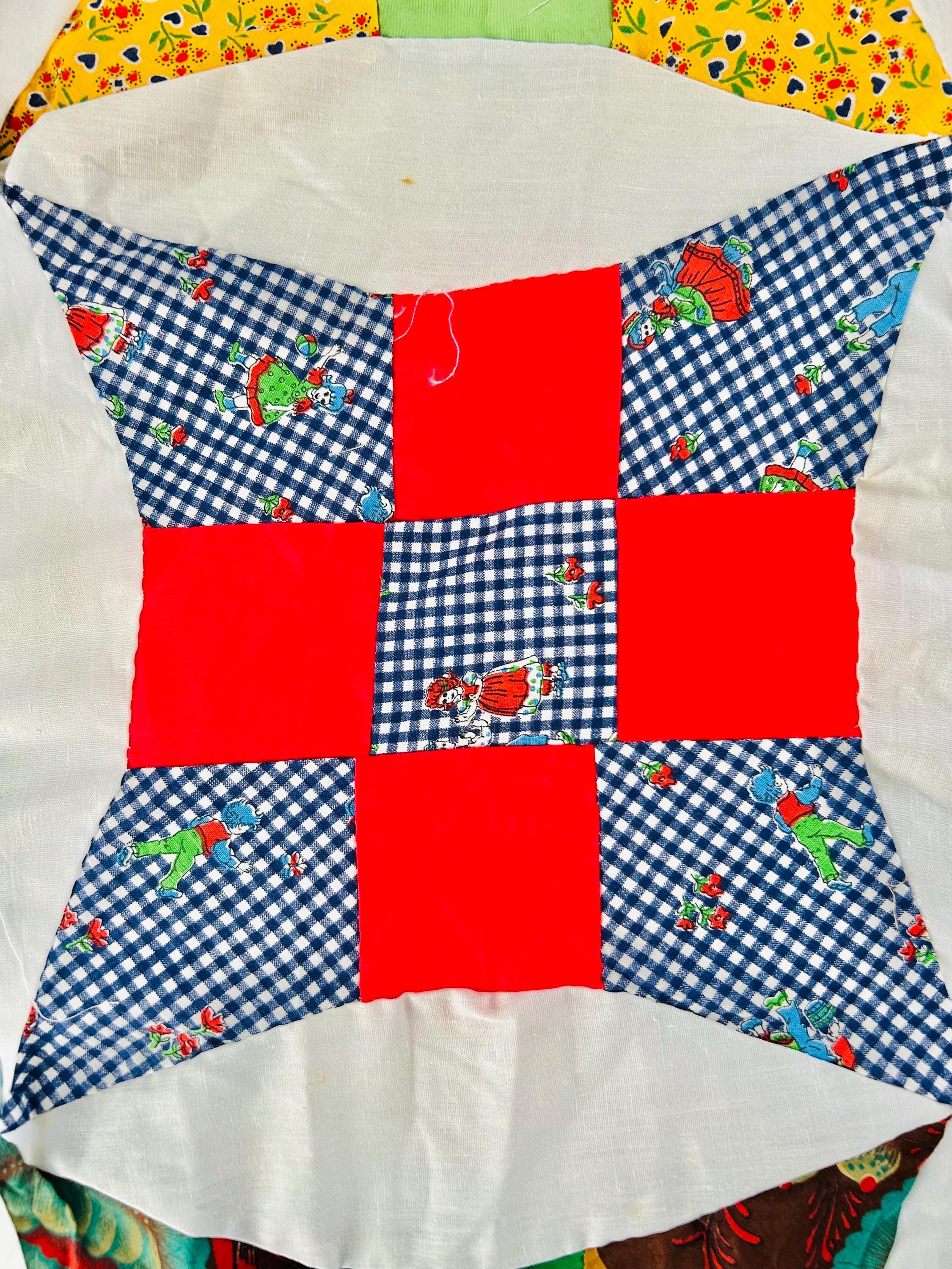 The Quilt Top is made of feedsack-era cottons and other fabrics that include: β’ Bright mid-century solids (bubblegum pinks, cherry reds, sunny yellows, aqua blues, and grassy greens) β’ Feedsack-style small florals and ditsy prints β’ Plaids and ginghams, including classic blue-and-white and green checks β’ Playful novelty prints (including juvenile figures and bold graphic prints)