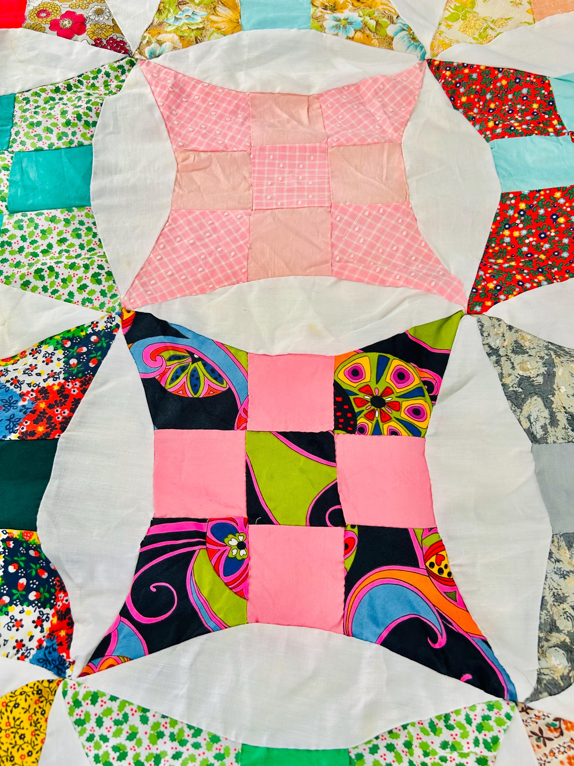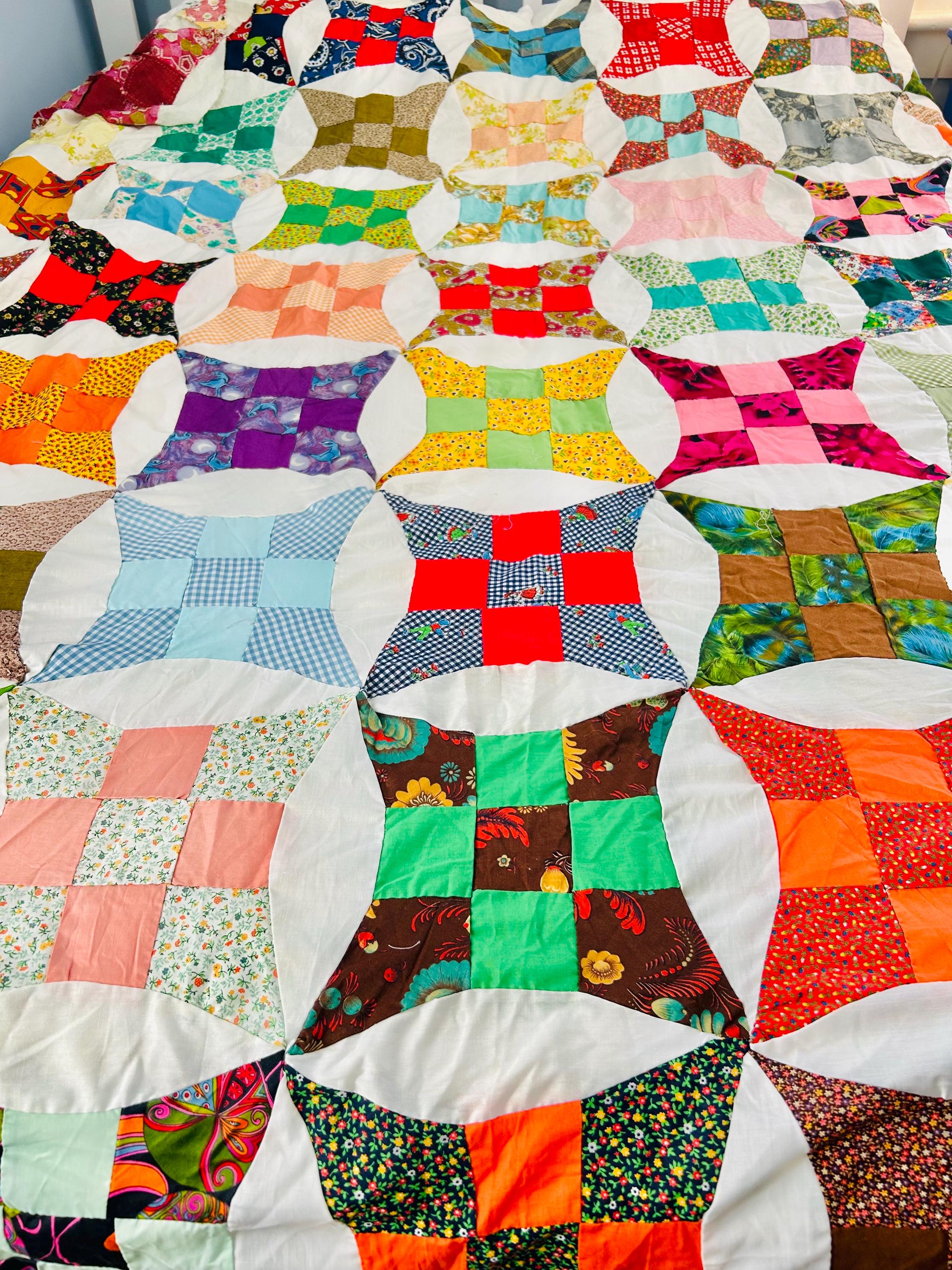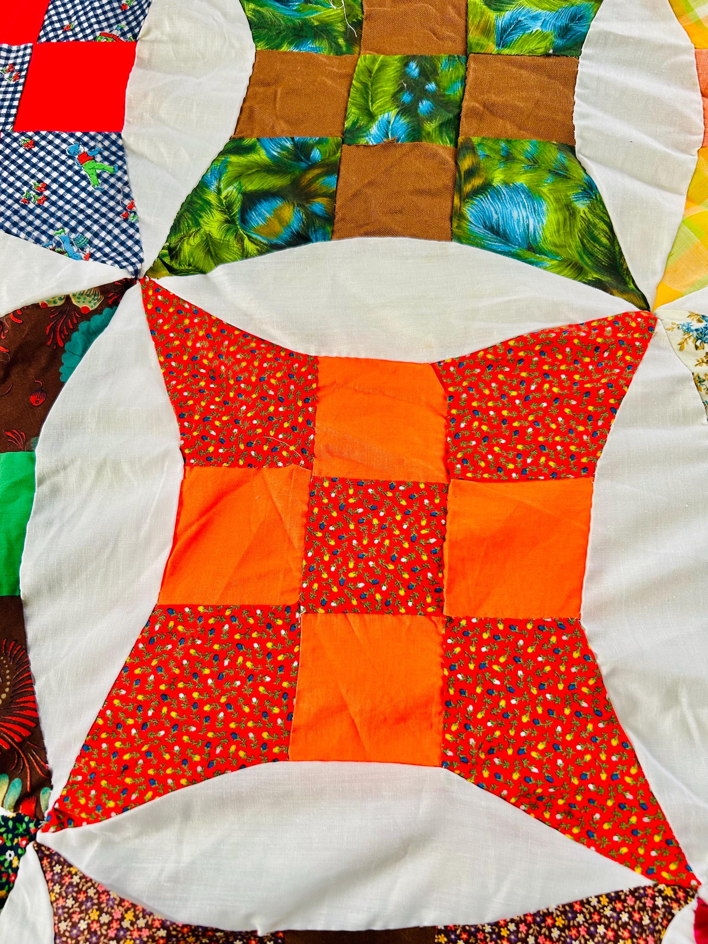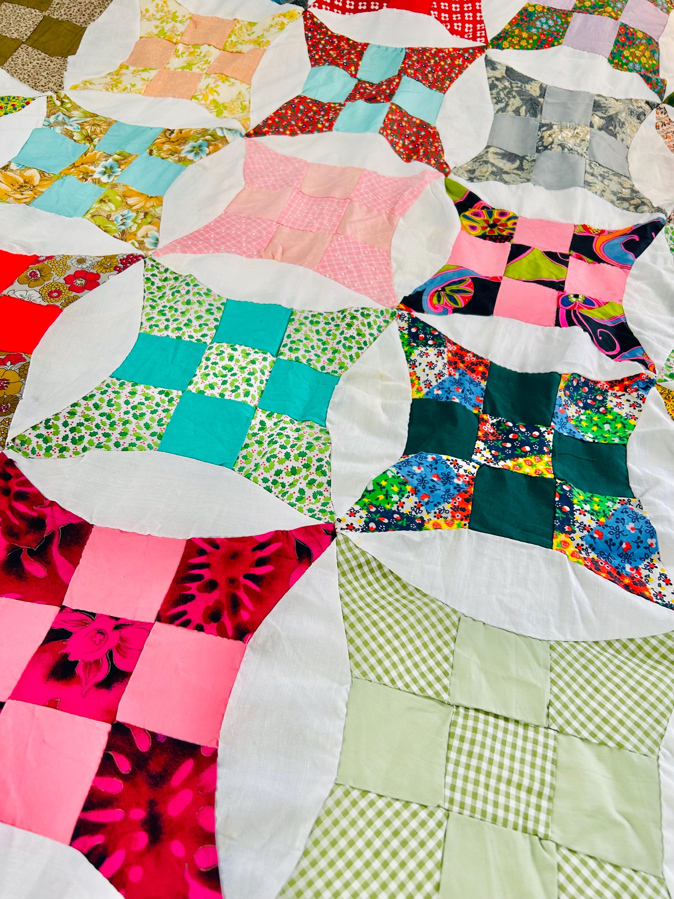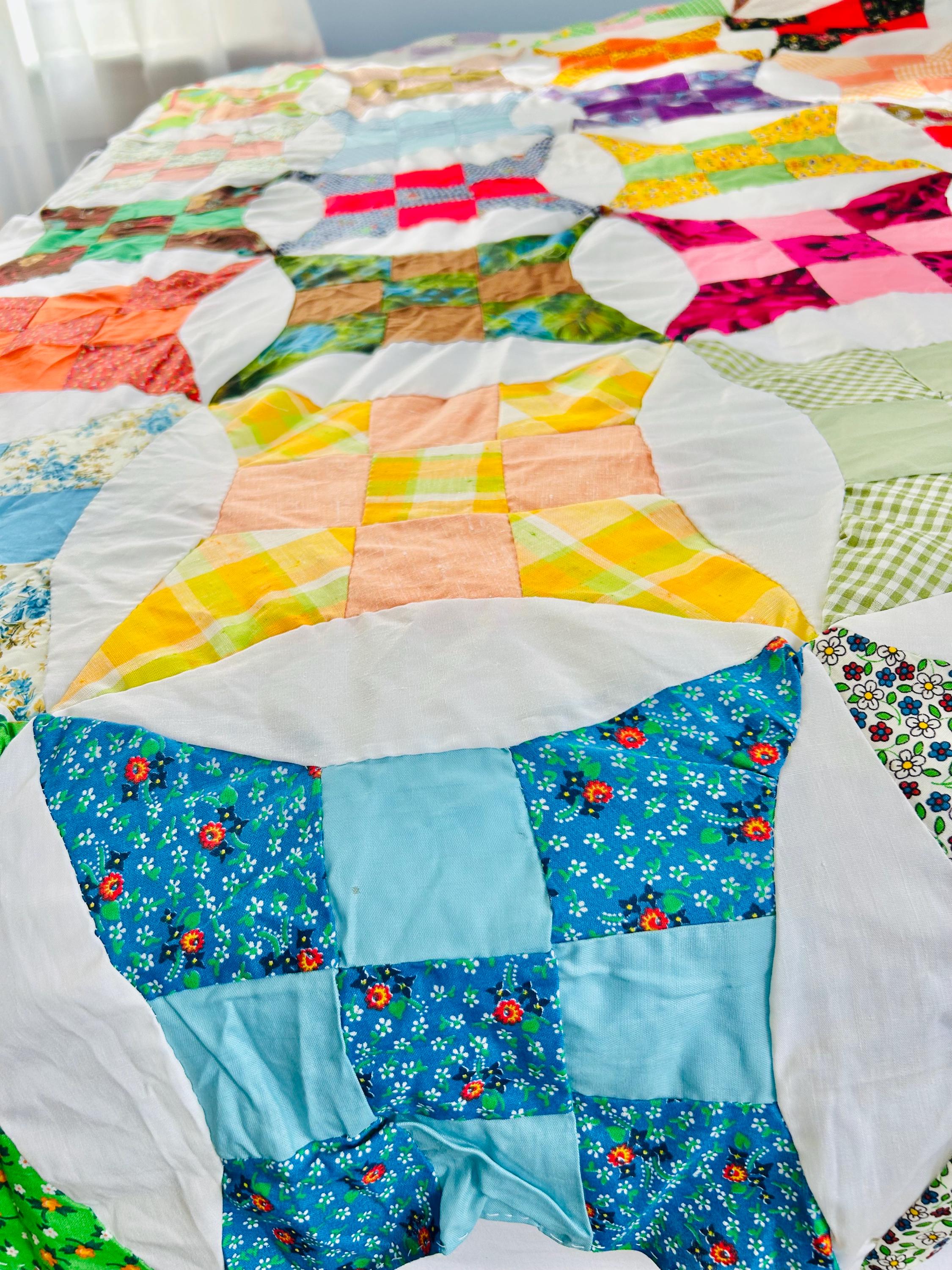The Quilt Top is made of feedsack-era cottons and other fabrics that include: β’ Bright mid-century solids (bubblegum pinks, cherry reds, sunny yellows, aqua blues, and grassy greens) β’ Feedsack-style small florals and ditsy prints β’ Plaids and ginghams, including classic blue-and-white and green checks β’ Playful novelty prints (including juvenile figures and bold graphic prints)