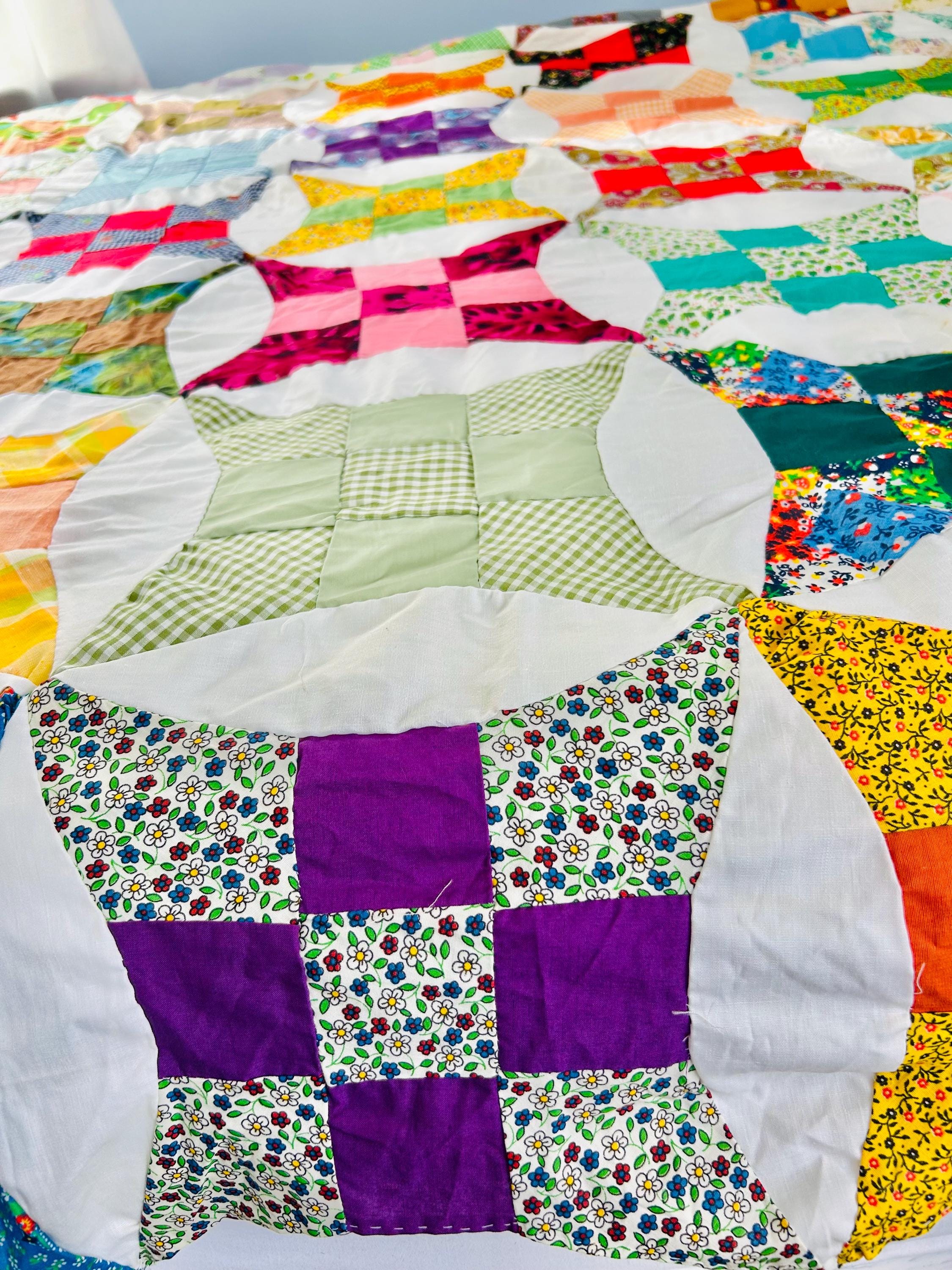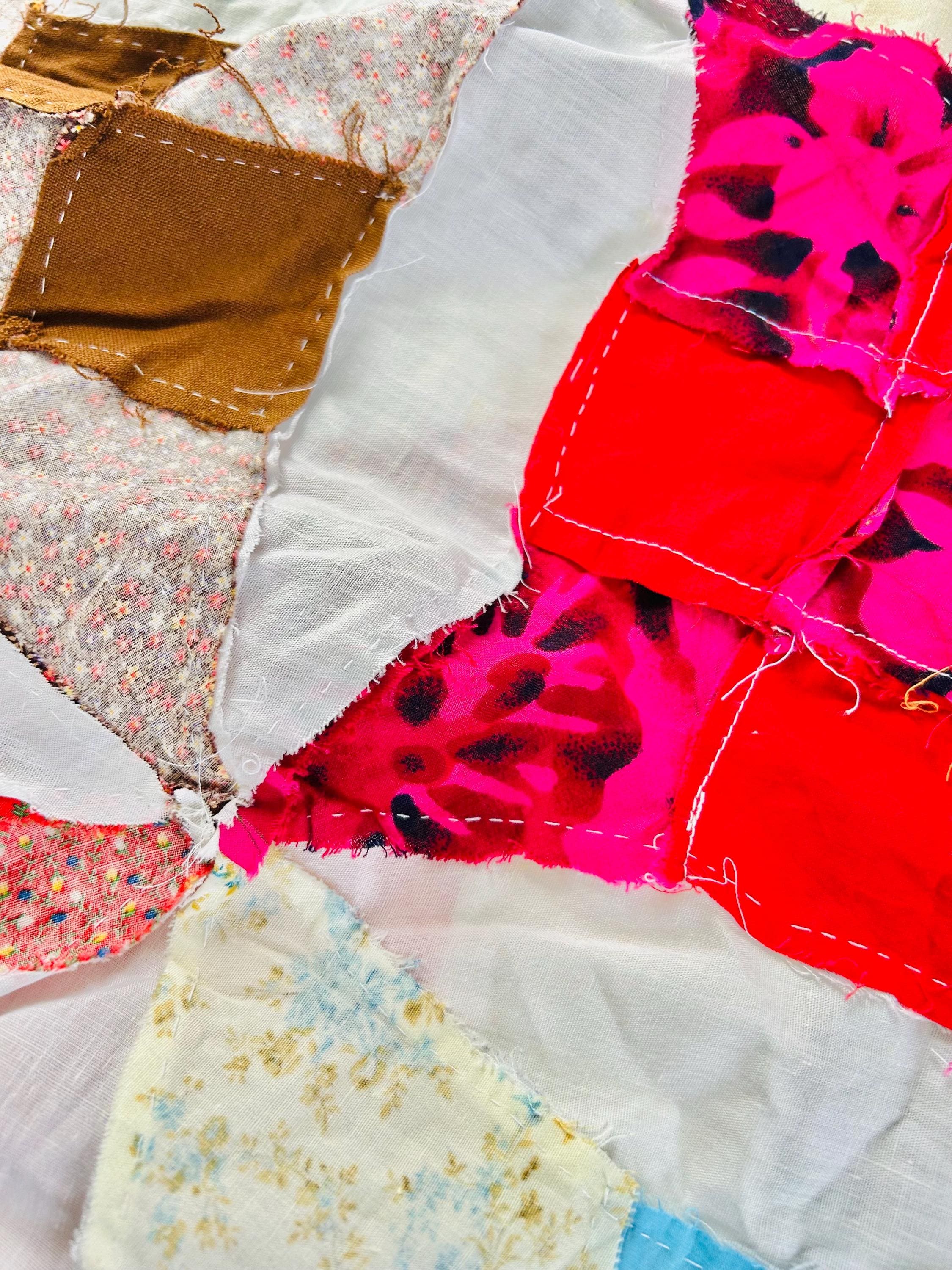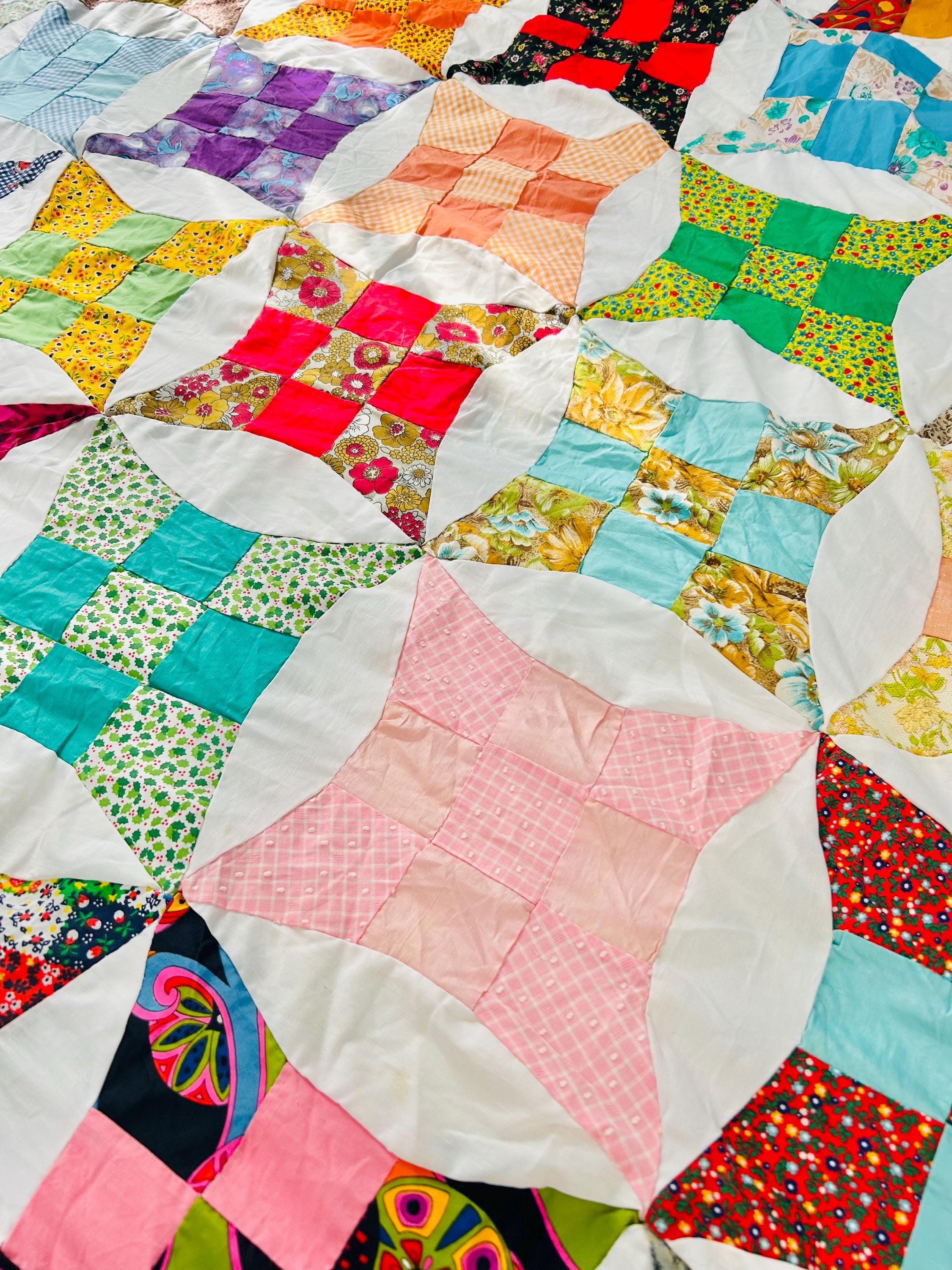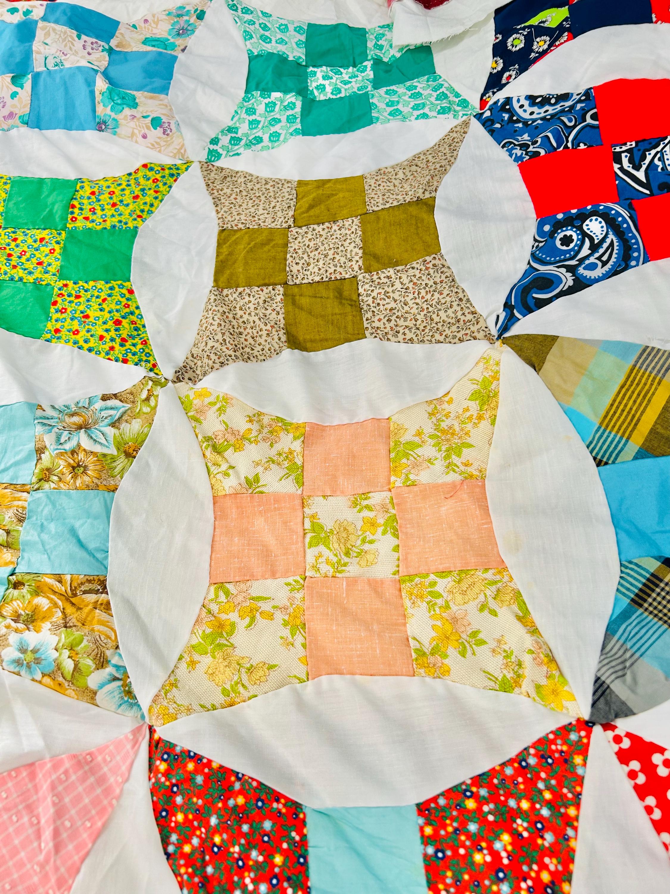 The Quilt Top is made of feedsack-era cottons and other fabrics that include: β’ Bright mid-century solids (bubblegum pinks, cherry reds, sunny yellows, aqua blues, and grassy greens) β’ Feedsack-style small florals and ditsy prints β’ Plaids and ginghams, including classic blue-and-white and green checks β’ Playful novelty prints (including juvenile figures and bold graphic prints)