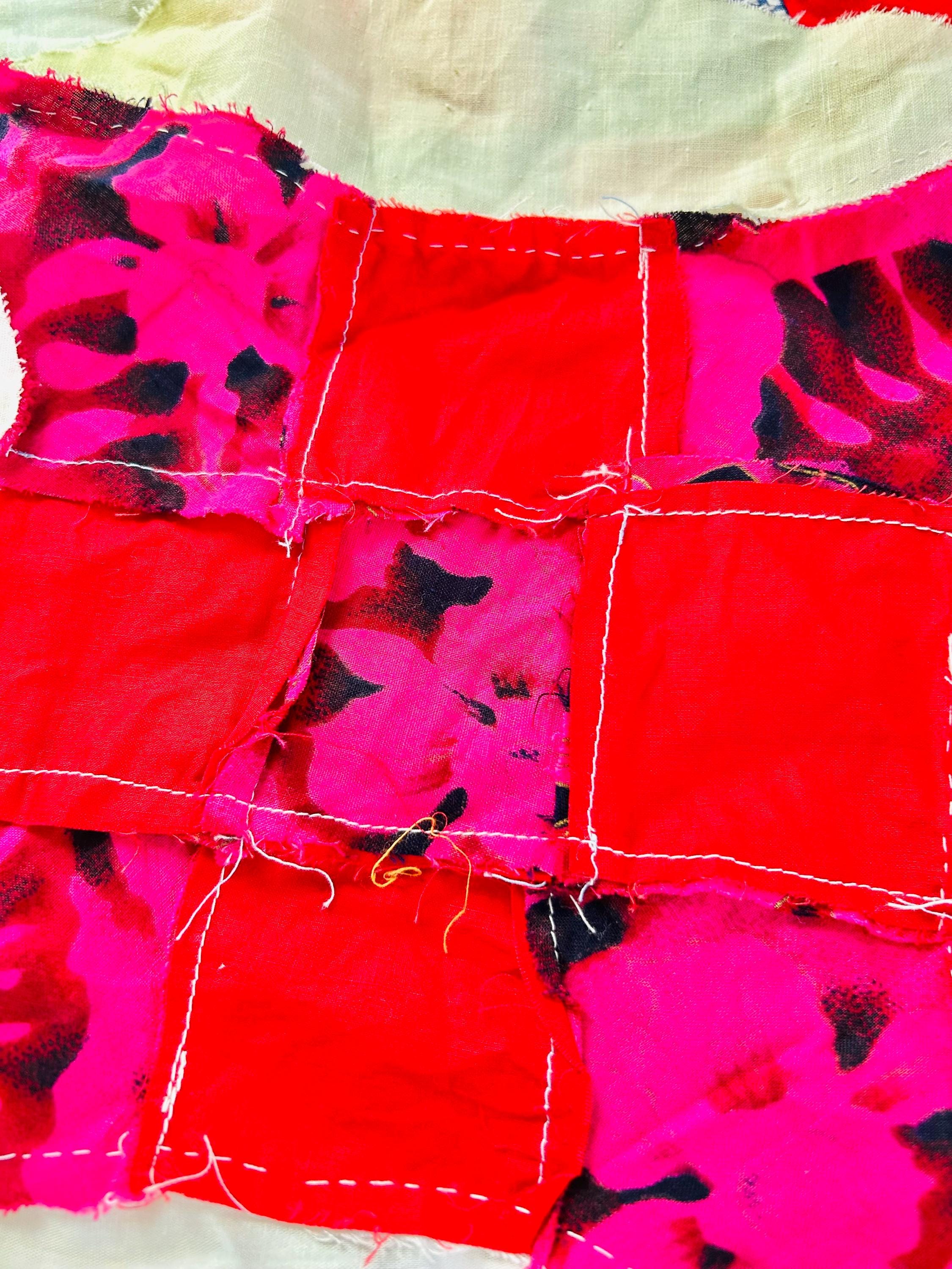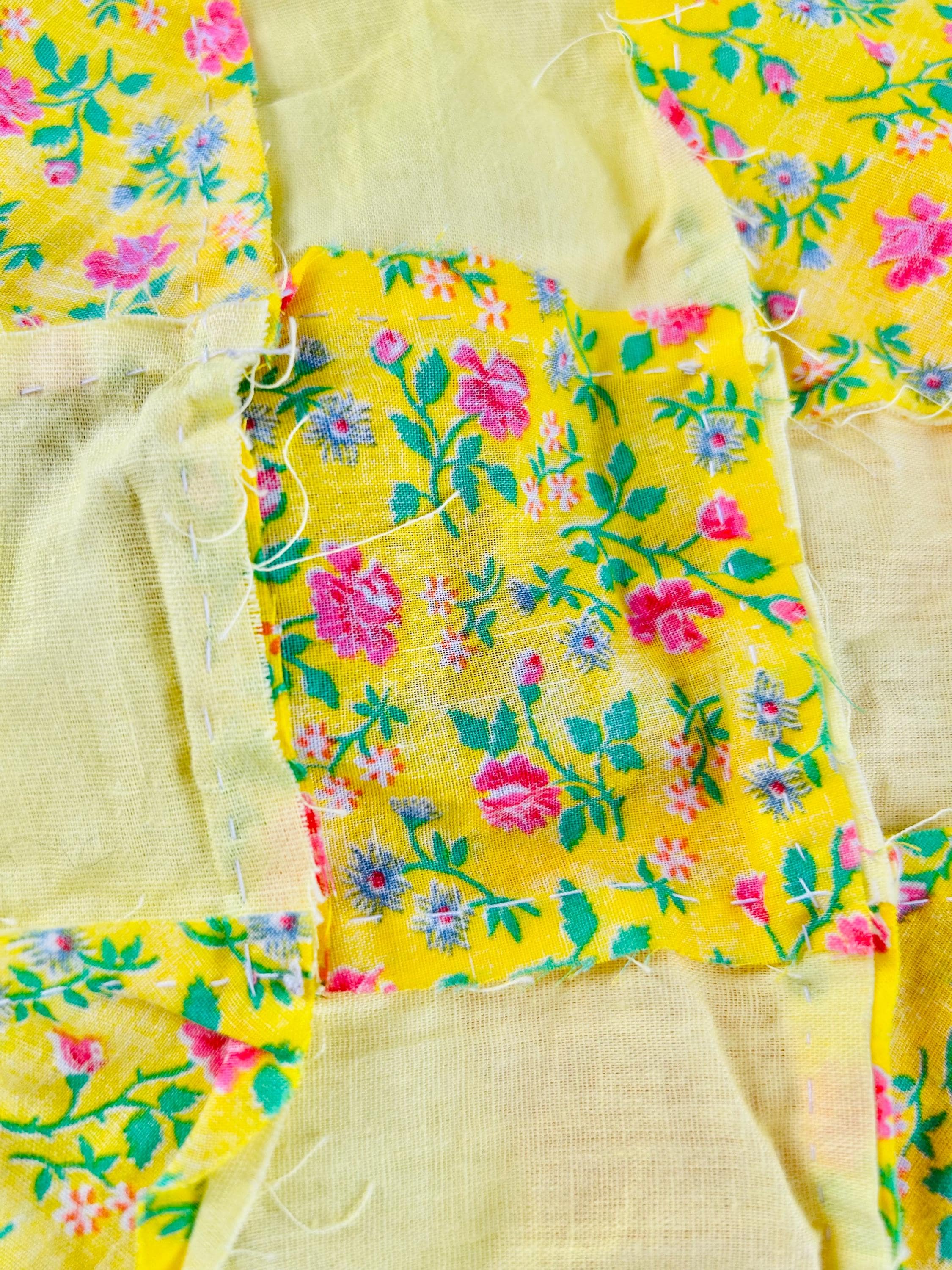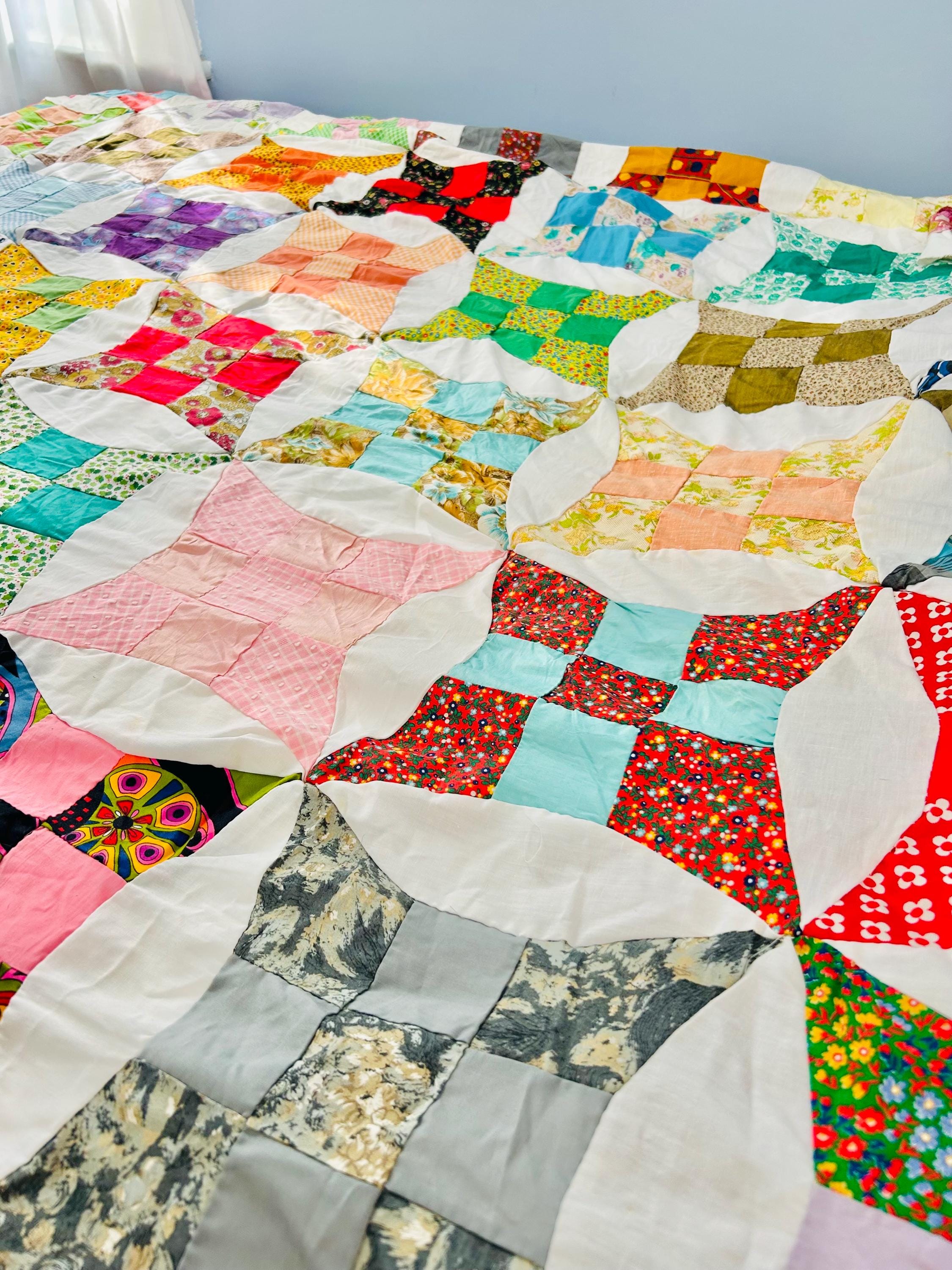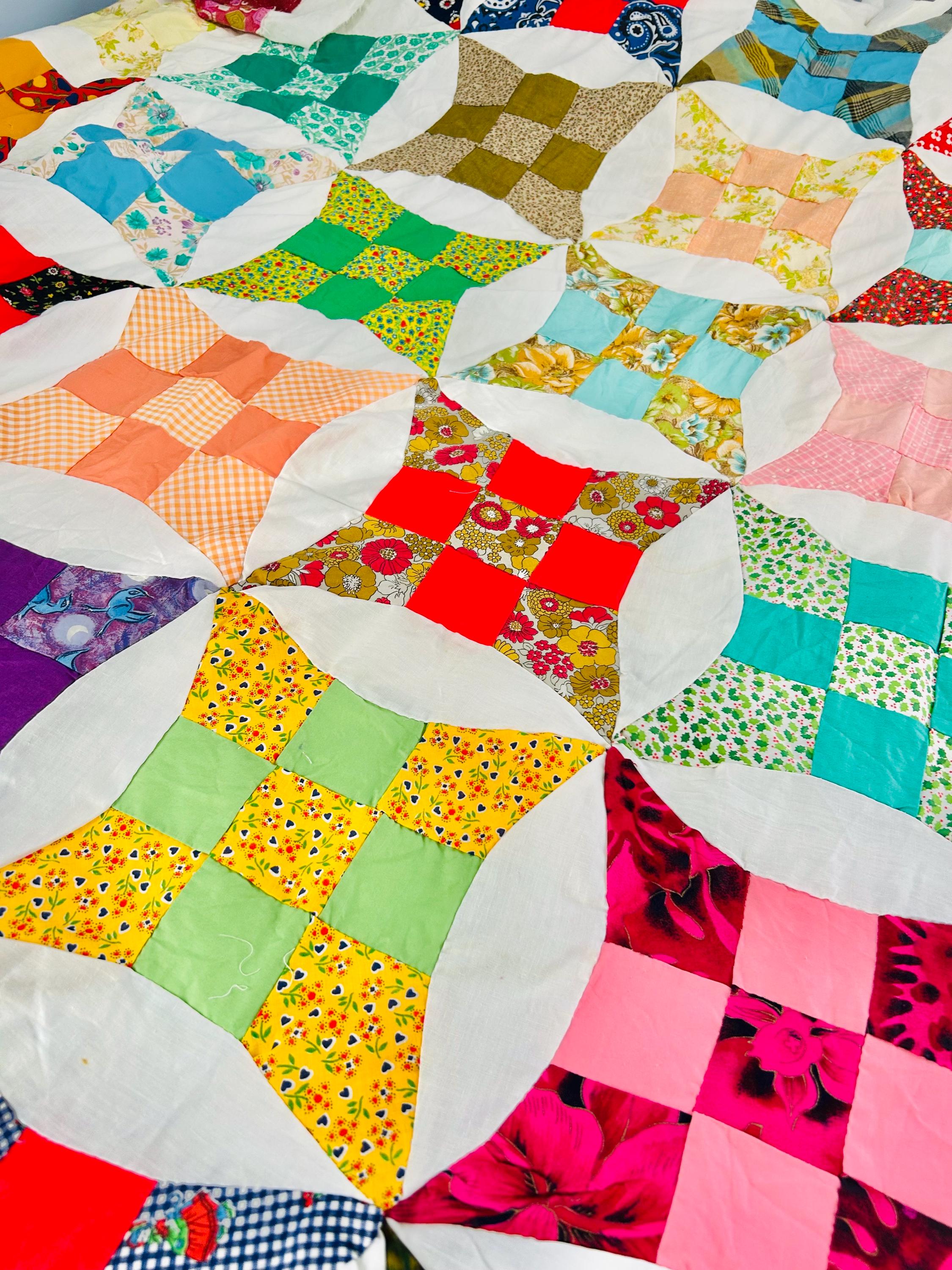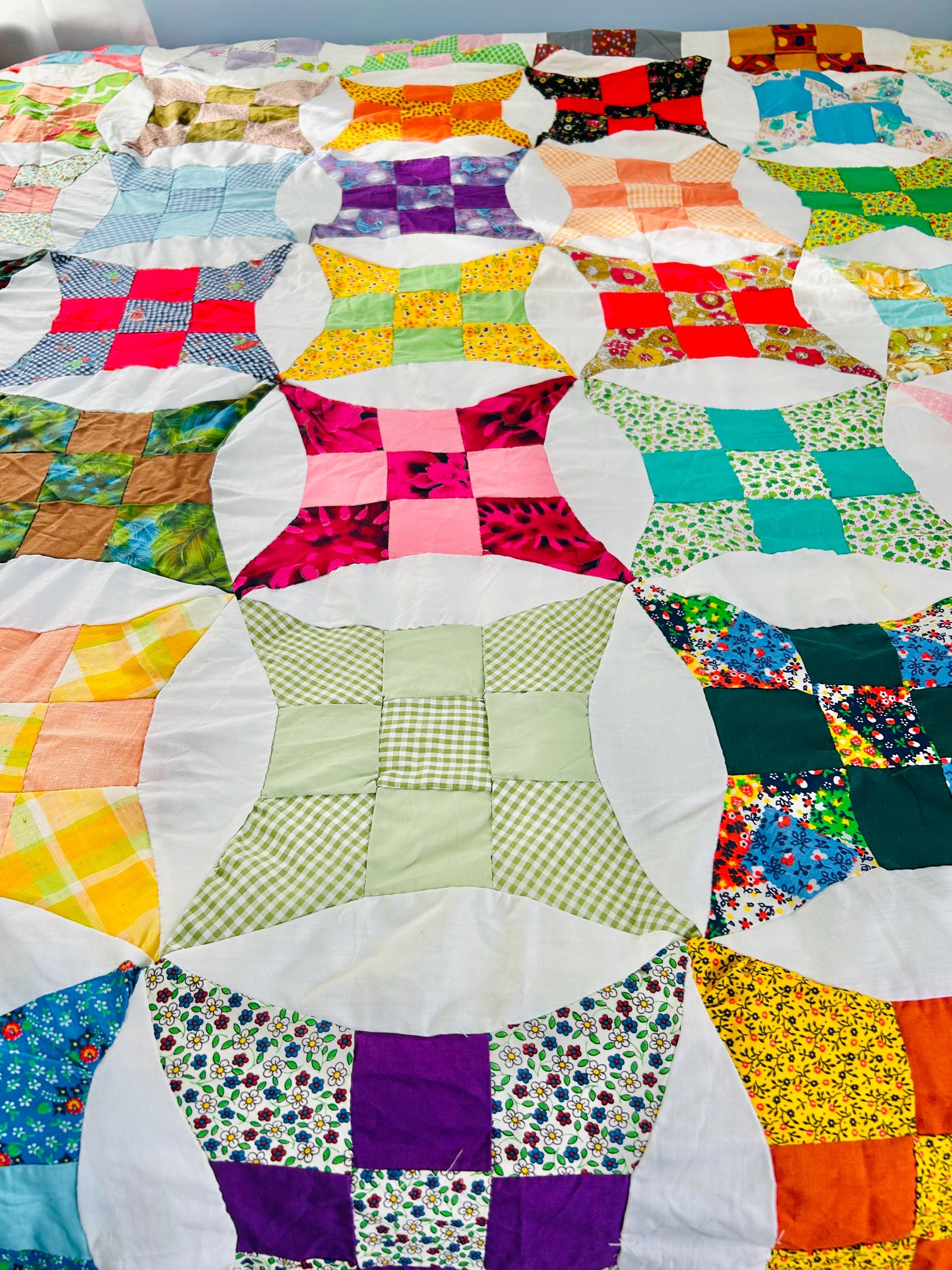 The Quilt Top is made of feedsack-era cottons and other fabrics that include: β’ Bright mid-century solids (bubblegum pinks, cherry reds, sunny yellows, aqua blues, and grassy greens) β’ Feedsack-style small florals and ditsy prints β’ Plaids and ginghams, including classic blue-and-white and green checks β’ Playful novelty prints (including juvenile figures and bold graphic prints)