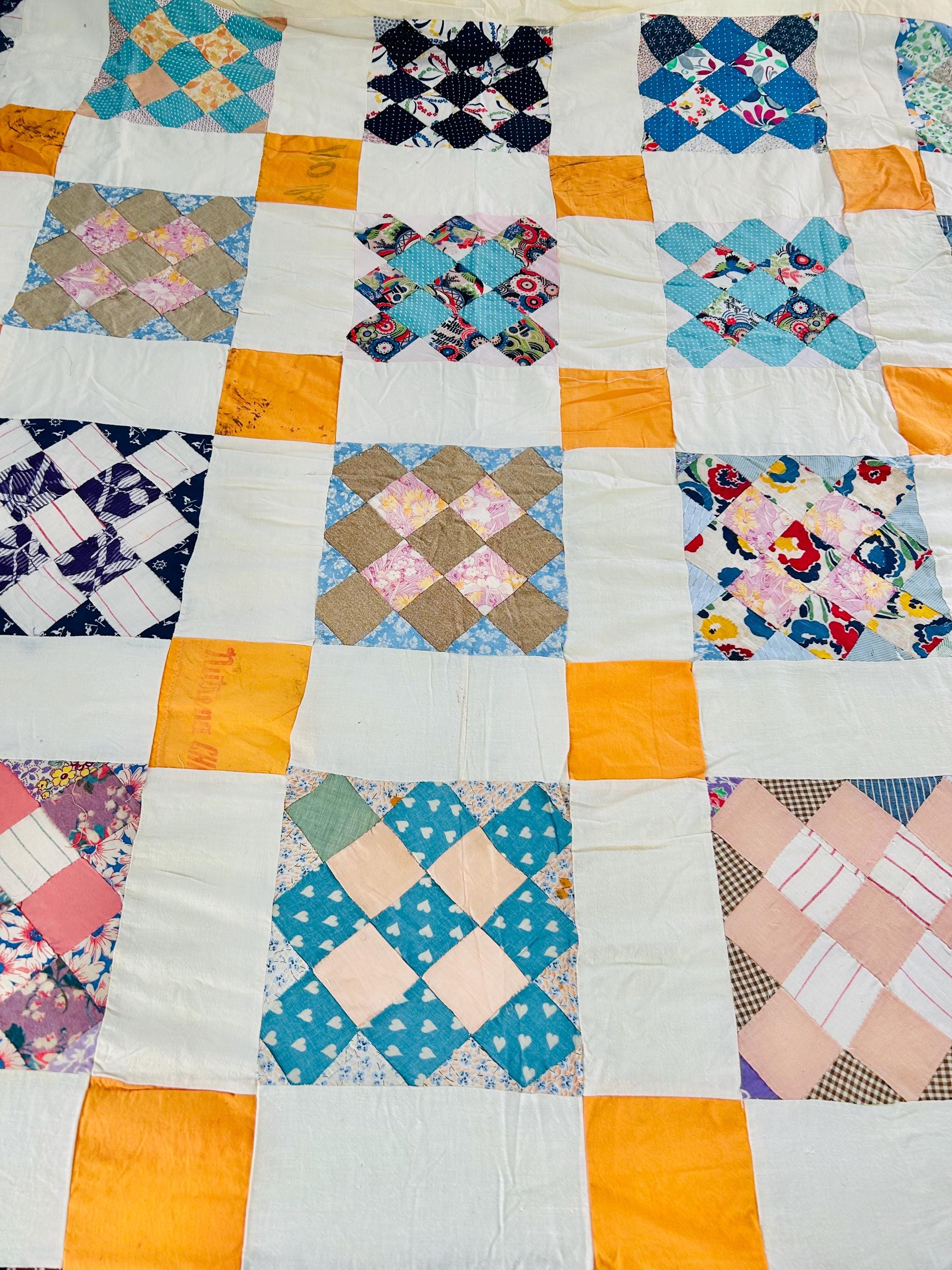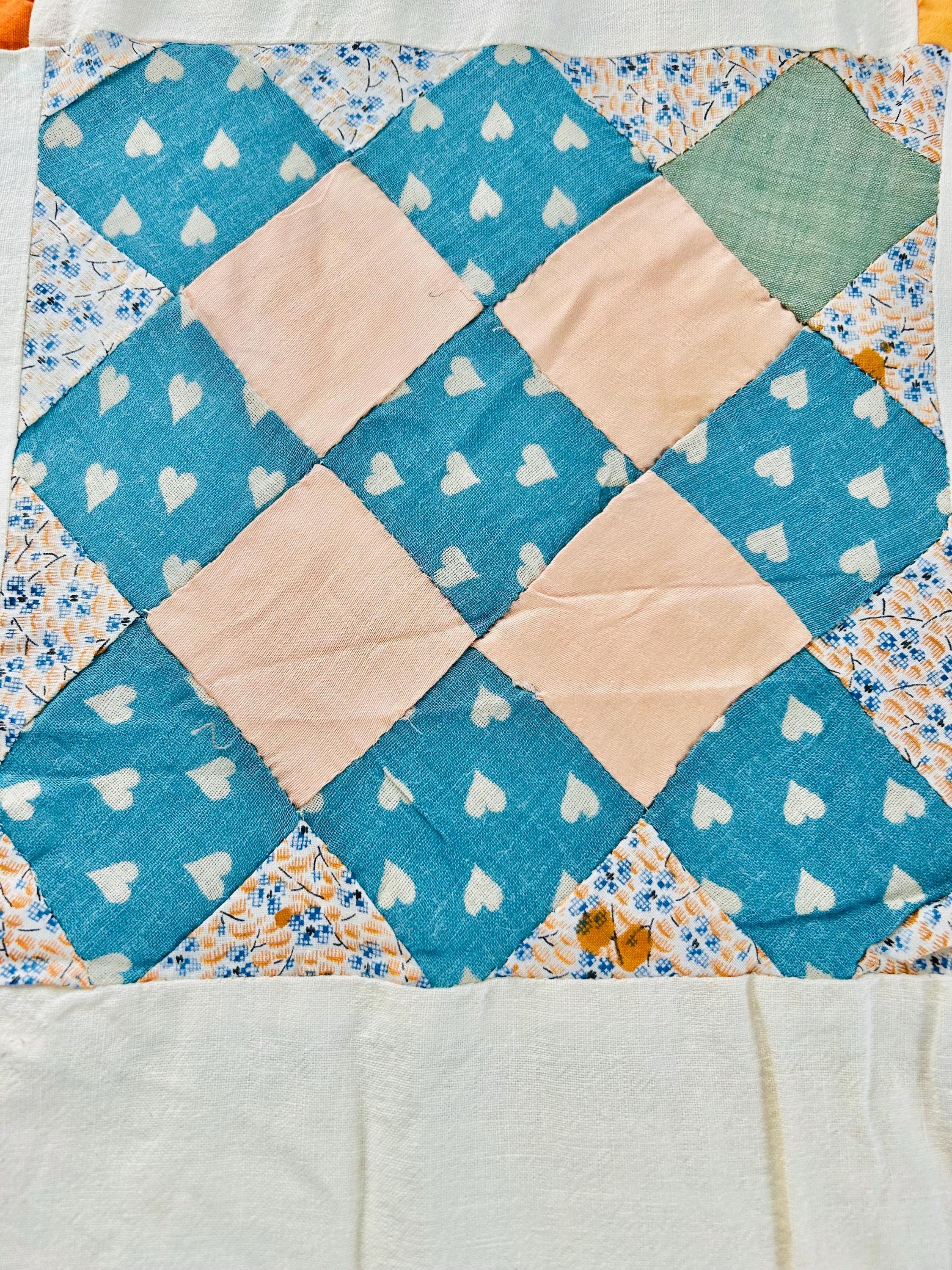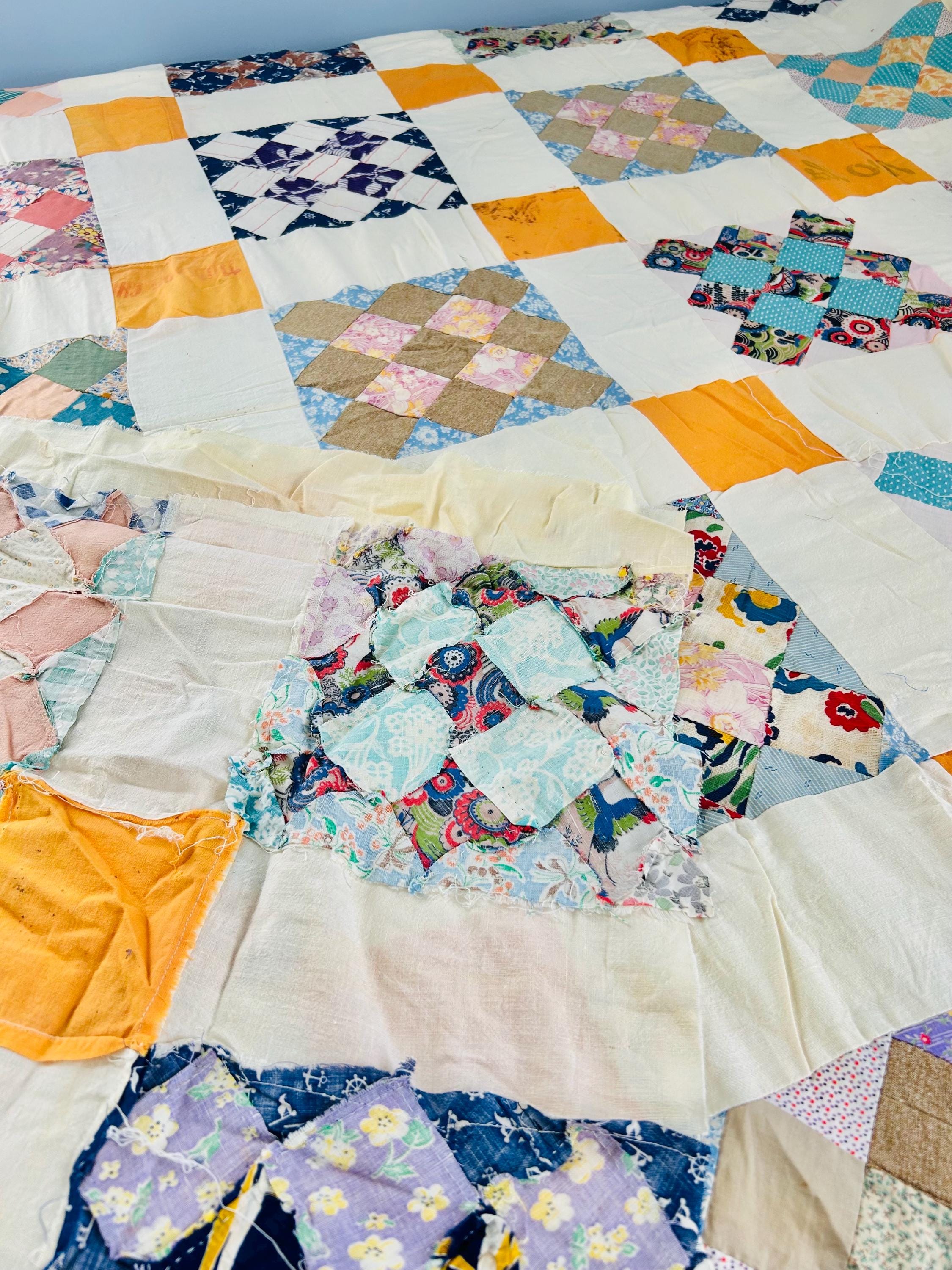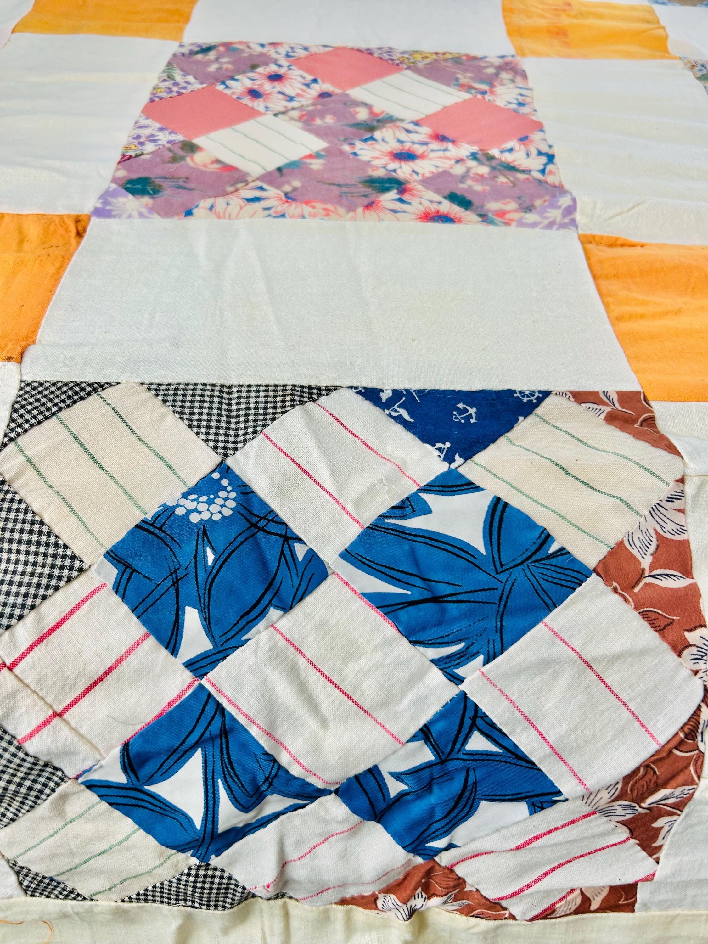 Details: • Genuine Depression-era feedsack textiles • Original printed sack stamps still visible (increasingly rare) • Charming mix of 1930s–early 1940s prints • Type: Quilt Top Only (unquilted, no batting or backing) • Date: Circa 1935–early 1940s • Size: 68” x 74” • Pattern: Scrap block variation (Nine Patch) • Materials: Cotton feedsack fabrics, repurposed cottons • Colors: Turquoise, pink, navy, yellow/orange sack cloth, cream sashing • Construction: Hand-and-machine pieced (likely treadle-era), hand-guided