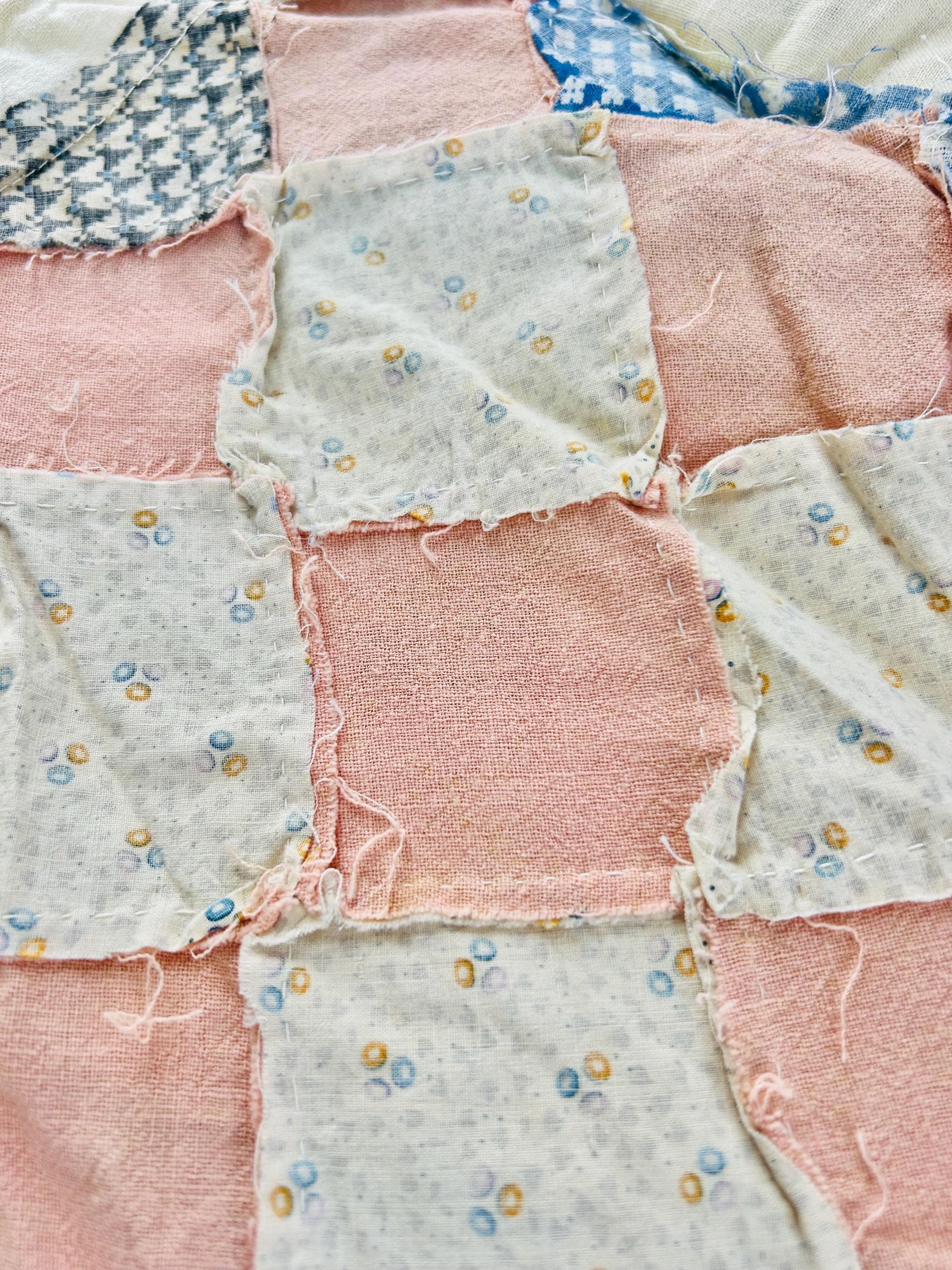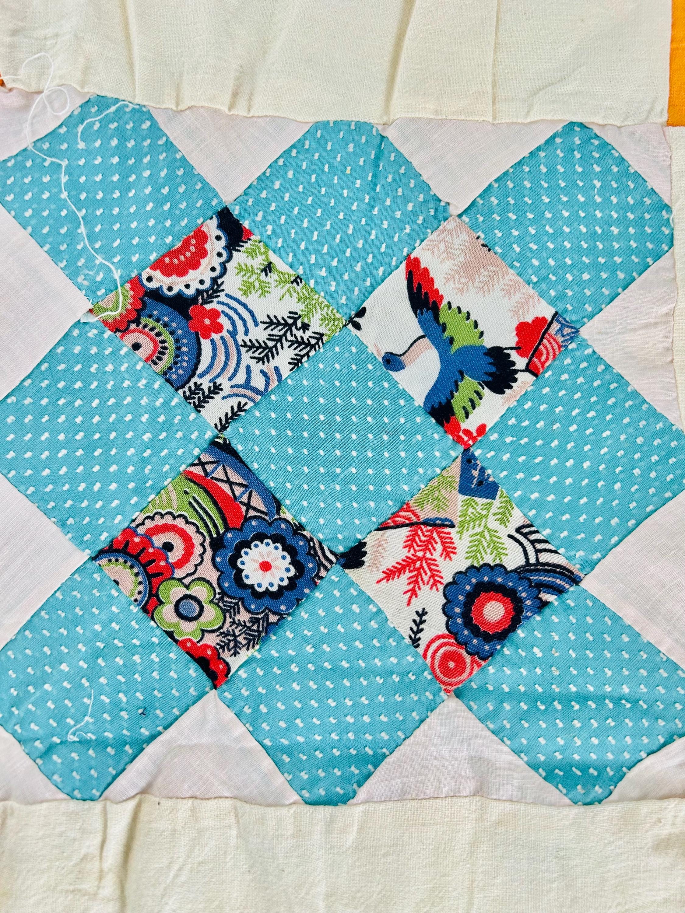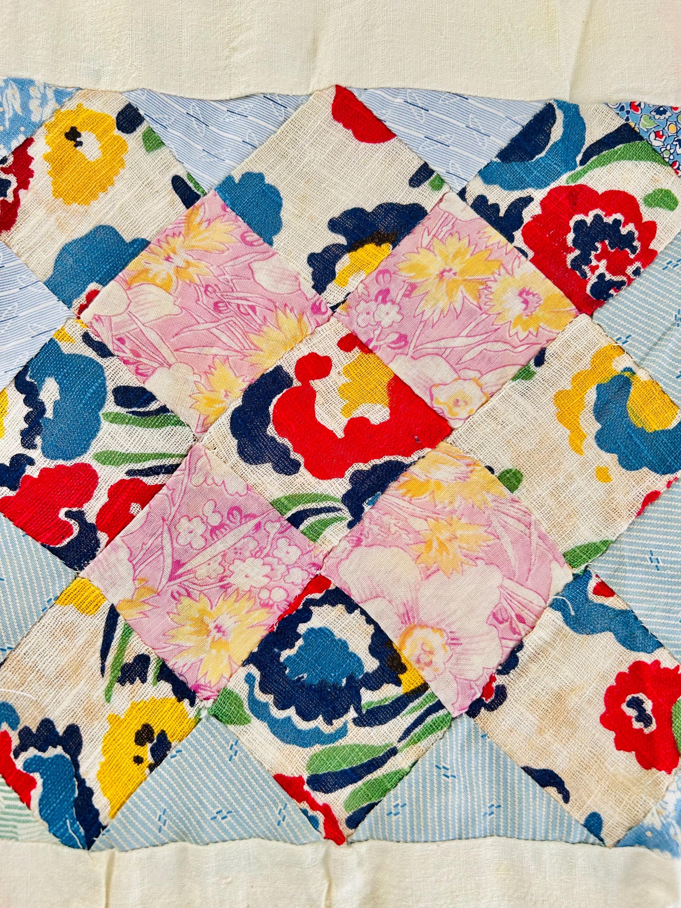 This vintage Depression-era feedsack quilt top in Nine-Patch Variation pattern beautifully captures the resourcefulness and creativity of 1930s–1940s quiltmakers.