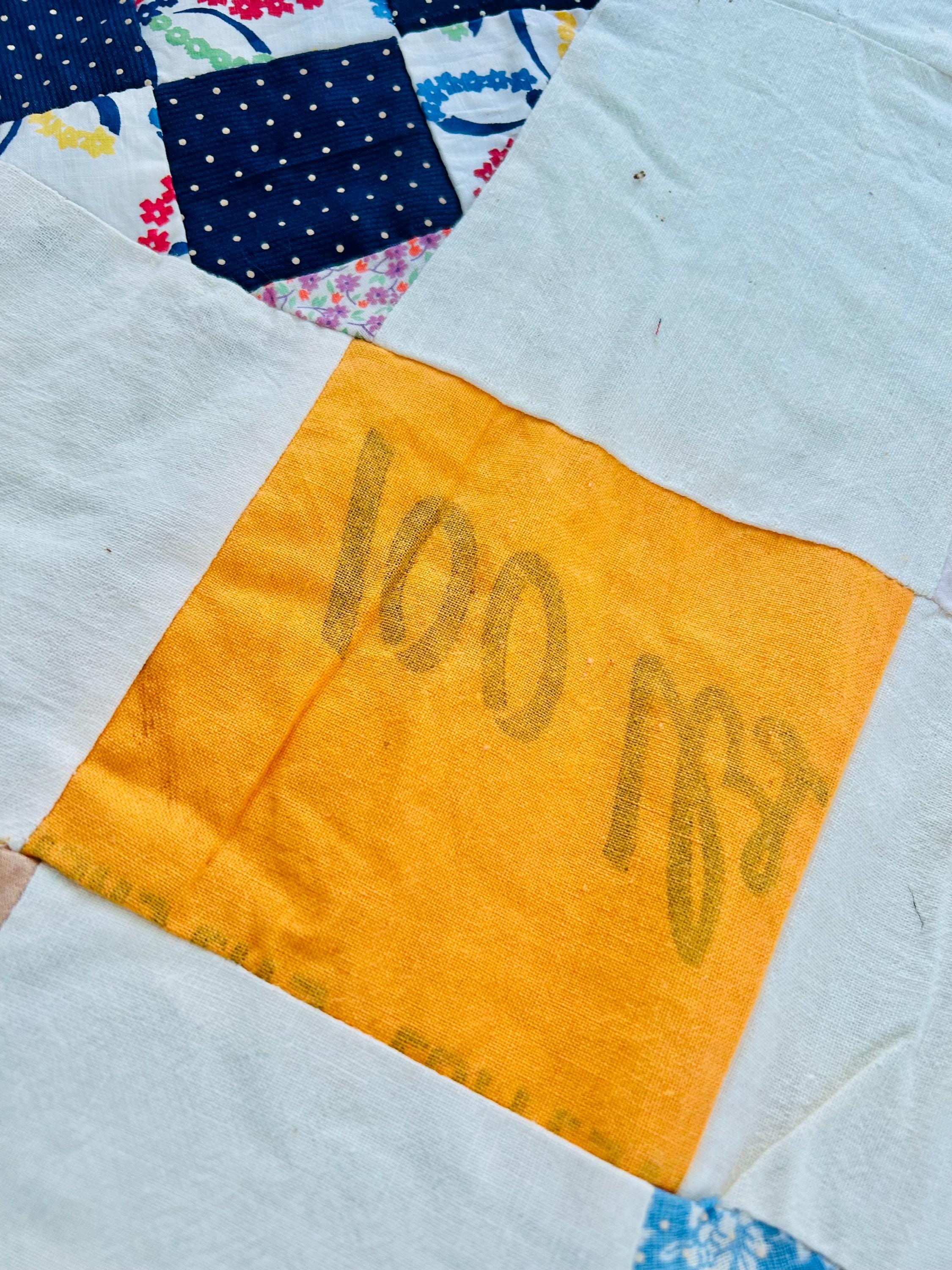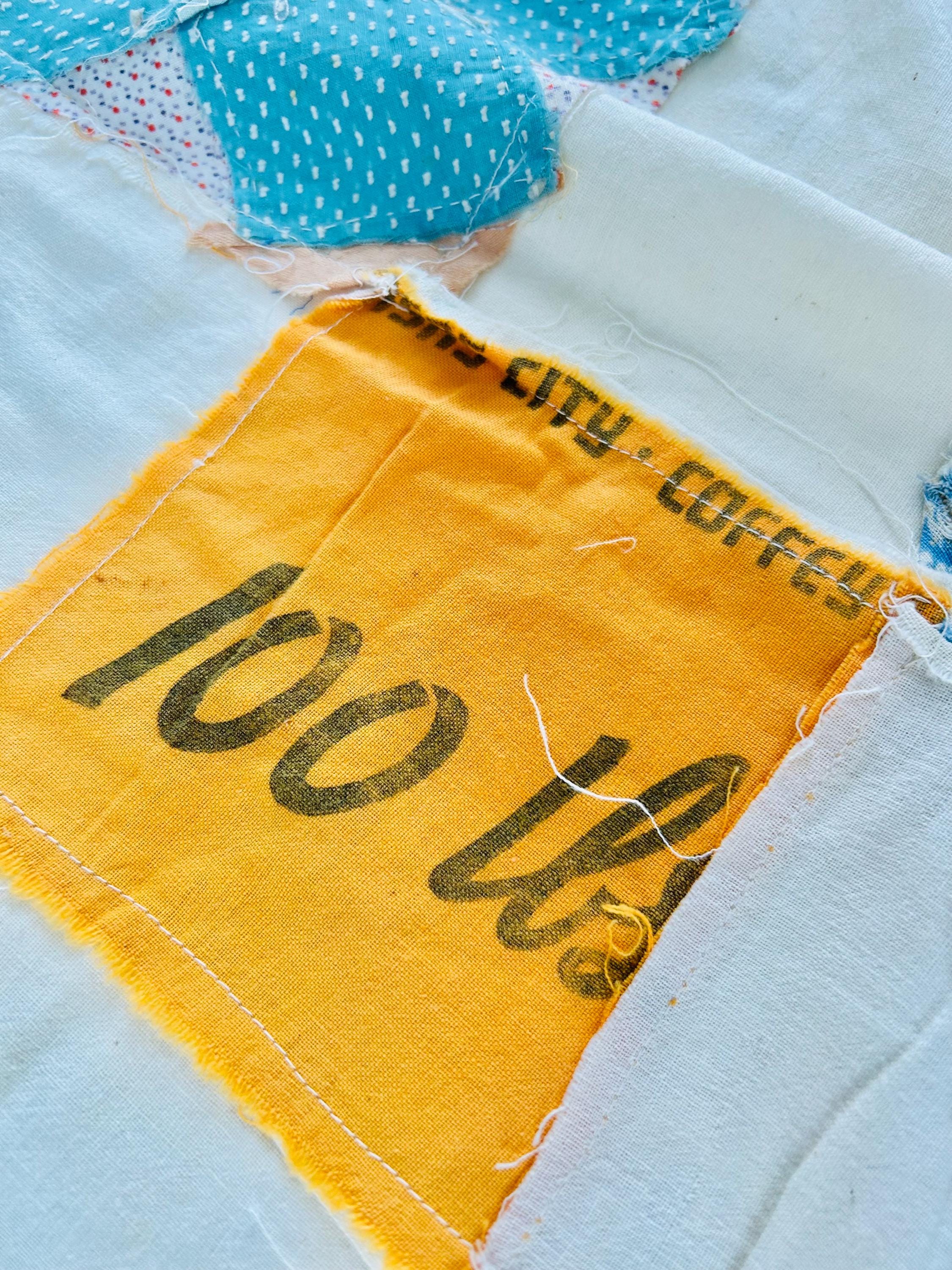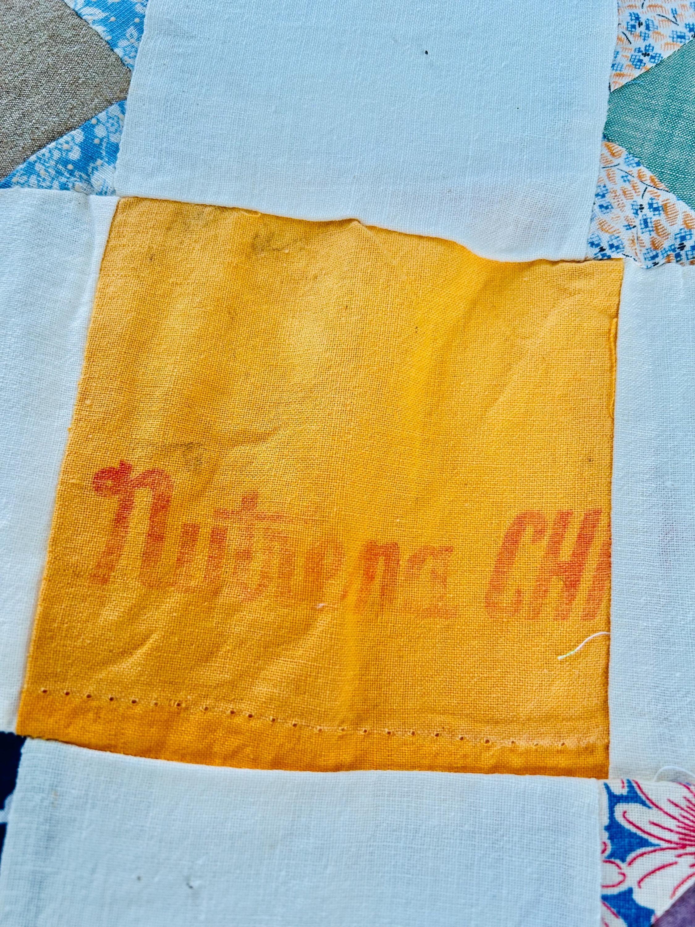 Constructed from a lively assortment of original feedsack fabrics, this quilt top features highly desirable visible sack stamps and printed markings, including bold “100 lbs” text and partial mill branding—rarely found details in a quilt top.