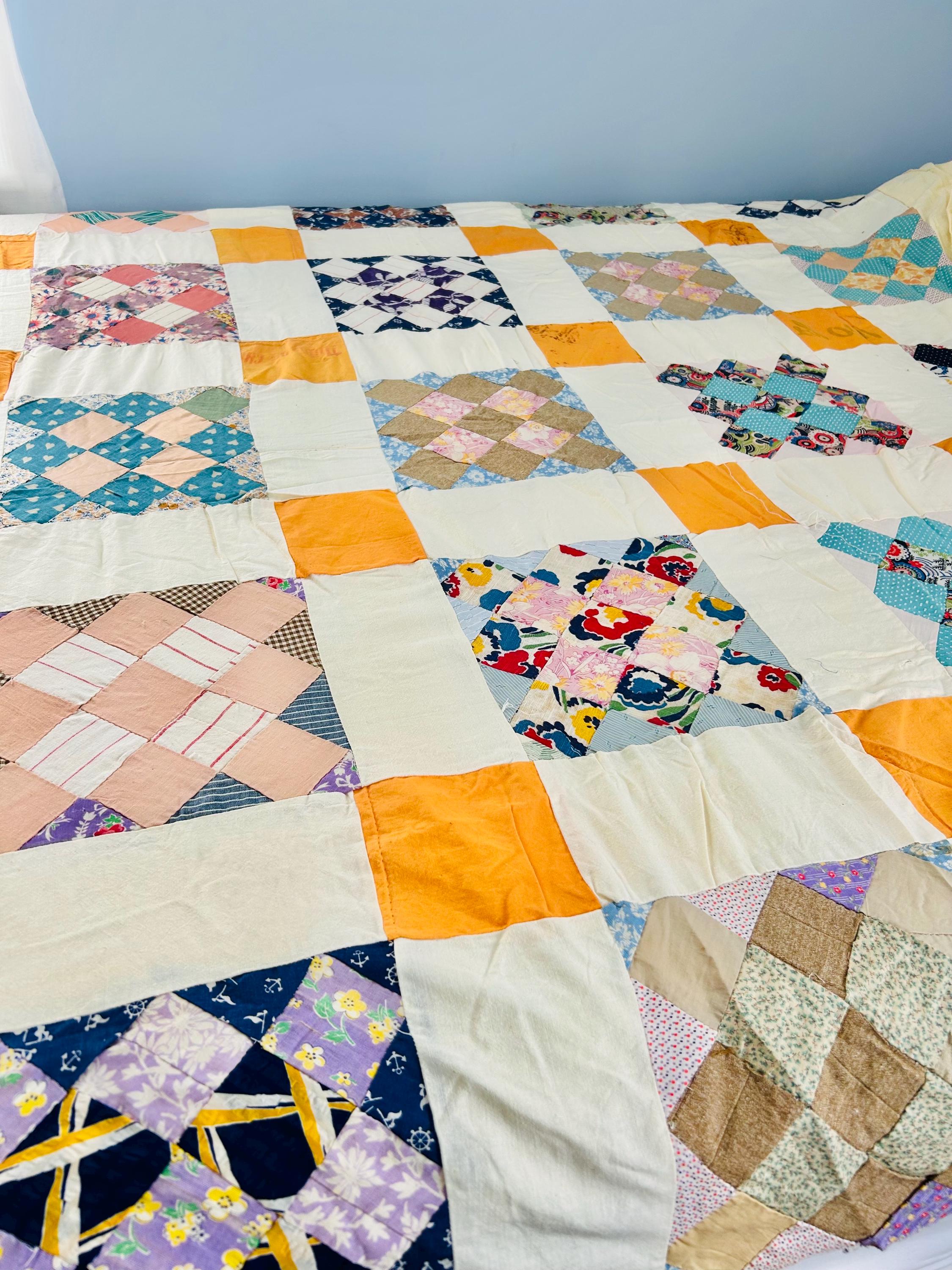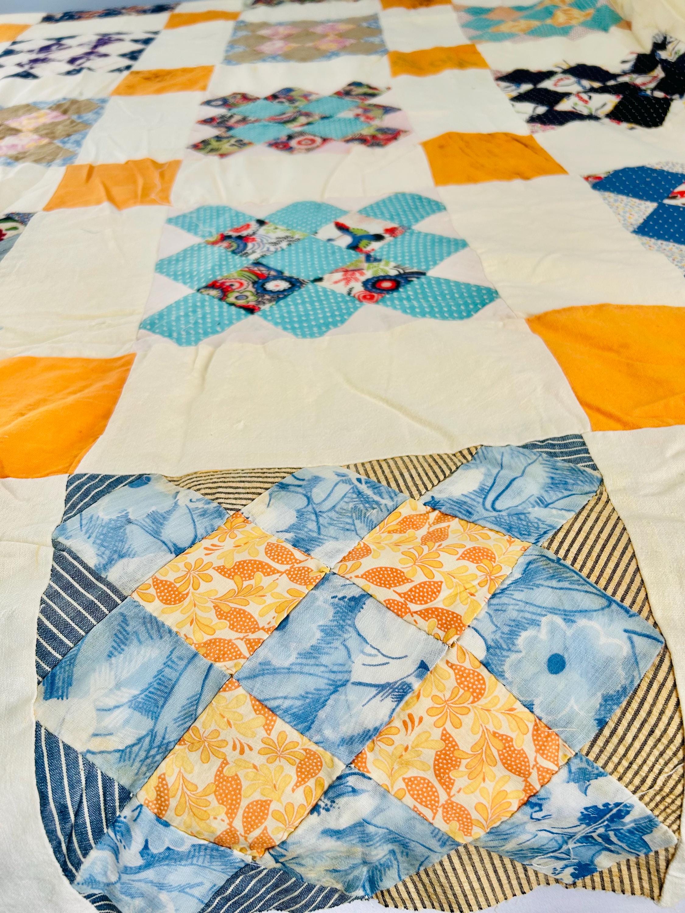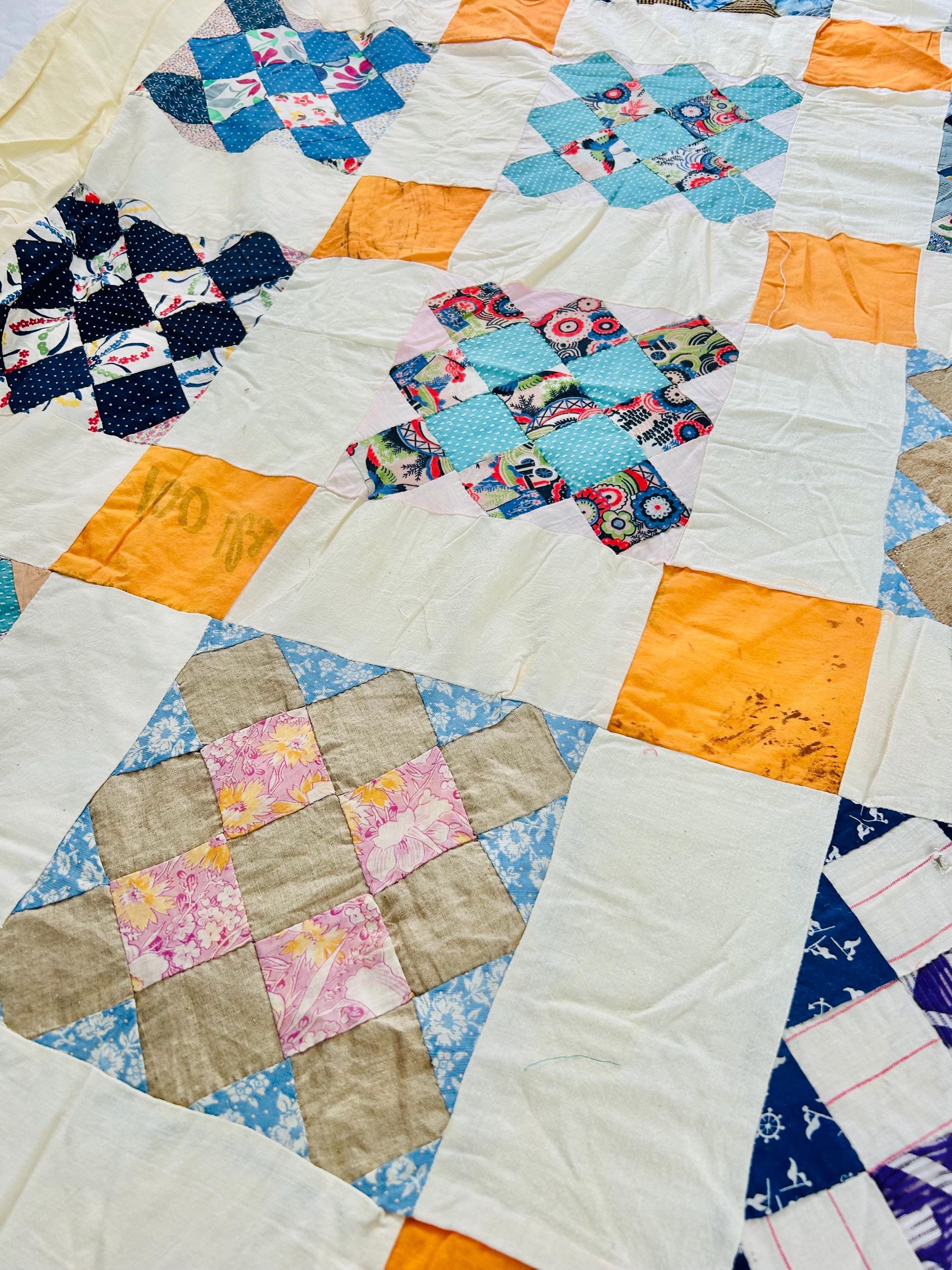 The quilt top is in excellent vintage condition. Please note that some of the orange/cheddar patches have tan markings, but these are original to the feedsacks - and are not blemishes or tanning marks.