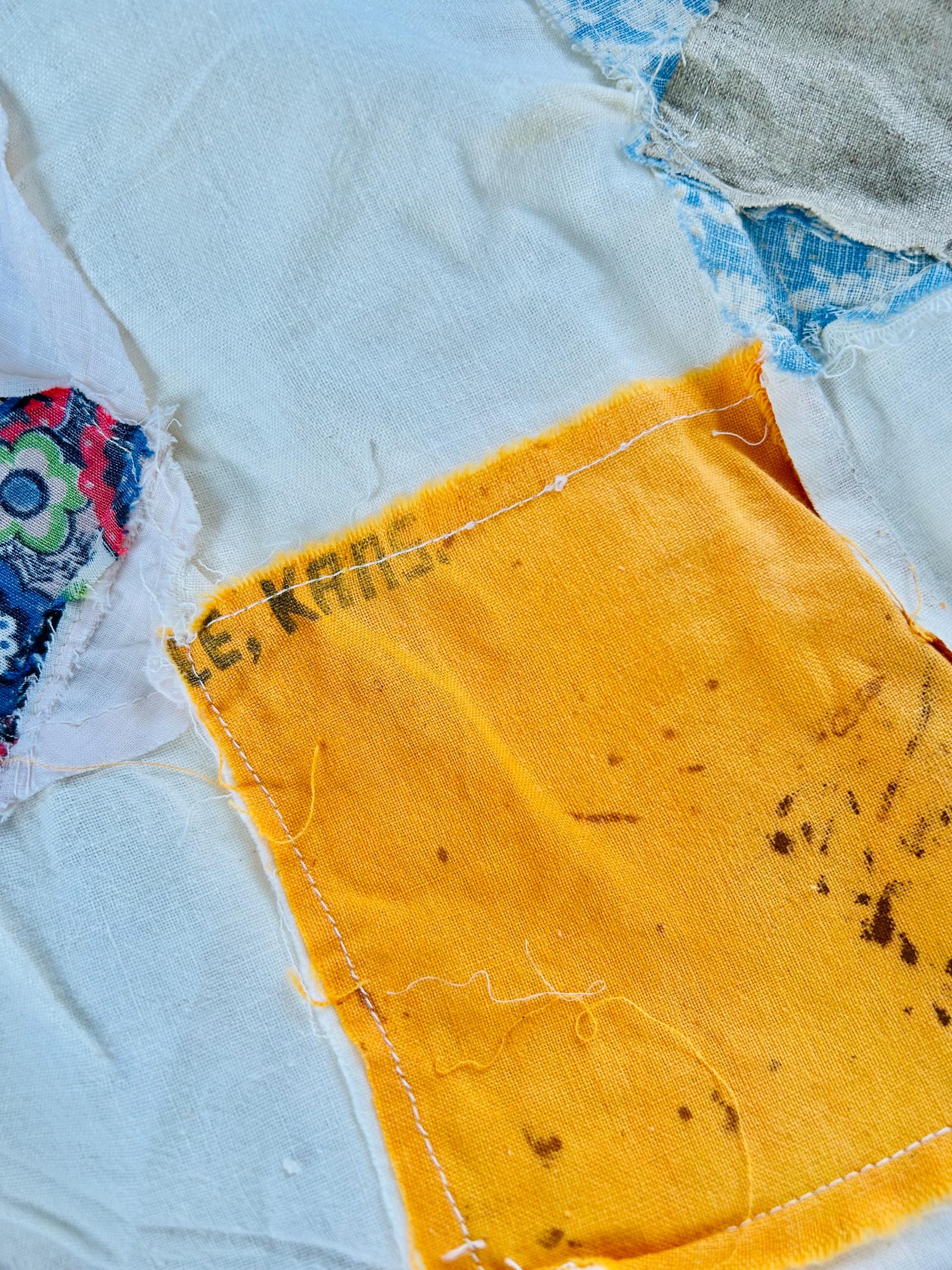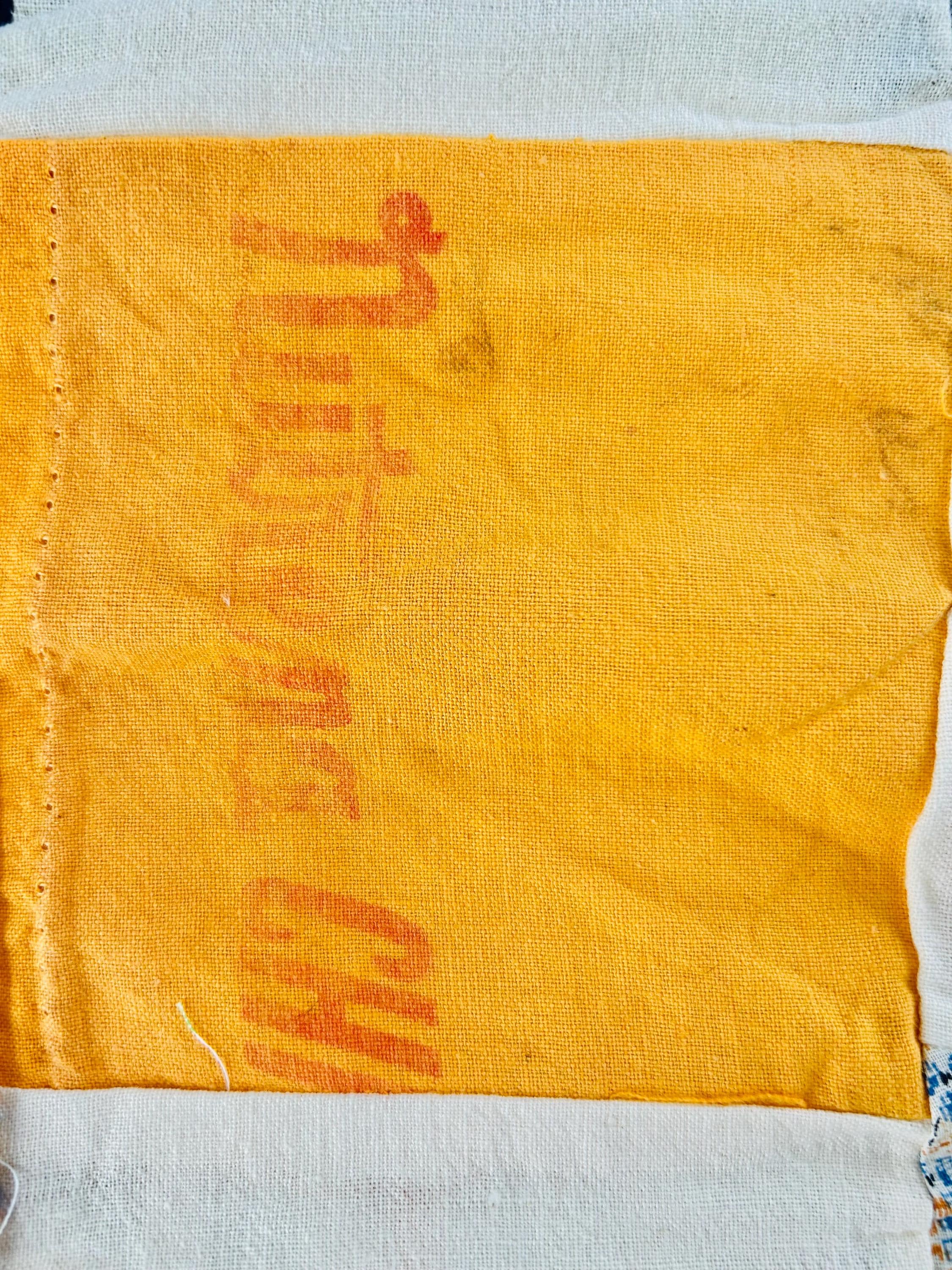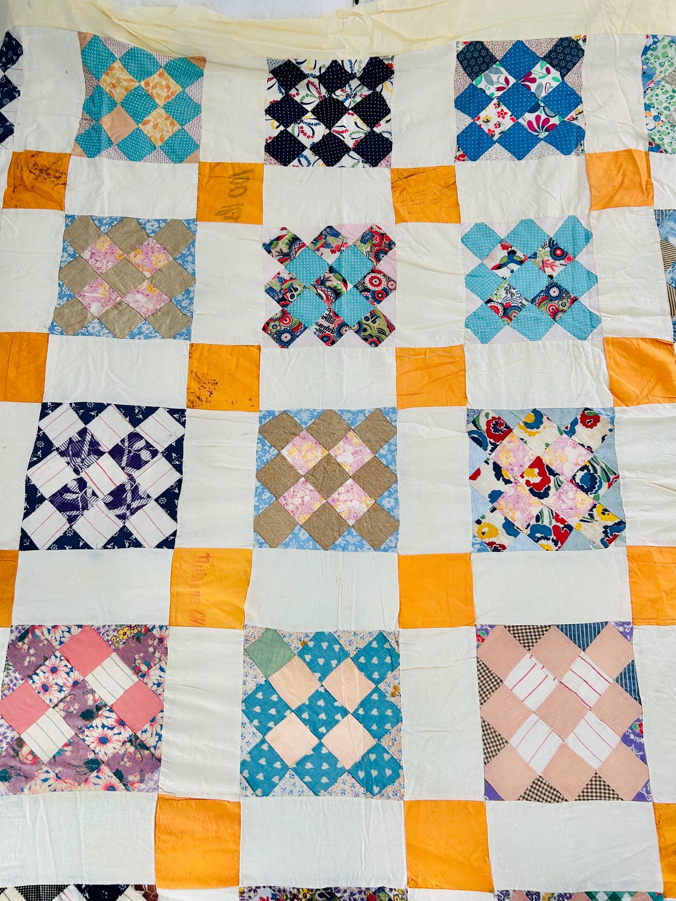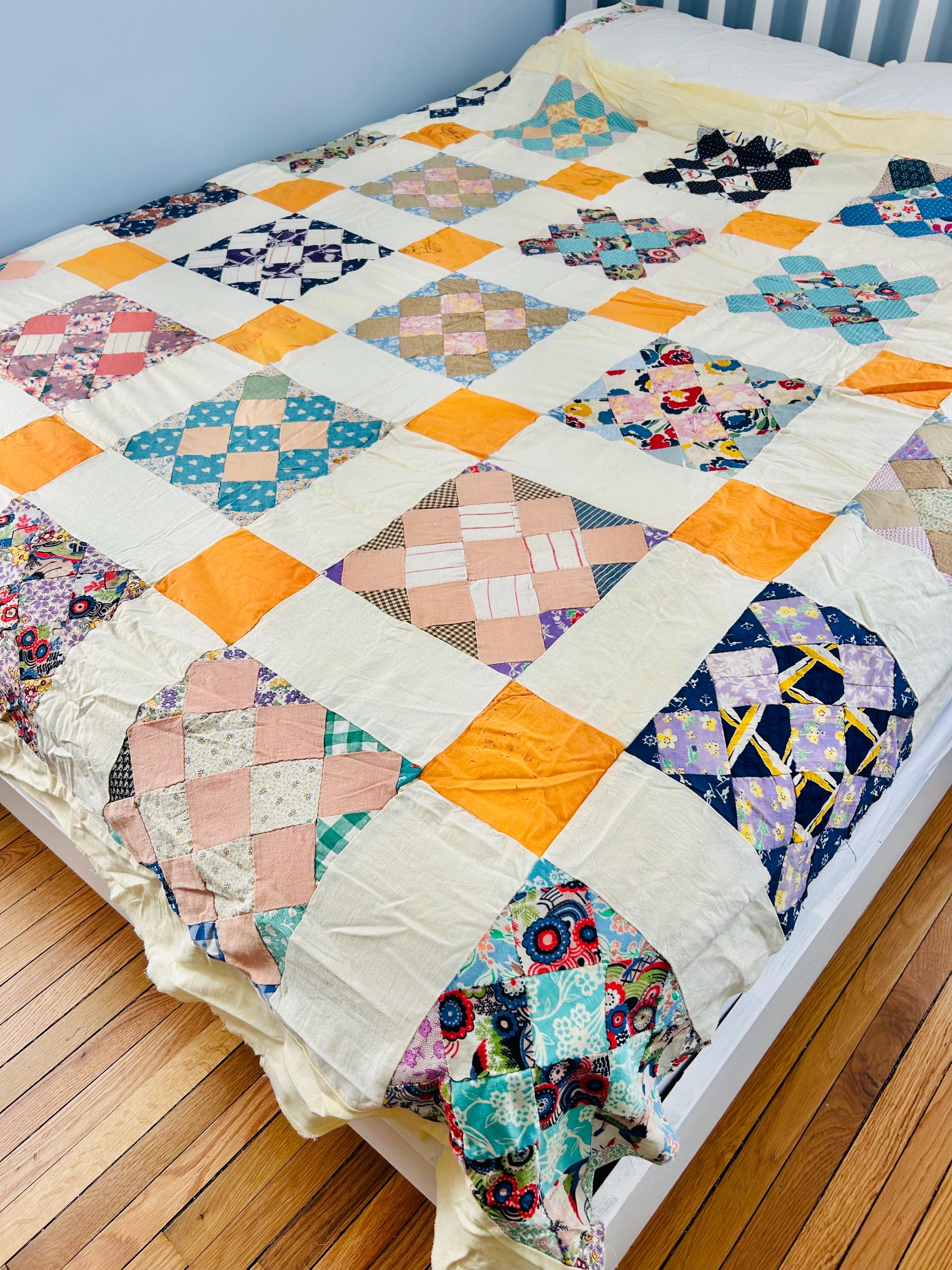 The quilt top is in excellent vintage condition. Please note that some of the orange/cheddar patches have tan markings, but these are original to the feedsacks - and are not blemishes or tanning marks.
