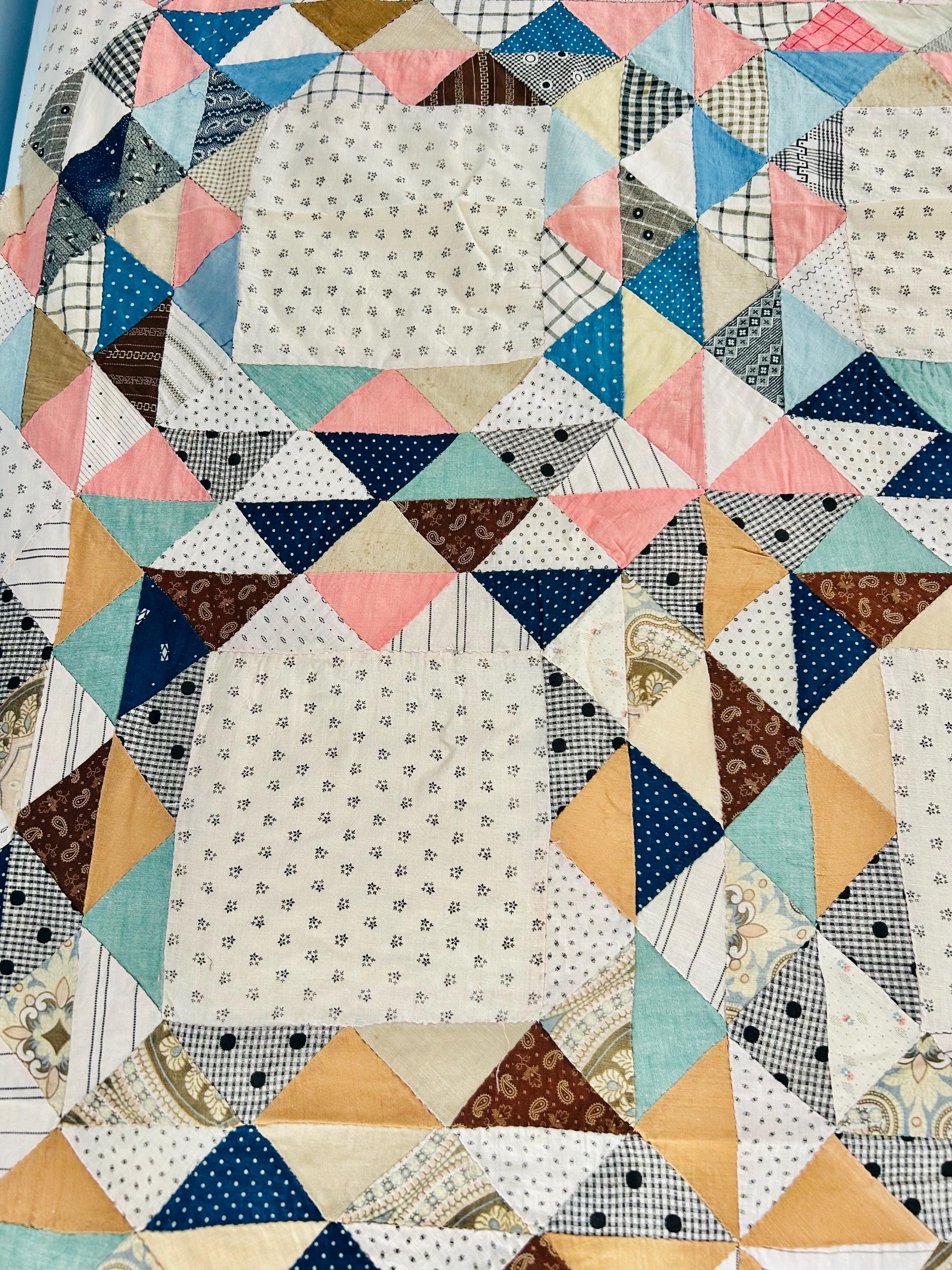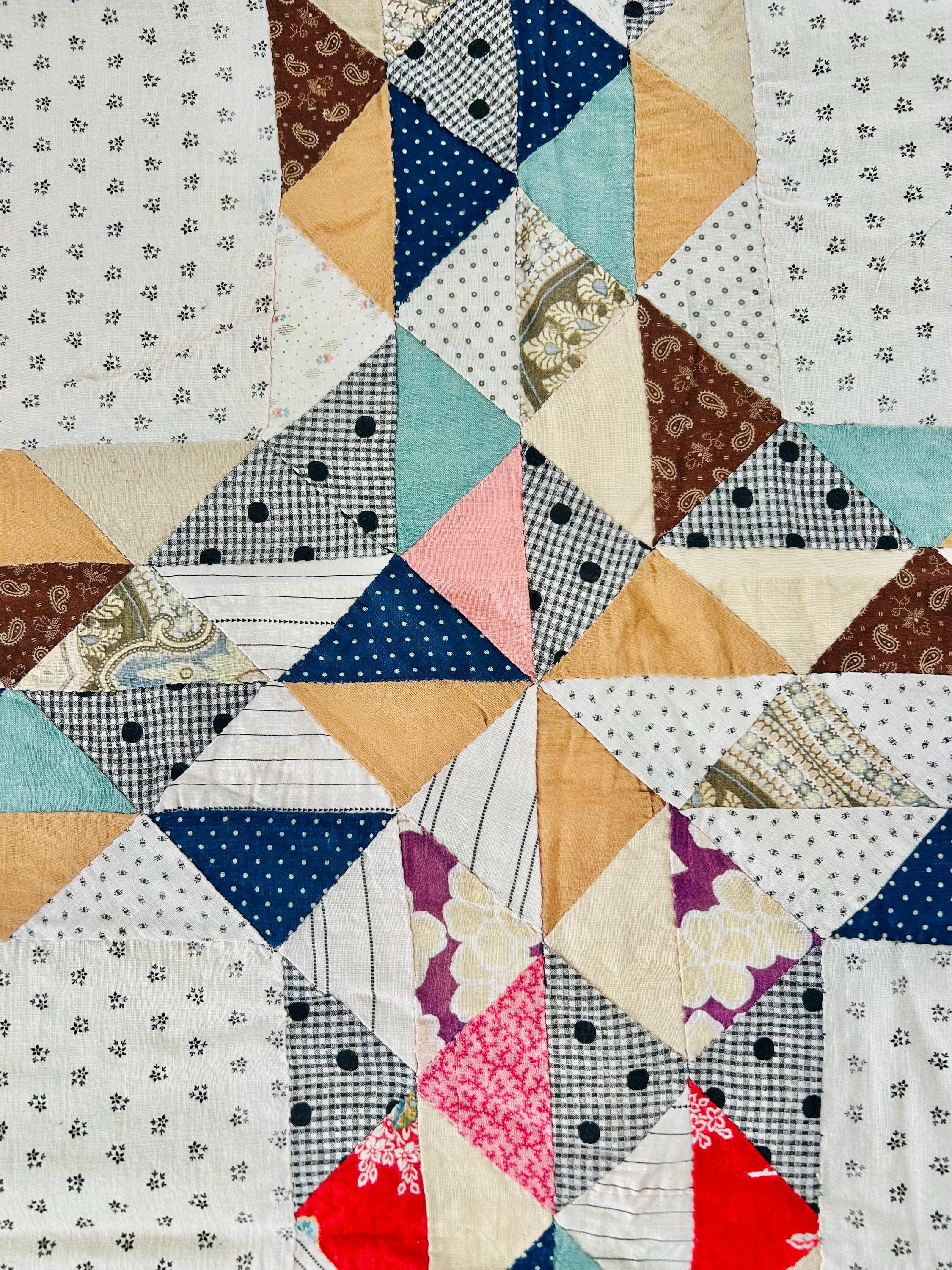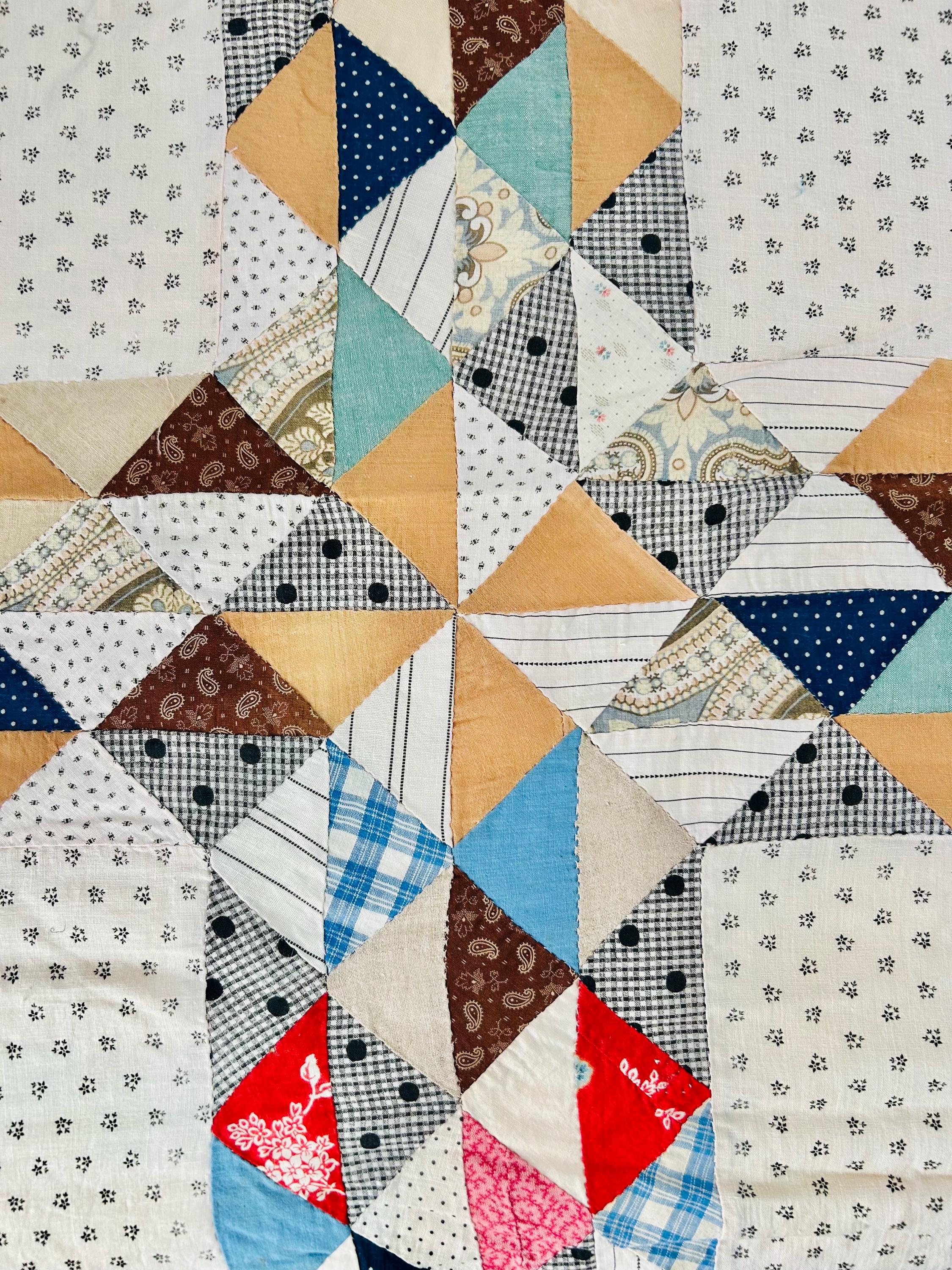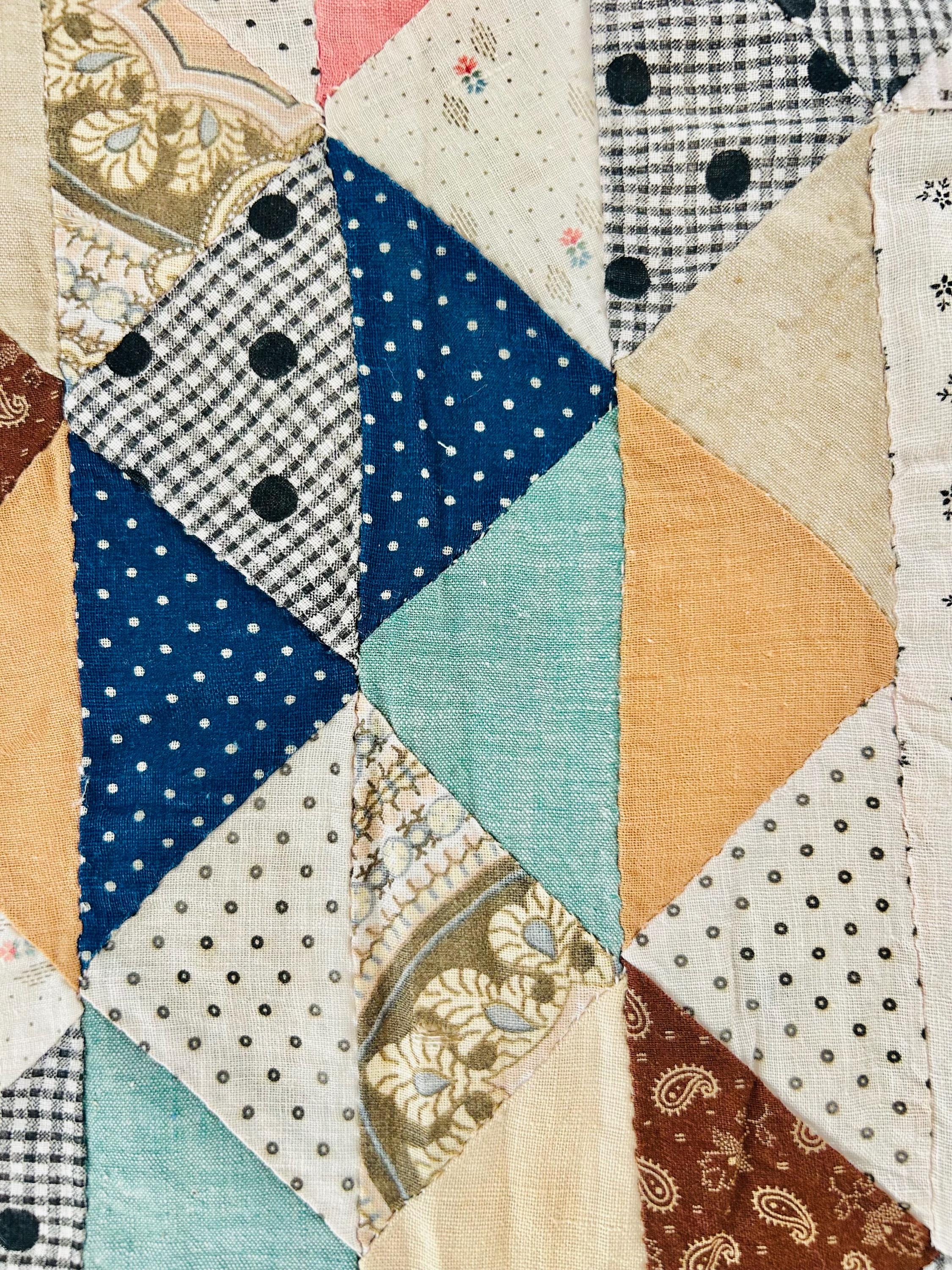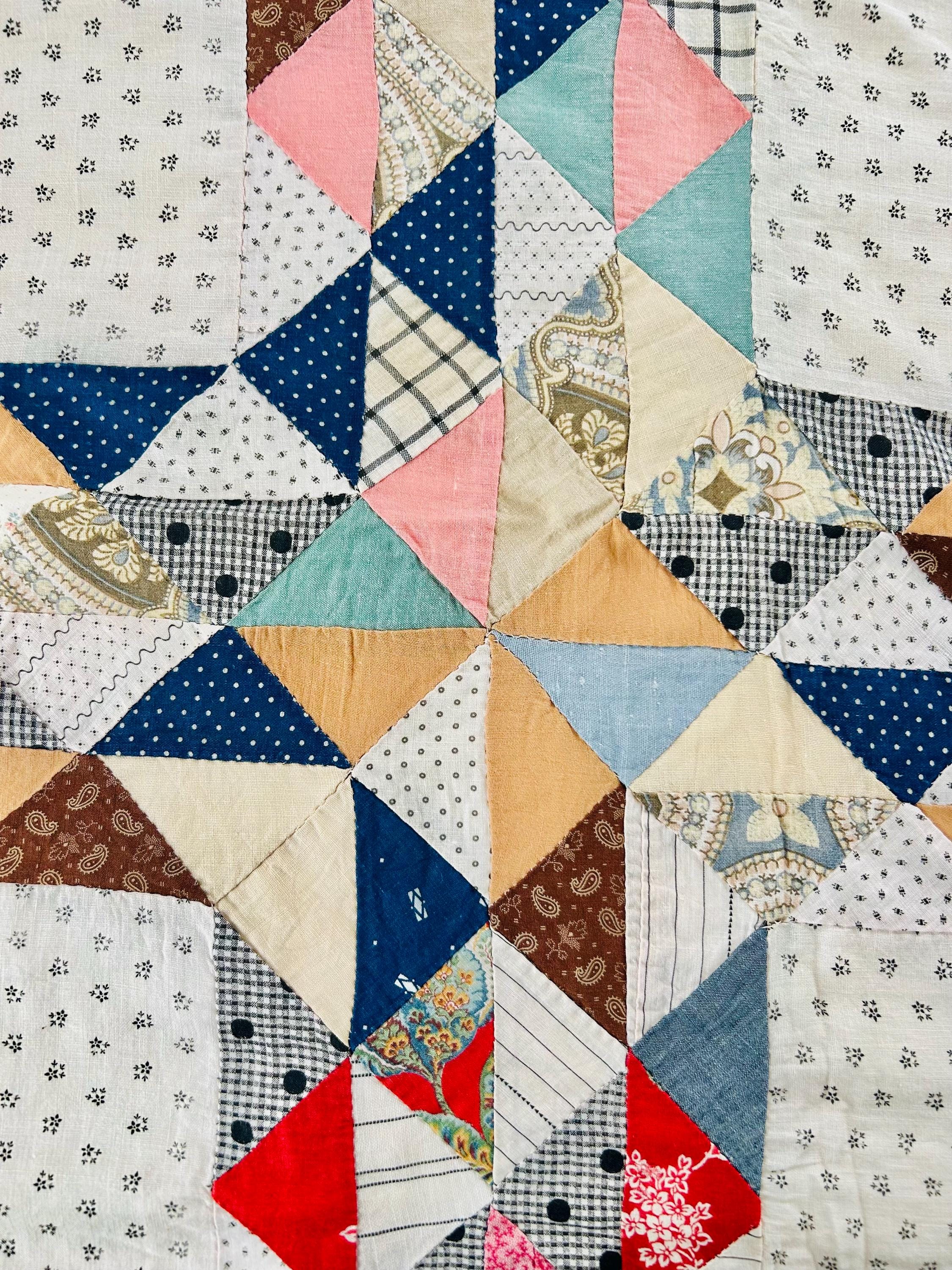 The quilt top uses a wide variety of beautiful prints: • Light shirting grounds with small black geometric prints typical of the 1880–1910 period • A rich mix of indigo blues, cadet blues, and double blues • Turkey reds and early chrome pinks, now softly mellowed • Cheddar and butterscotch yellows • Classic mourning-style black and white prints • Small plaids, stripes, and dotted prints consistent with turn-of-the-century shirtings • Occasional earlier-looking scraps suggest thoughtful use of available fabrics
