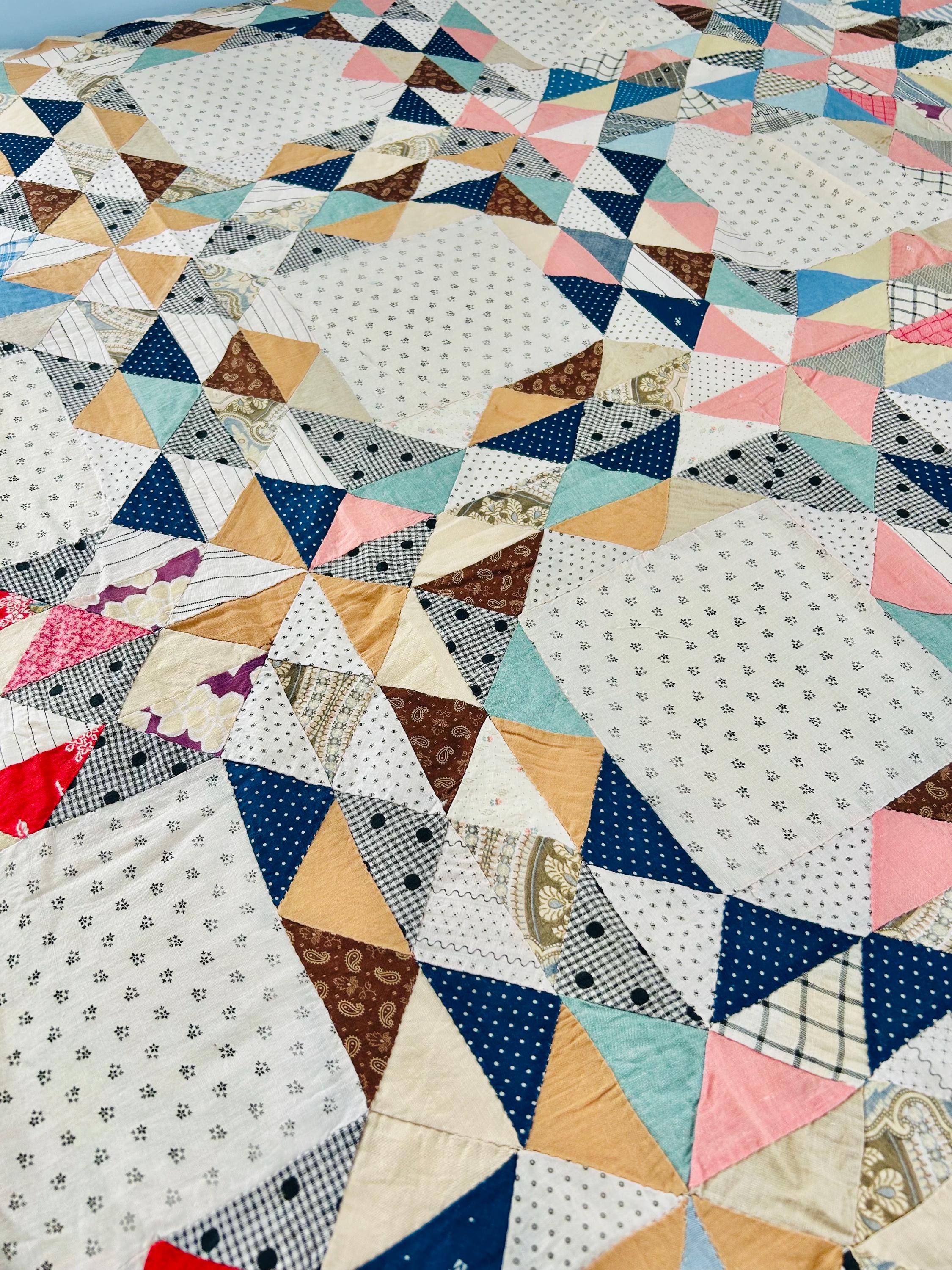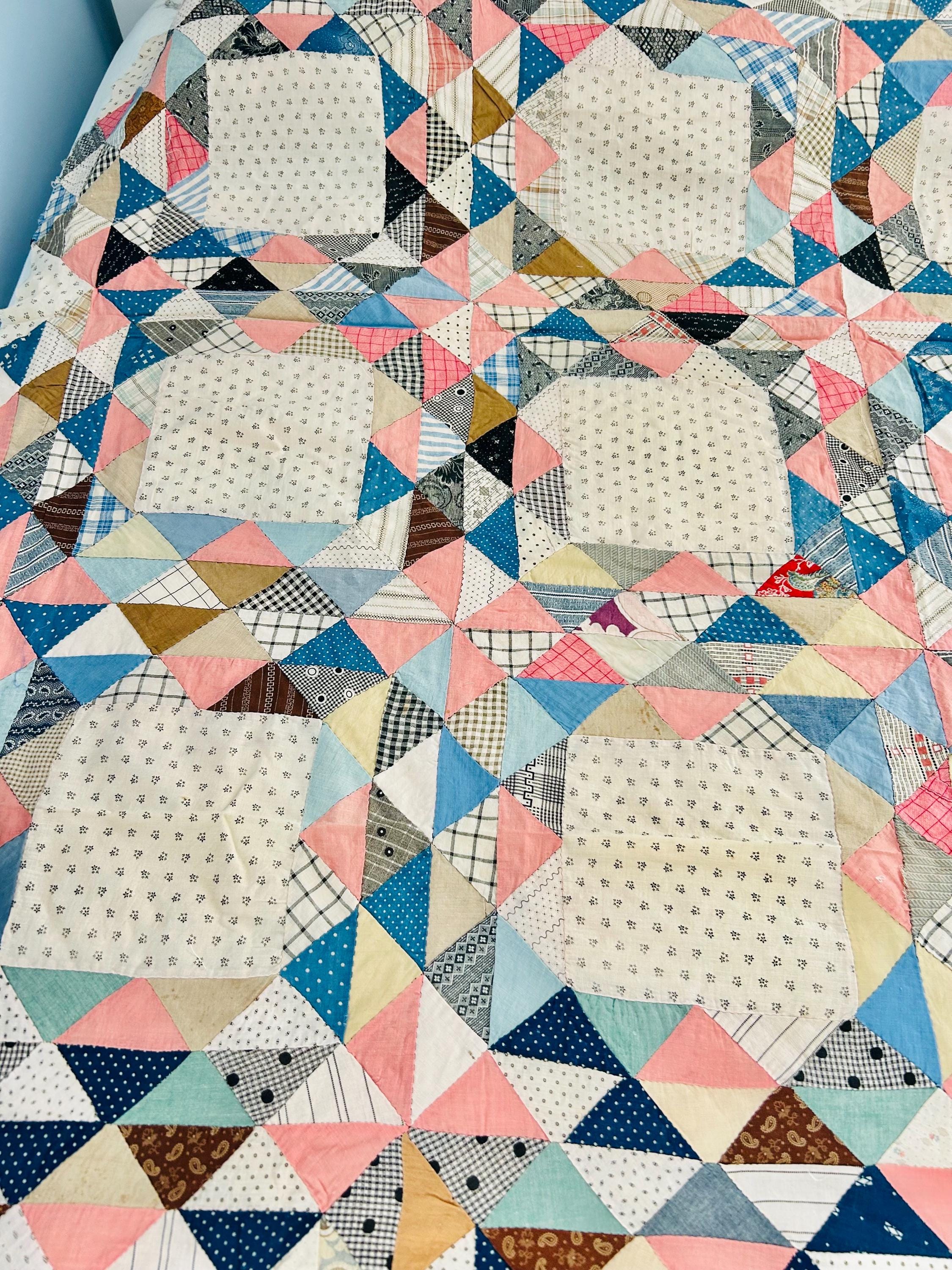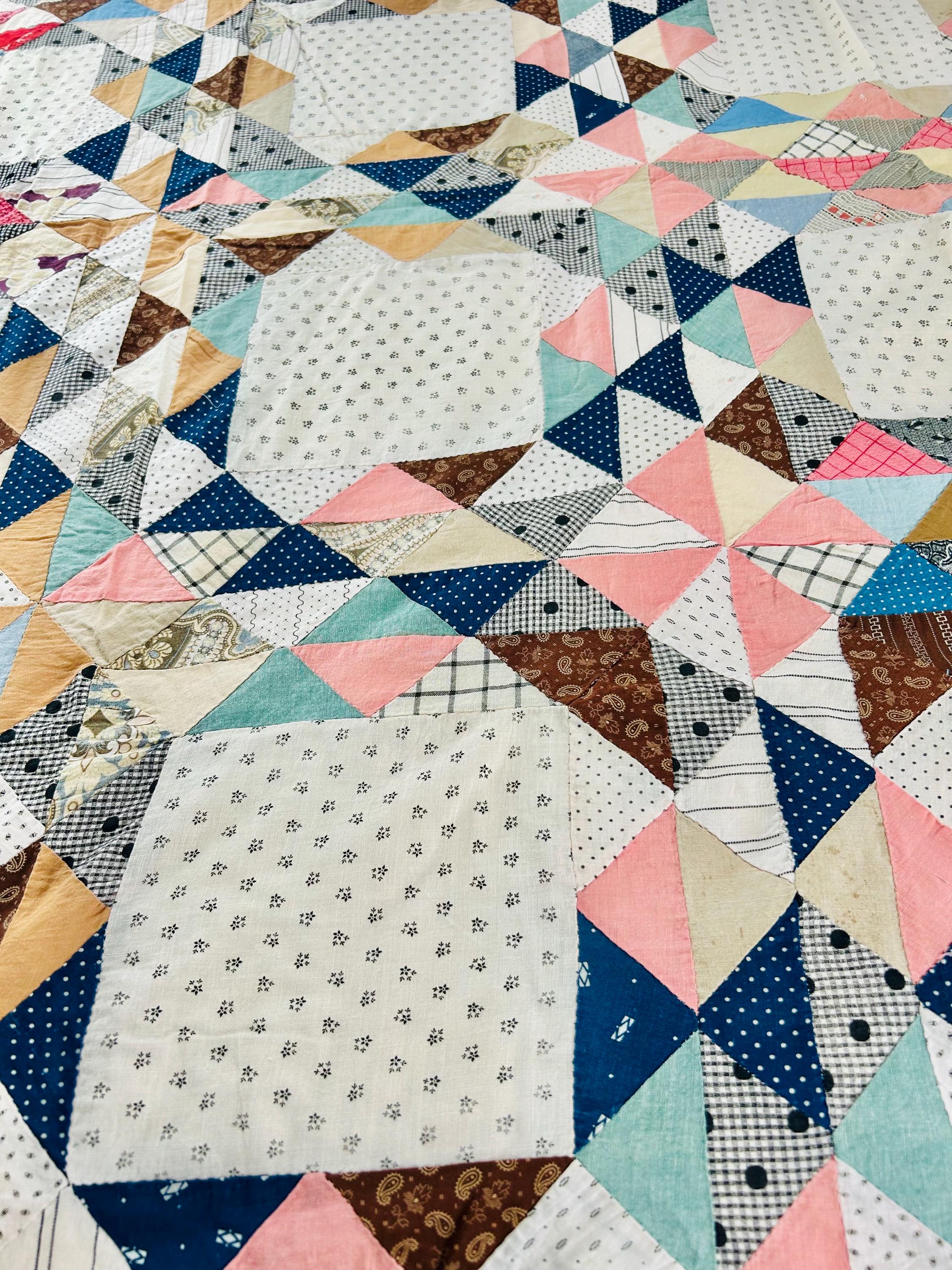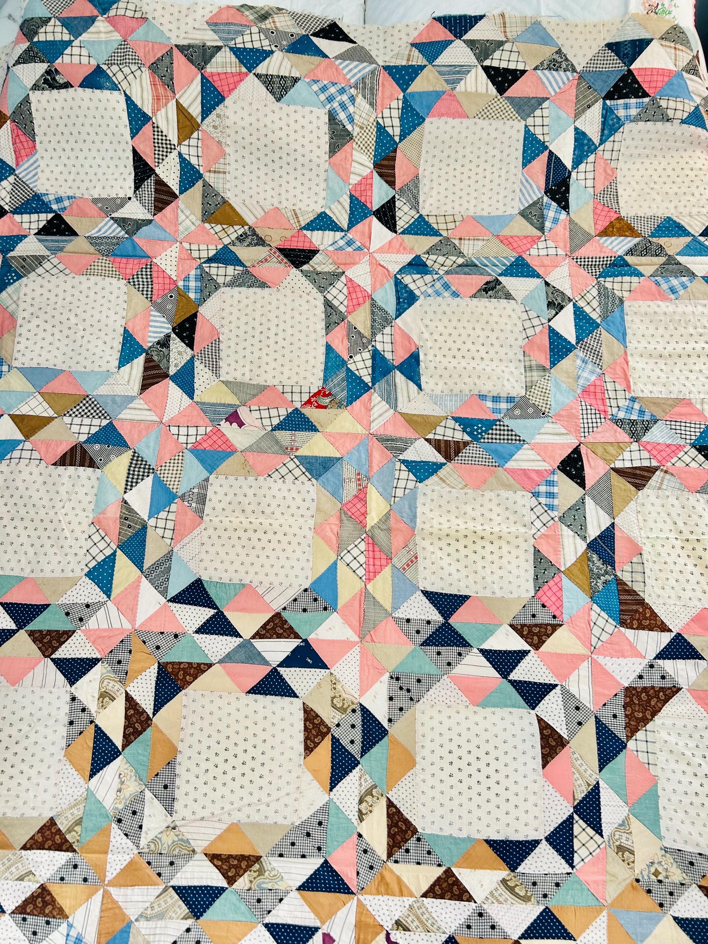The quilt top uses a wide variety of beautiful prints: • Light shirting grounds with small black geometric prints typical of the 1880–1910 period • A rich mix of indigo blues, cadet blues, and double blues • Turkey reds and early chrome pinks, now softly mellowed • Cheddar and butterscotch yellows • Classic mourning-style black and white prints • Small plaids, stripes, and dotted prints consistent with turn-of-the-century shirtings • Occasional earlier-looking scraps suggest thoughtful use of available fabrics