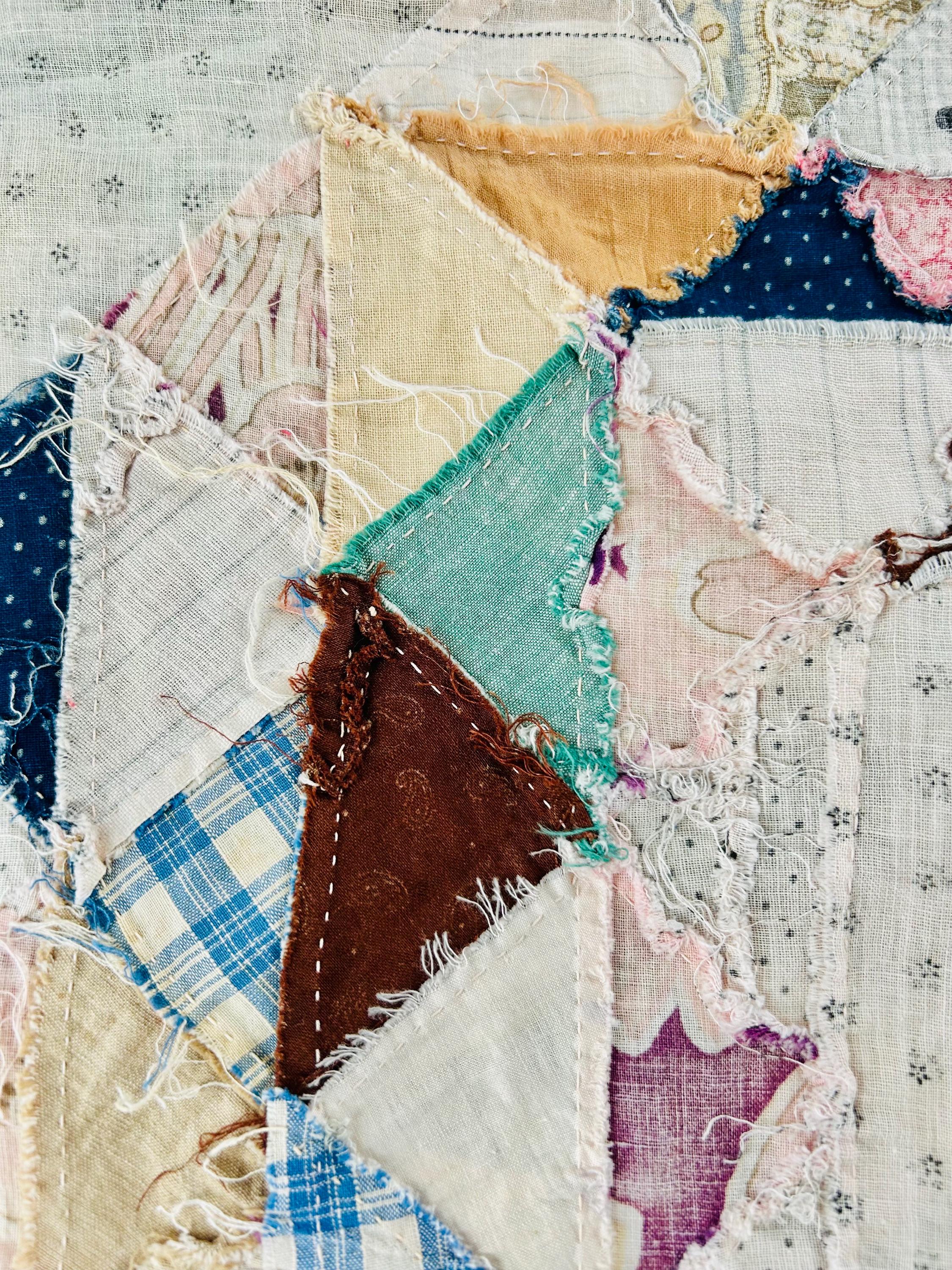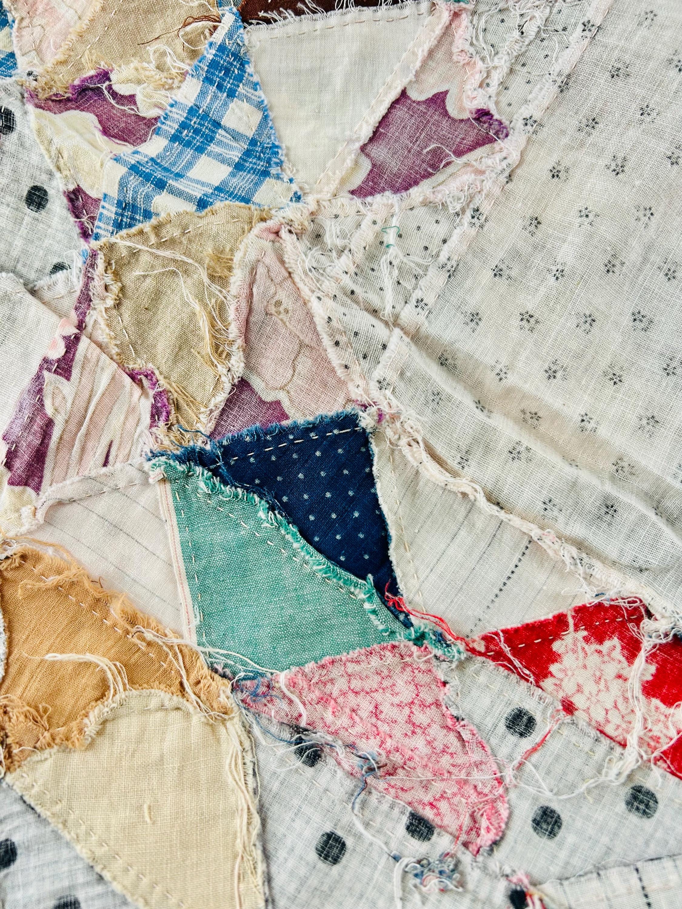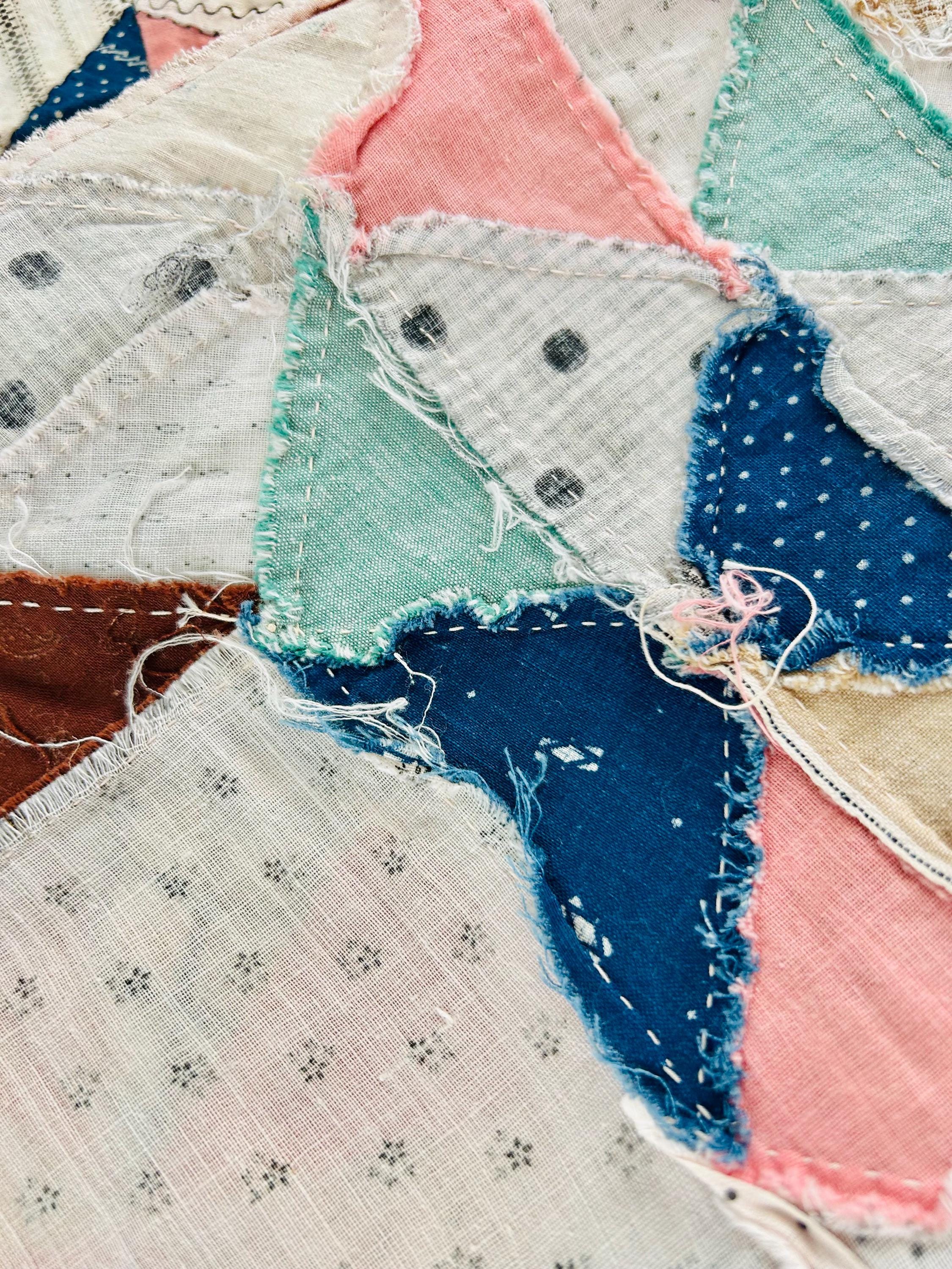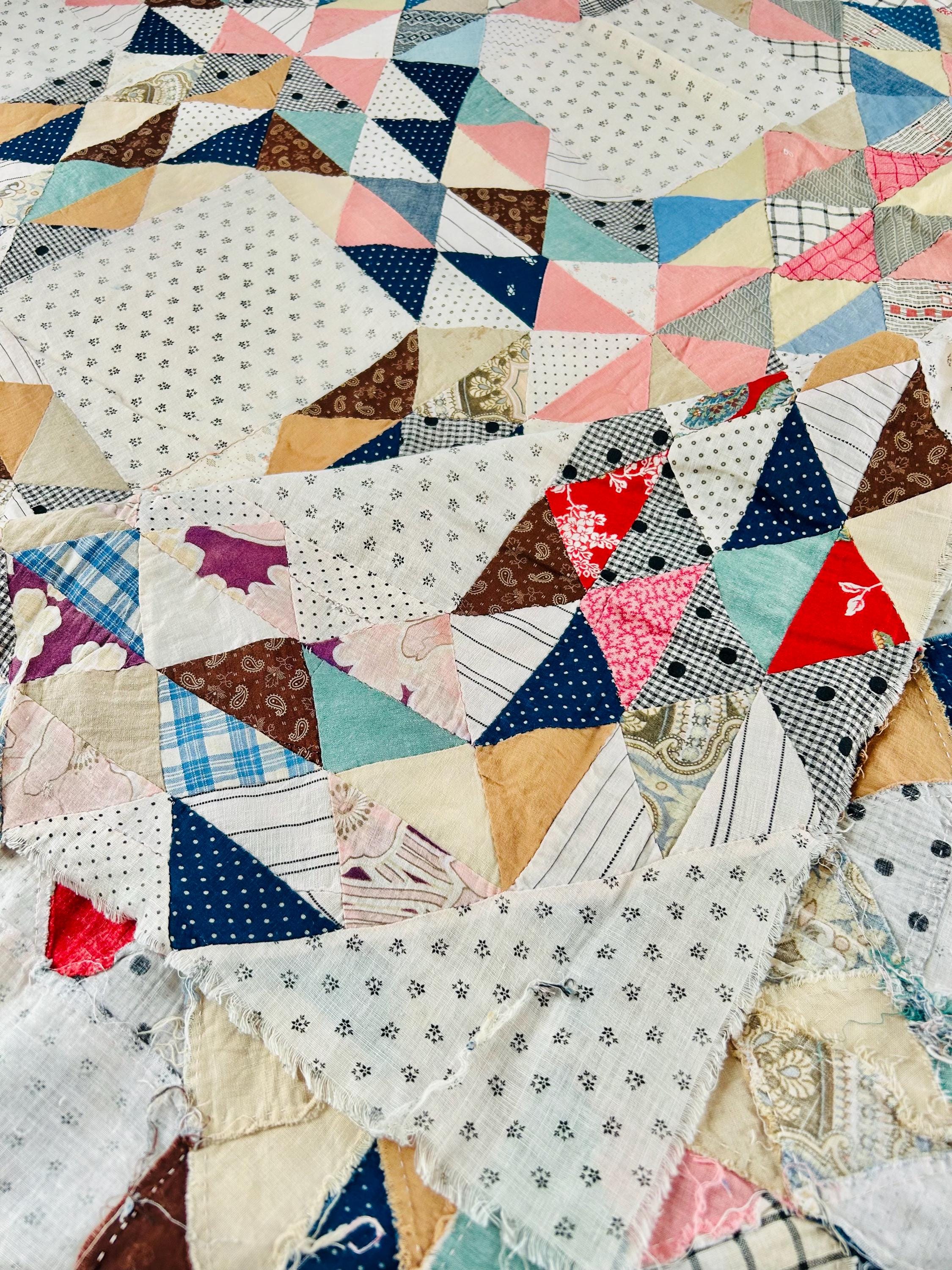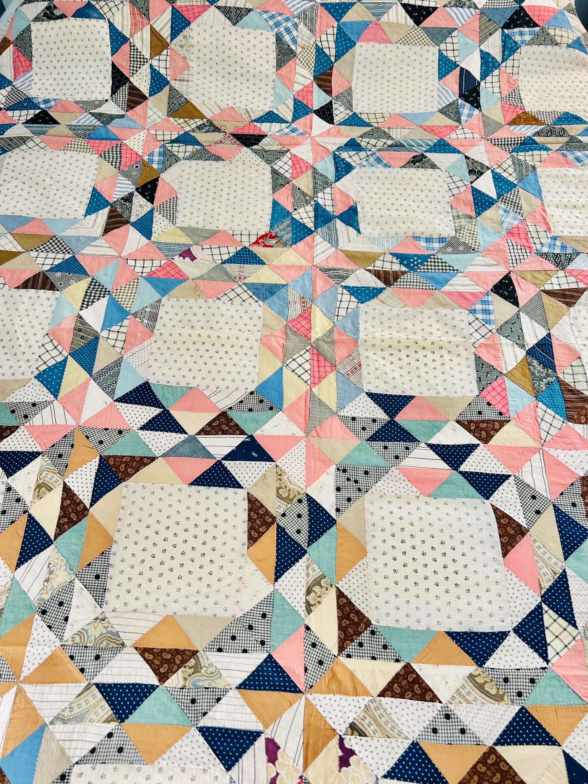 The quilt top uses a wide variety of beautiful prints: • Light shirting grounds with small black geometric prints typical of the 1880–1910 period • A rich mix of indigo blues, cadet blues, and double blues • Turkey reds and early chrome pinks, now softly mellowed • Cheddar and butterscotch yellows • Classic mourning-style black and white prints • Small plaids, stripes, and dotted prints consistent with turn-of-the-century shirtings • Occasional earlier-looking scraps suggest thoughtful use of available fabrics