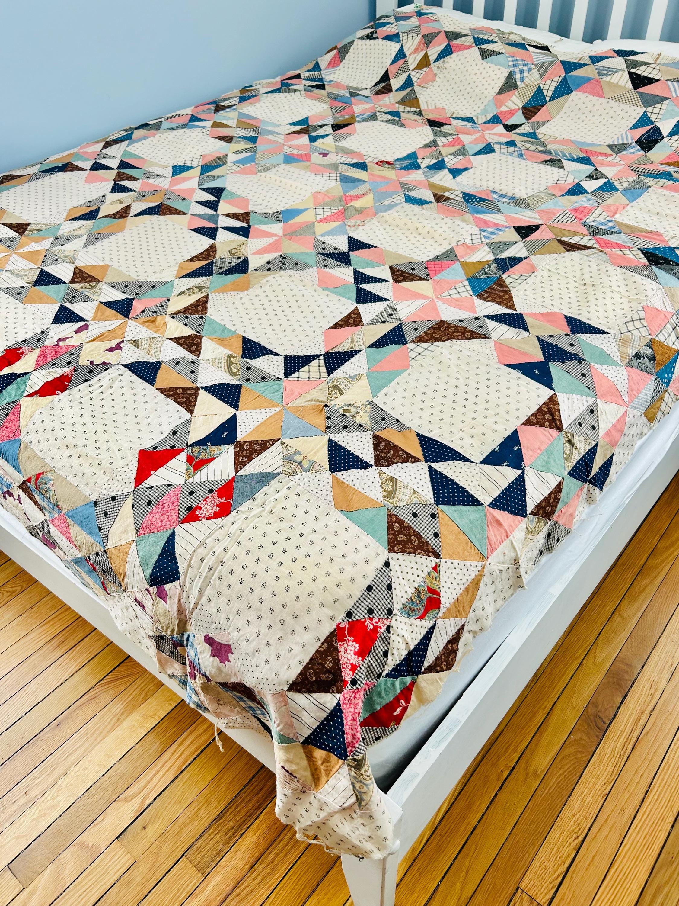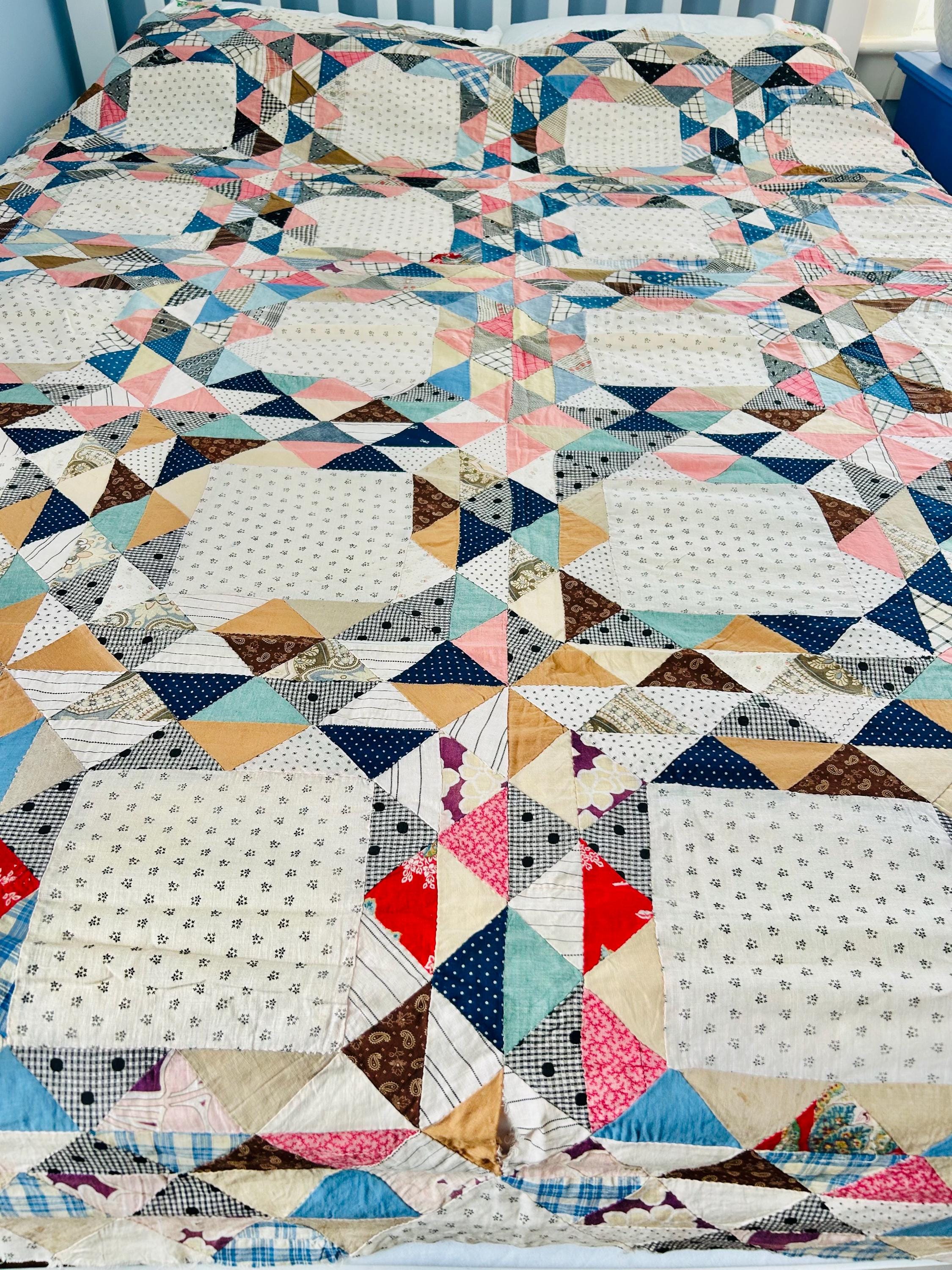 The palette and print scale firmly place this quilt in the circa 1890–1910 era, with strong representation of 1890s–1900s shirting and dress fabrics.