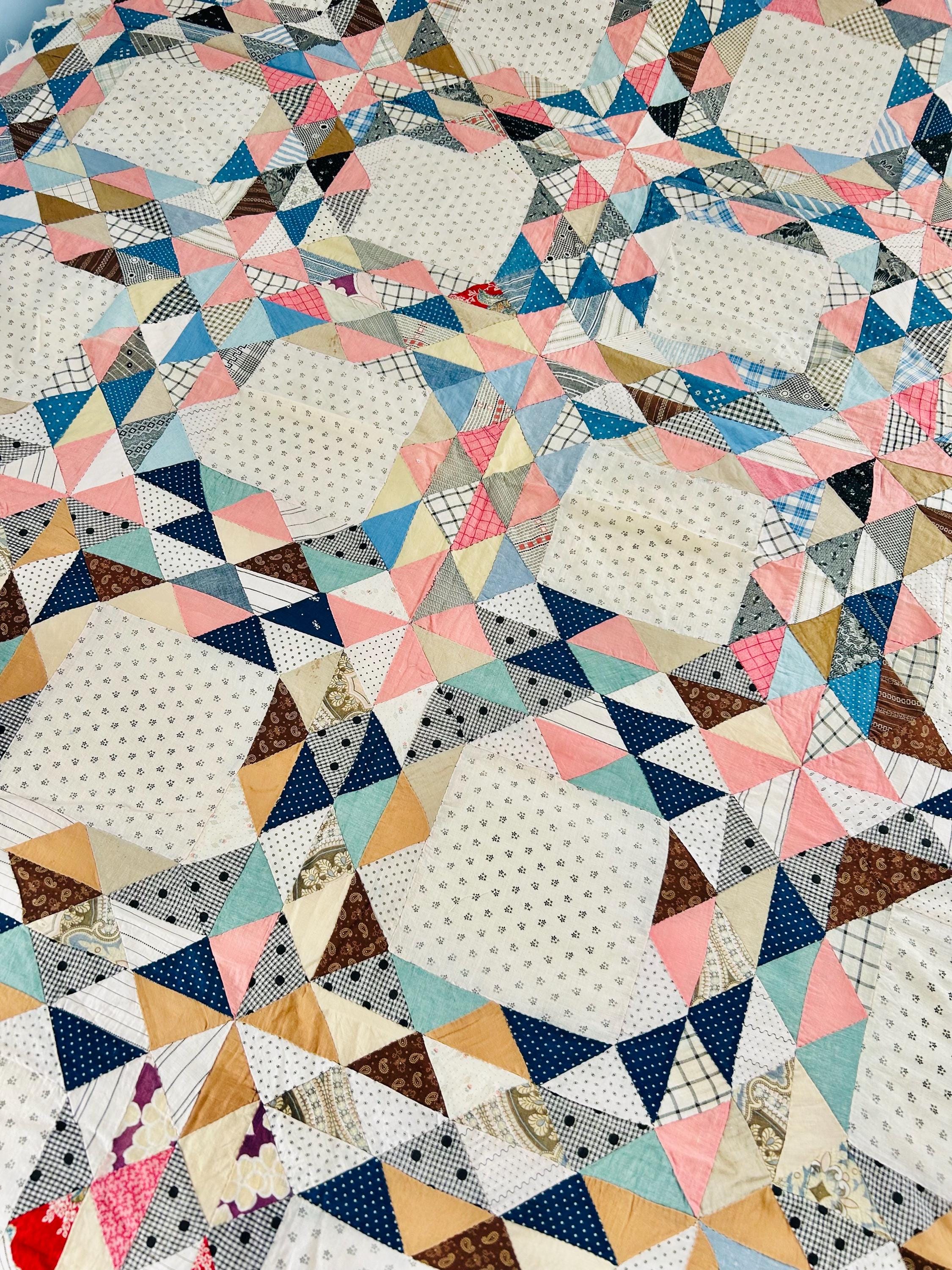 Details • Entirely hand pieced • Extremely fine, small-scale triangular patchwork • Classic Ocean Waves pattern, known for its complexity and visual movement • Quilt top only (no batting or backing) • Approximately 65” x 80”