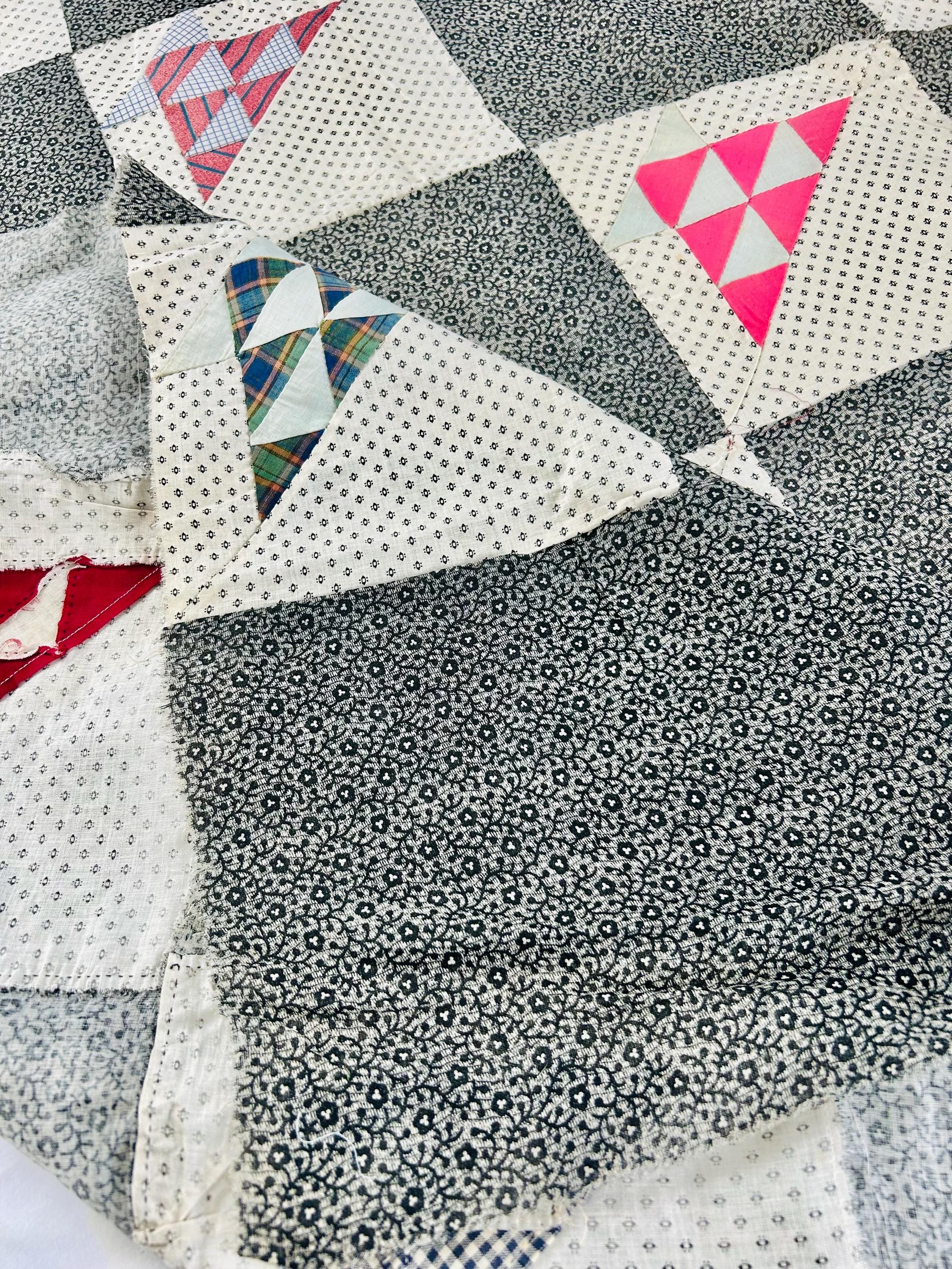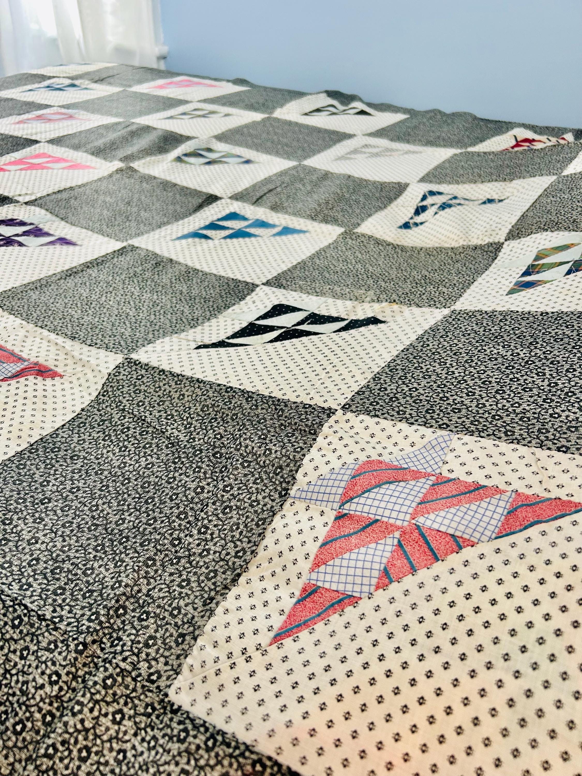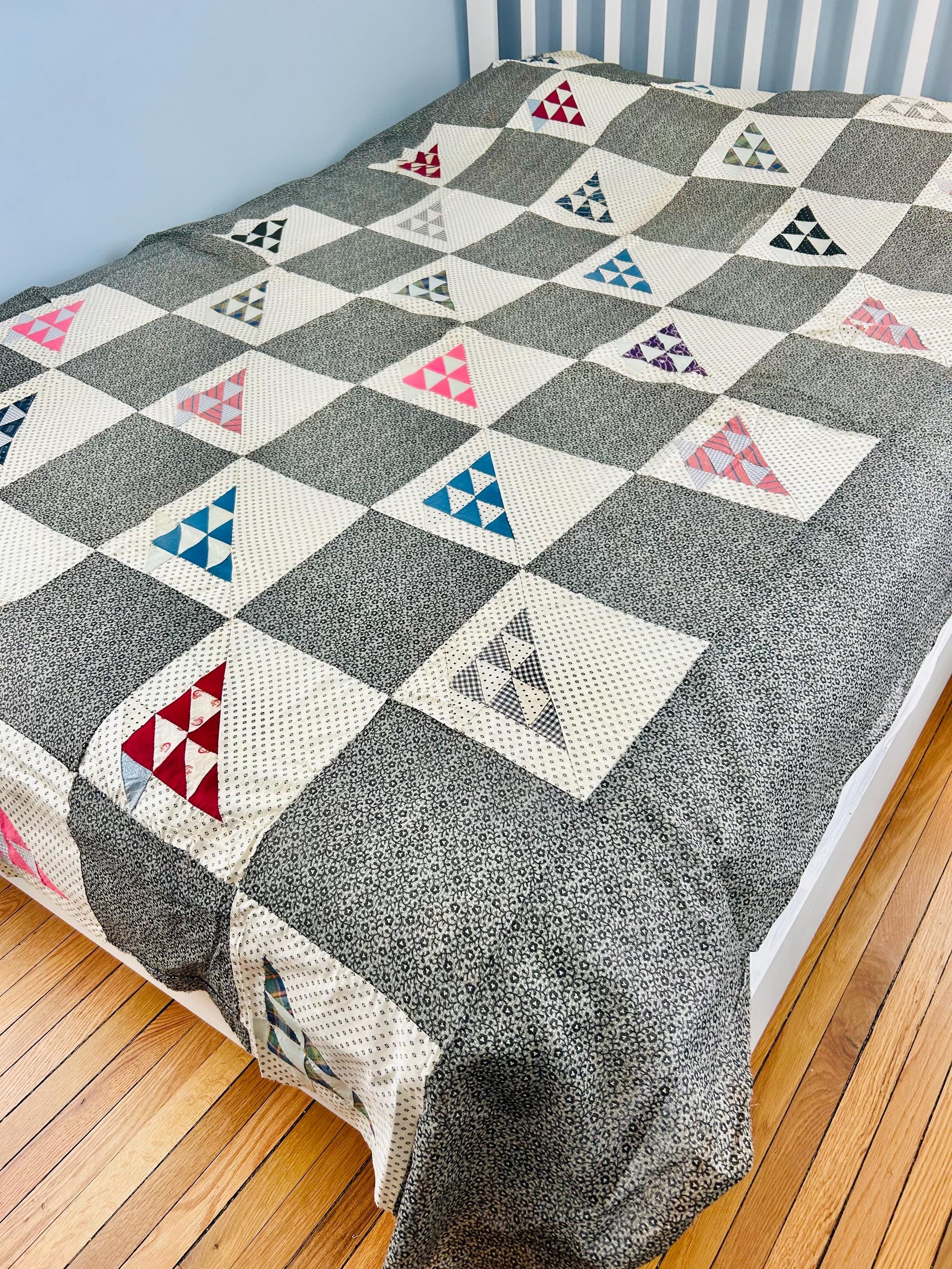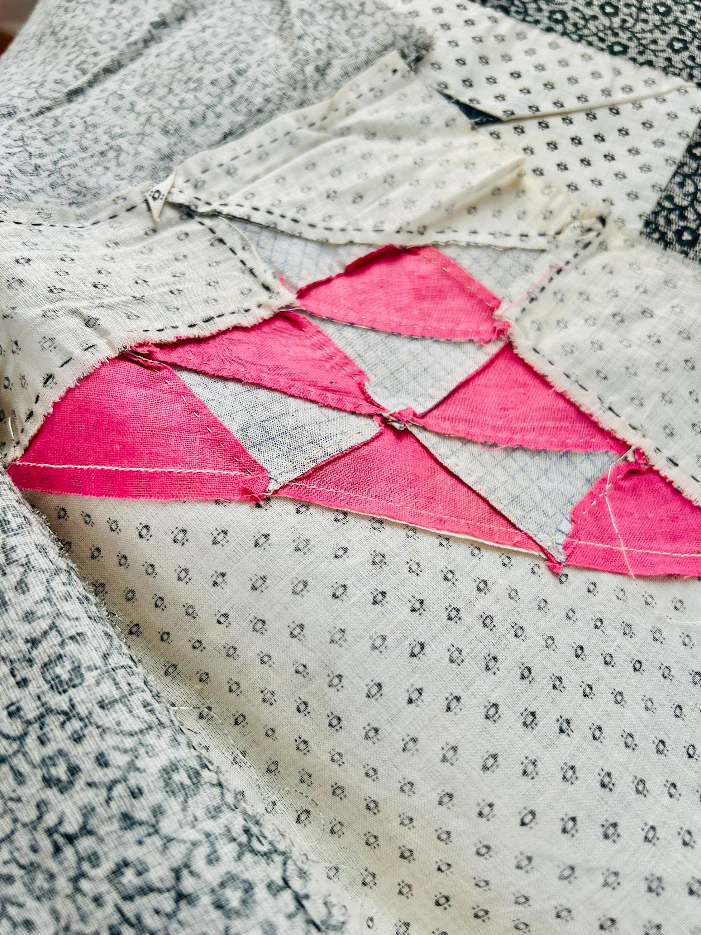 ✂️ Details • Pattern: Basket (pieced triangle baskets in alternating setting) • Date: Circa 1935–1945 (Depression-era) • Size: 70” x 88” • Construction: Hand pieced • Materials: Cotton (feedsack prints, shirtings, repurposed fabrics)