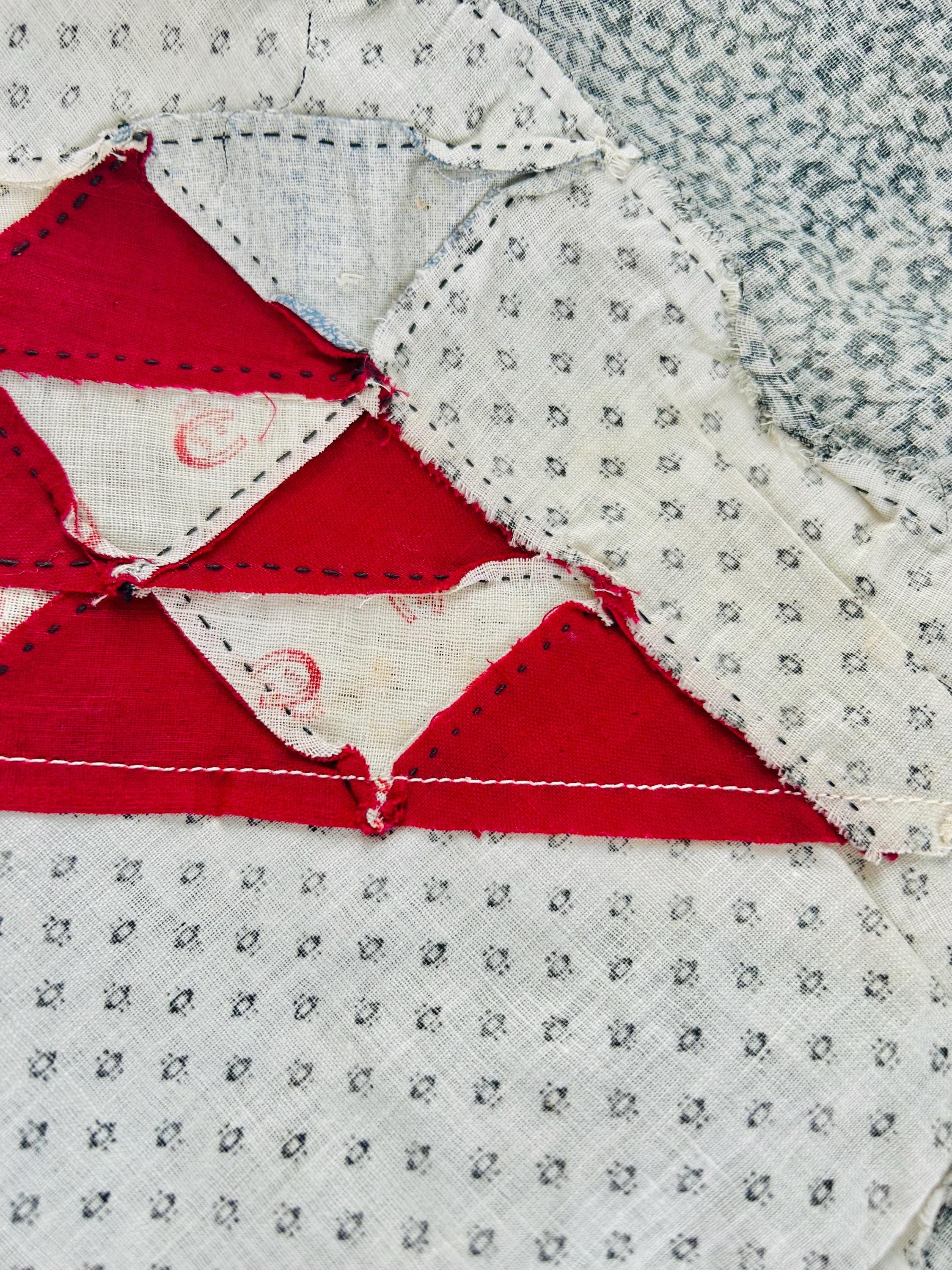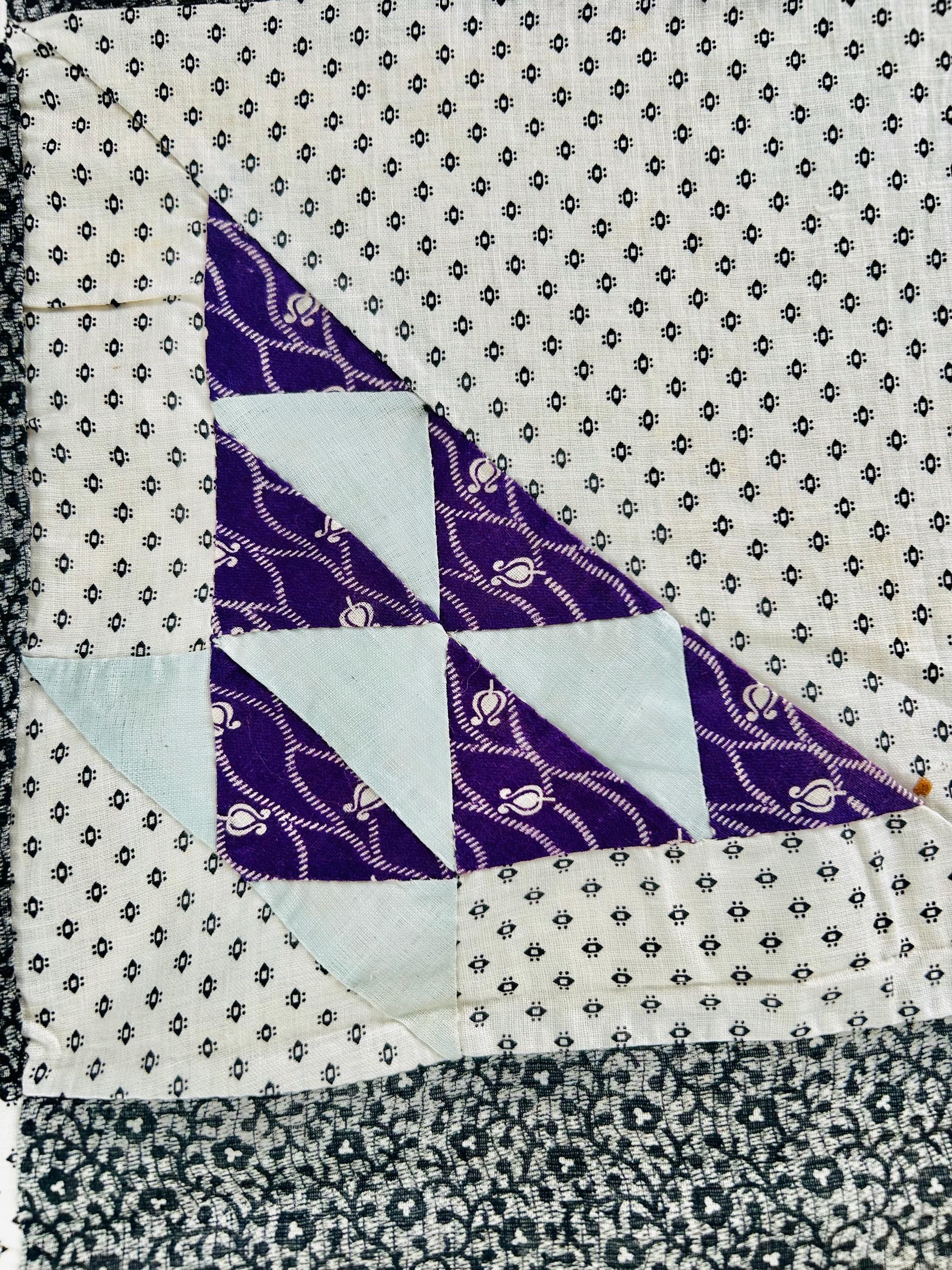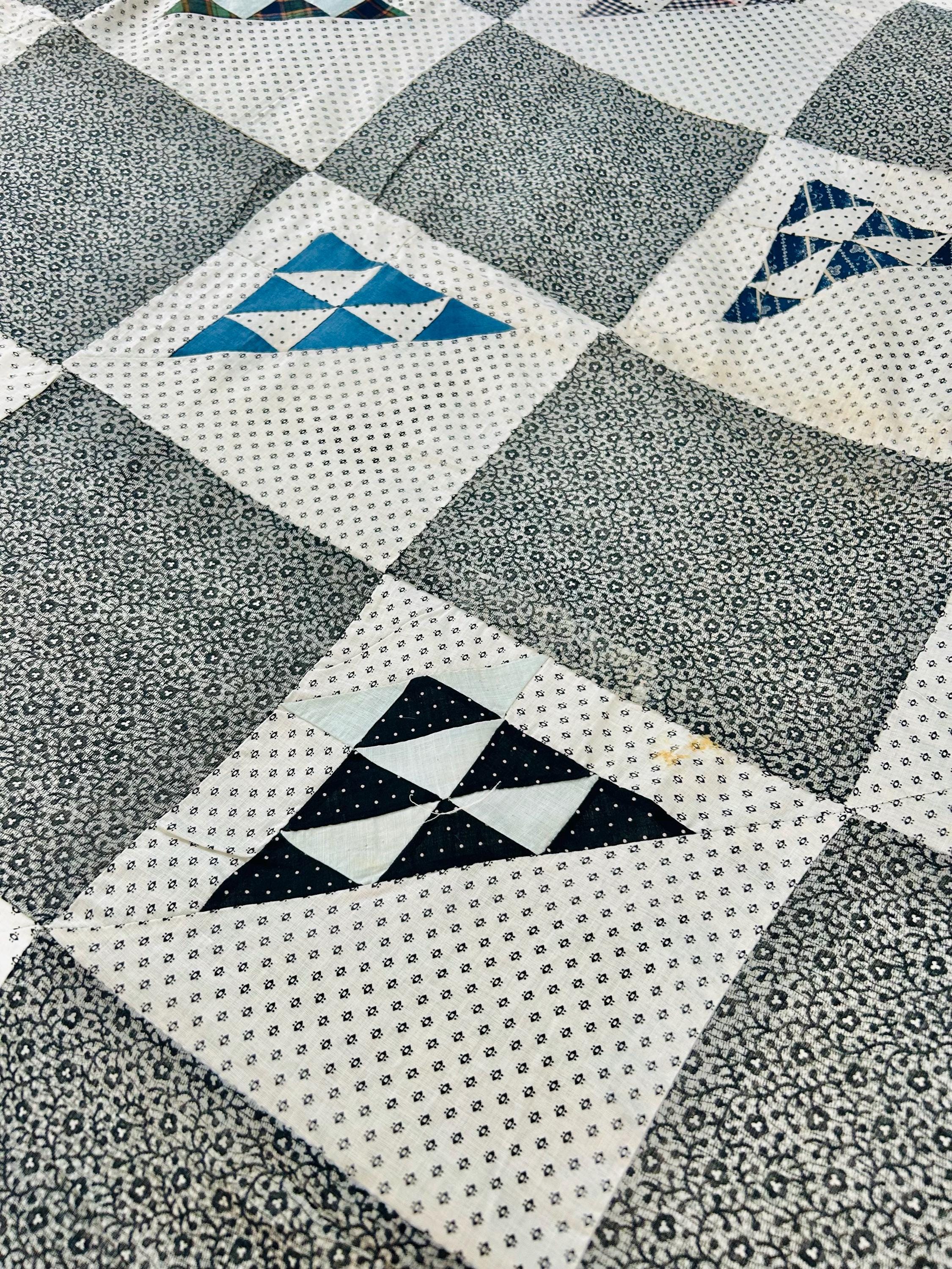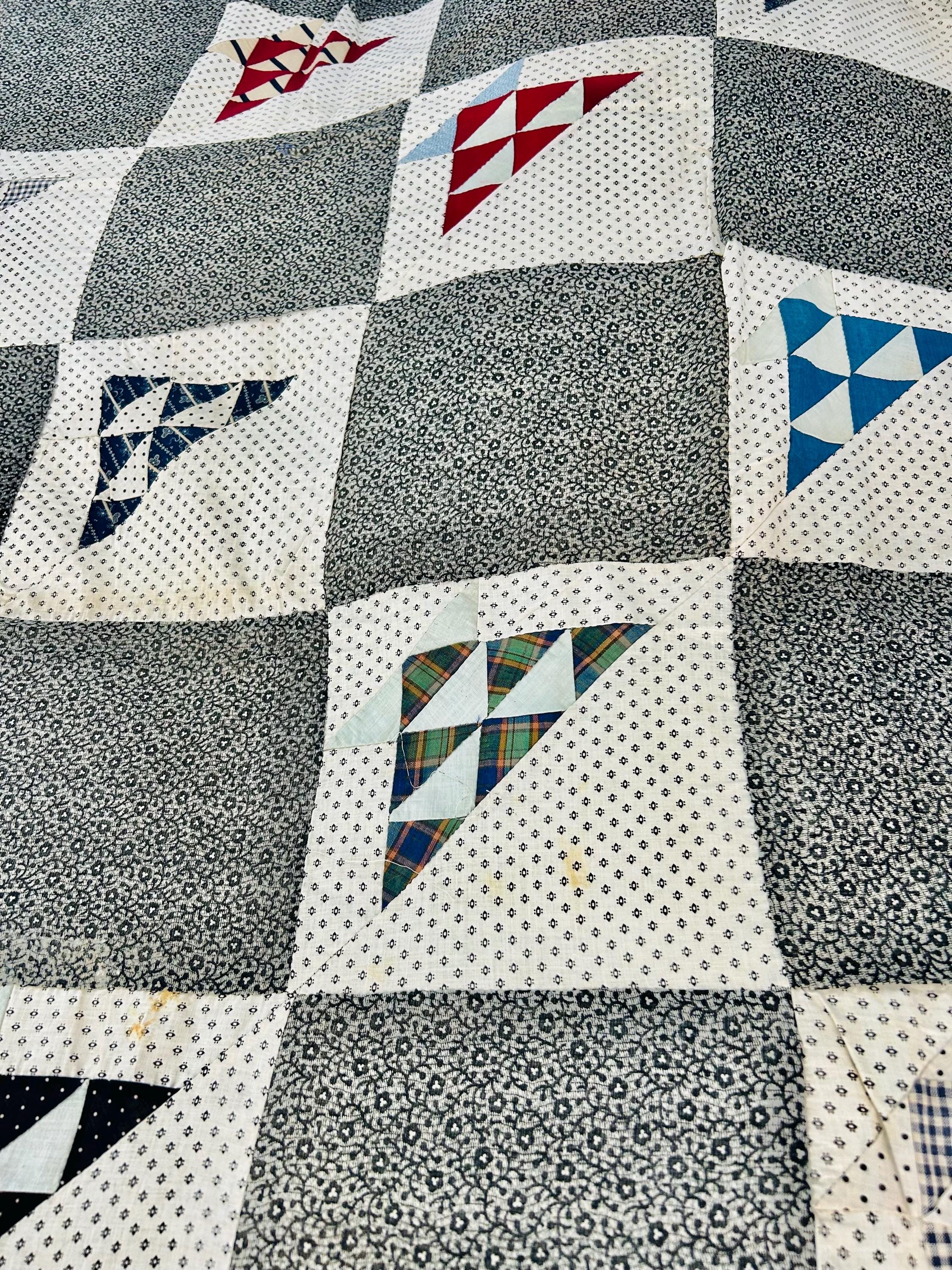 ✂️ Details • Pattern: Basket (pieced triangle baskets in alternating setting) • Date: Circa 1935–1945 (Depression-era) • Size: 70” x 88” • Construction: Hand pieced • Materials: Cotton (feedsack prints, shirtings, repurposed fabrics)