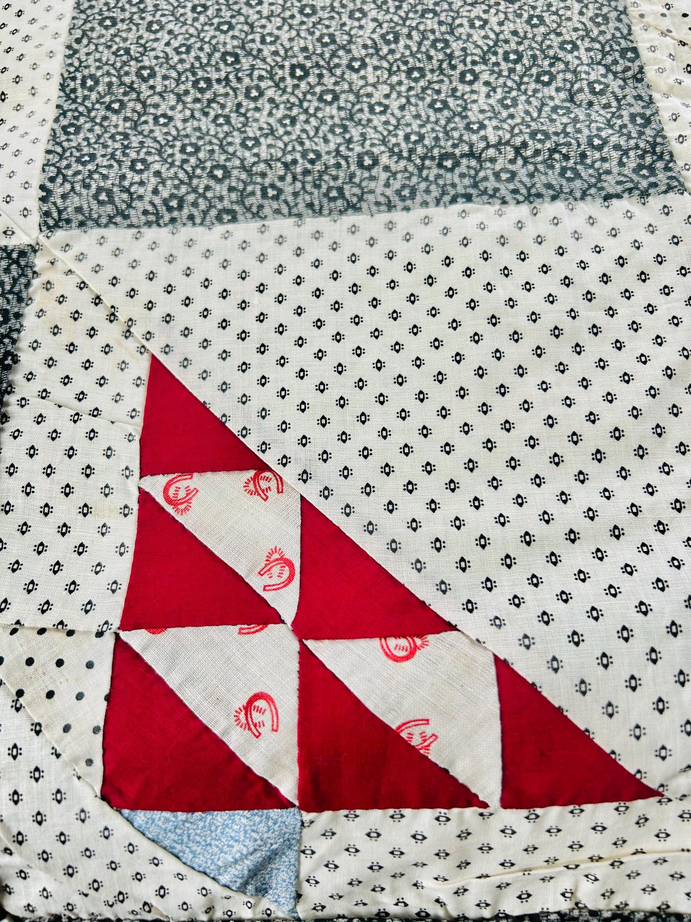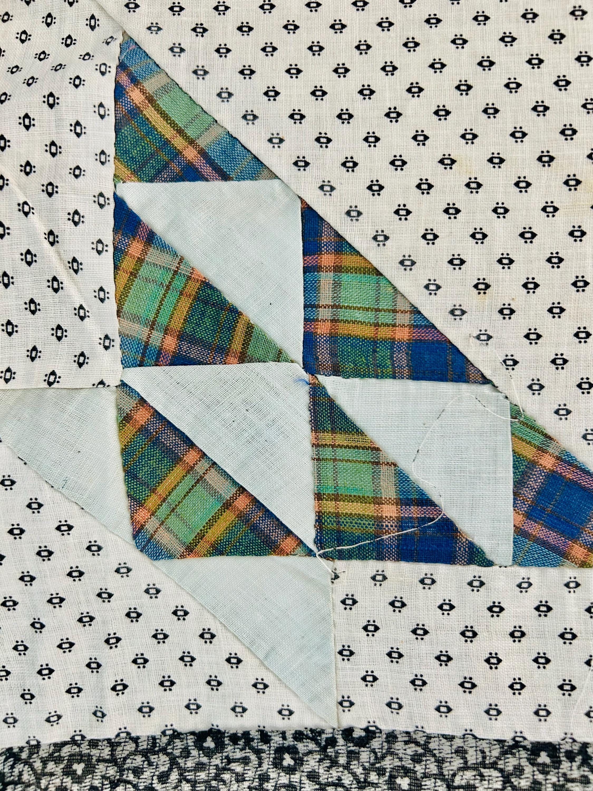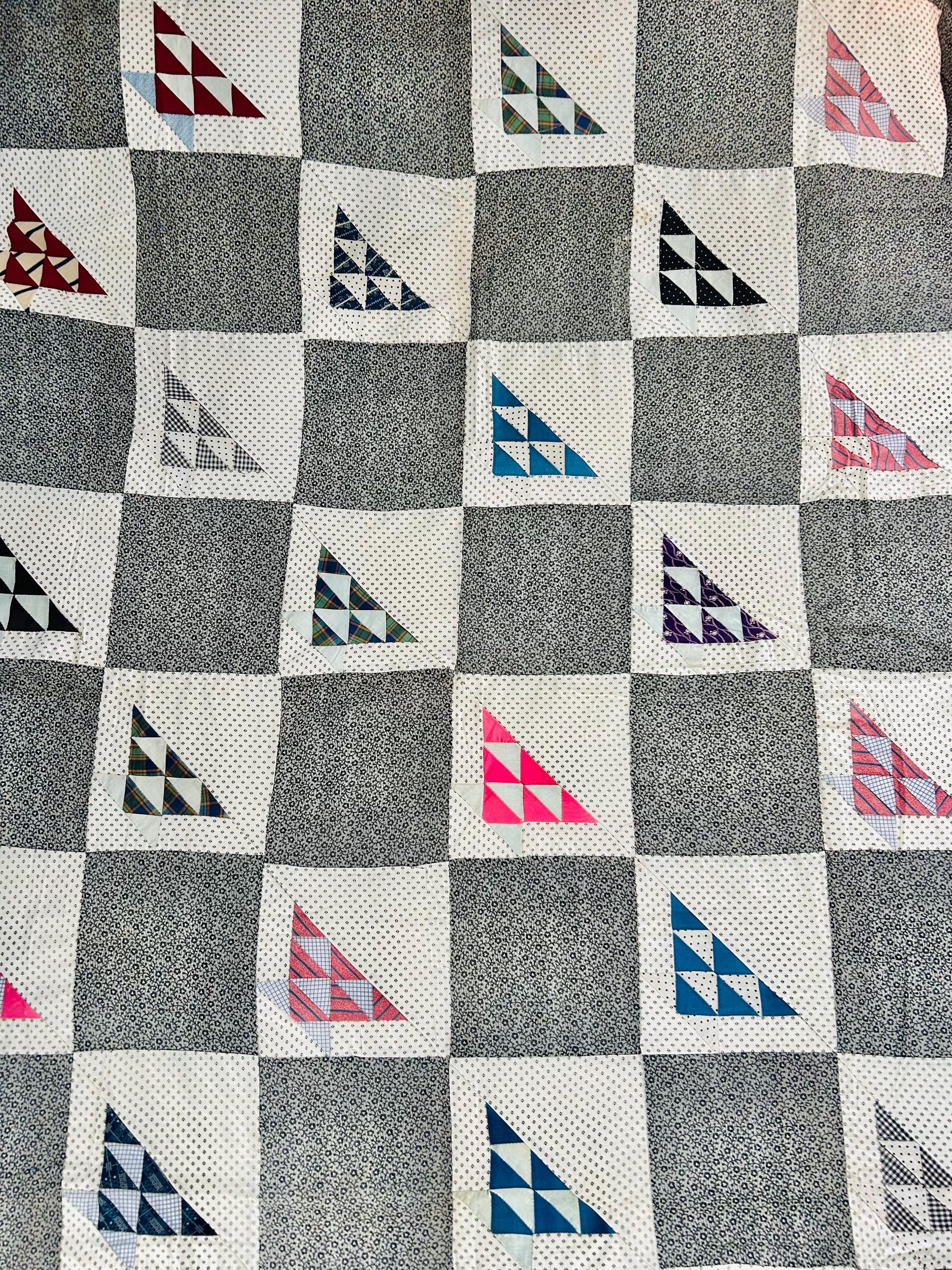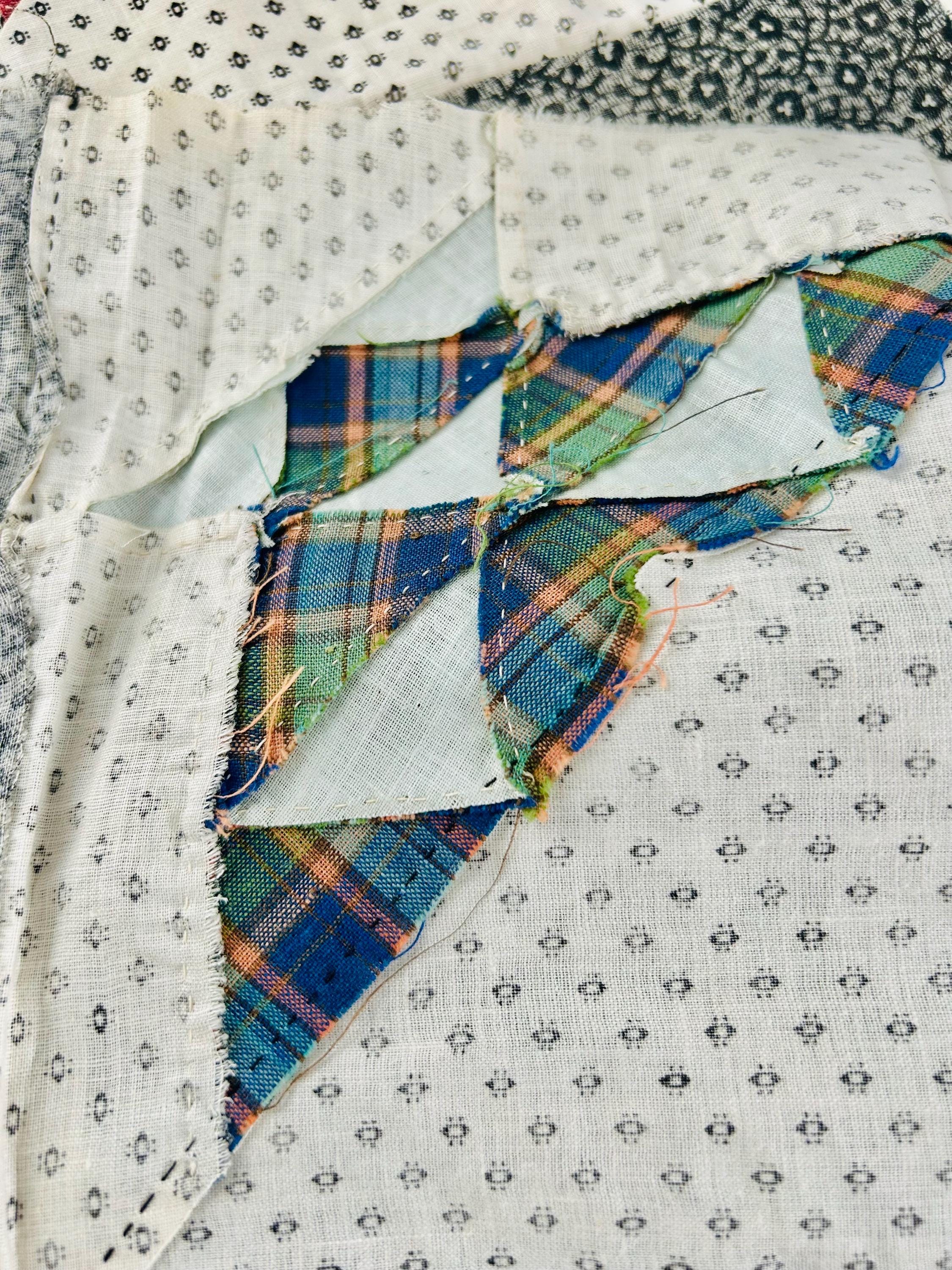 ✂️ Details • Pattern: Basket (pieced triangle baskets in alternating setting) • Date: Circa 1935–1945 (Depression-era) • Size: 70” x 88” • Construction: Hand pieced • Materials: Cotton (feedsack prints, shirtings, repurposed fabrics)