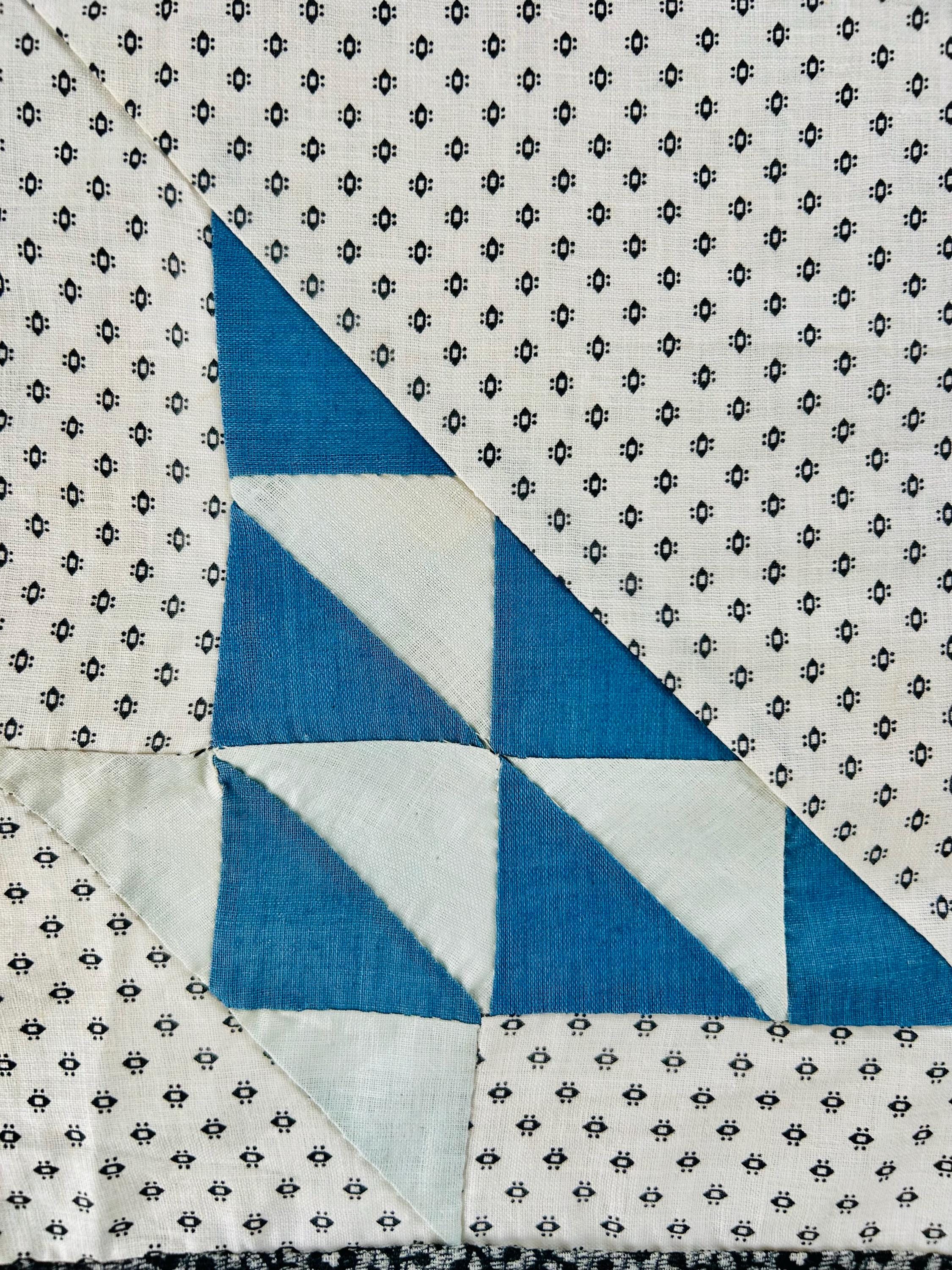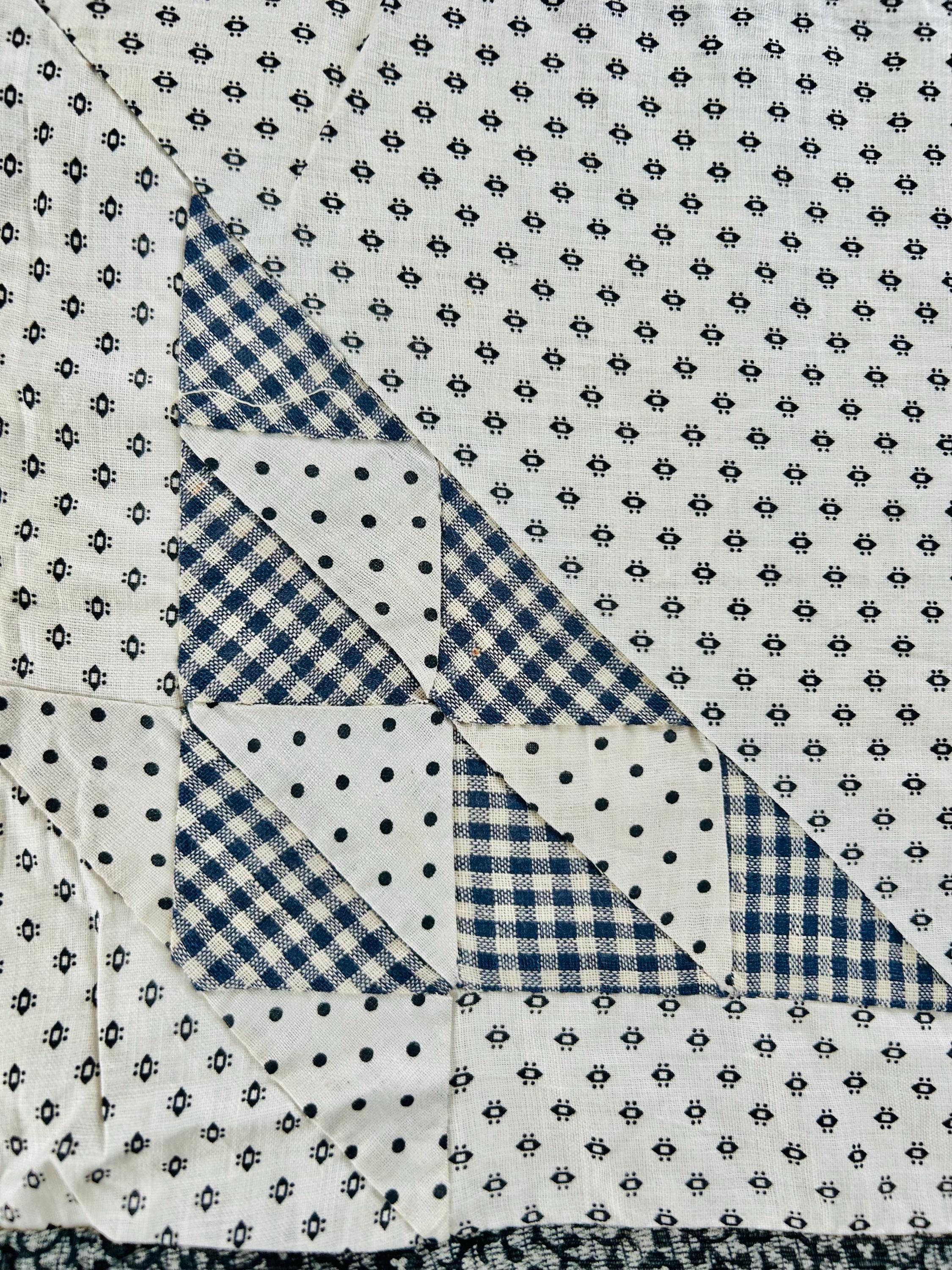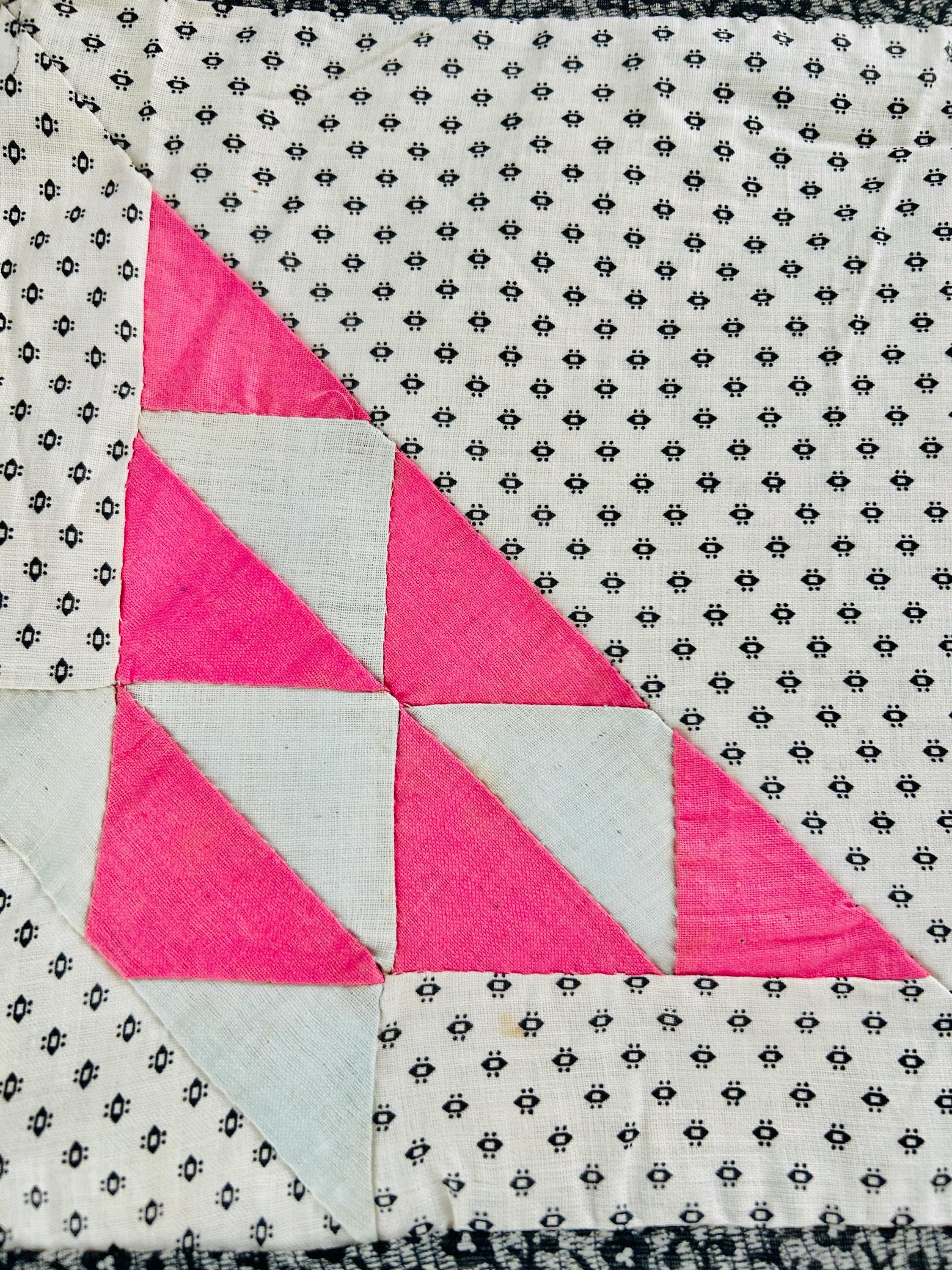 Set in a classic alternating block layout, each basket is formed from hand-pieced triangles of vivid feedsack pinks and blues along with indigo shirtings and plaid suiting scraps.