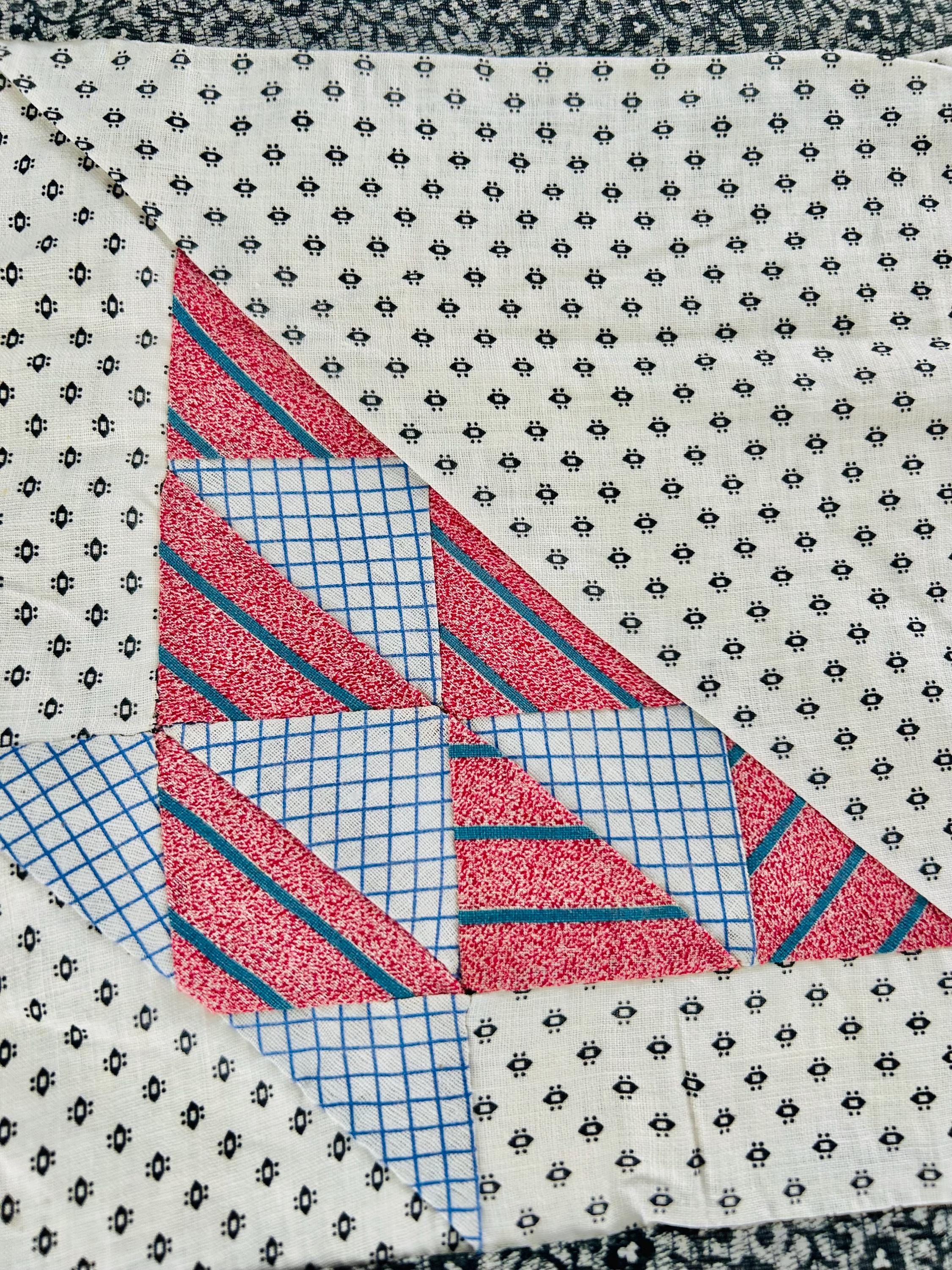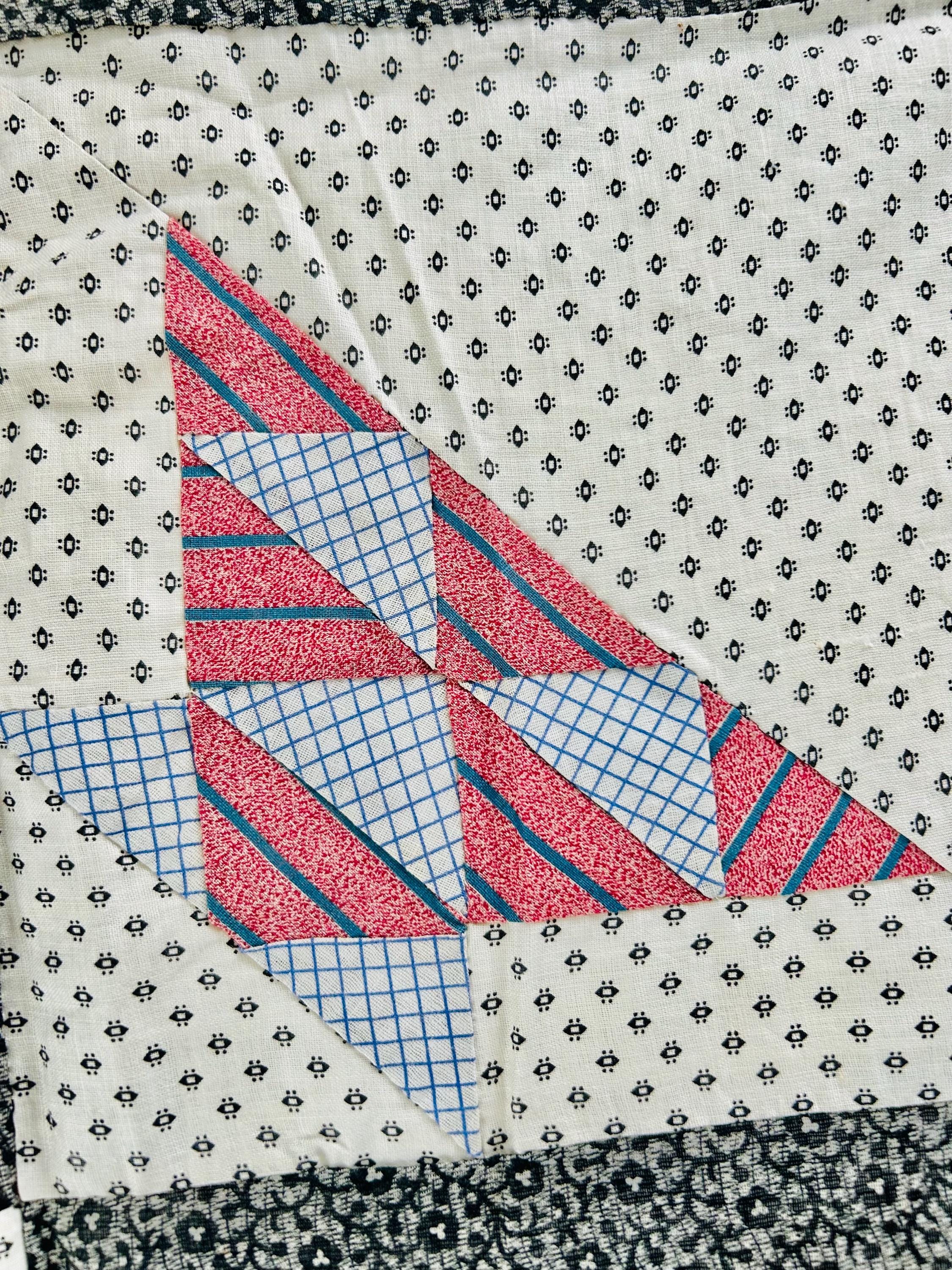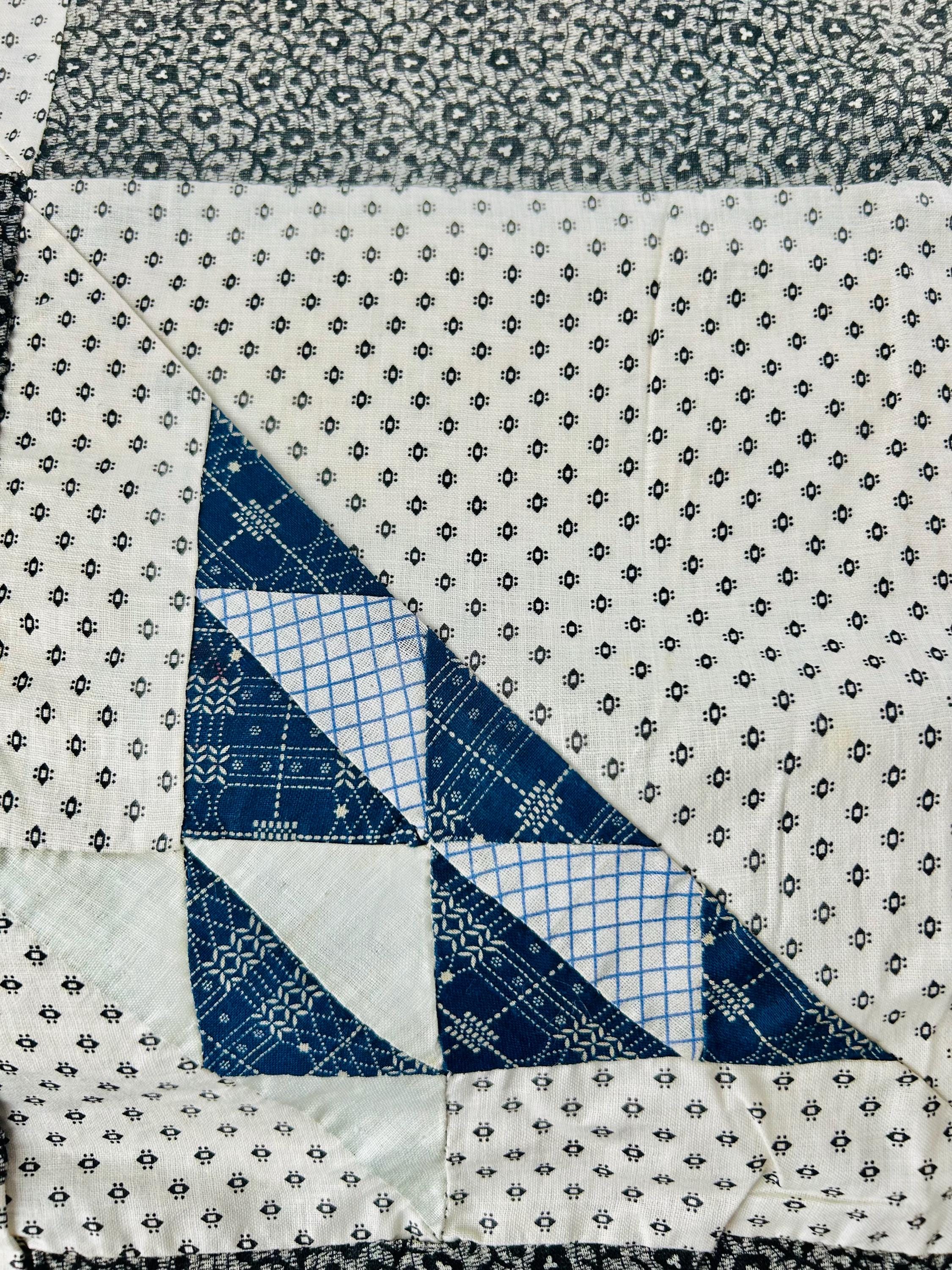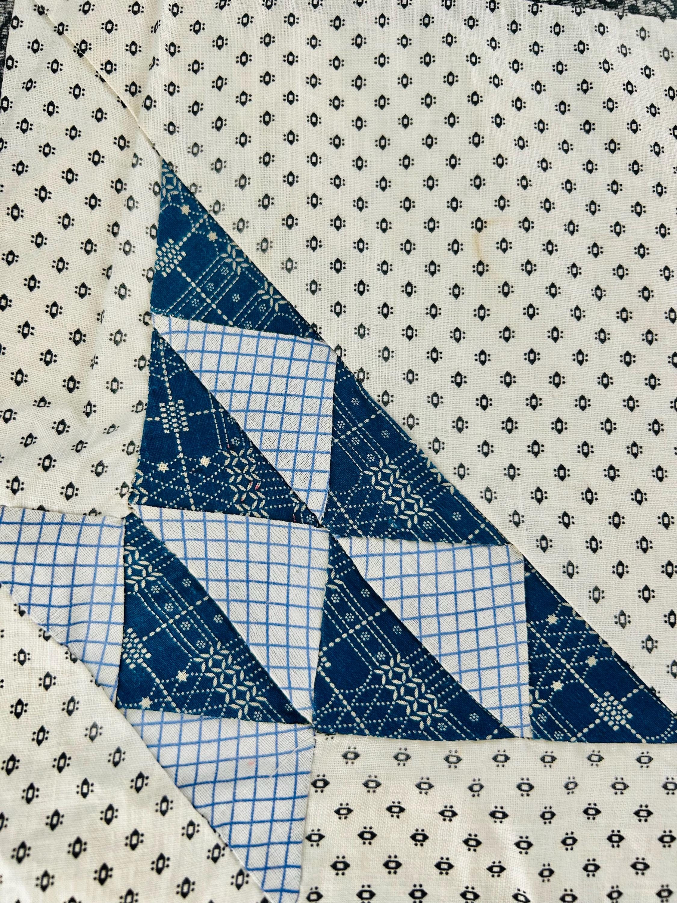 Set in a classic alternating block layout, each basket is formed from hand-pieced triangles of vivid feedsack pinks and blues along with indigo shirtings and plaid suiting scraps.