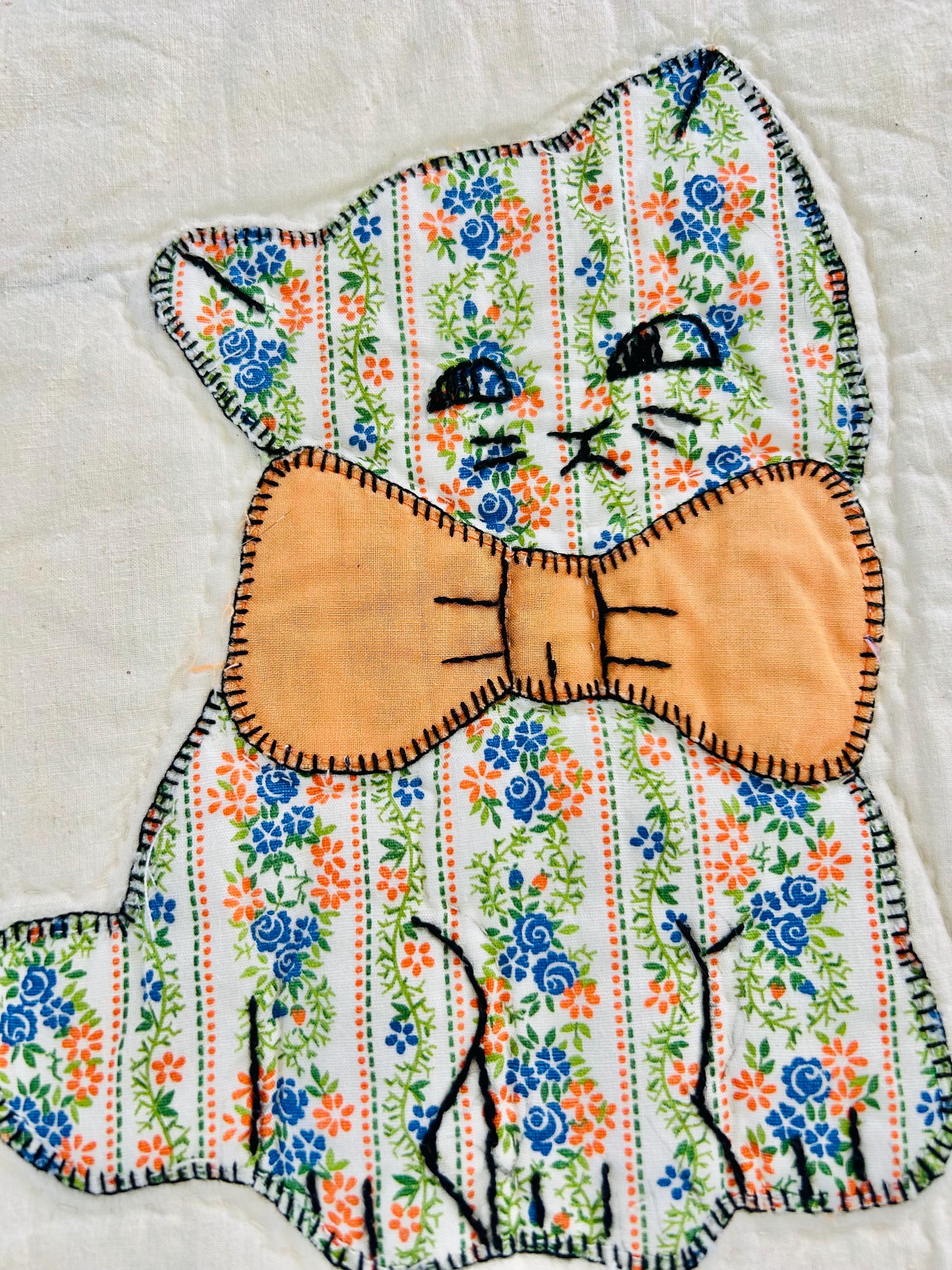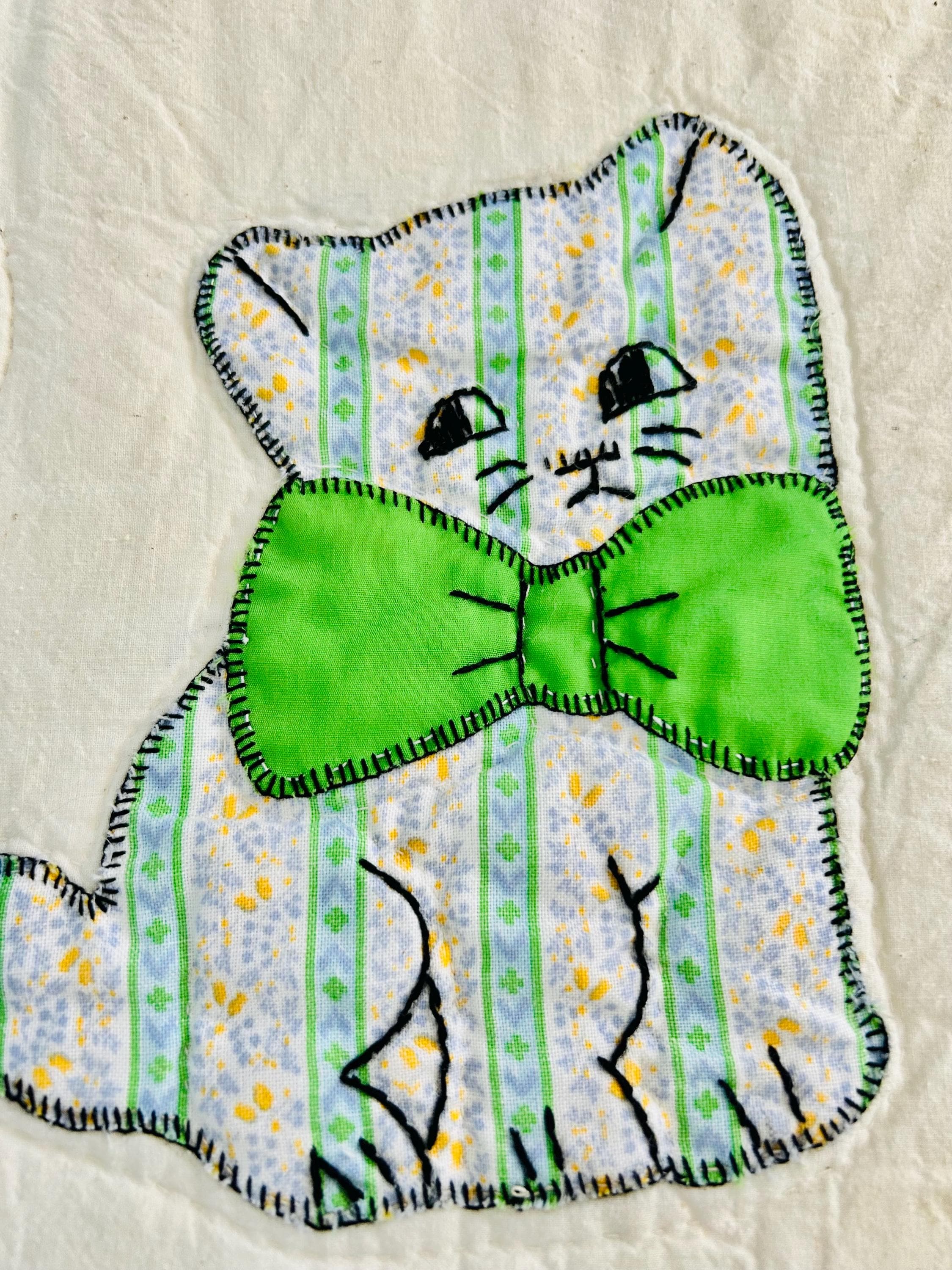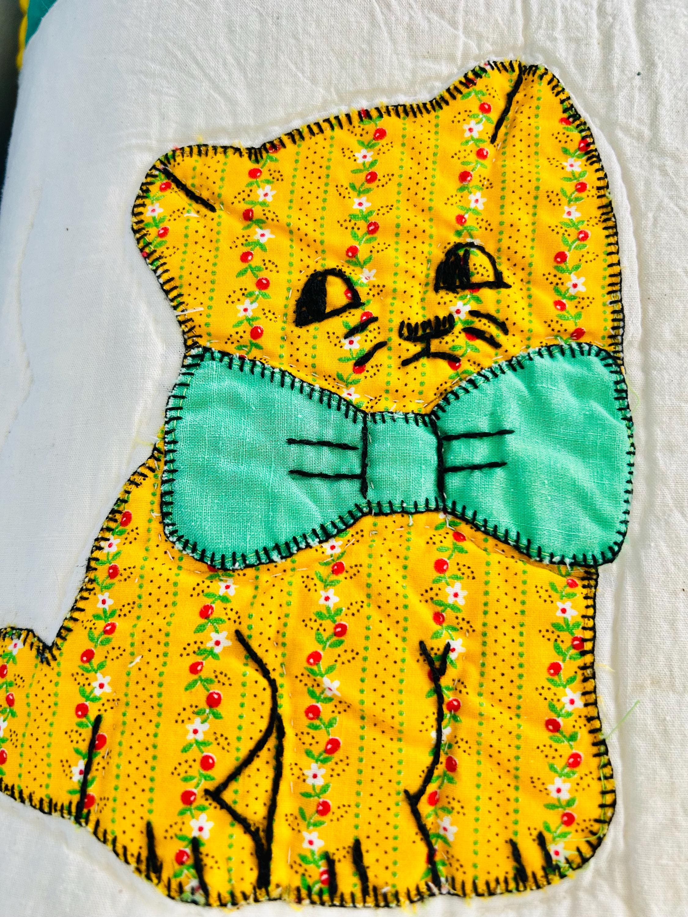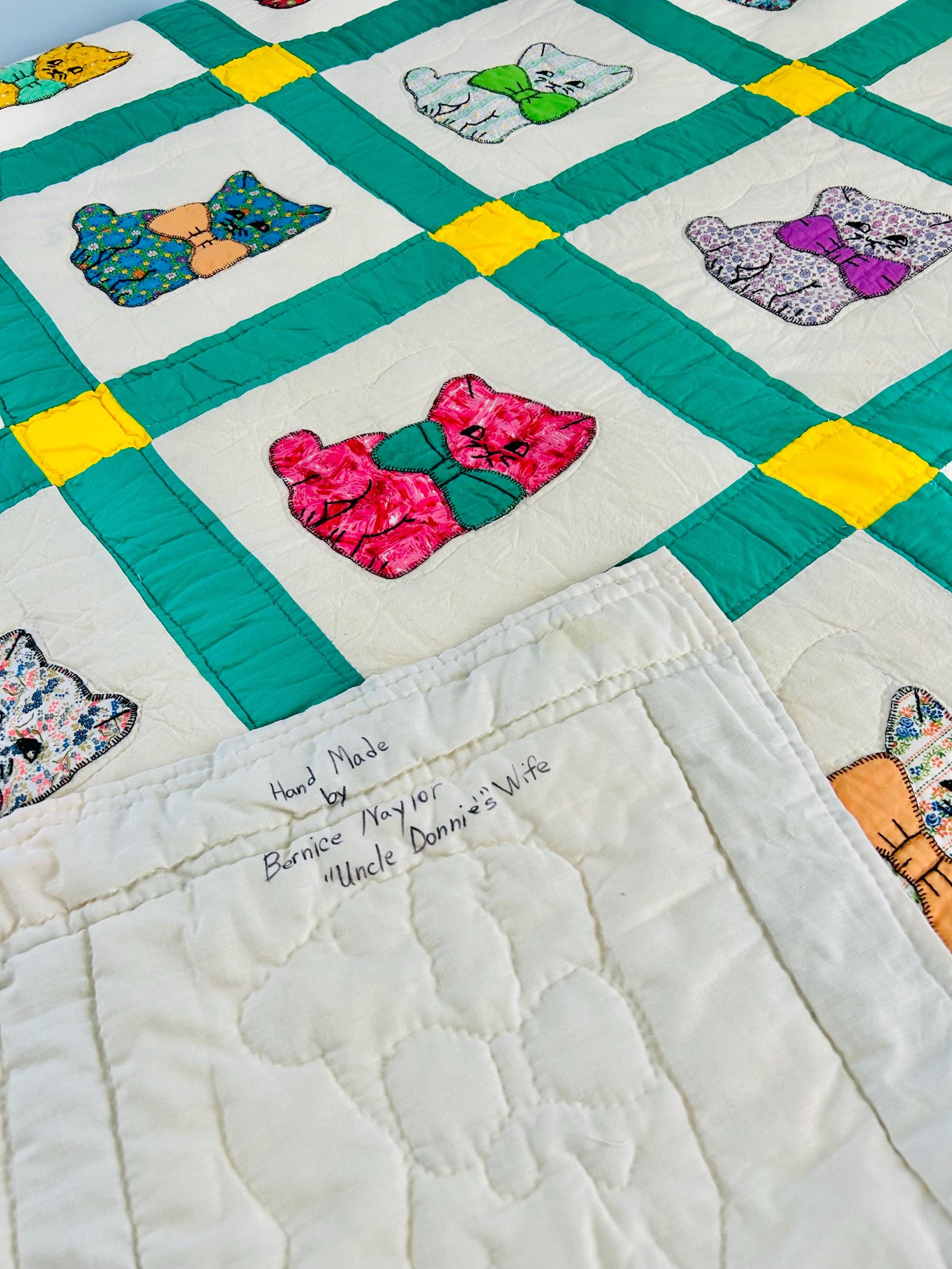🧵 Details: • Date: Circa 1970s • Size: 73” x 86” • Pattern: Appliqué cat / kitten quilt • Materials: Cotton and cotton blends • Construction: Hand-appliquéd with embroidered details; hand quilted • Colors: Cream ground with green sashing, yellow cornerstones, and multicolored novelty prints • Backing: Solid light fabric with maker inscription