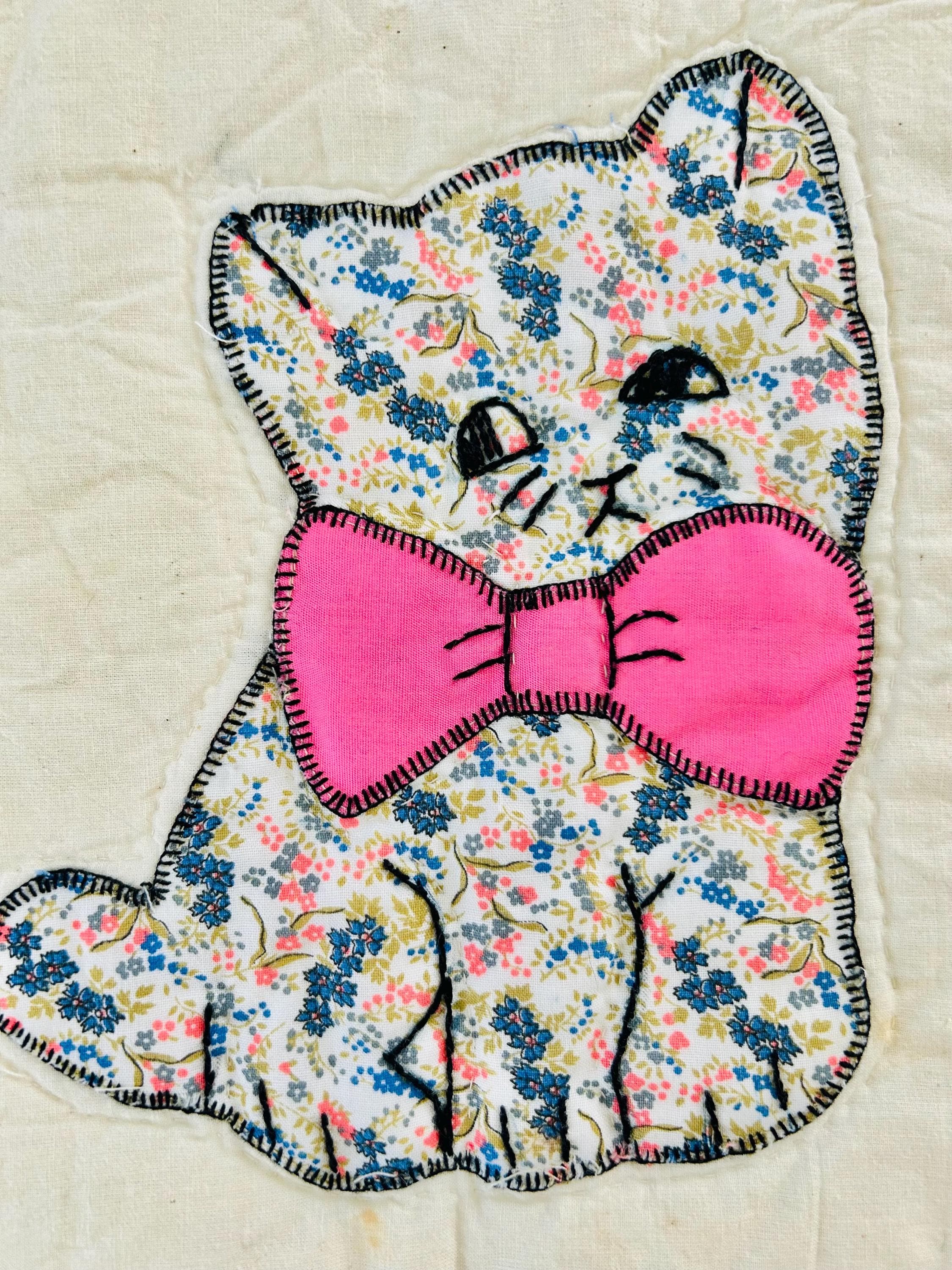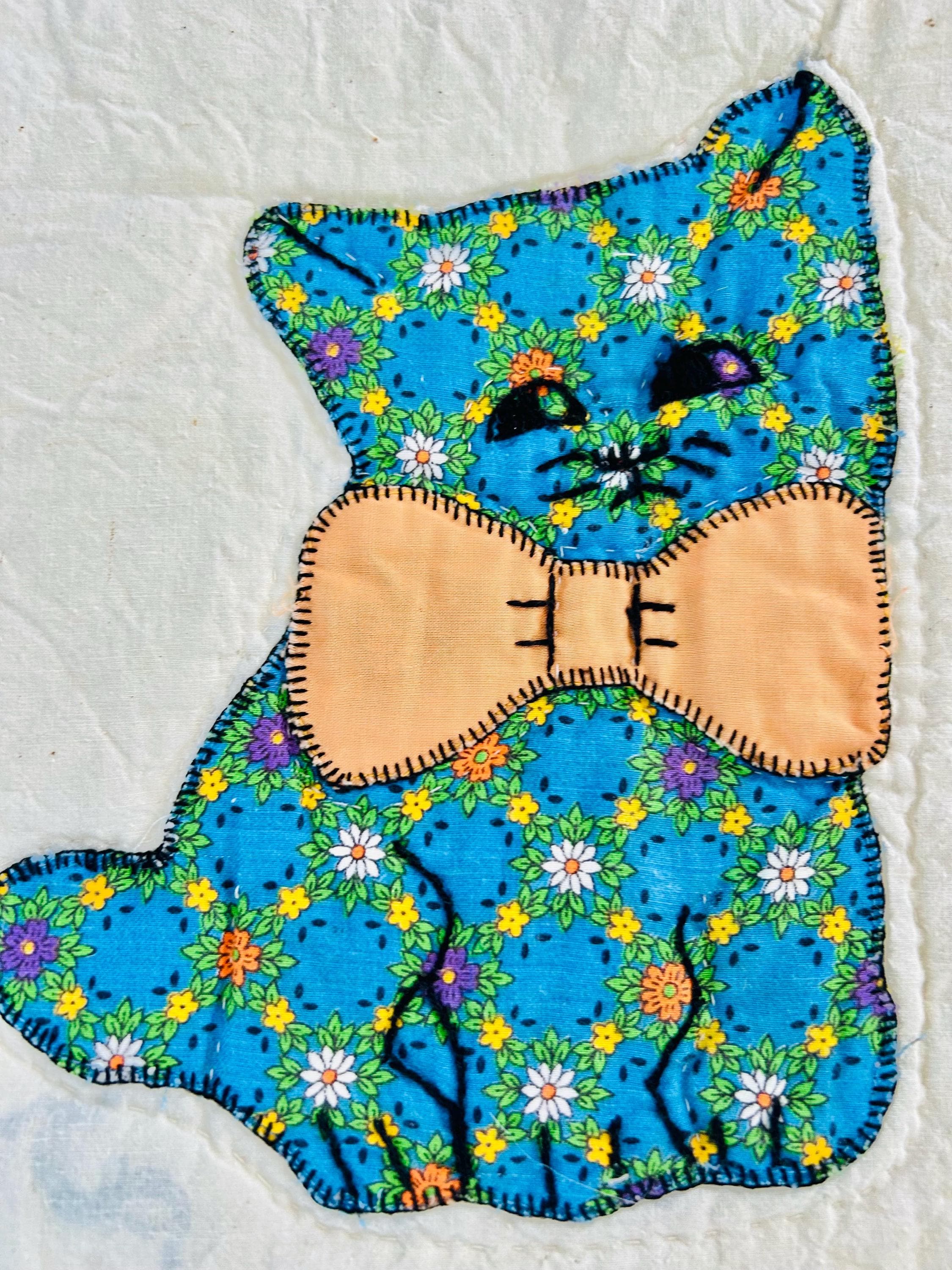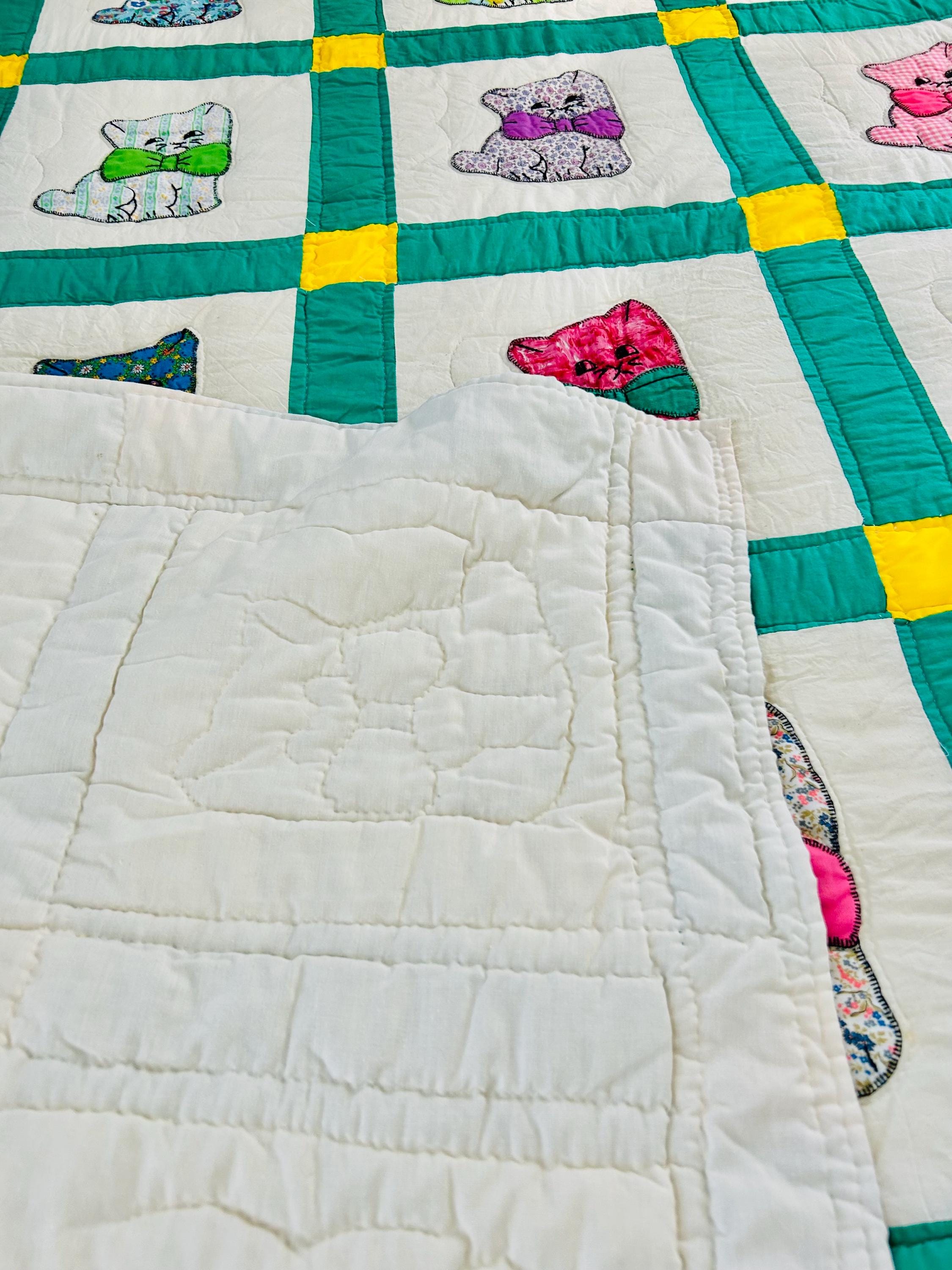 🧵 Details: • Date: Circa 1970s • Size: 73” x 86” • Pattern: Appliqué cat / kitten quilt • Materials: Cotton and cotton blends • Construction: Hand-appliquéd with embroidered details; hand quilted • Colors: Cream ground with green sashing, yellow cornerstones, and multicolored novelty prints • Backing: Solid light fabric with maker inscription
