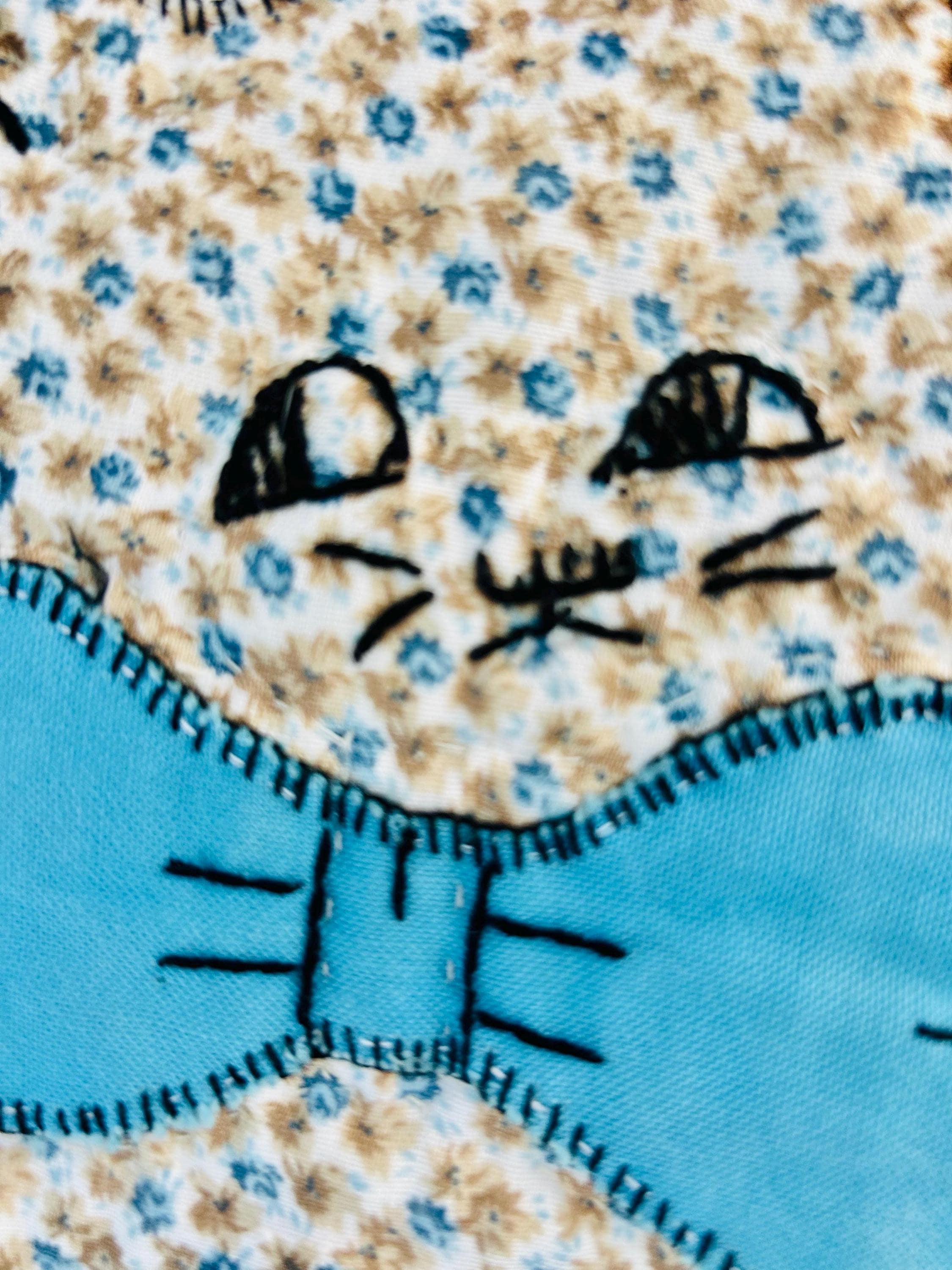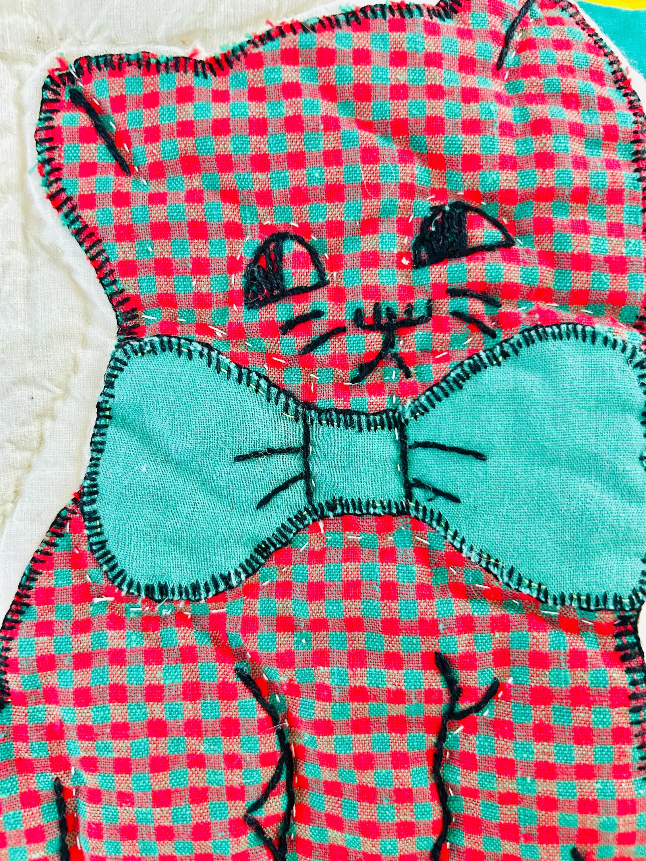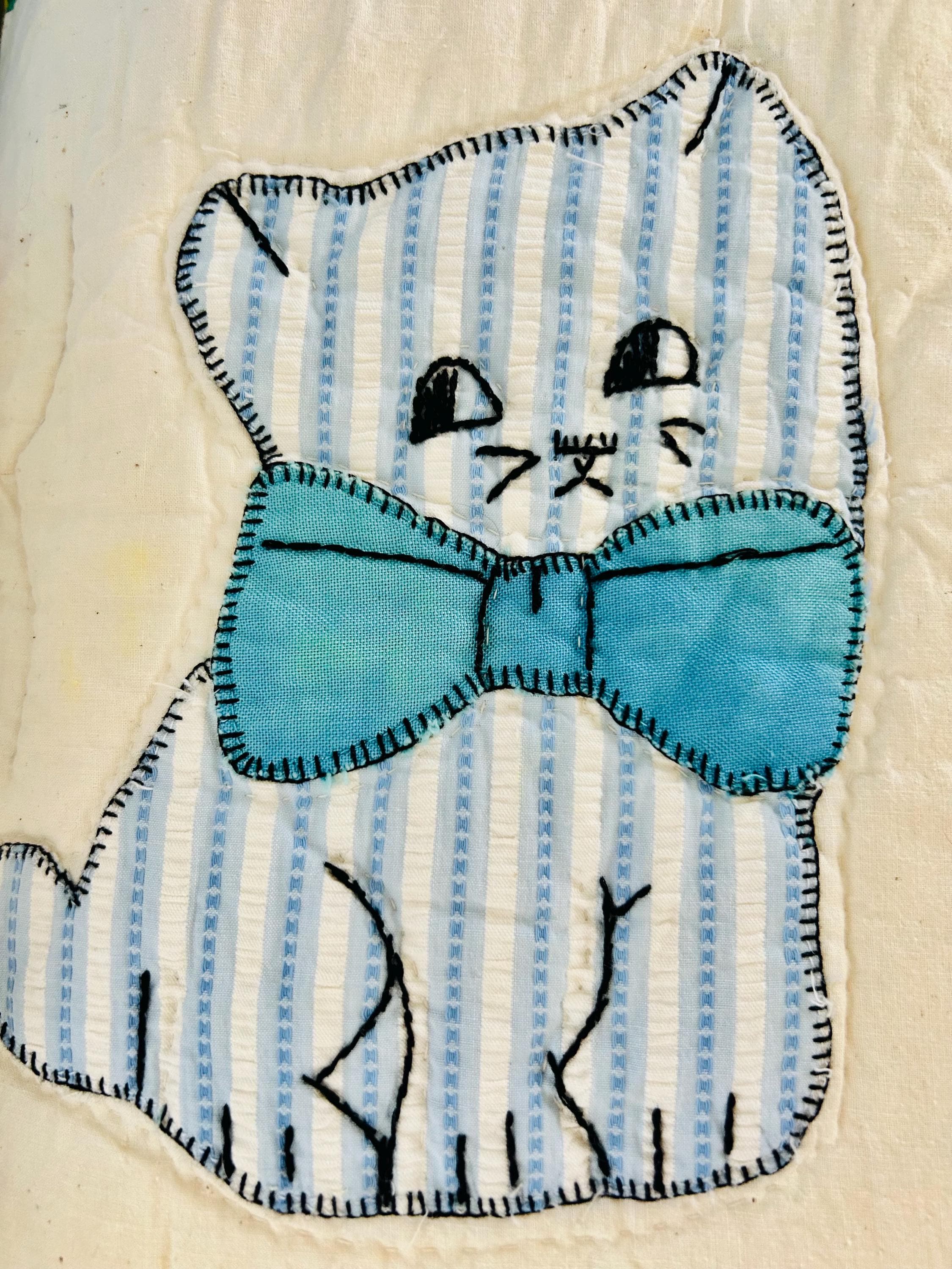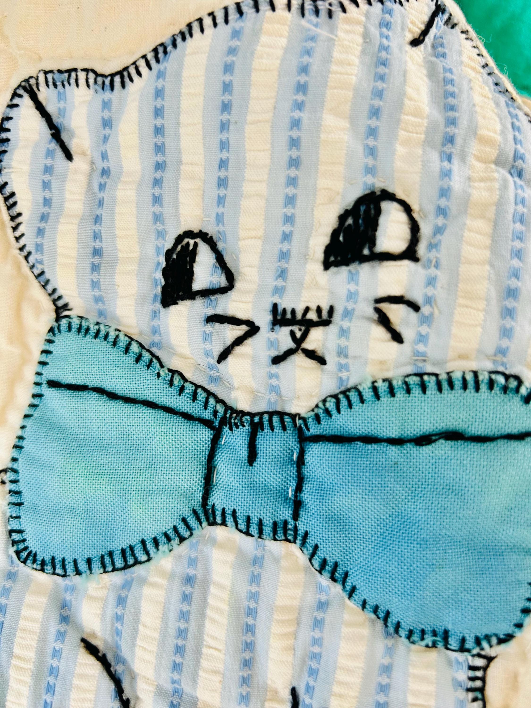 🧵 Details: • Date: Circa 1970s • Size: 73” x 86” • Pattern: Appliqué cat / kitten quilt • Materials: Cotton and cotton blends • Construction: Hand-appliquéd with embroidered details; hand quilted • Colors: Cream ground with green sashing, yellow cornerstones, and multicolored novelty prints • Backing: Solid light fabric with maker inscription