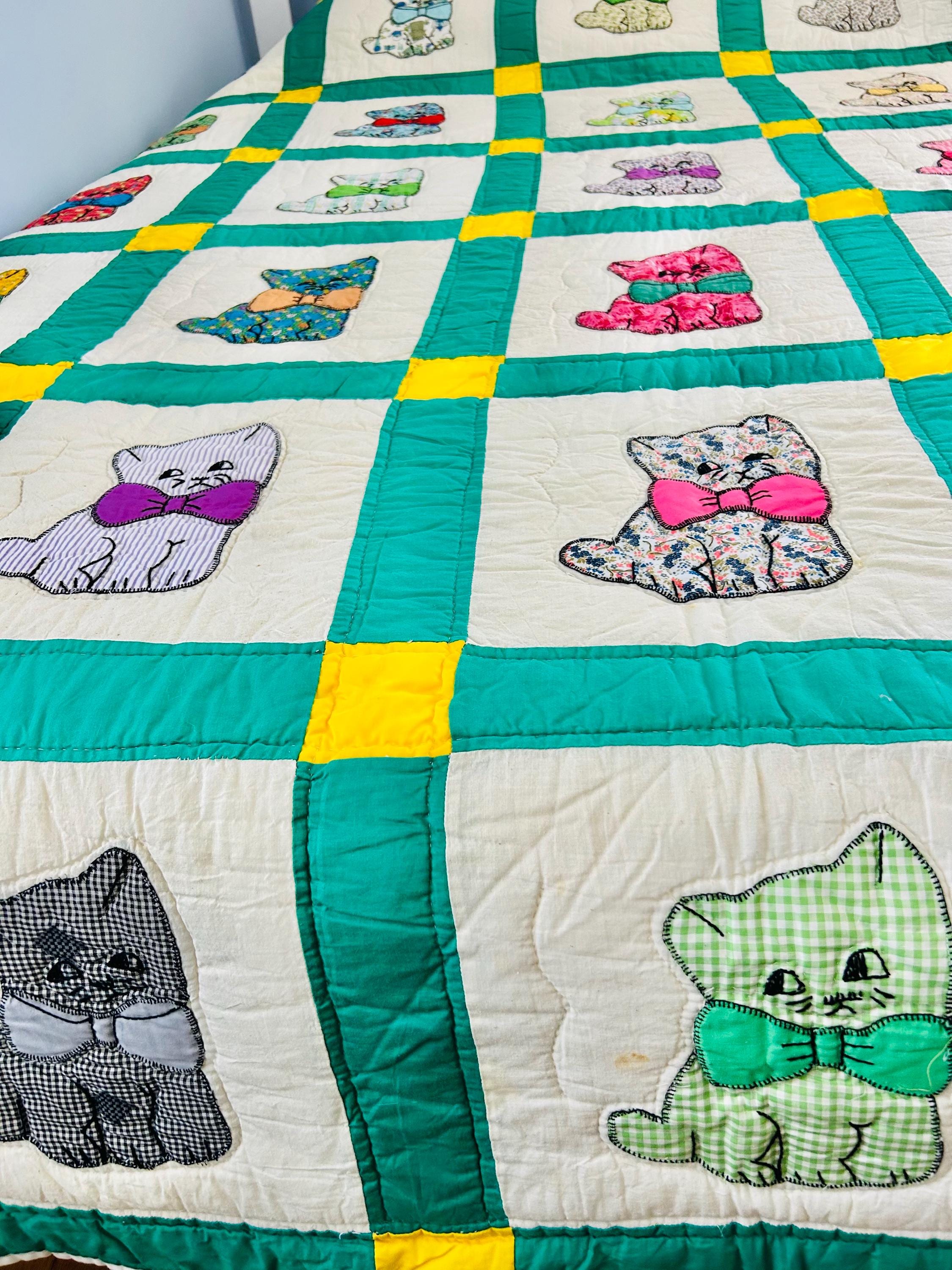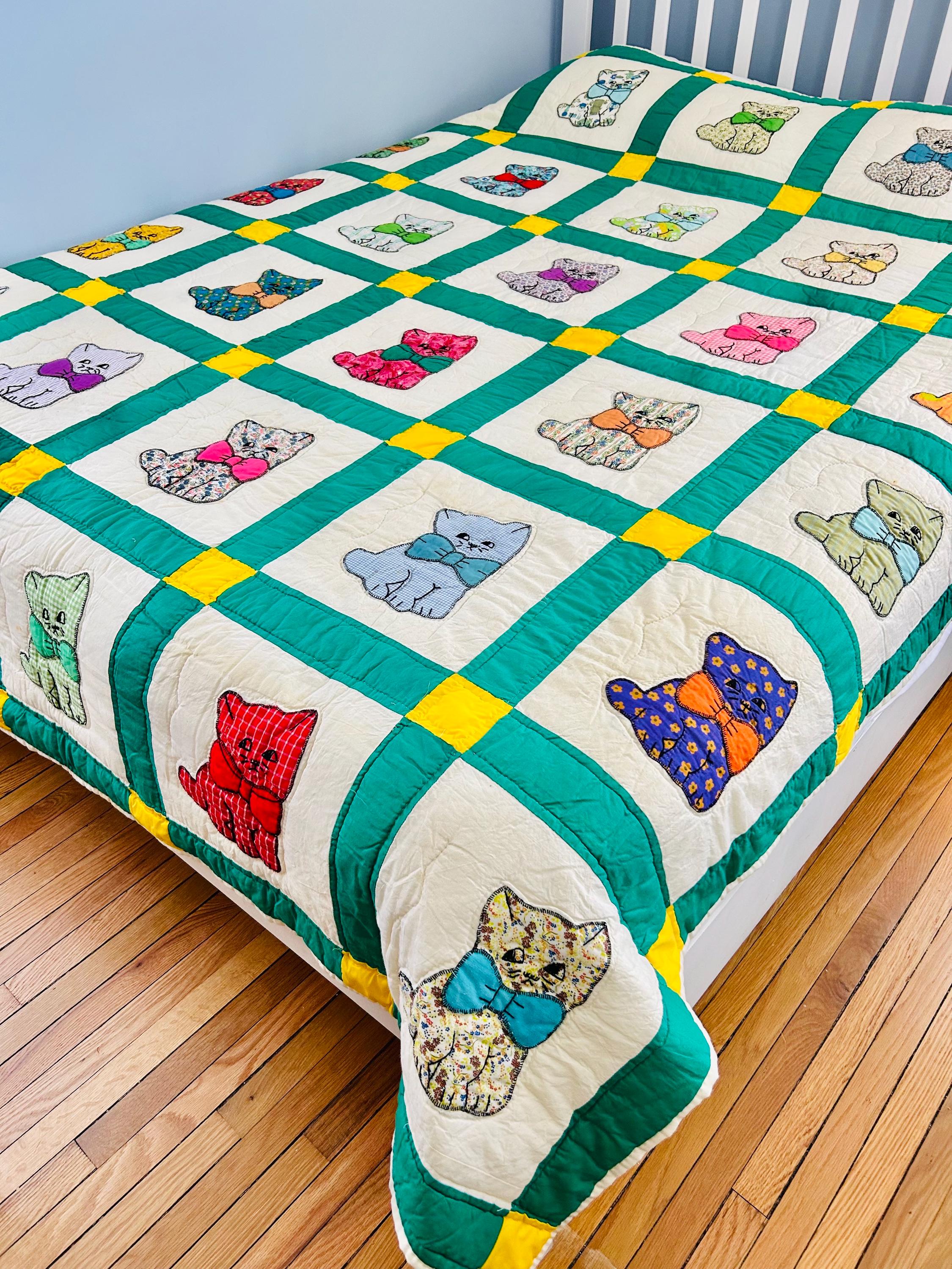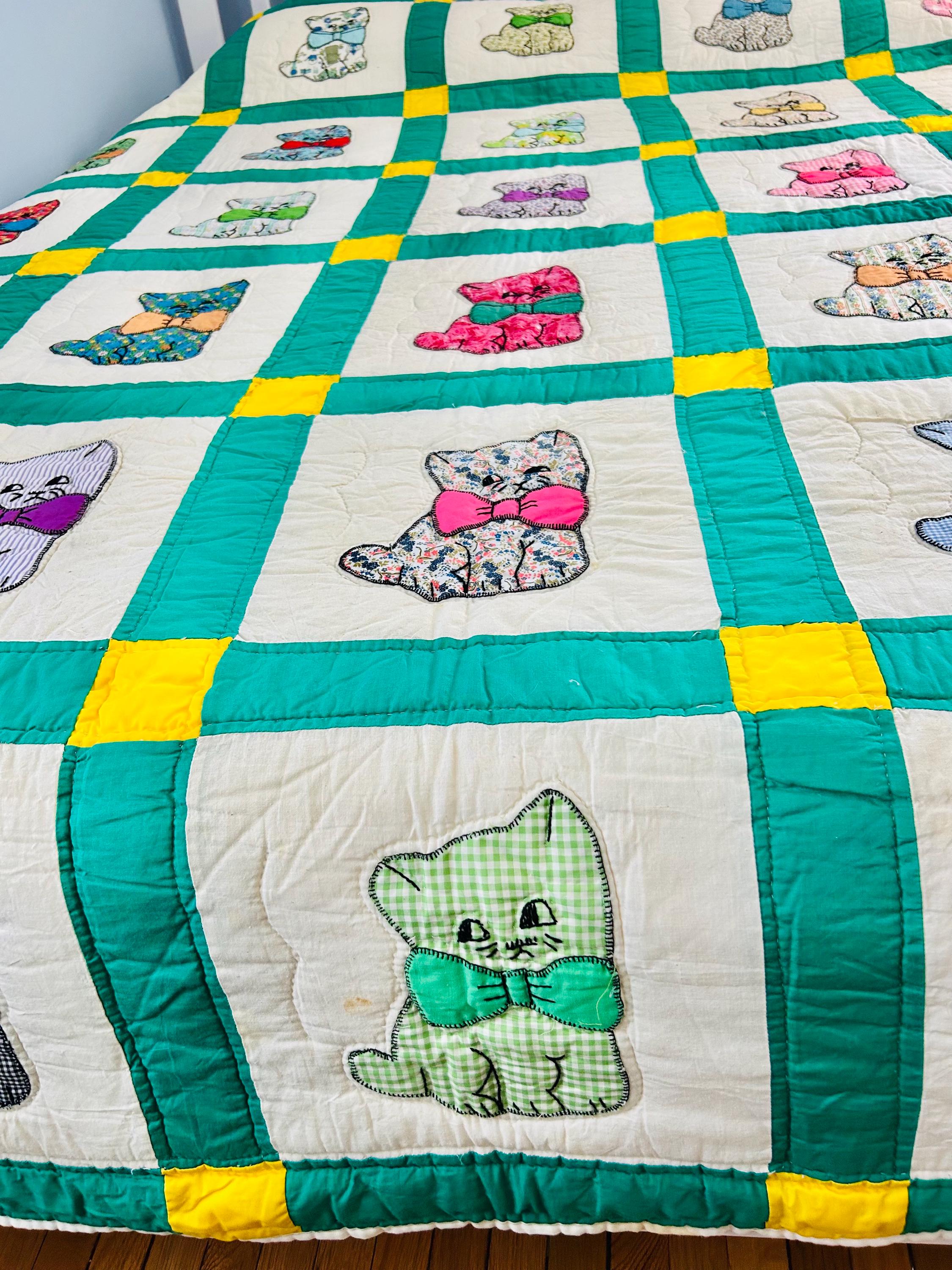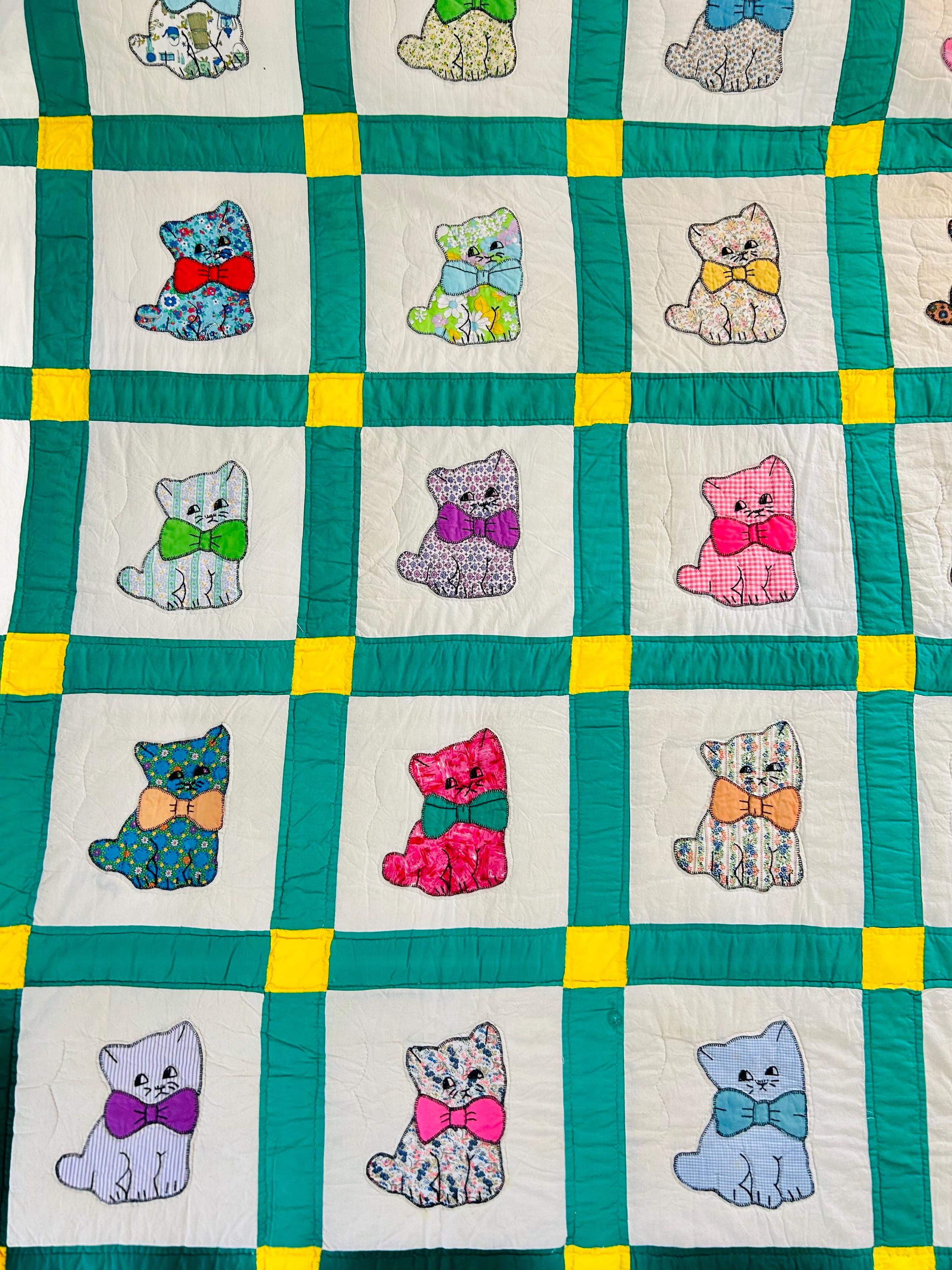This is a delightful handmade cat quilt, created in the 1970s and featuring rows of sweet appliqué kittens, each made from a different printed fabric and each adorned with a bright bow tie. The sashing is bold green with sunny yellow cornerstones and each cat is individually hand-appliquéd and outlined with blanket stitching and given embroidered facial details.