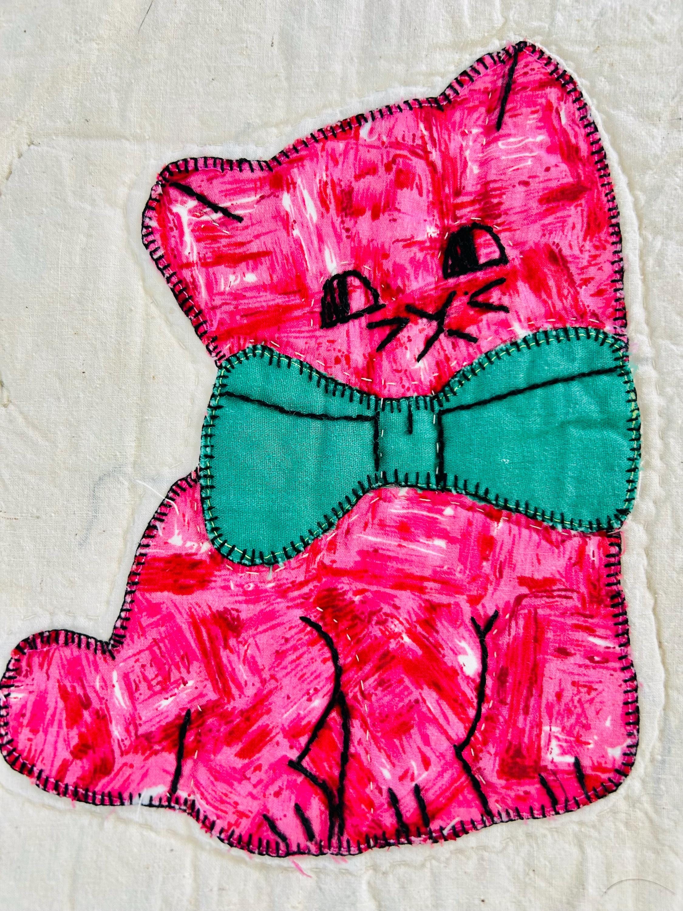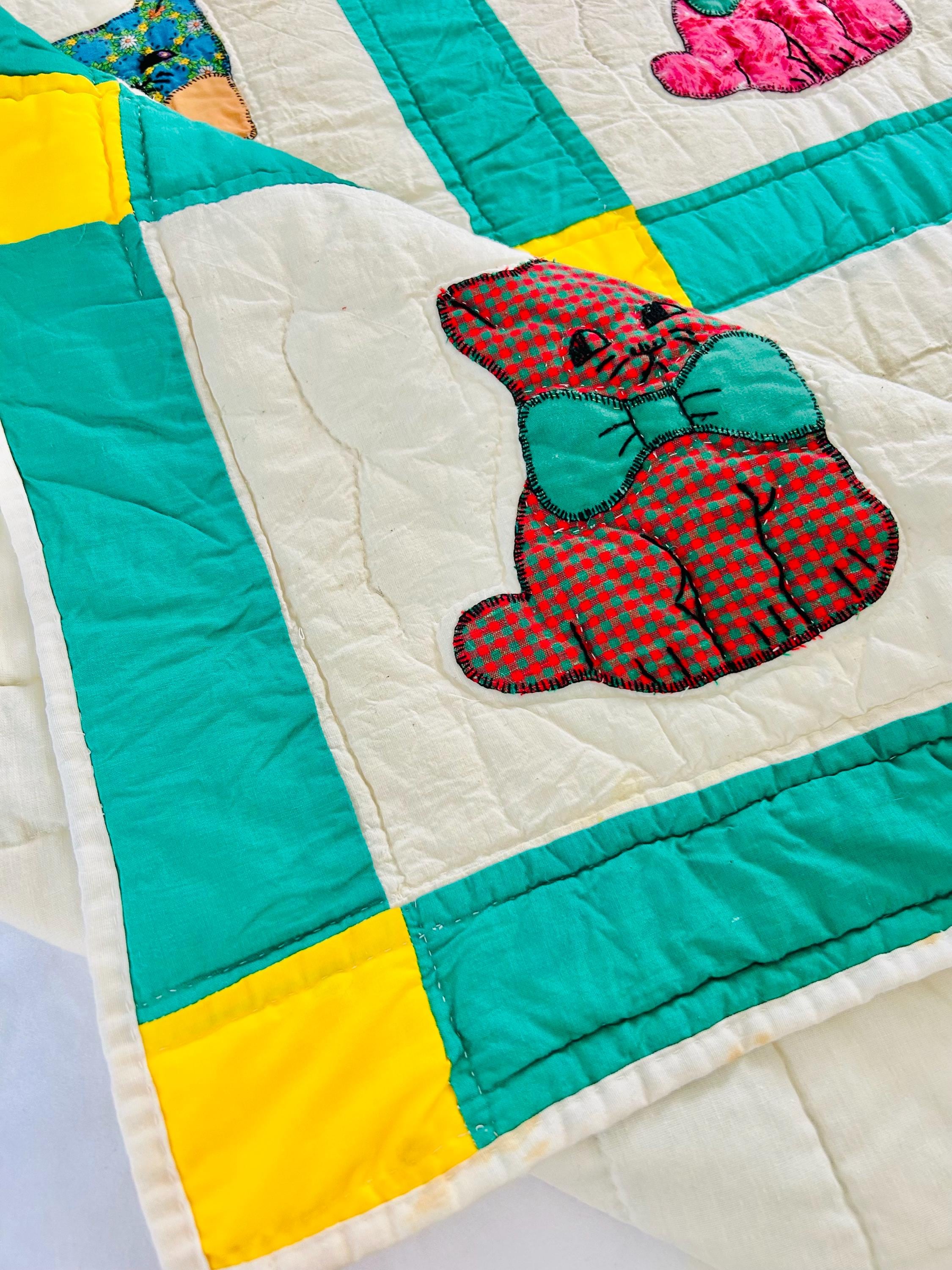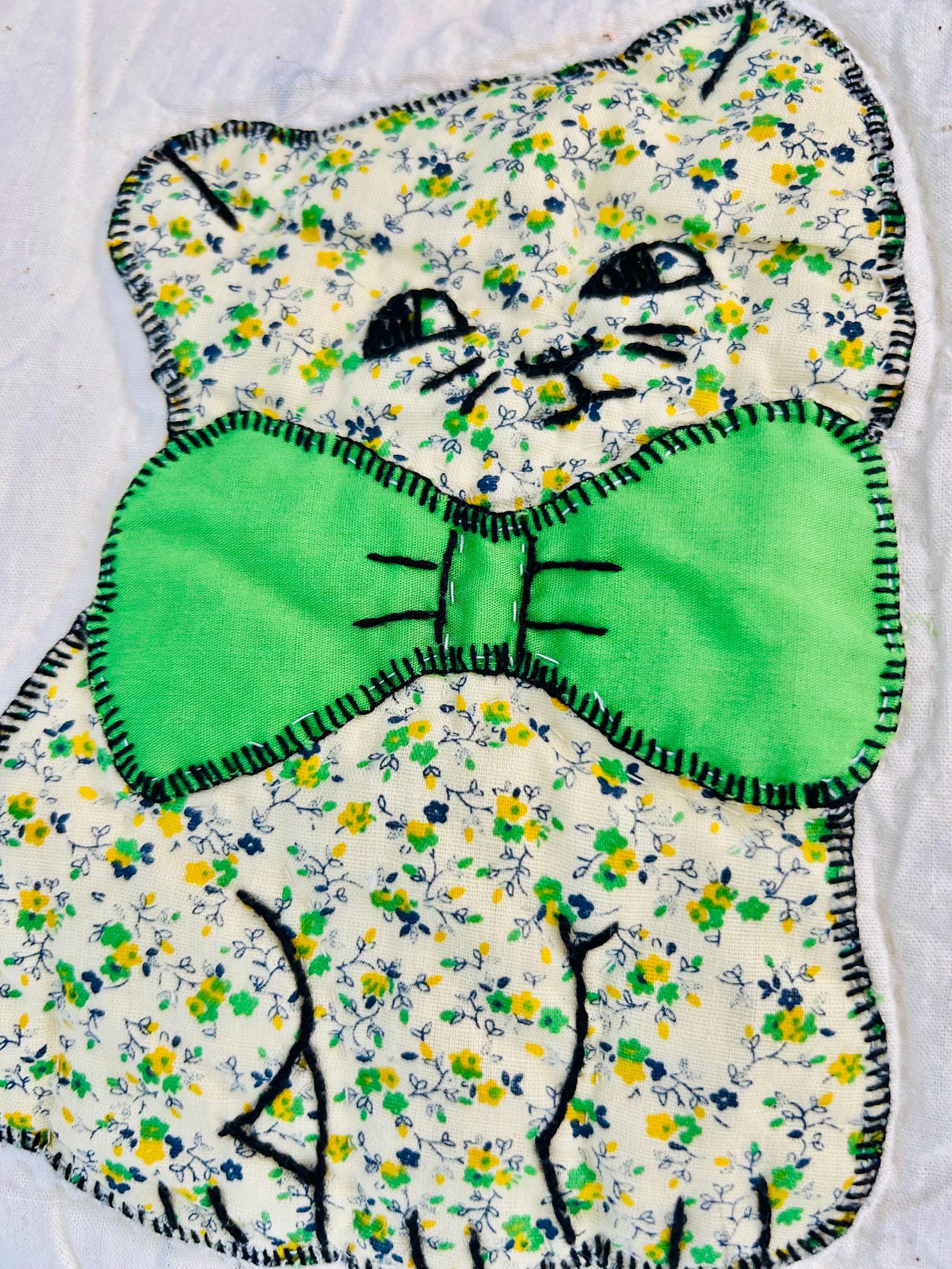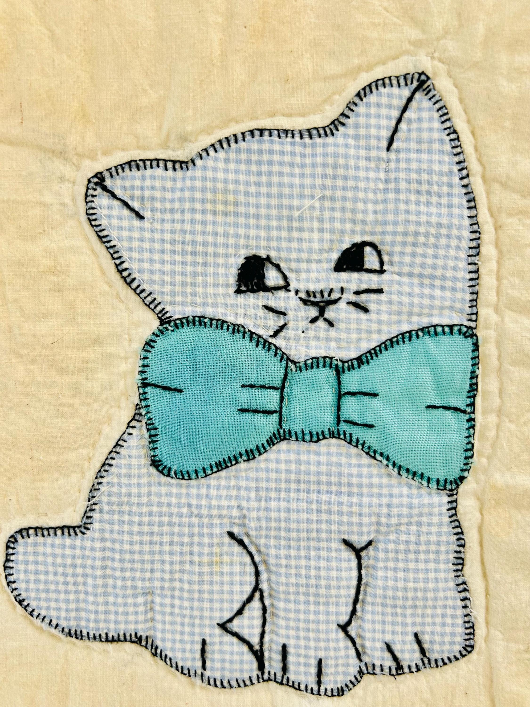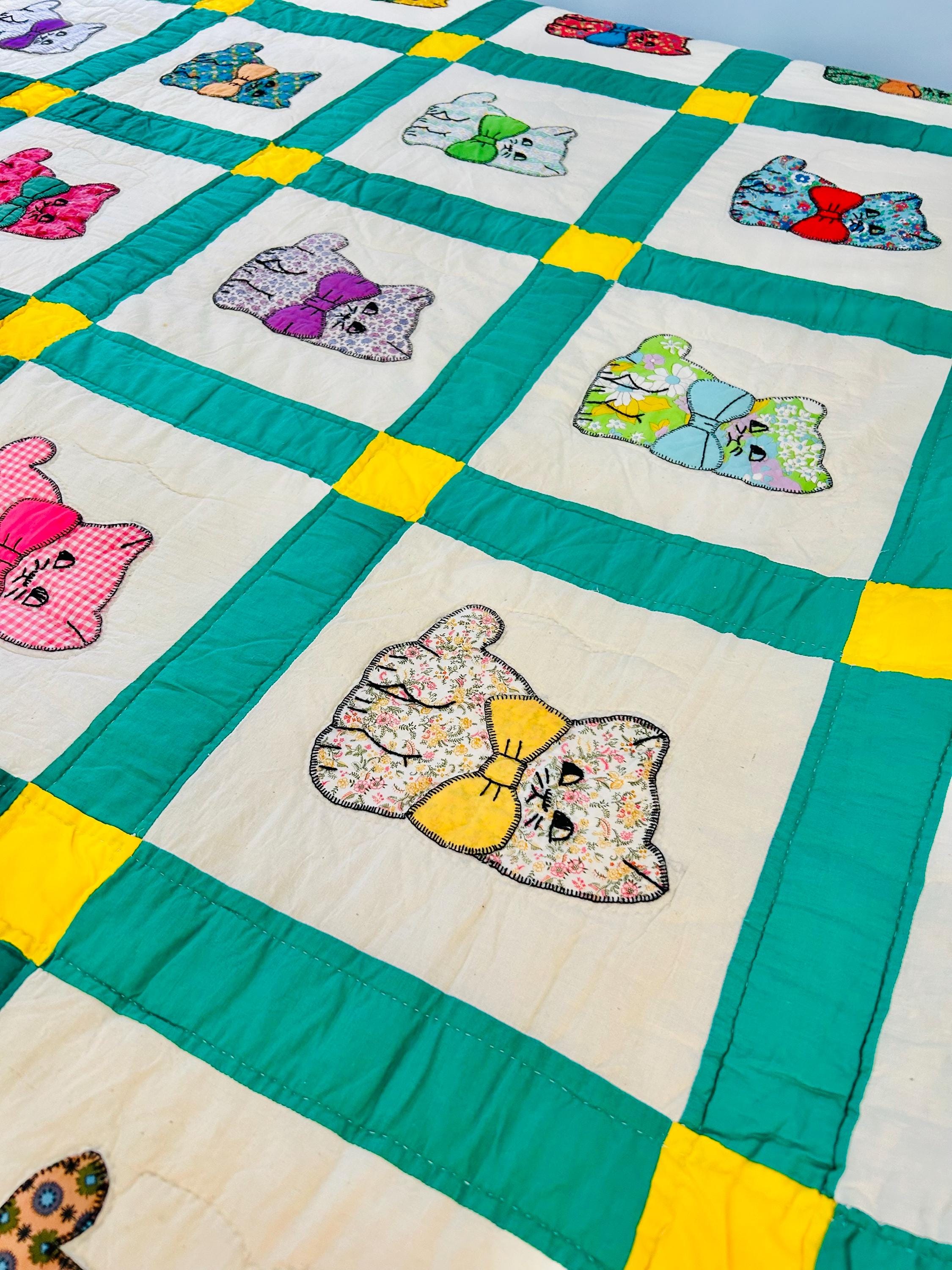 This is a delightful handmade cat quilt, created in the 1970s and featuring rows of sweet appliqué kittens, each made from a different printed fabric and each adorned with a bright bow tie. The sashing is bold green with sunny yellow cornerstones and each cat is individually hand-appliquéd and outlined with blanket stitching and given embroidered facial details.