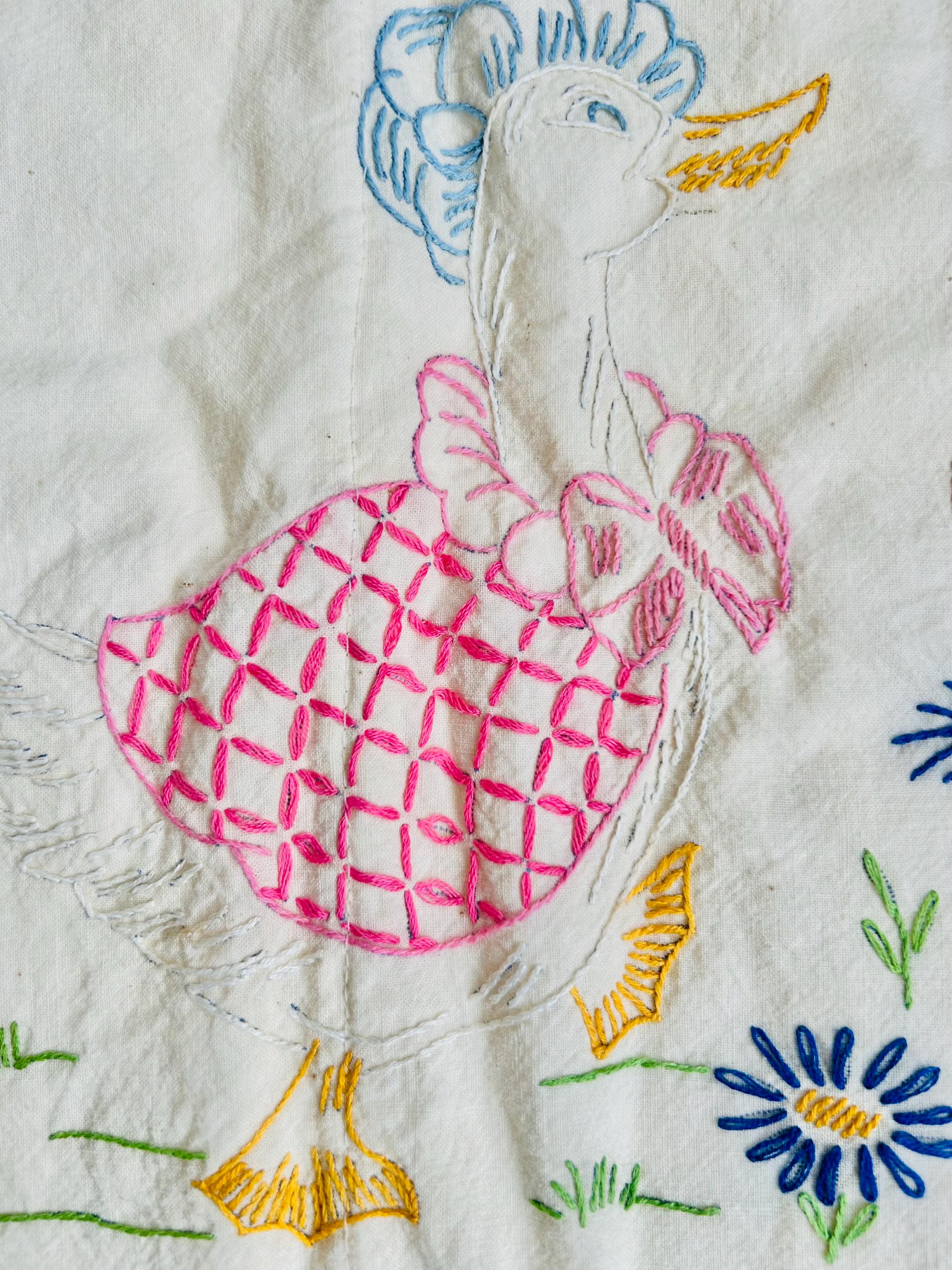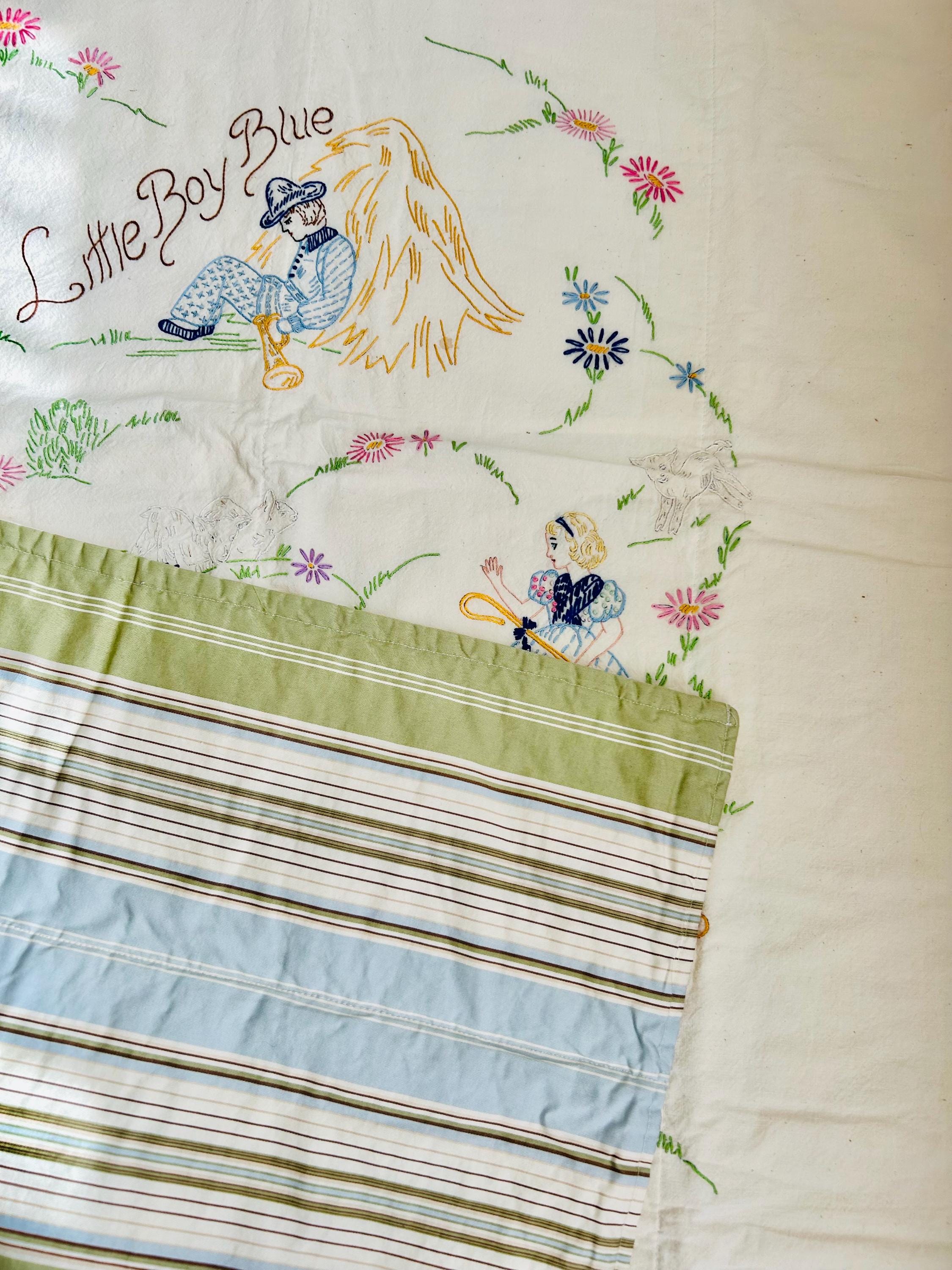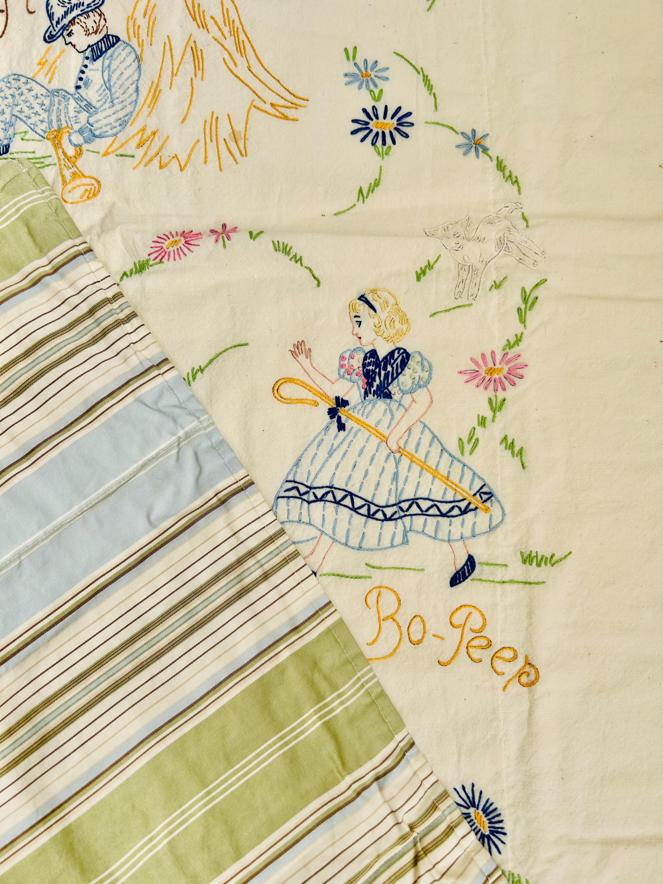 Details: • Size: 34 1/2” x 56” • Era: Circa 1940s–early 1950s • Construction: Hand embroidered quilt • Technique: Hand-stitched embroidery (outline, satin, and decorative stitches) • Materials: Muslin-cotton top and cotton back with lightweight flannel batting • Design: Nursery rhyme theme featuring multiple storybook characters • Backing: Striped mid-century cotton fabric in green, blue, and brown • Colors: Pastel pink, blue, yellow, green, lavender on off-white muslin ground
