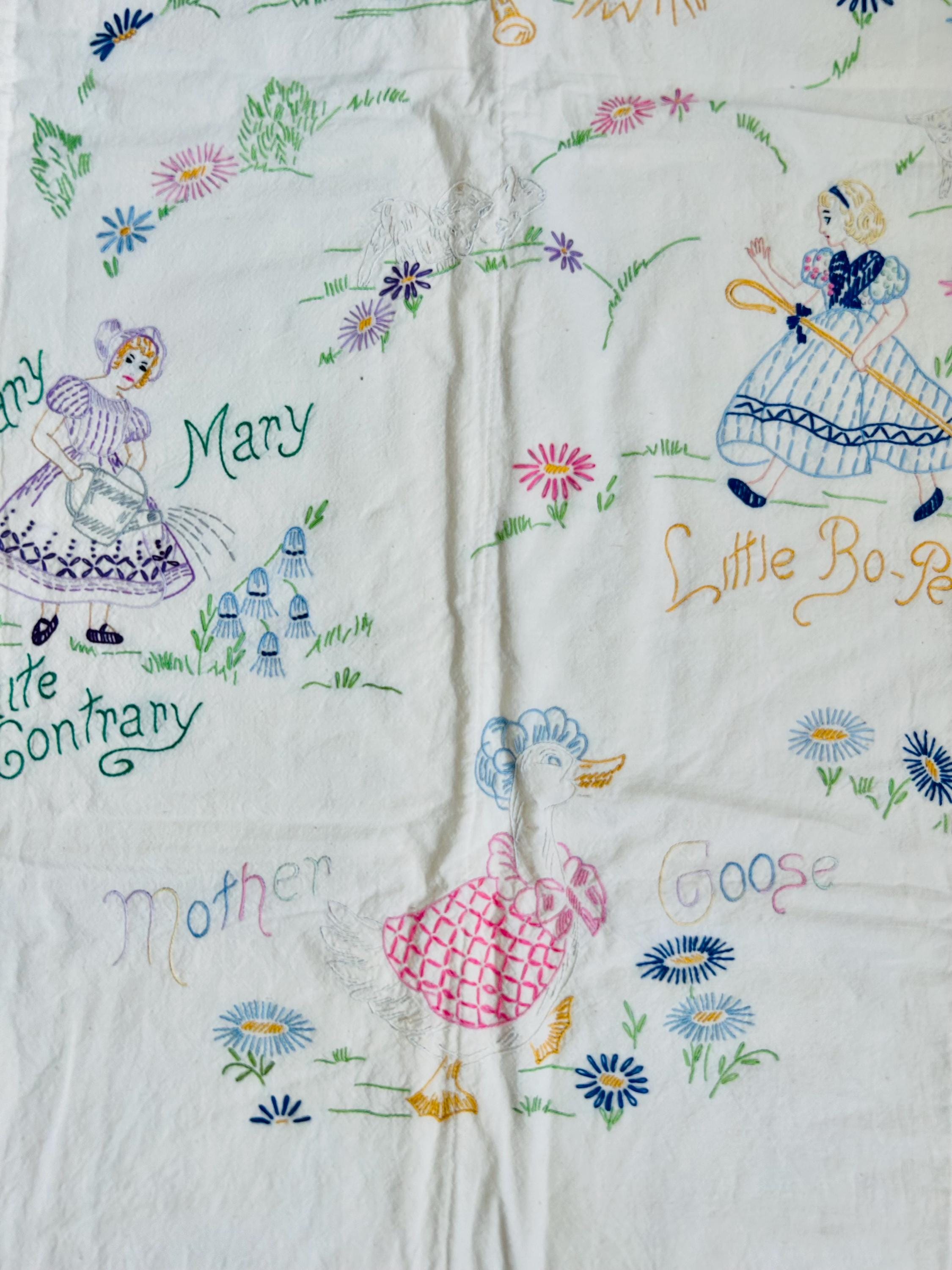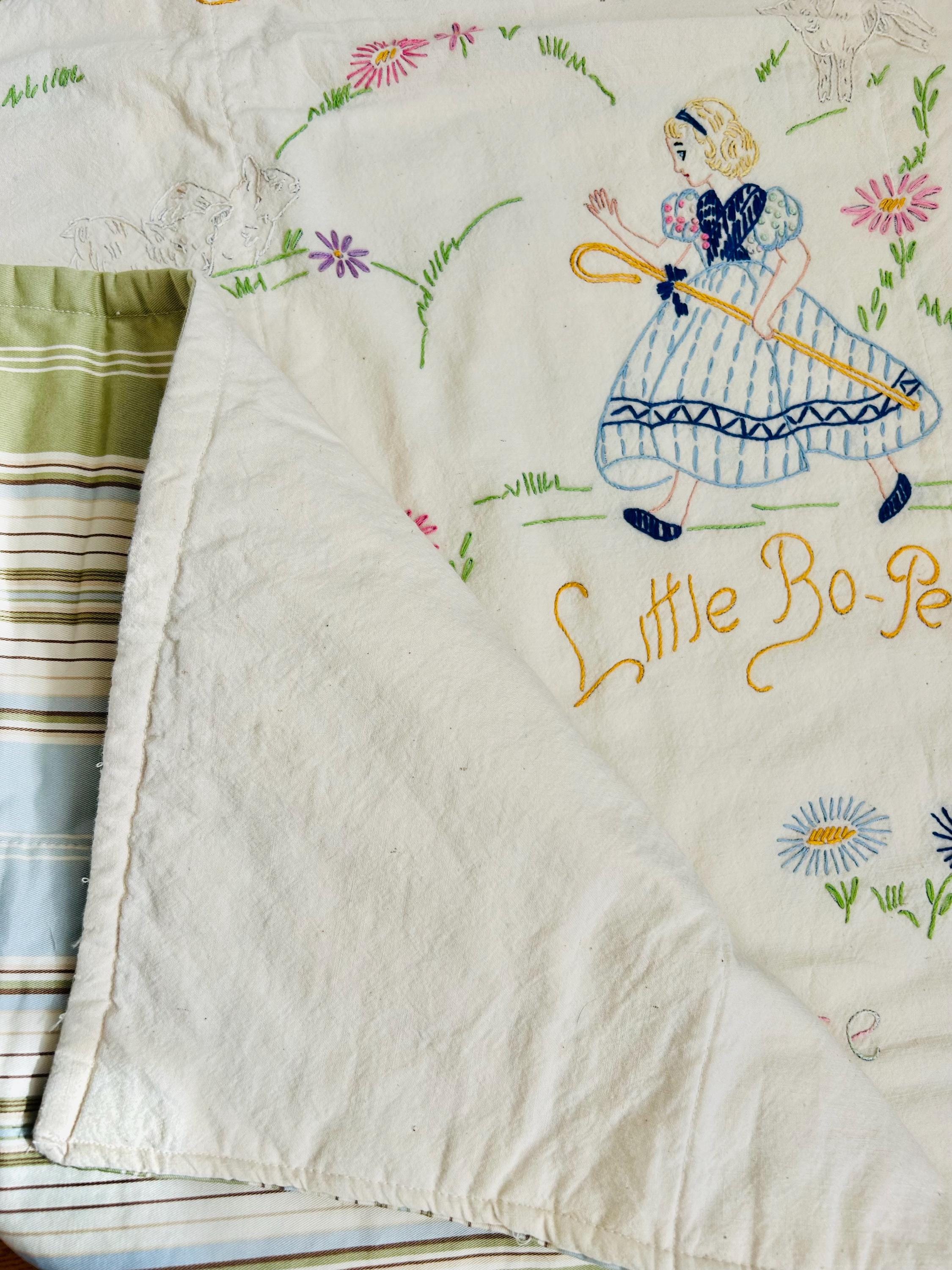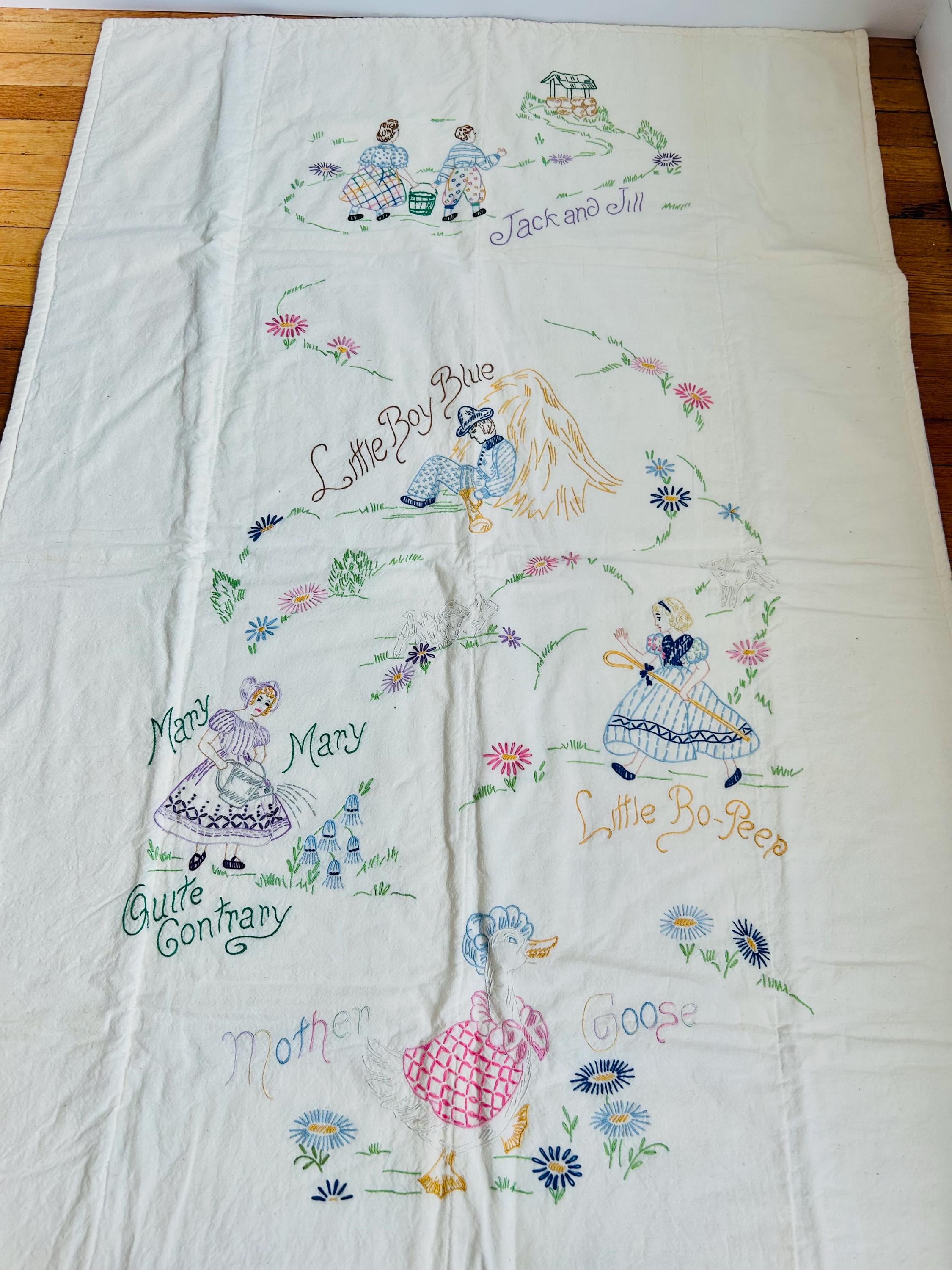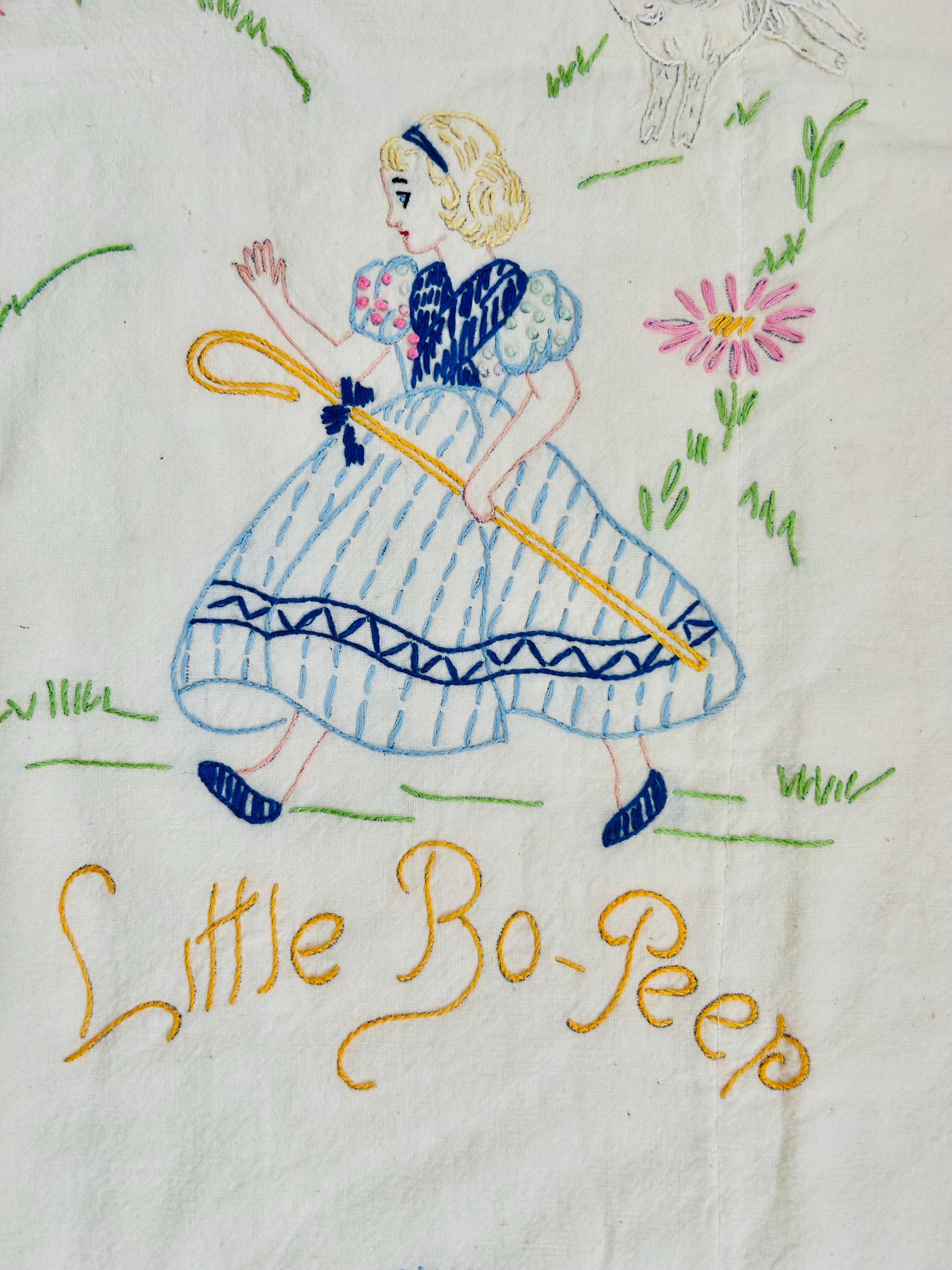 This is a lovely vintage hand-embroidered nursery rhyme quilt, dating to the 1940s–early 1950s. Each panel is embroidered by hand, featuring iconic characters like Little Bo Peep, Little Boy Blue, Mary Quite Contrary, Mother Goose, and Jack and Jill, all set among cheerful flowers and winding garden paths on an off-white/cream muslin ground. The machine-quilting is in straight lines (see photos).