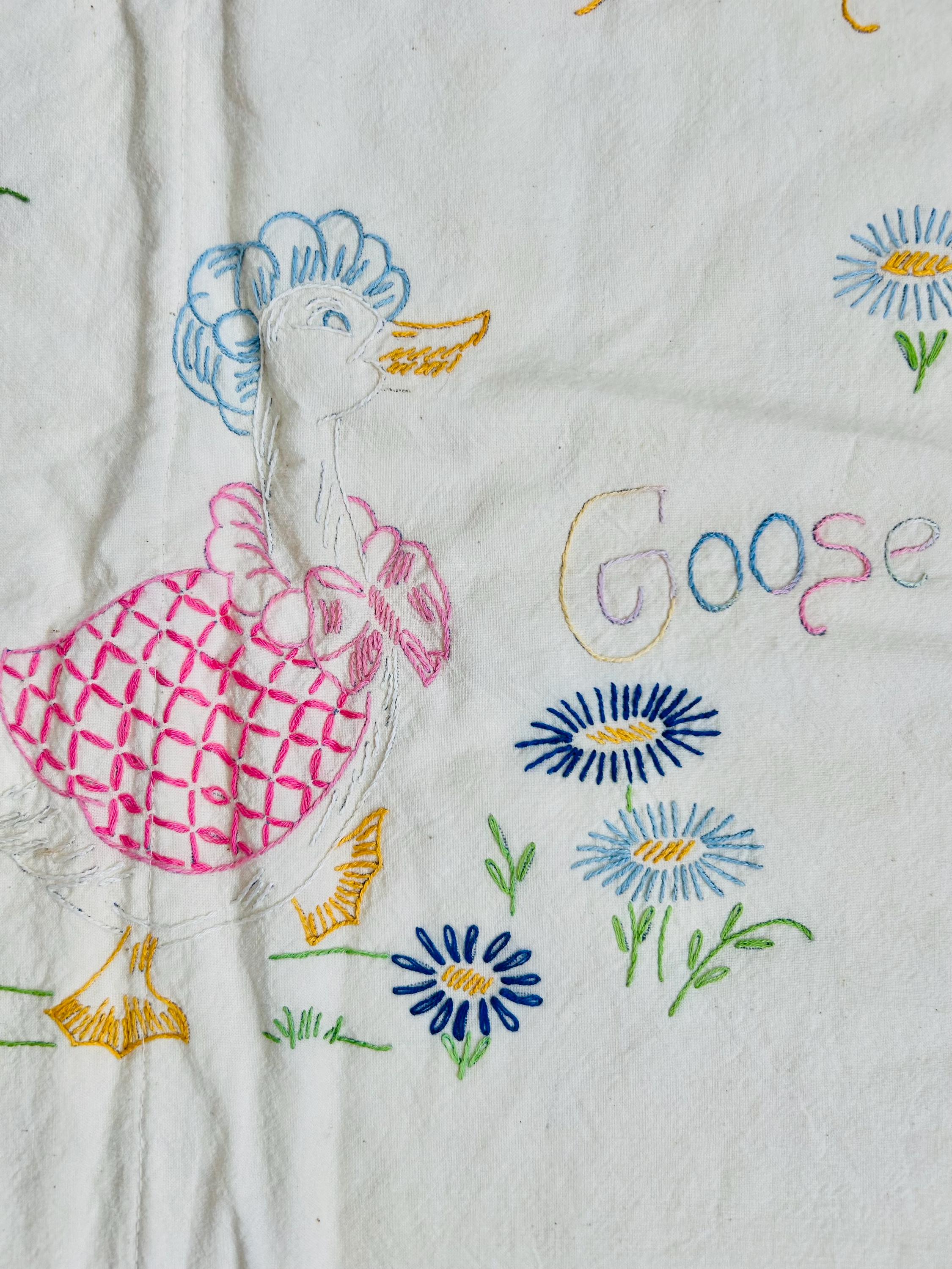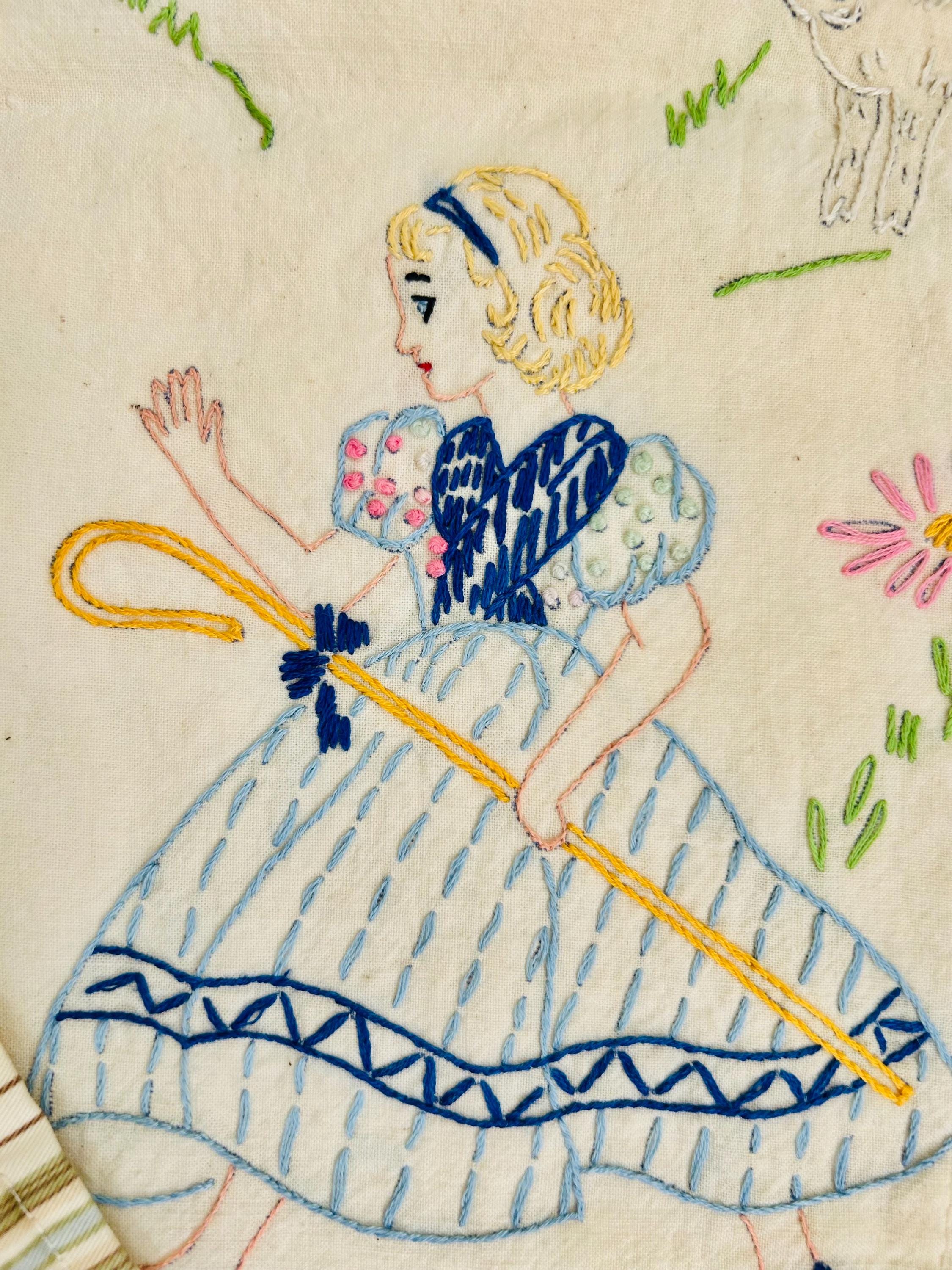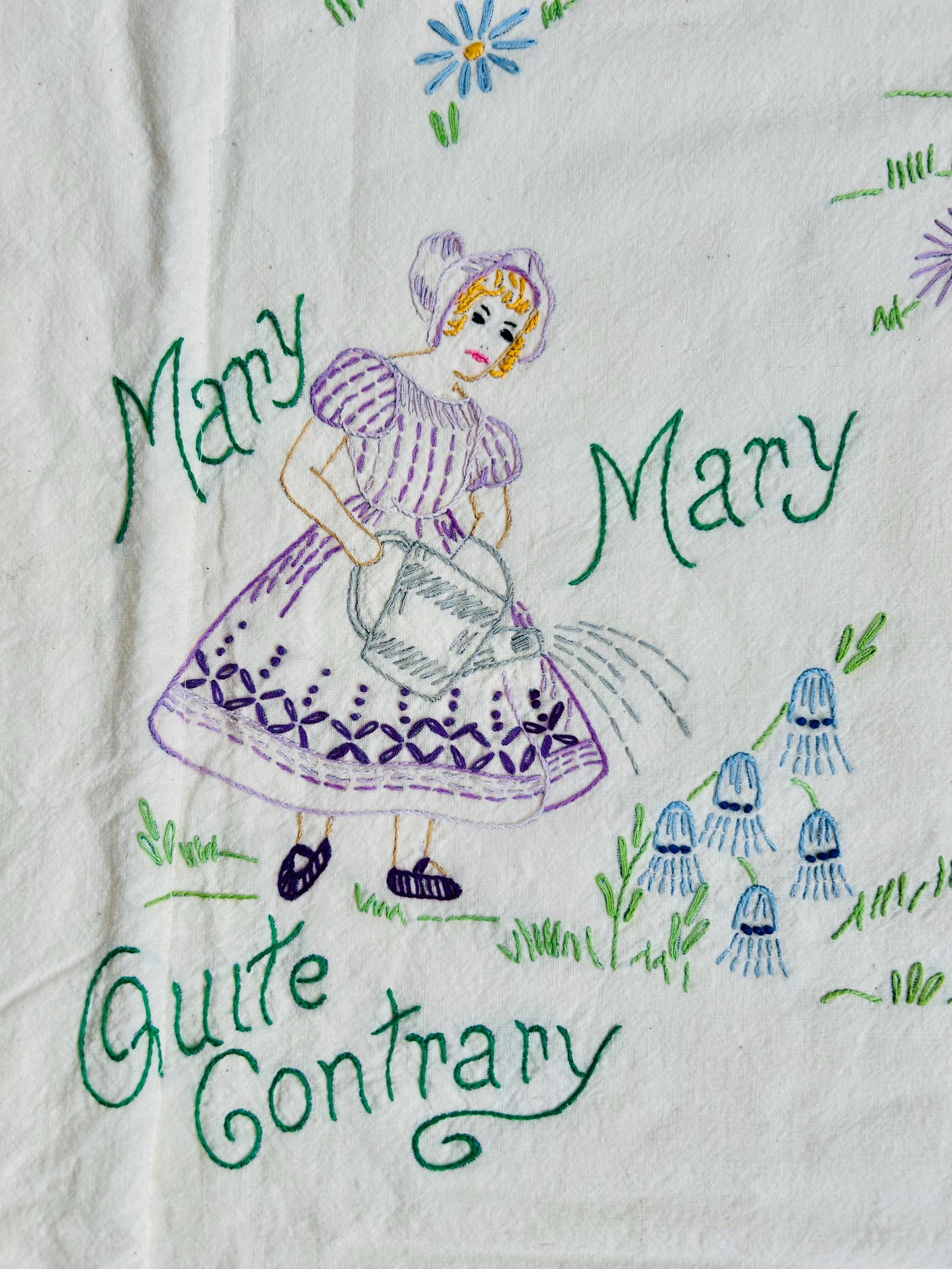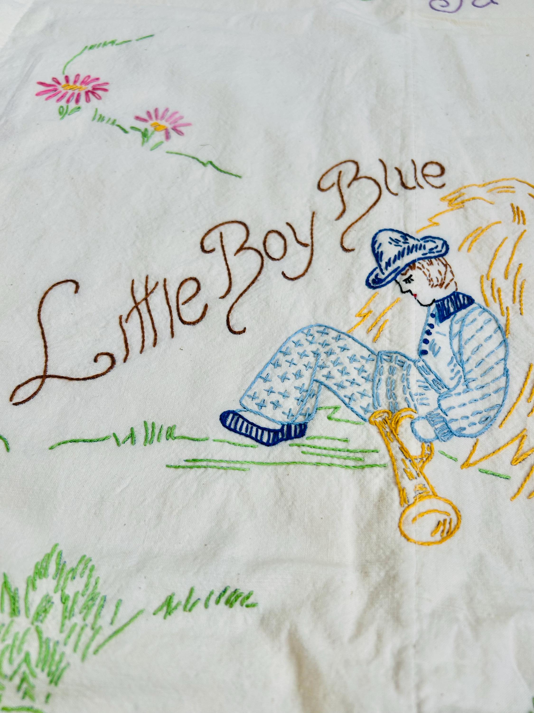 This is a lovely vintage hand-embroidered nursery rhyme quilt, dating to the 1940s–early 1950s. Each panel is embroidered by hand, featuring iconic characters like Little Bo Peep, Little Boy Blue, Mary Quite Contrary, Mother Goose, and Jack and Jill, all set among cheerful flowers and winding garden paths on an off-white/cream muslin ground. The machine-quilting is in straight lines (see photos).