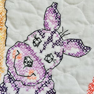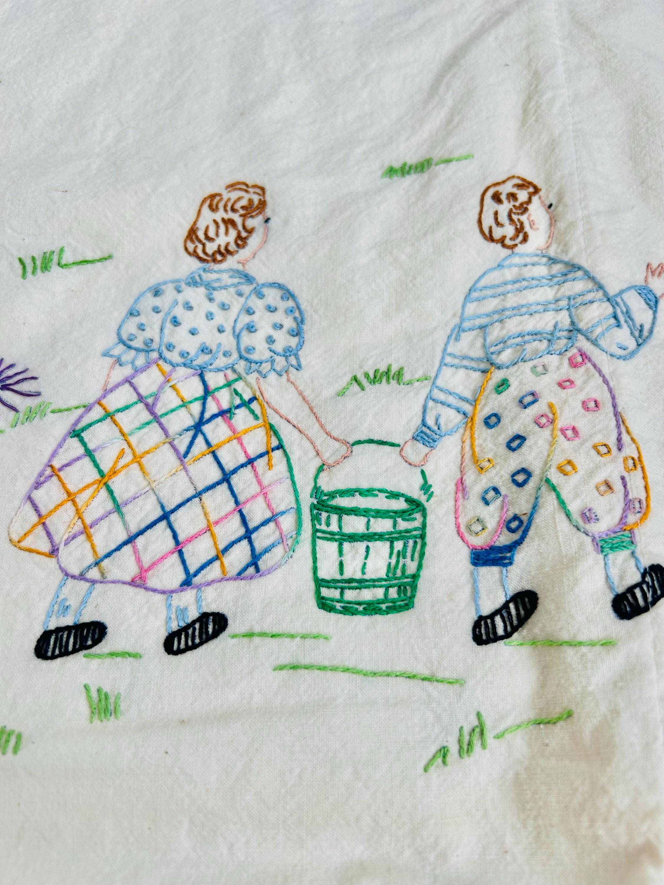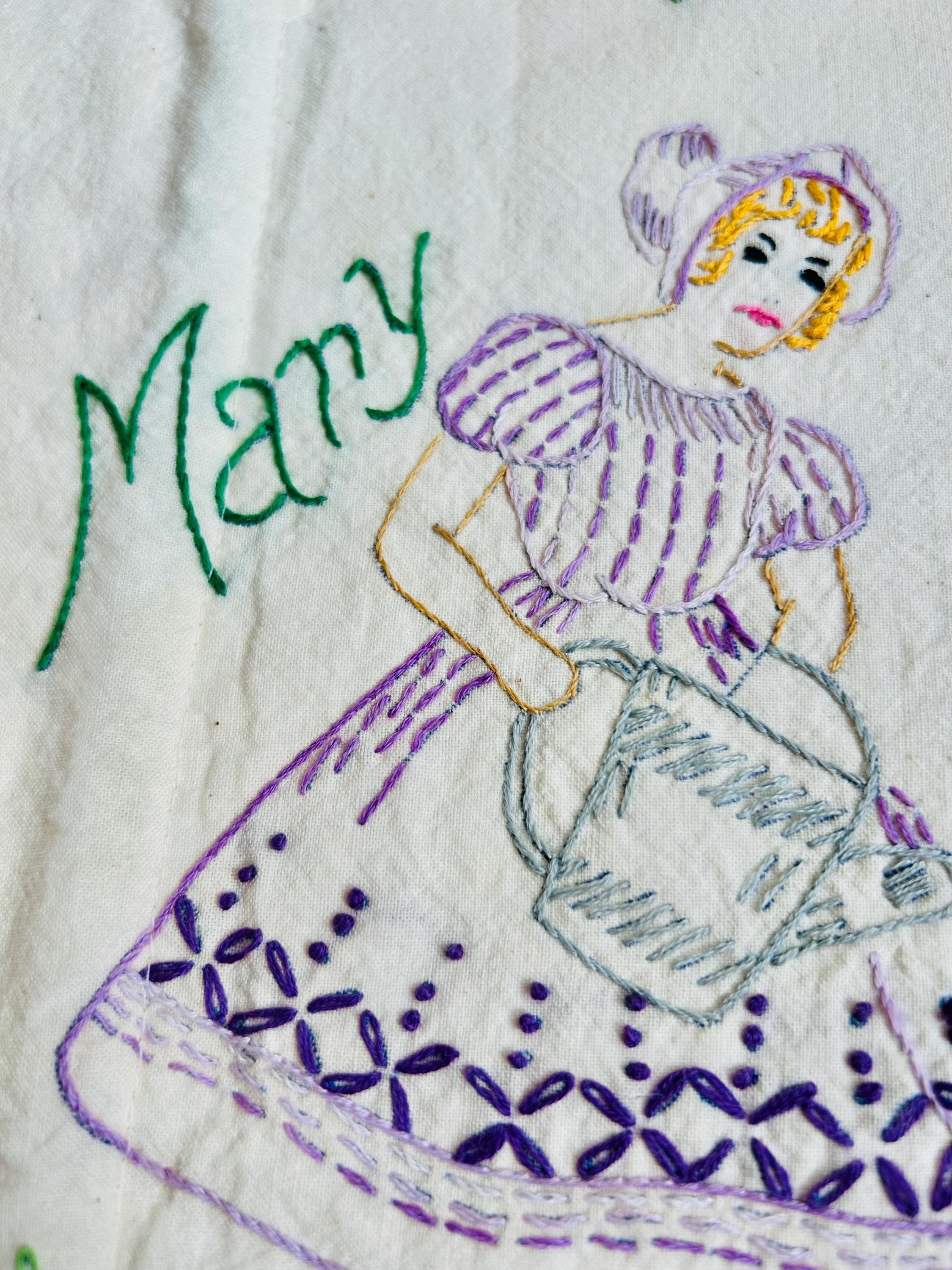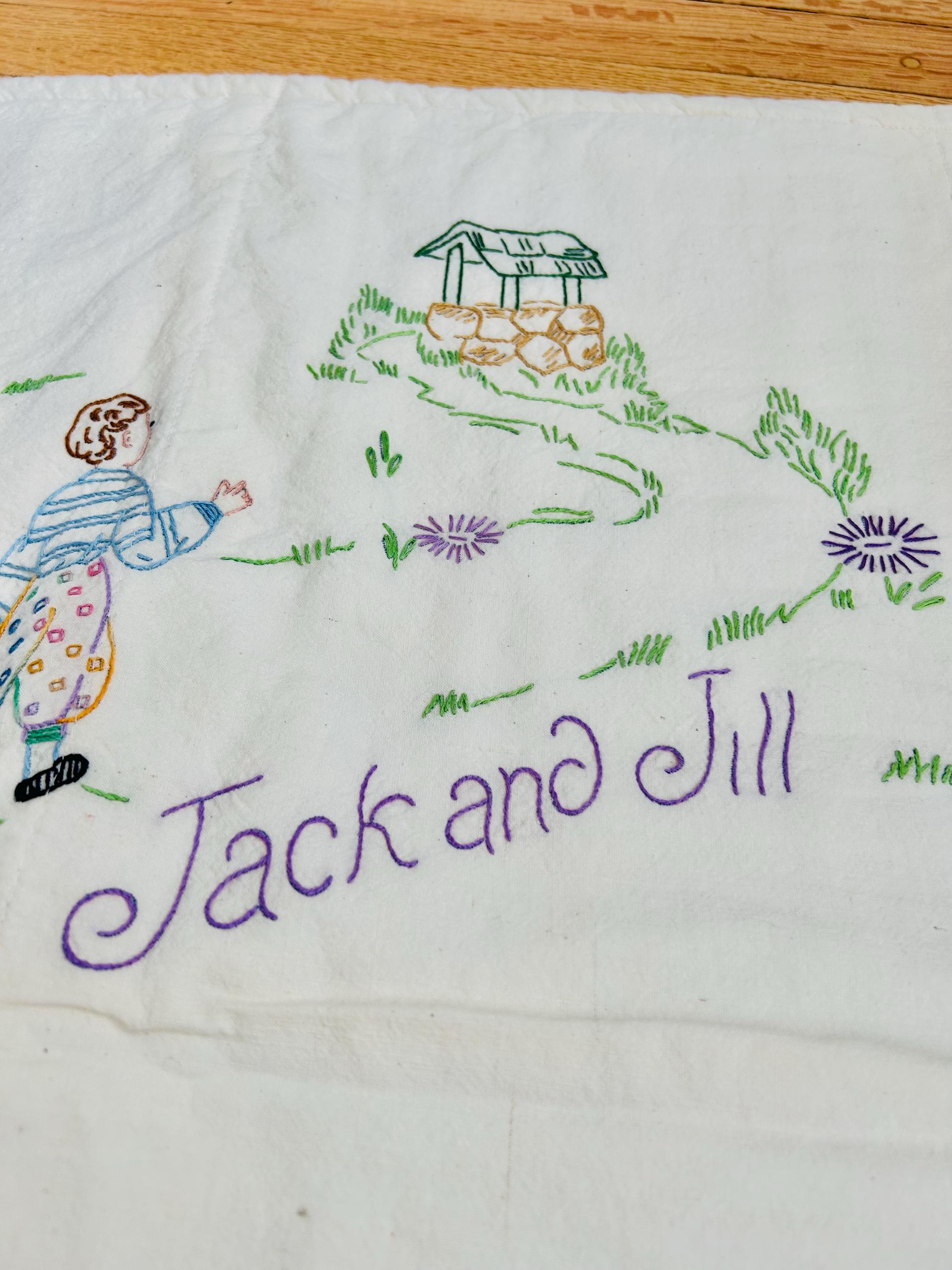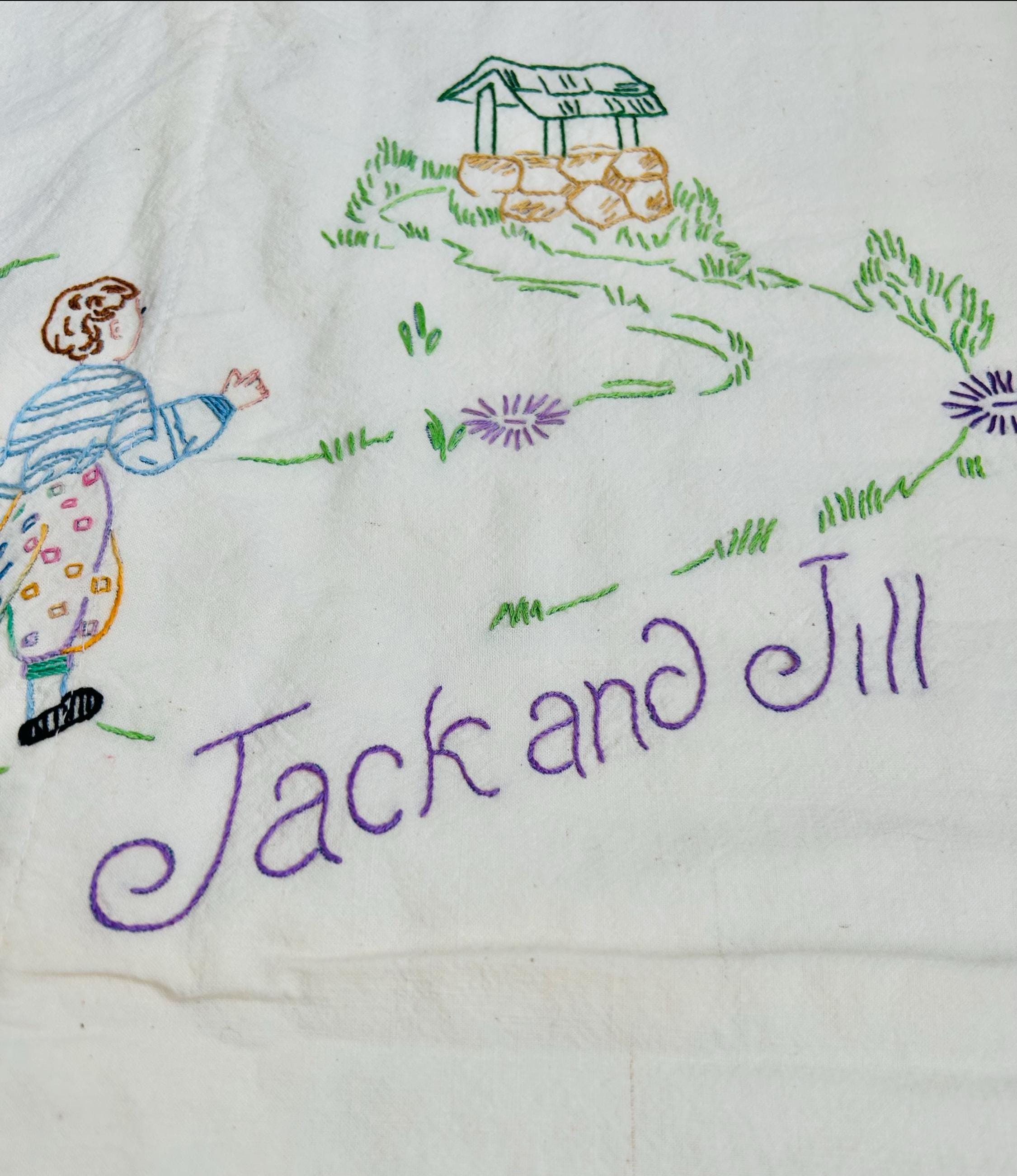 This is a lovely vintage hand-embroidered nursery rhyme quilt, dating to the 1940s–early 1950s. Each panel is embroidered by hand, featuring iconic characters like Little Bo Peep, Little Boy Blue, Mary Quite Contrary, Mother Goose, and Jack and Jill, all set among cheerful flowers and winding garden paths on an off-white/cream muslin ground. The machine-quilting is in straight lines (see photos).