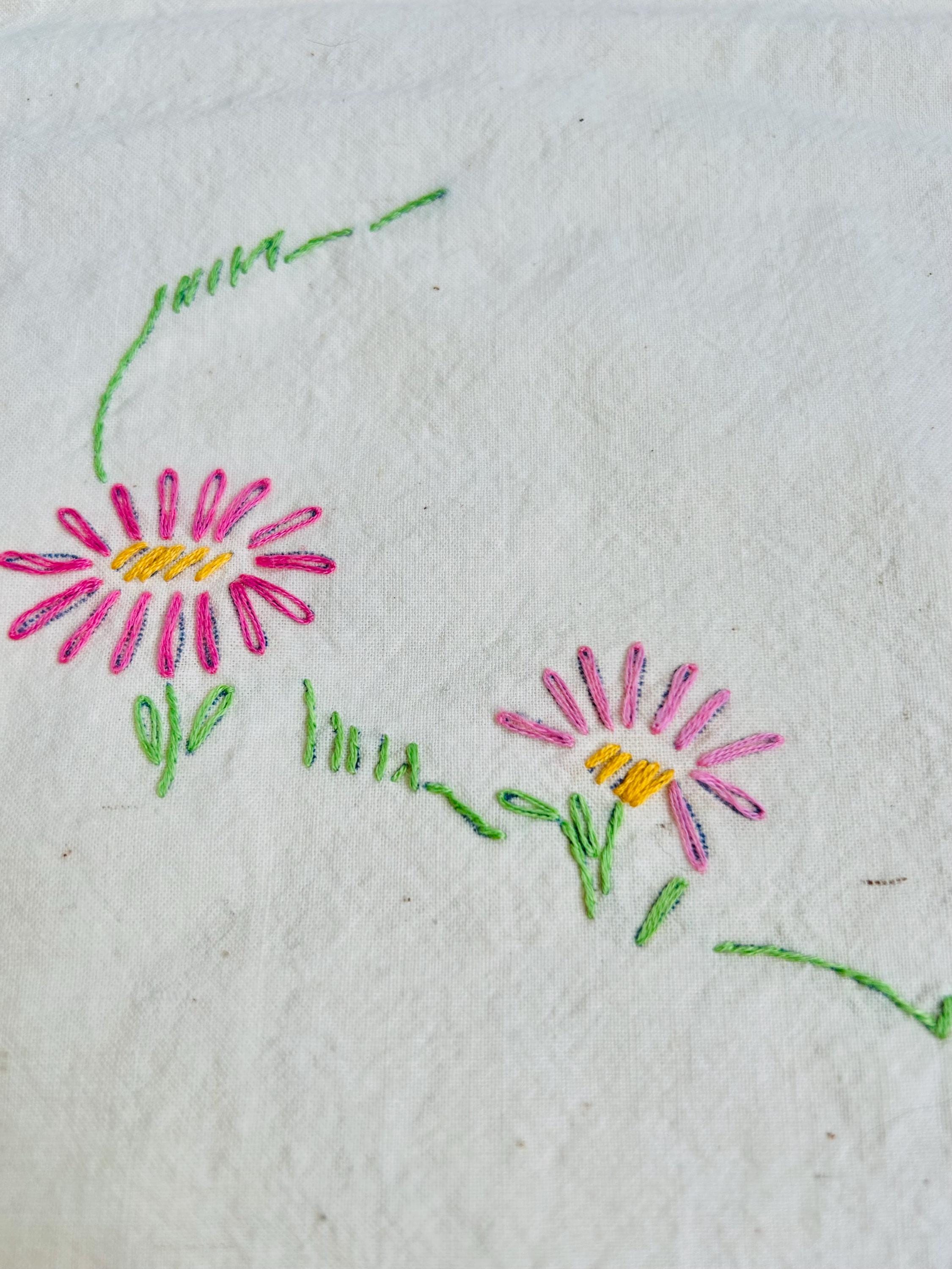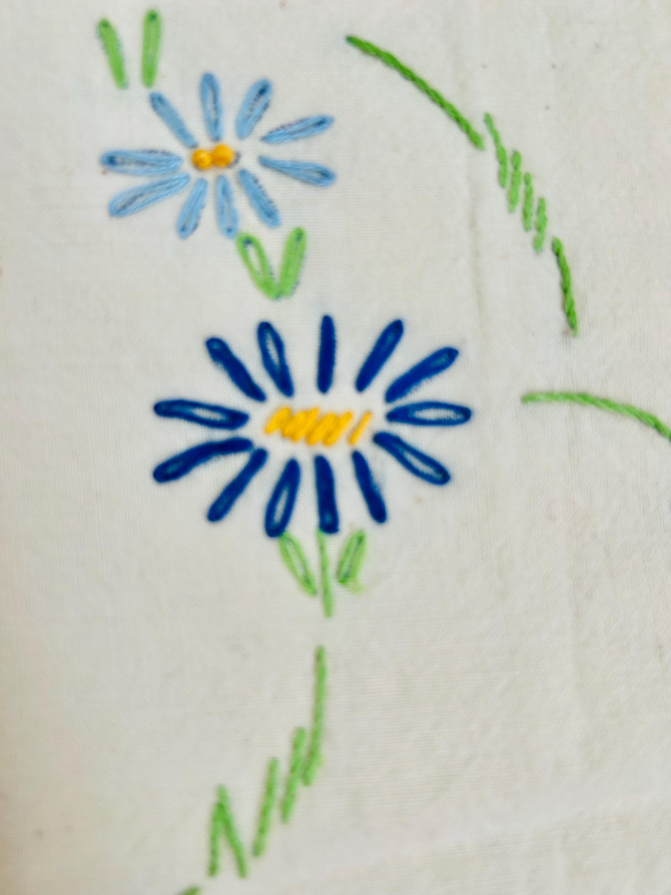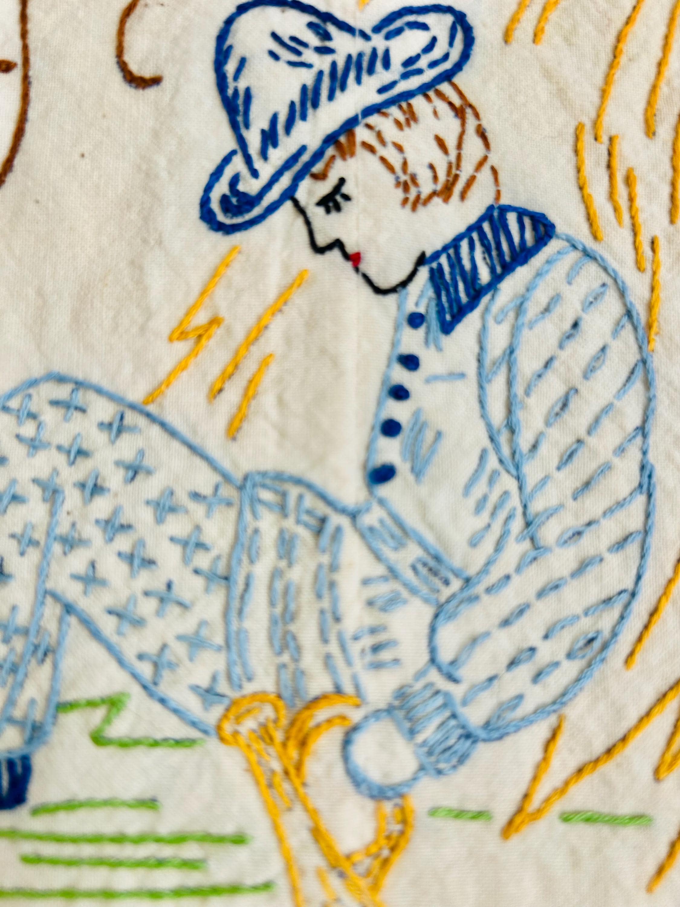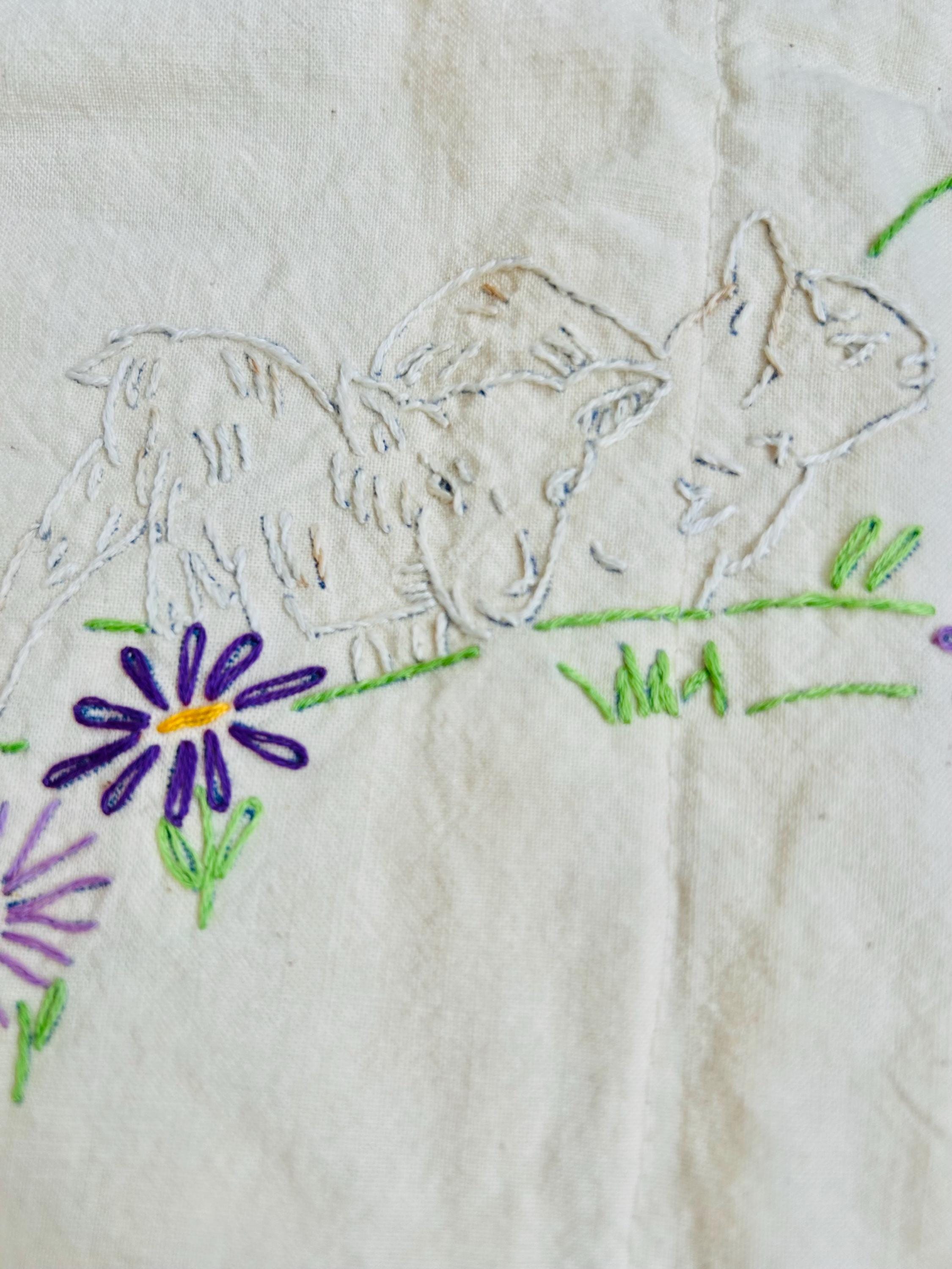 This is a lovely vintage hand-embroidered nursery rhyme quilt, dating to the 1940s–early 1950s. Each panel is embroidered by hand, featuring iconic characters like Little Bo Peep, Little Boy Blue, Mary Quite Contrary, Mother Goose, and Jack and Jill, all set among cheerful flowers and winding garden paths on an off-white/cream muslin ground. The machine-quilting is in straight lines (see photos).
